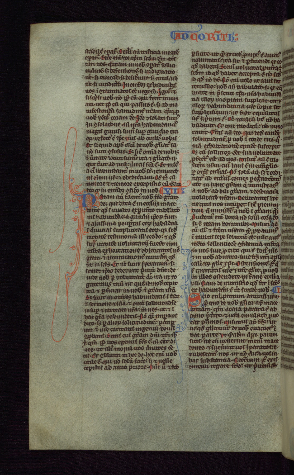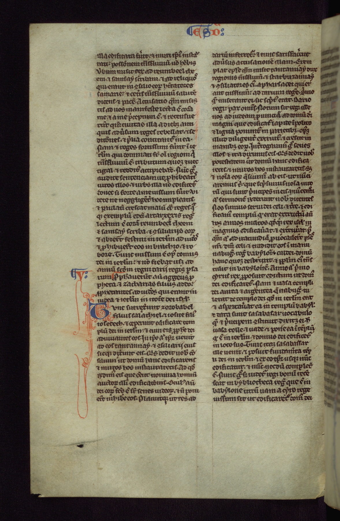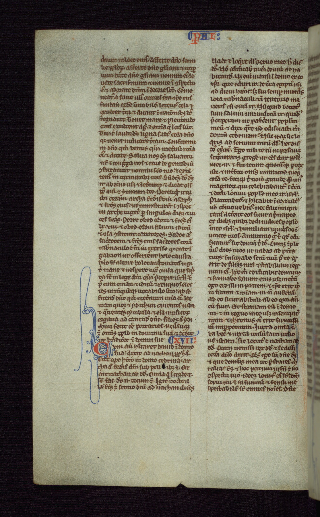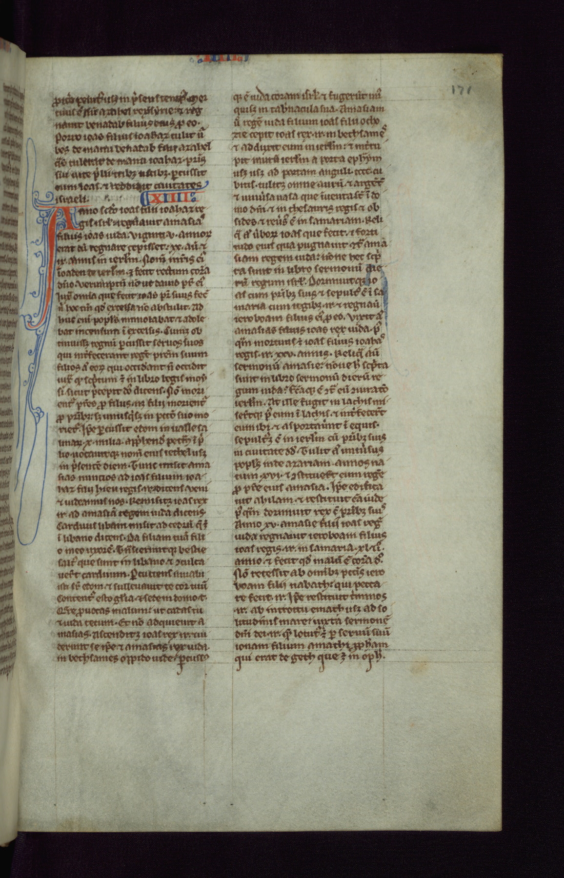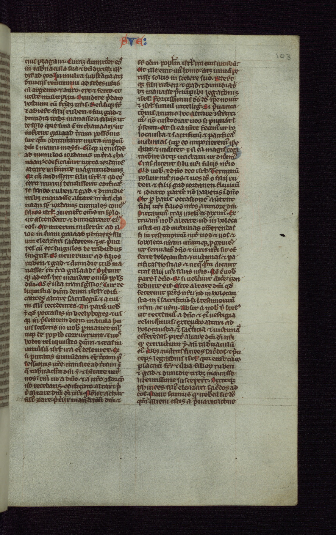 This pocket-size Bible was created around the middle of the thirteenth century in England. It contains the Vulgate text of the Old and New Testaments, arranged in order and divided into chapters. Such Bibles, designed for individual rather than institutional use, began to be created on a large scale during the thirteenth century, especially in Paris. This manuscript is illuminated with a large number of small historiated initials, and also includes a somewhat later image of the Three Living and the Three Dead, a popular scene based on a French poem of the same century.