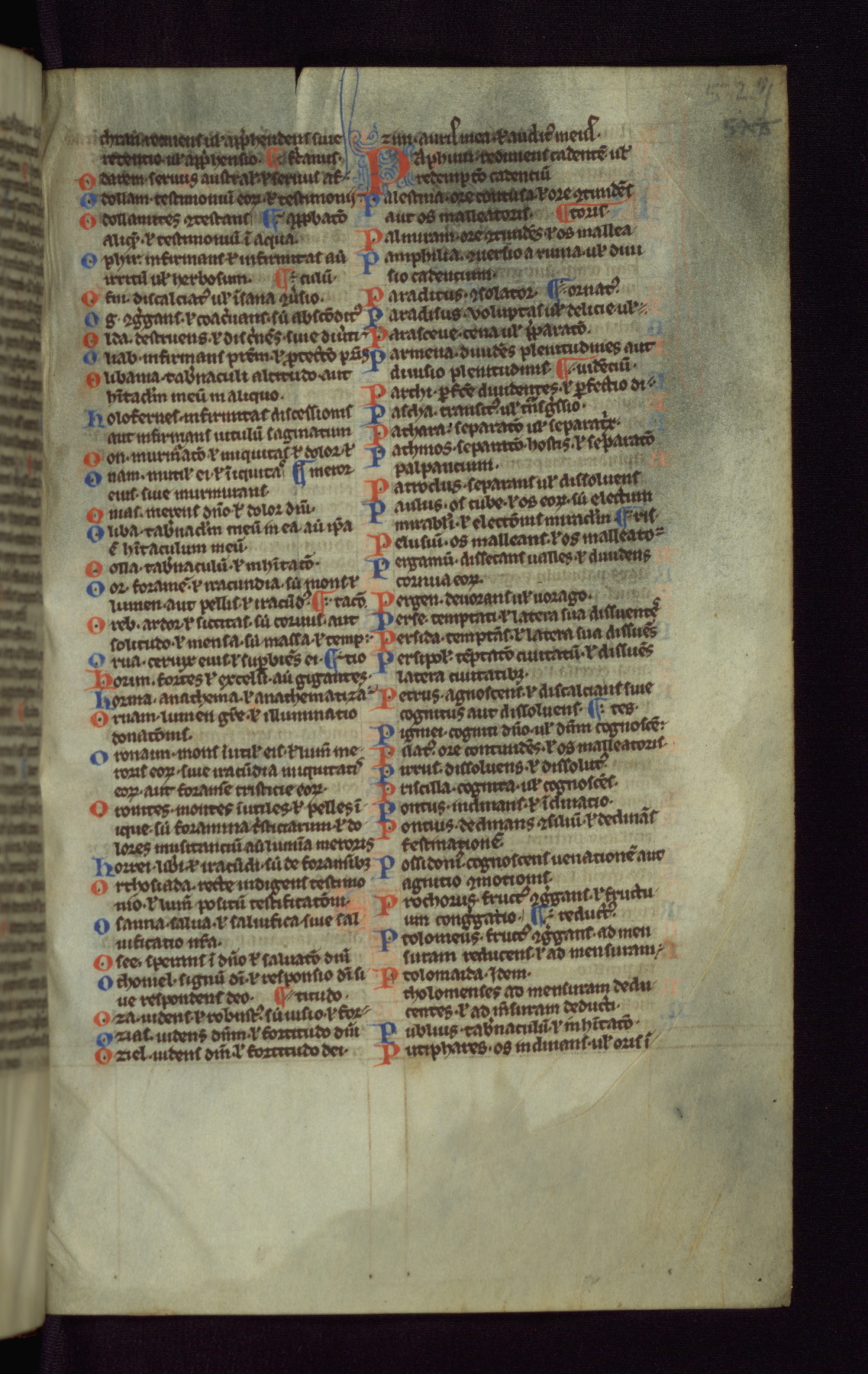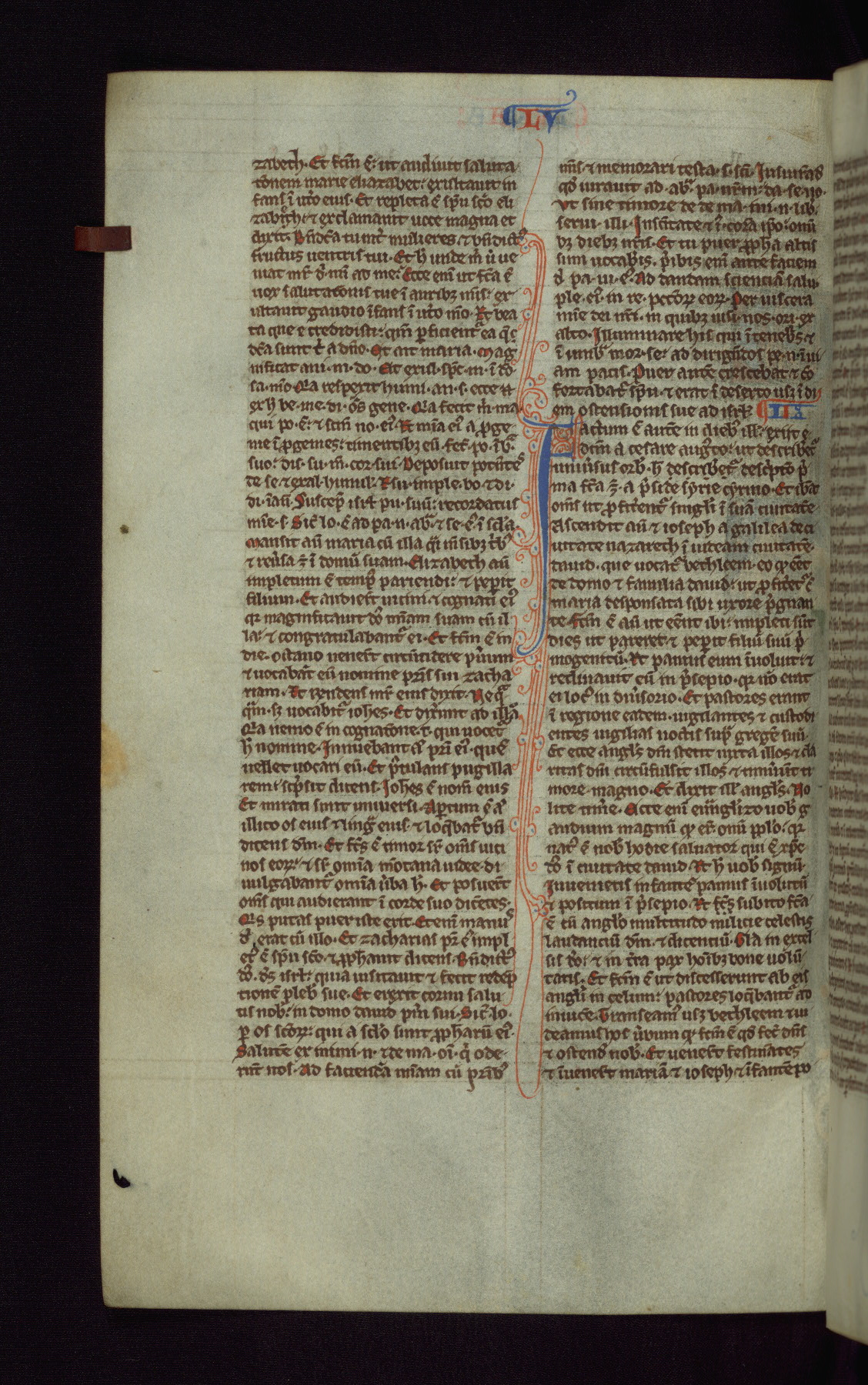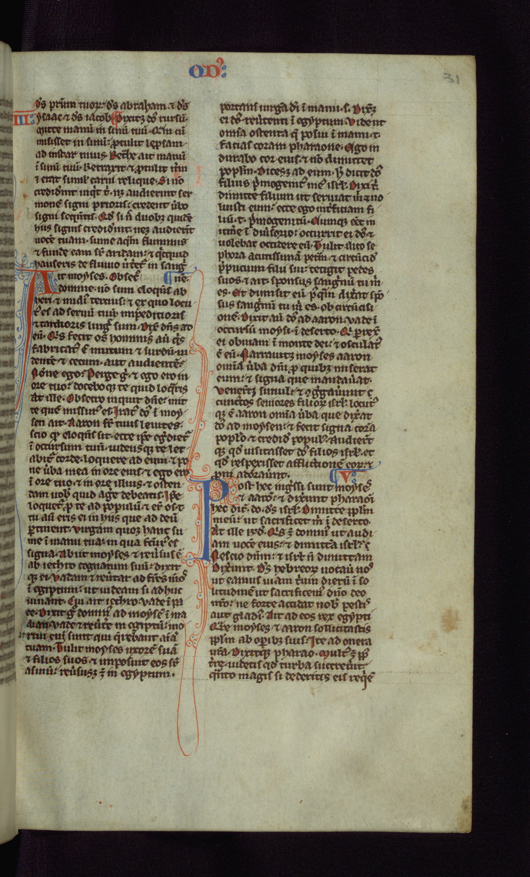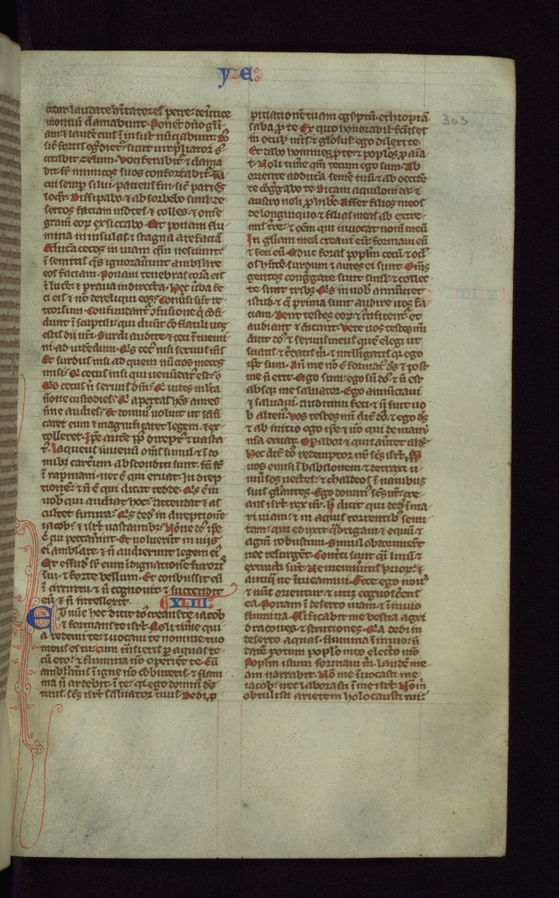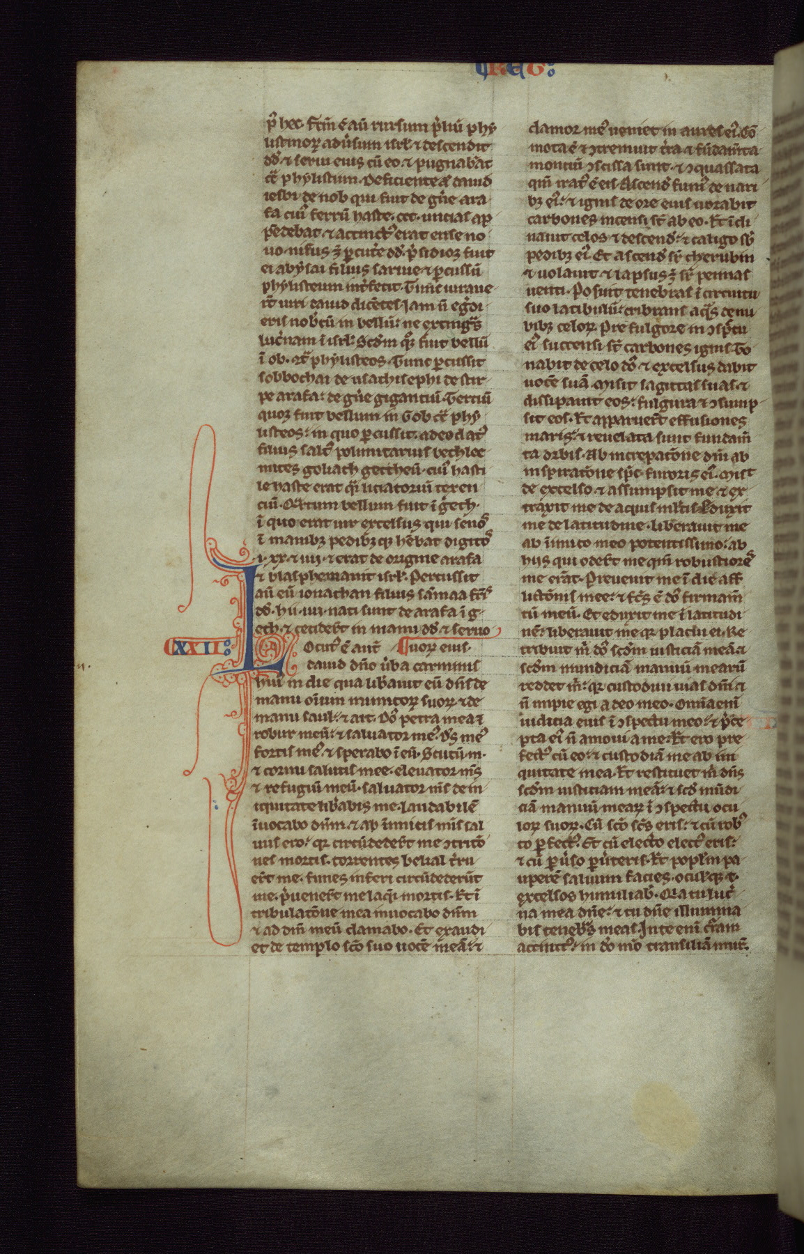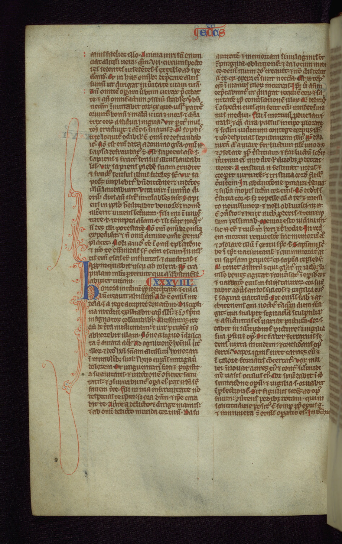 This pocket-size Bible was created around the middle of the thirteenth century in England. It contains the Vulgate text of the Old and New Testaments, arranged in order and divided into chapters. Such Bibles, designed for individual rather than institutional use, began to be created on a large scale during the thirteenth century, especially in Paris. This manuscript is illuminated with a large number of small historiated initials, and also includes a somewhat later image of the Three Living and the Three Dead, a popular scene based on a French poem of the same century.