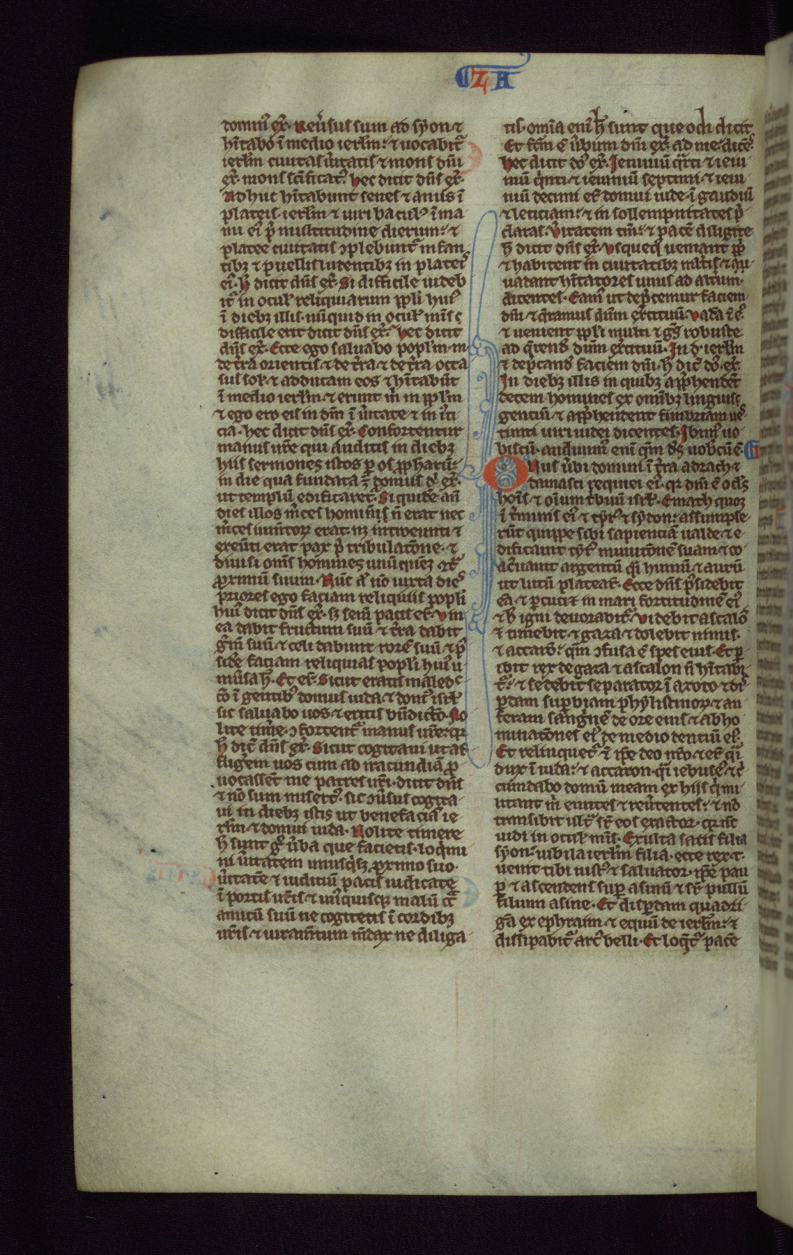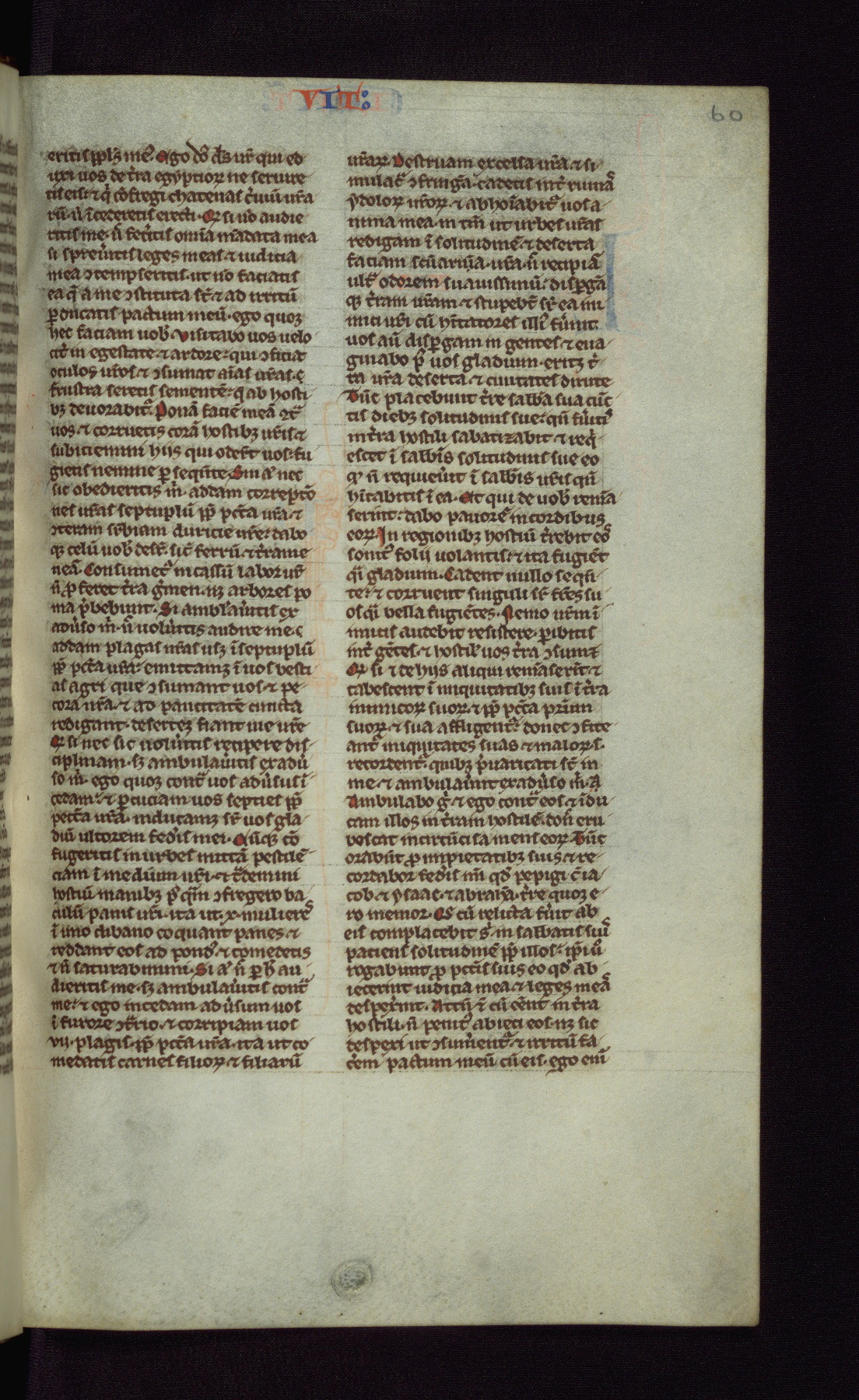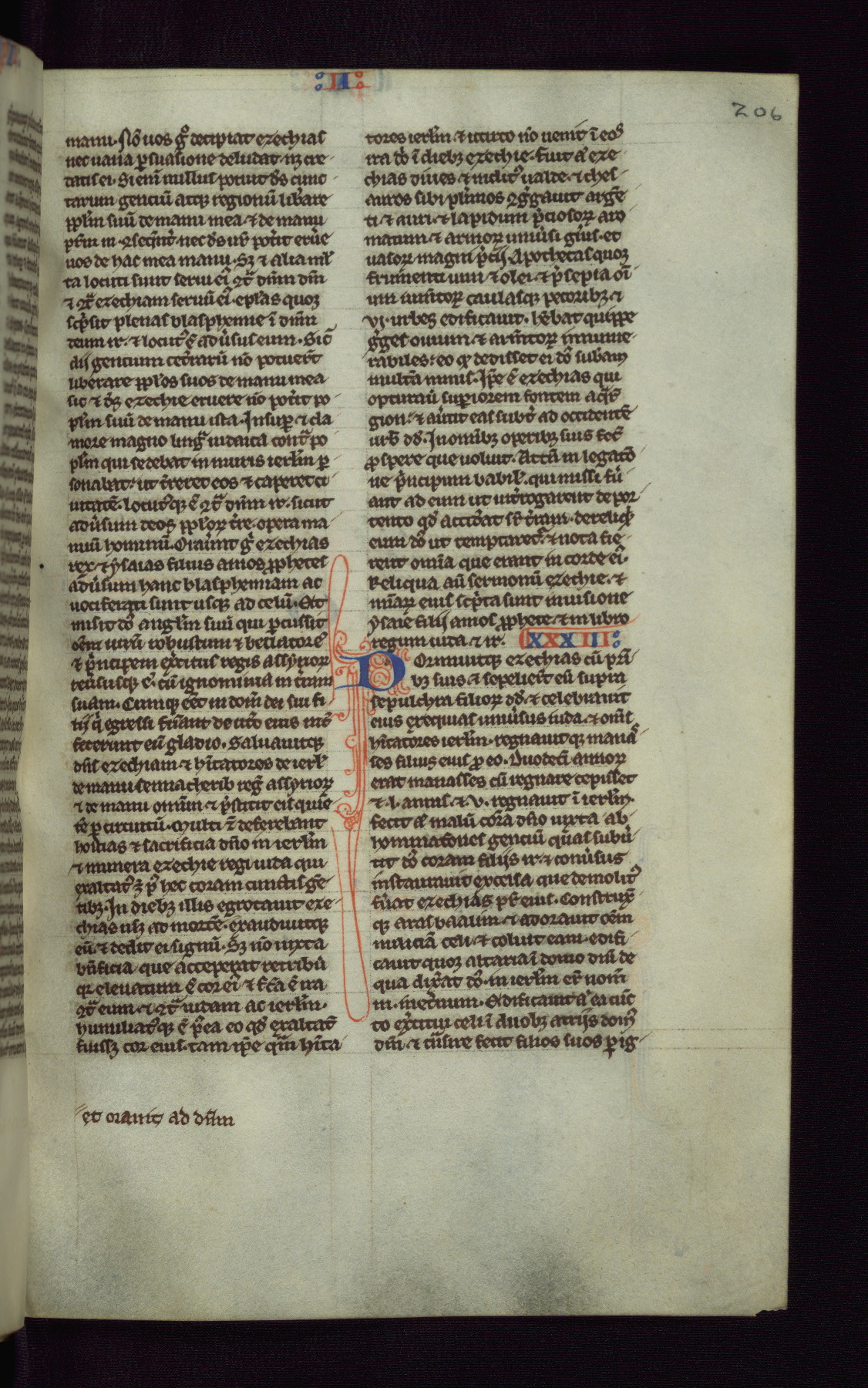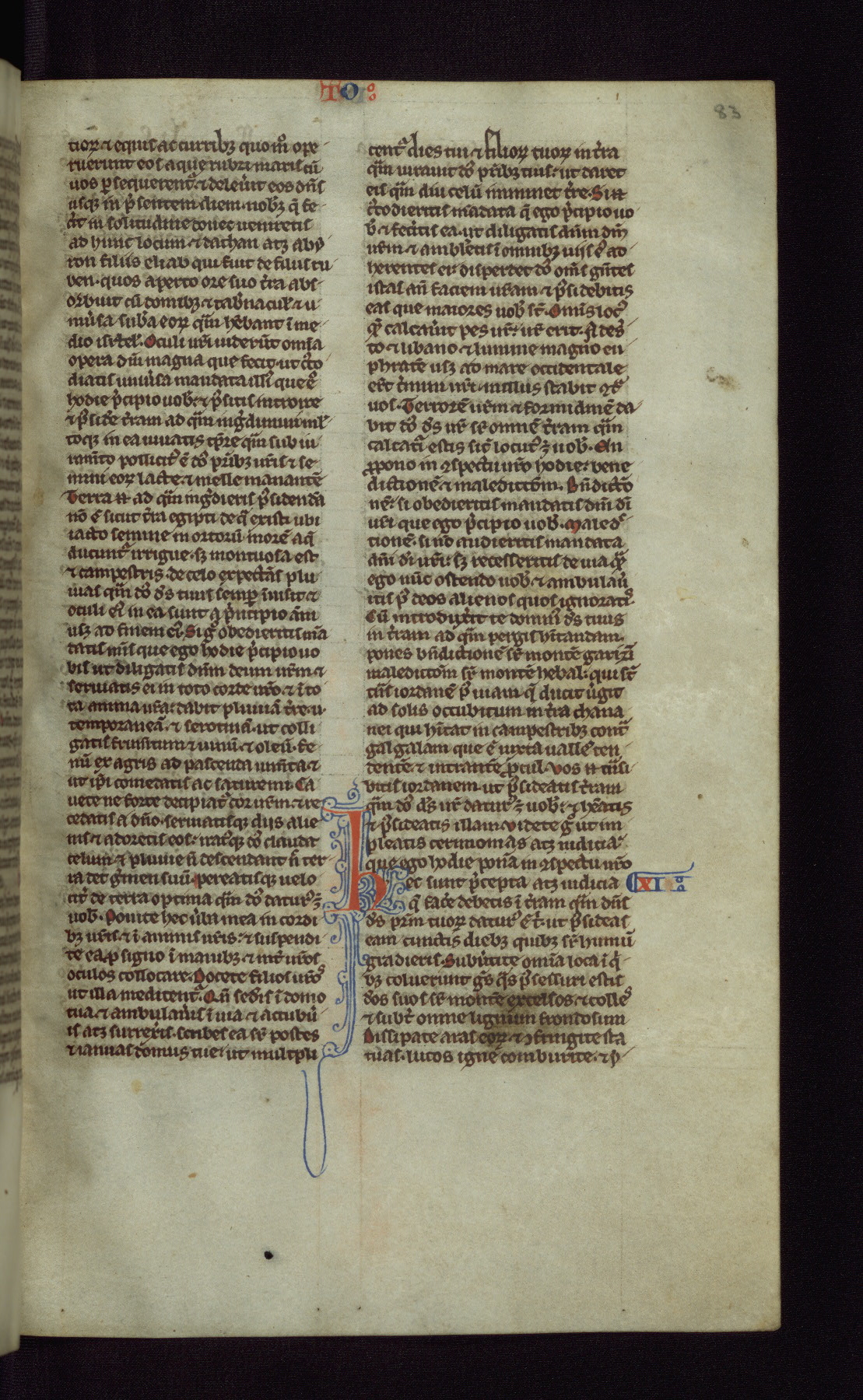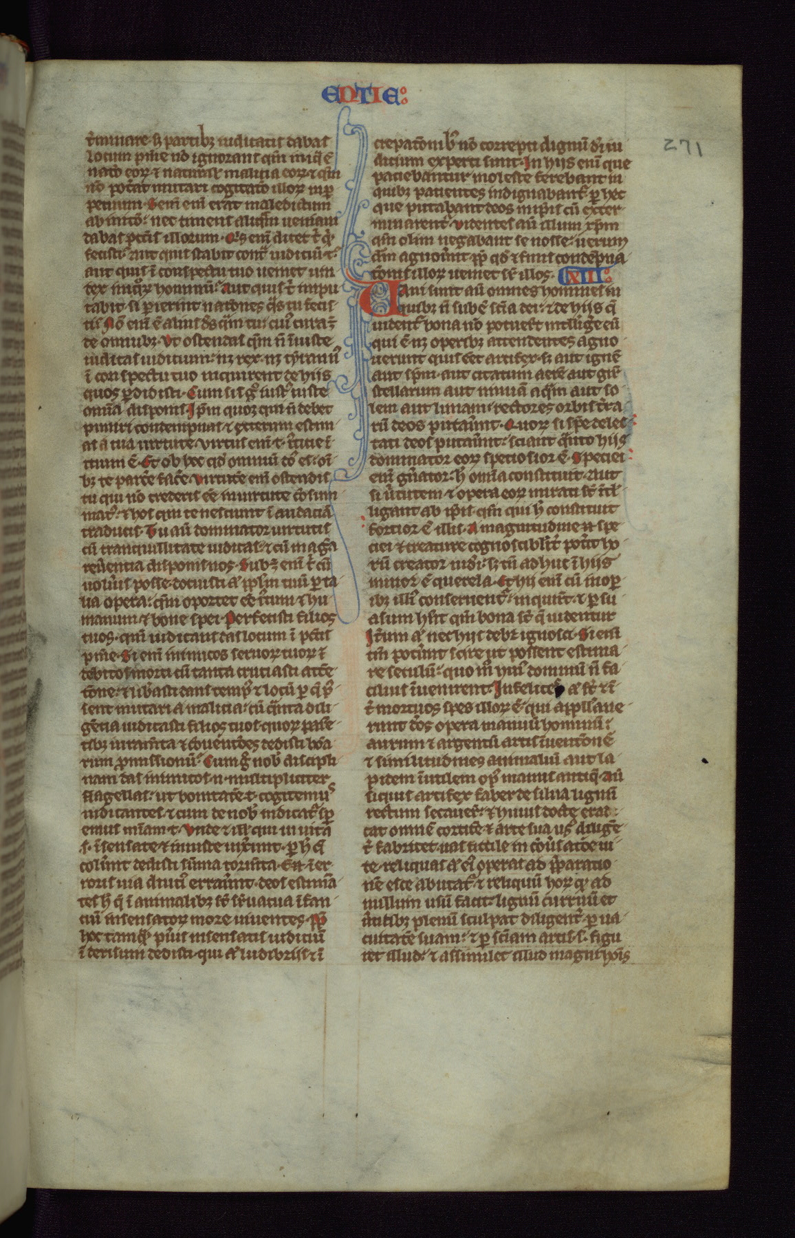 This pocket-size Bible was created around the middle of the thirteenth century in England. It contains the Vulgate text of the Old and New Testaments, arranged in order and divided into chapters. Such Bibles, designed for individual rather than institutional use, began to be created on a large scale during the thirteenth century, especially in Paris. This manuscript is illuminated with a large number of small historiated initials, and also includes a somewhat later image of the Three Living and the Three Dead, a popular scene based on a French poem of the same century.