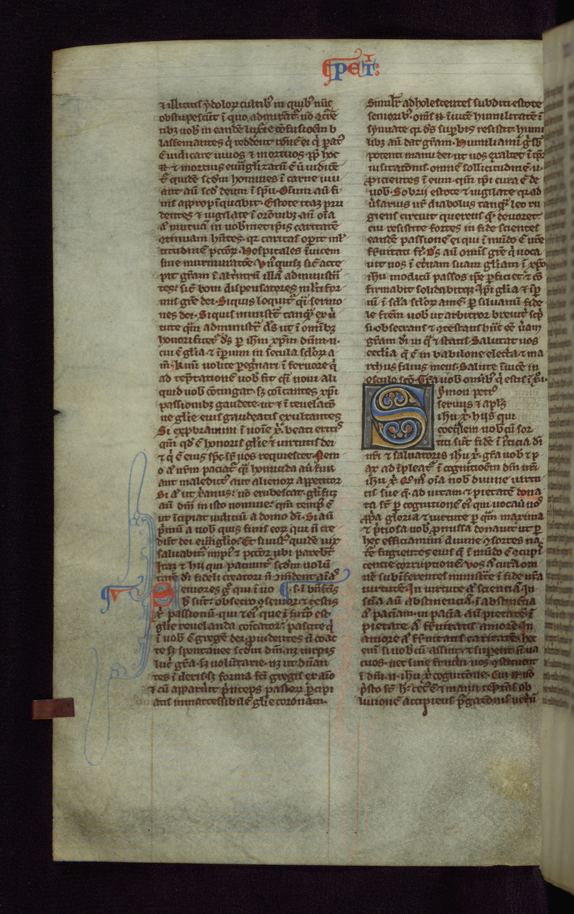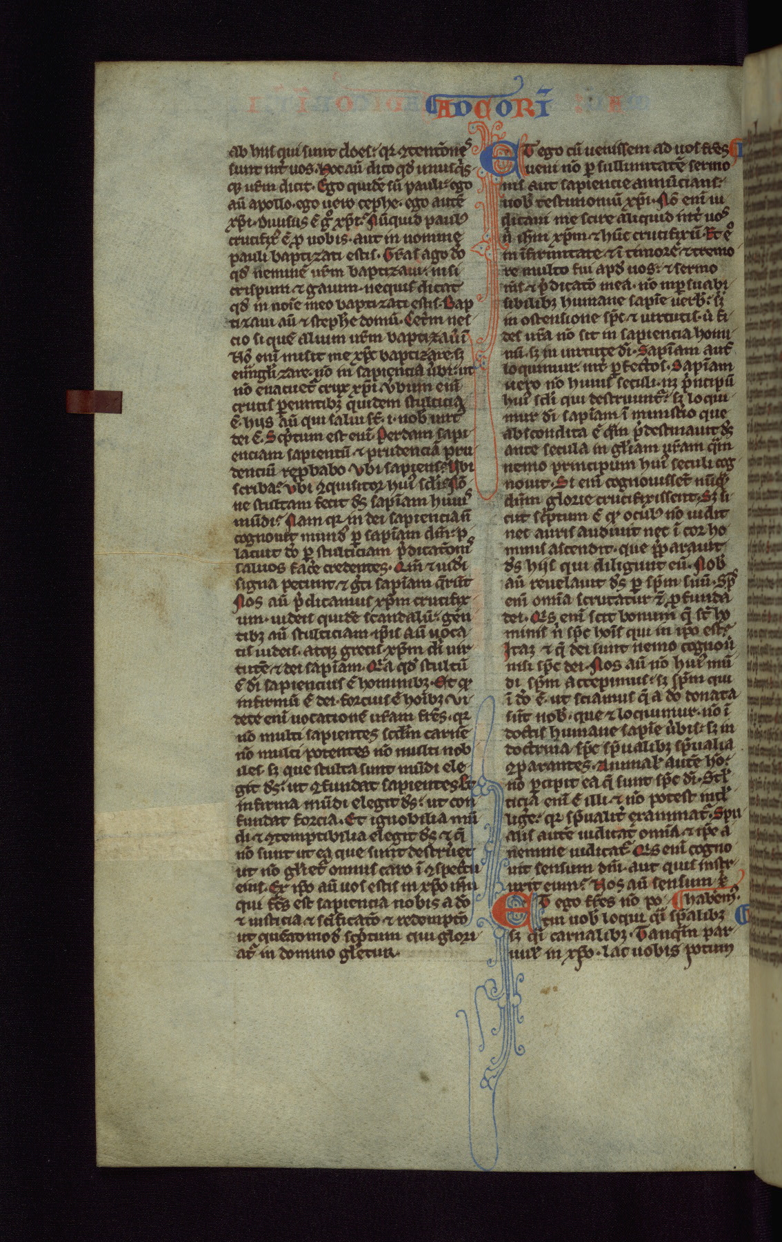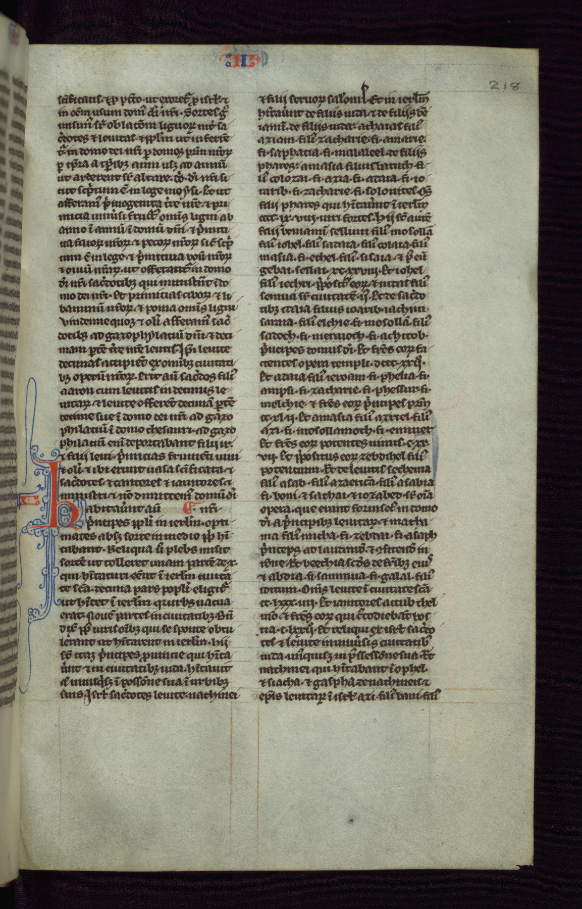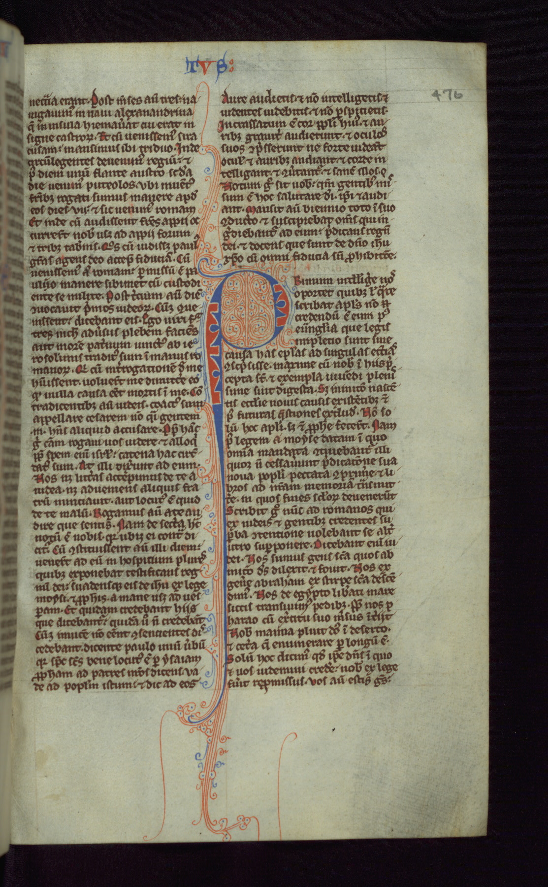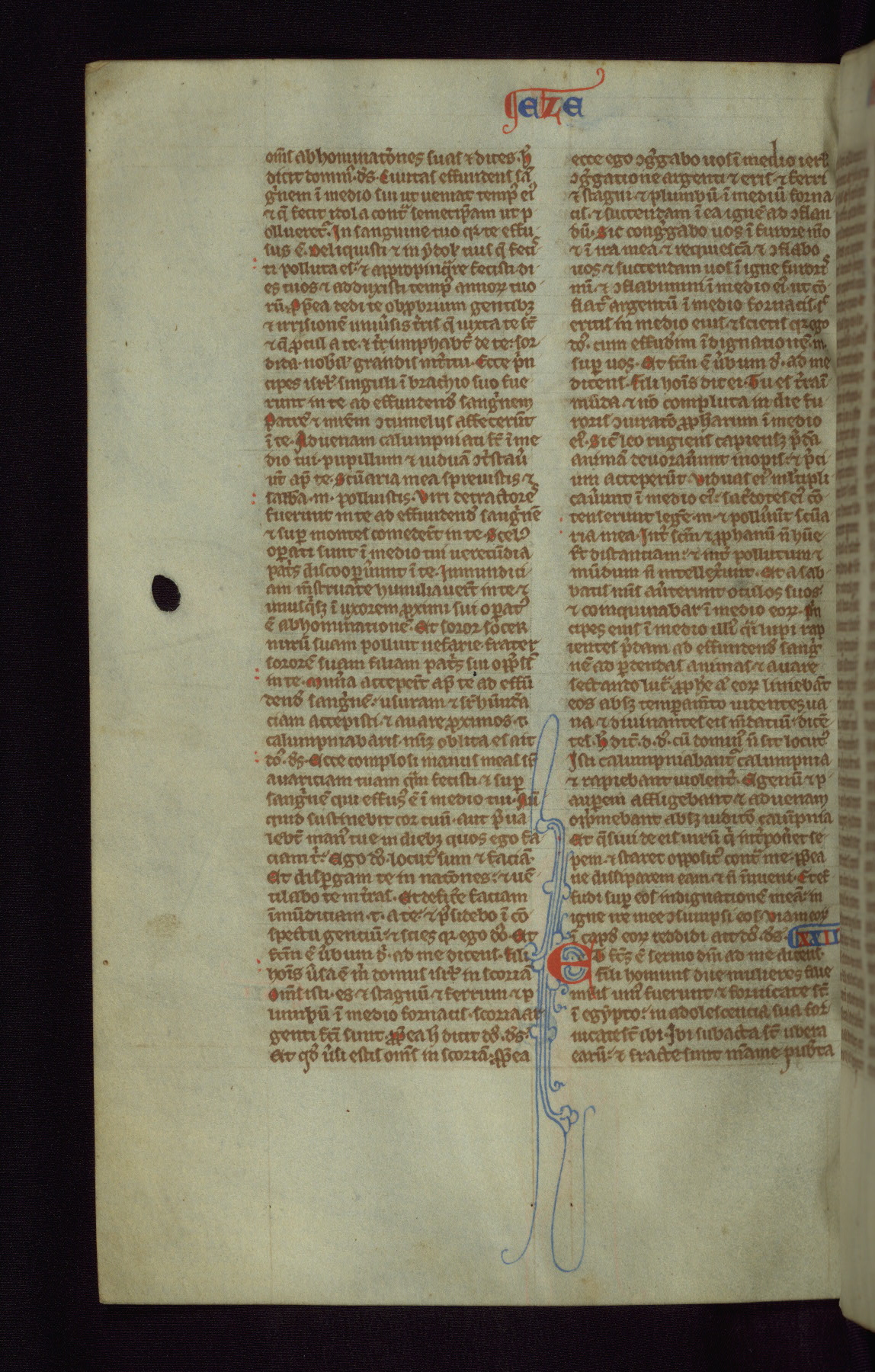 This pocket-size Bible was created around the middle of the thirteenth century in England. It contains the Vulgate text of the Old and New Testaments, arranged in order and divided into chapters. Such Bibles, designed for individual rather than institutional use, began to be created on a large scale during the thirteenth century, especially in Paris. This manuscript is illuminated with a large number of small historiated initials, and also includes a somewhat later image of the Three Living and the Three Dead, a popular scene based on a French poem of the same century.