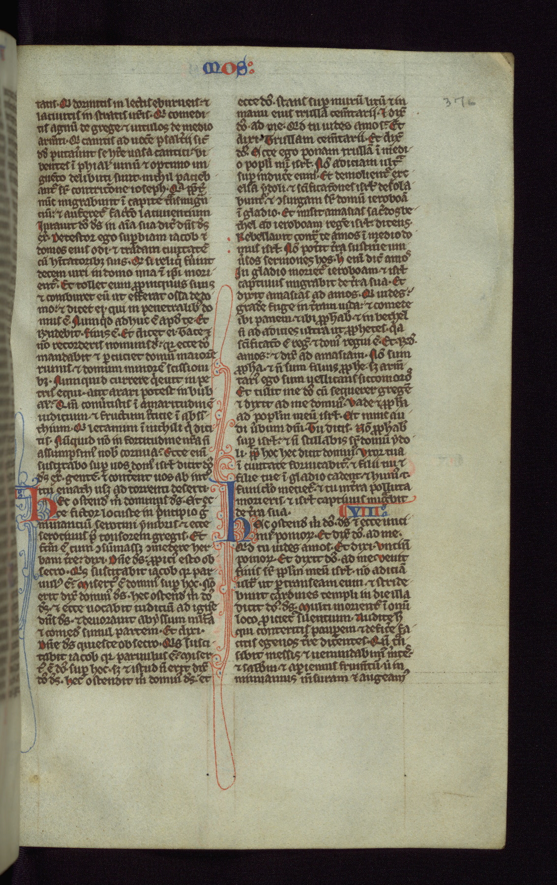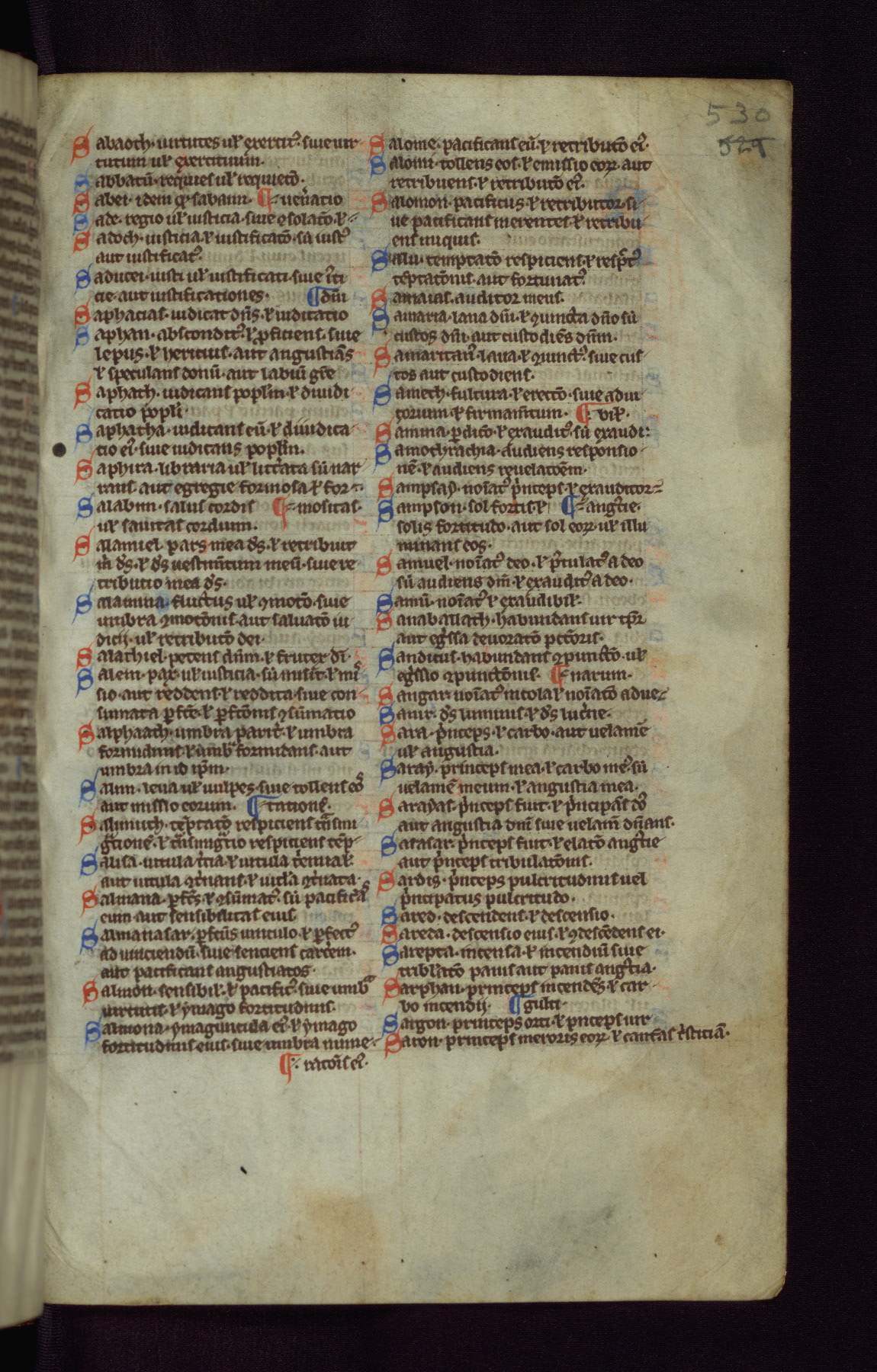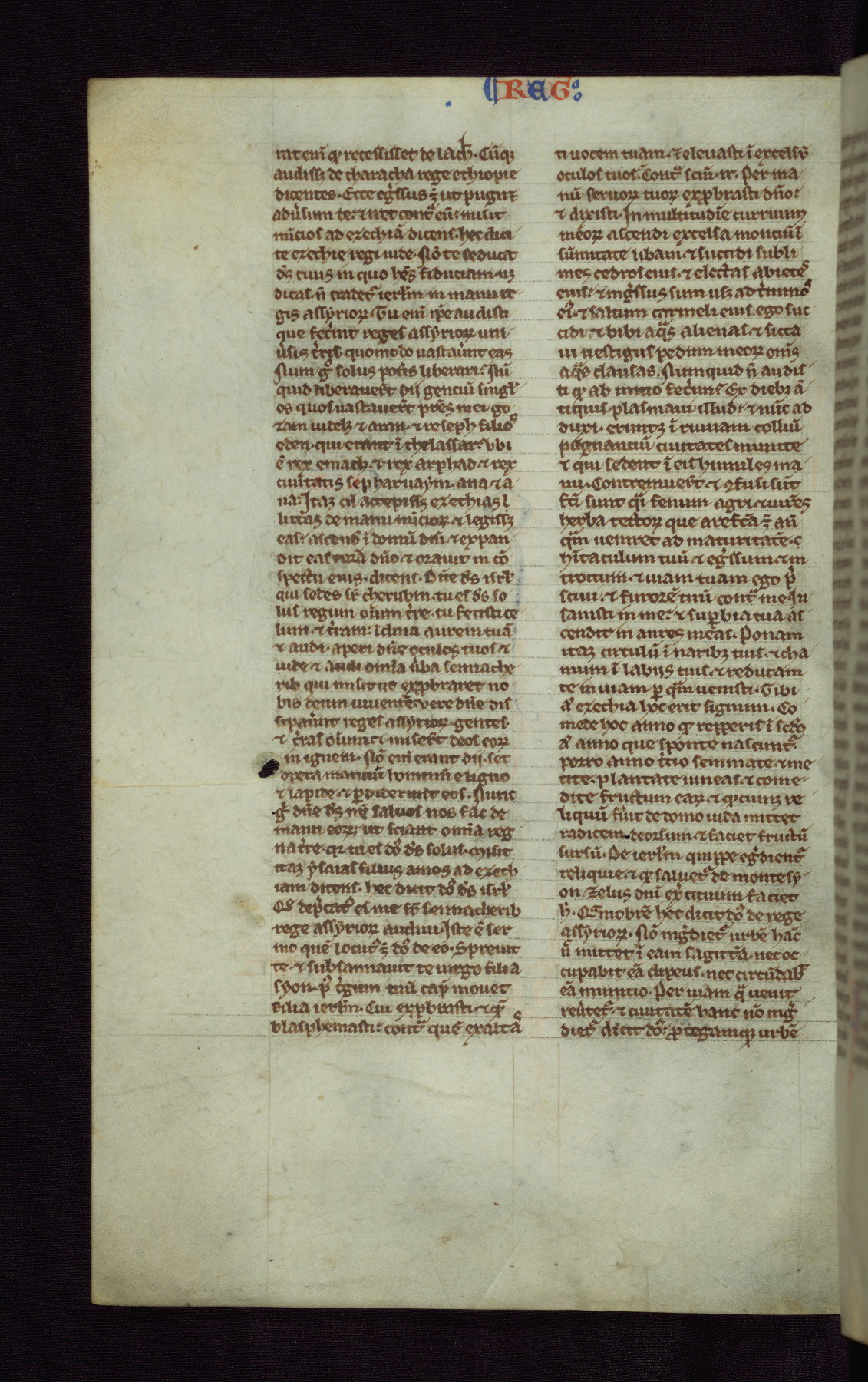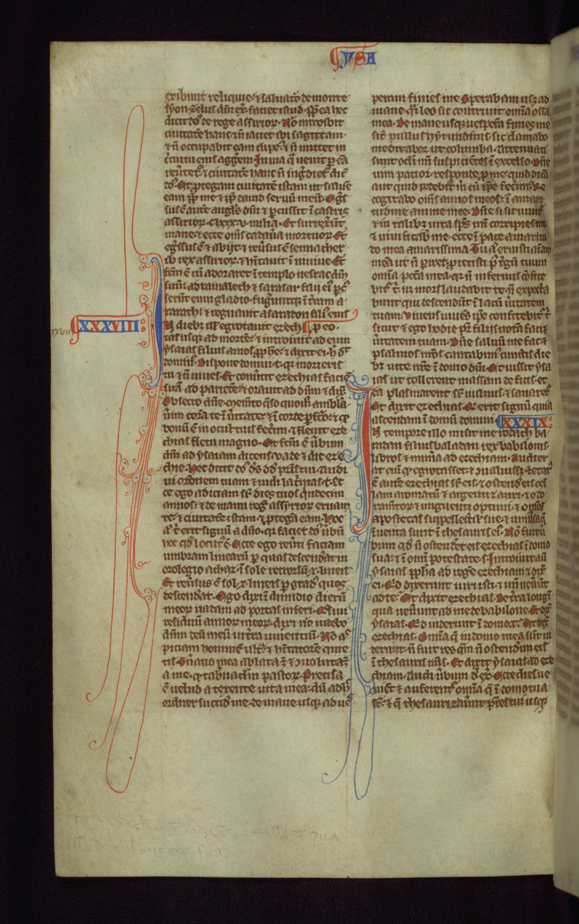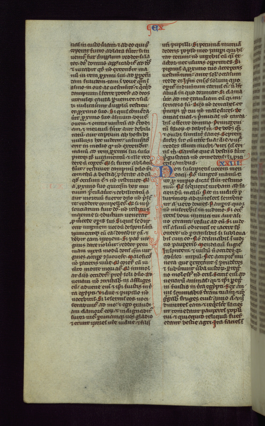 This pocket-size Bible was created around the middle of the thirteenth century in England. It contains the Vulgate text of the Old and New Testaments, arranged in order and divided into chapters. Such Bibles, designed for individual rather than institutional use, began to be created on a large scale during the thirteenth century, especially in Paris. This manuscript is illuminated with a large number of small historiated initials, and also includes a somewhat later image of the Three Living and the Three Dead, a popular scene based on a French poem of the same century.