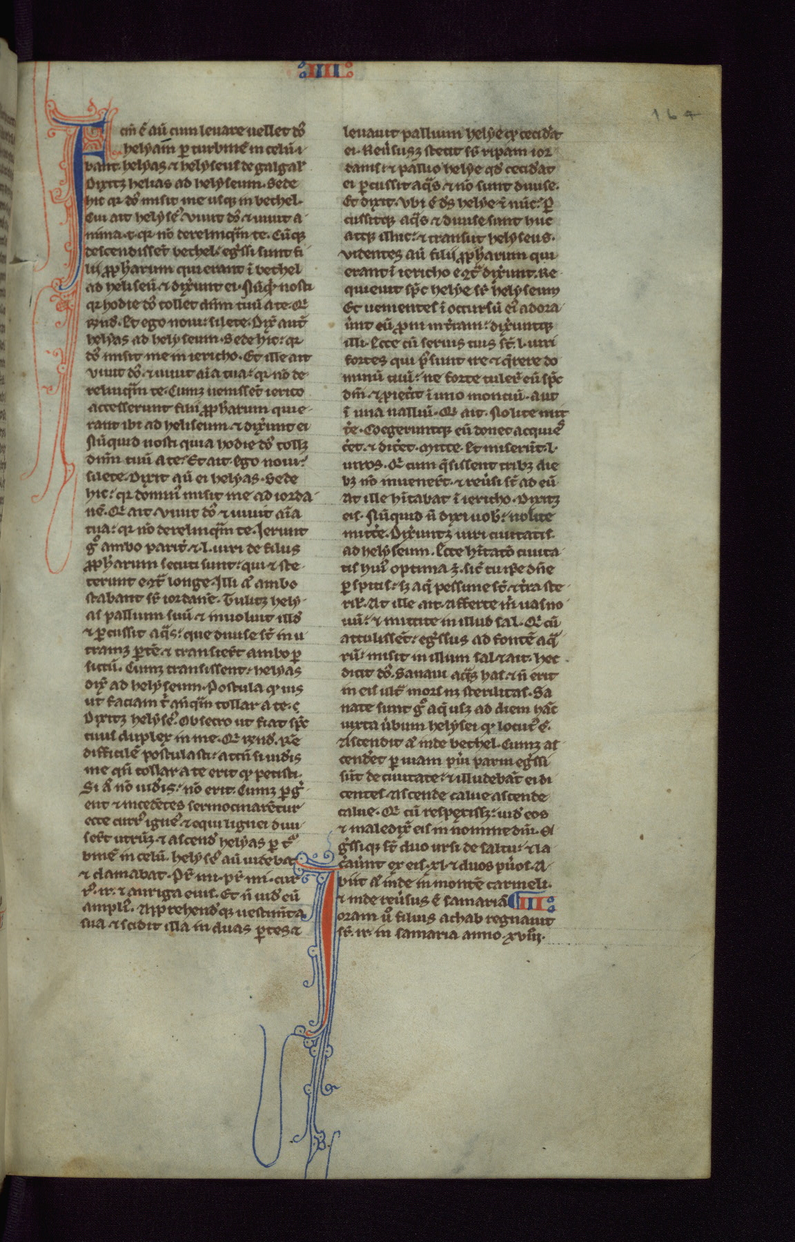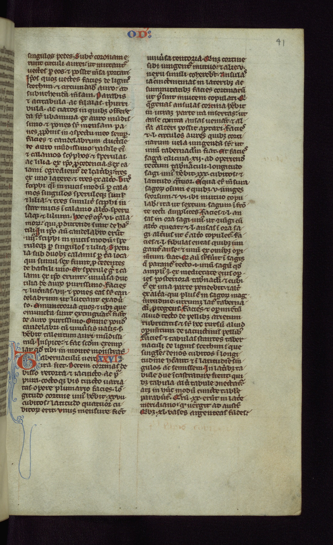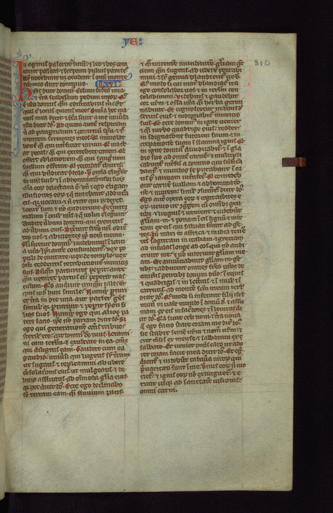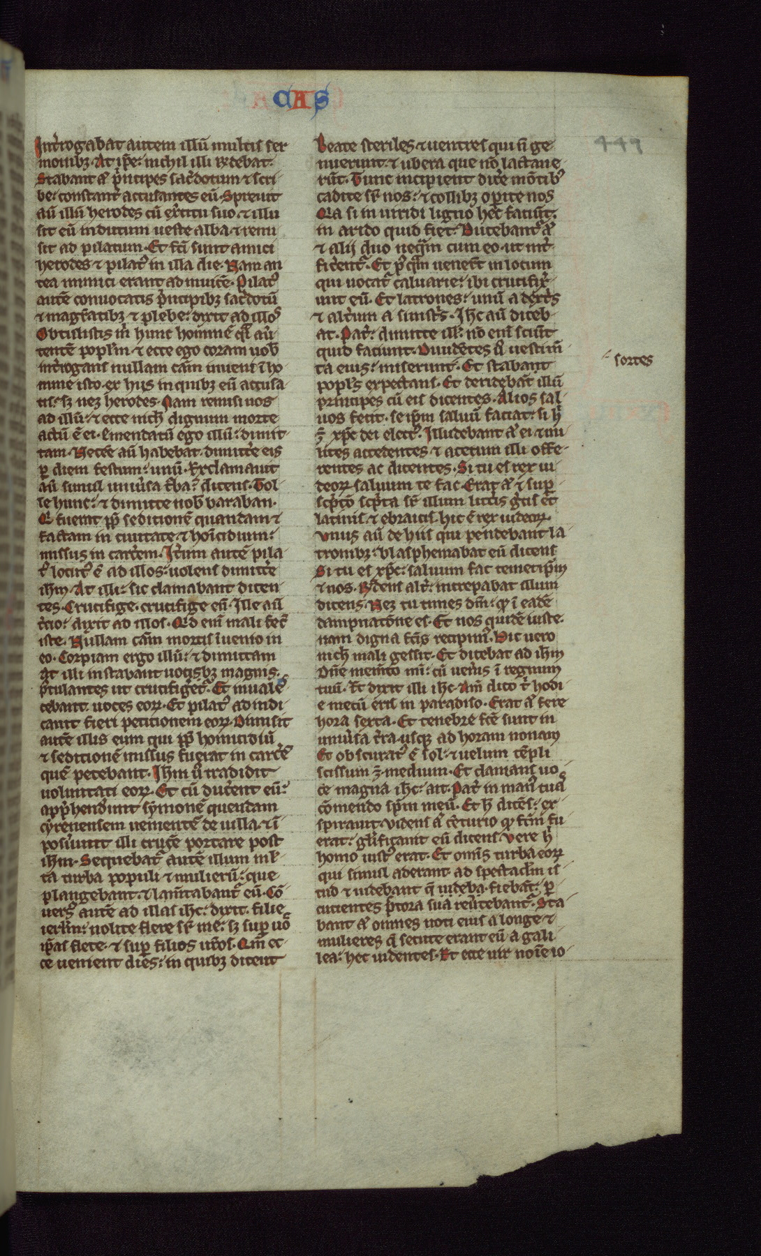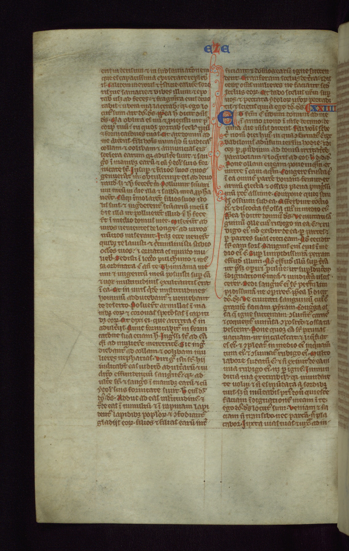 This pocket-size Bible was created around the middle of the thirteenth century in England. It contains the Vulgate text of the Old and New Testaments, arranged in order and divided into chapters. Such Bibles, designed for individual rather than institutional use, began to be created on a large scale during the thirteenth century, especially in Paris. This manuscript is illuminated with a large number of small historiated initials, and also includes a somewhat later image of the Three Living and the Three Dead, a popular scene based on a French poem of the same century.