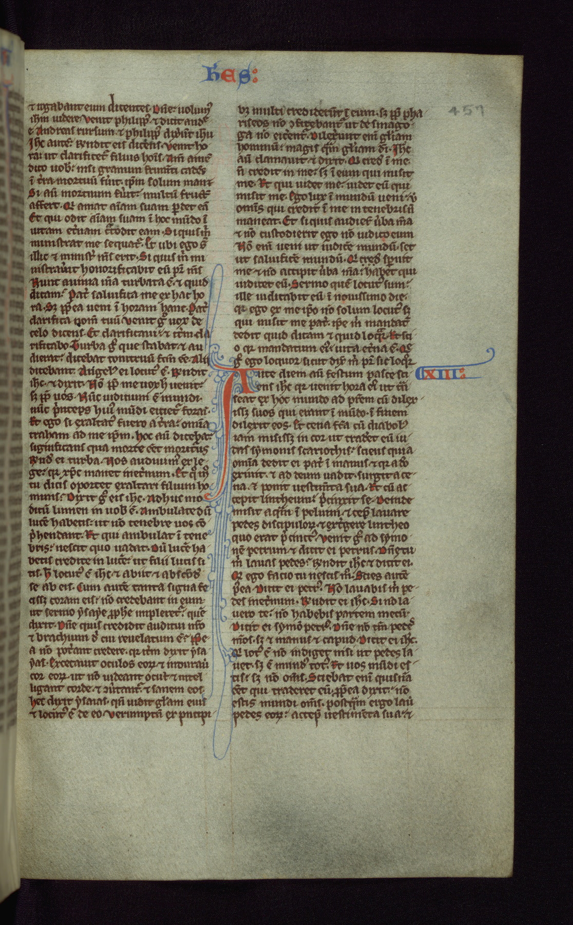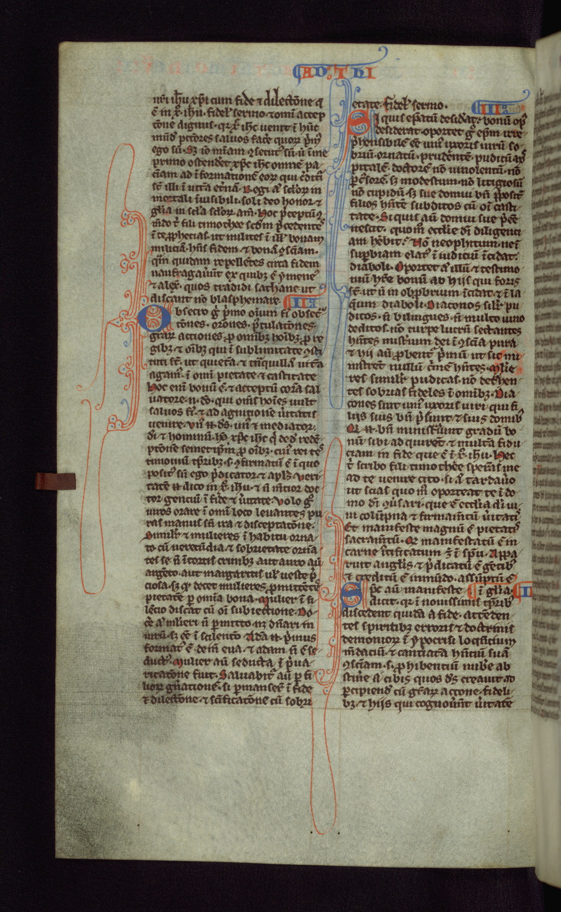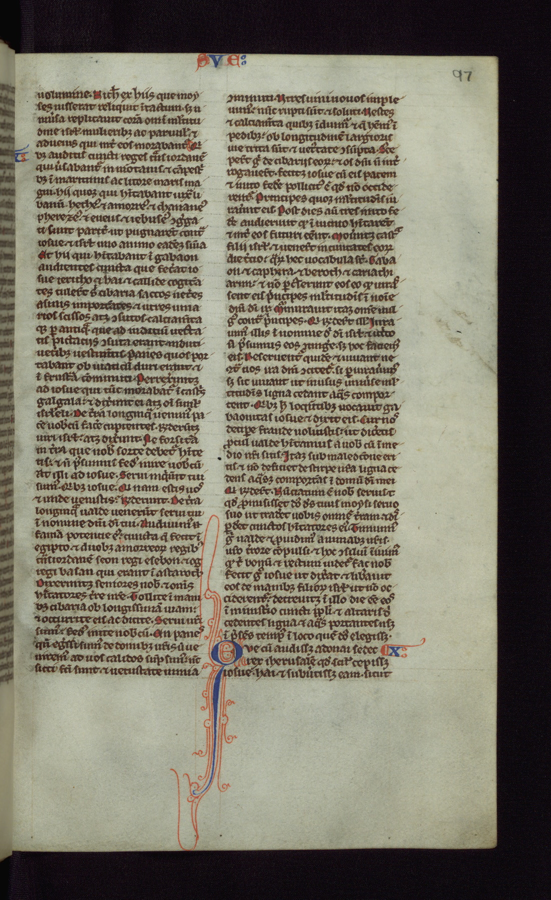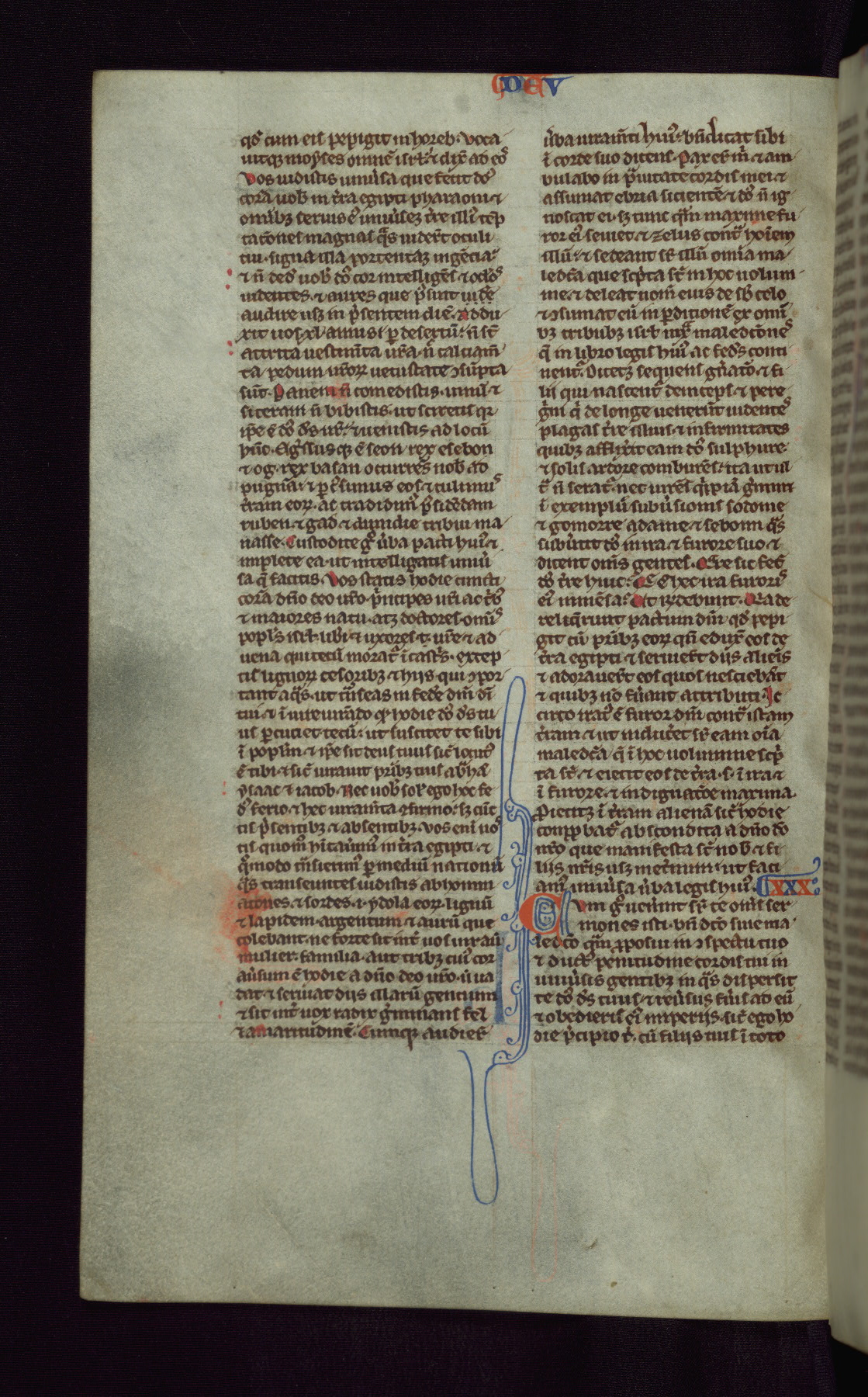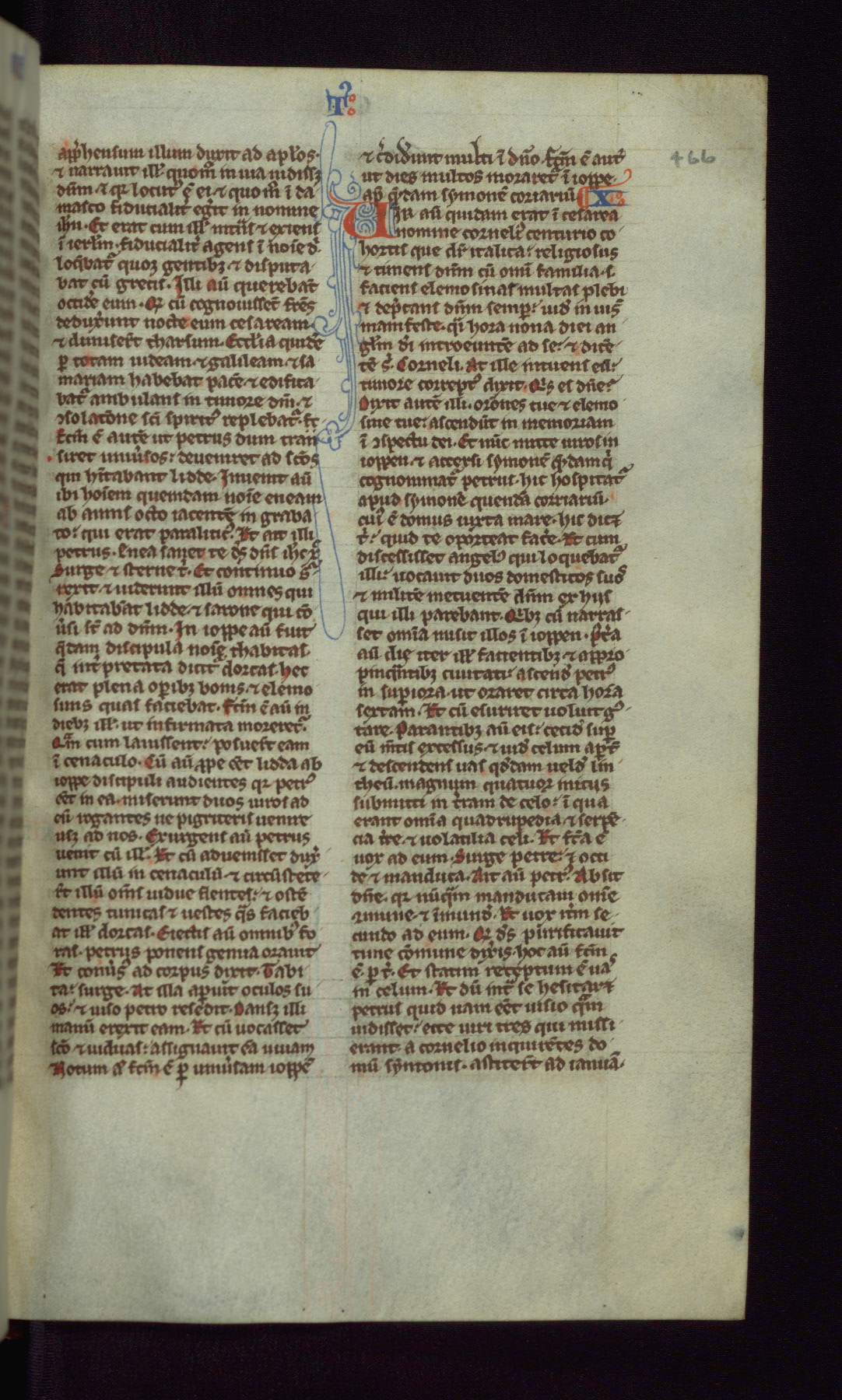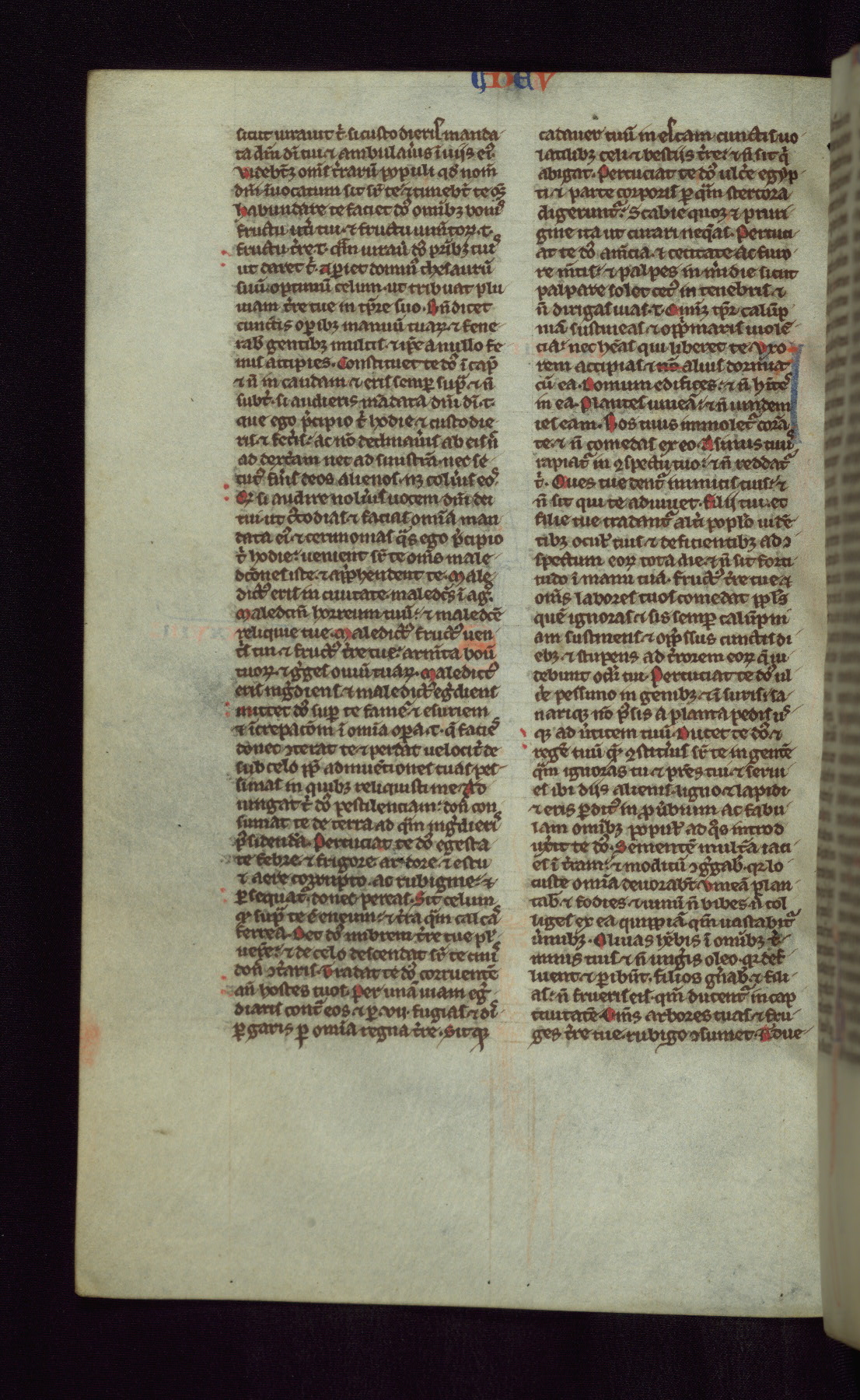 This pocket-size Bible was created around the middle of the thirteenth century in England. It contains the Vulgate text of the Old and New Testaments, arranged in order and divided into chapters. Such Bibles, designed for individual rather than institutional use, began to be created on a large scale during the thirteenth century, especially in Paris. This manuscript is illuminated with a large number of small historiated initials, and also includes a somewhat later image of the Three Living and the Three Dead, a popular scene based on a French poem of the same century.