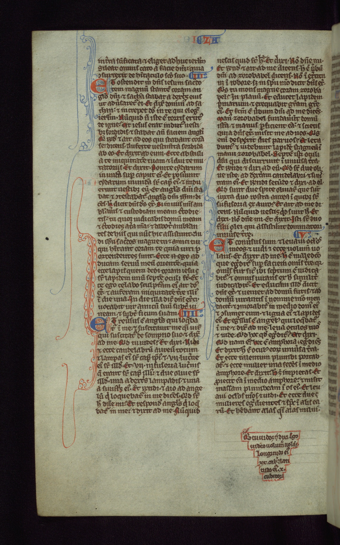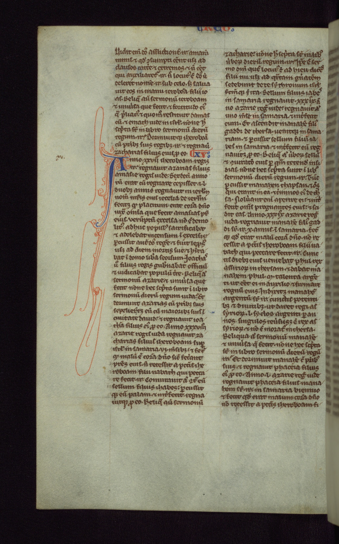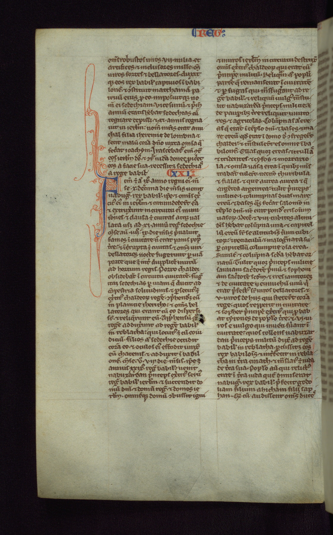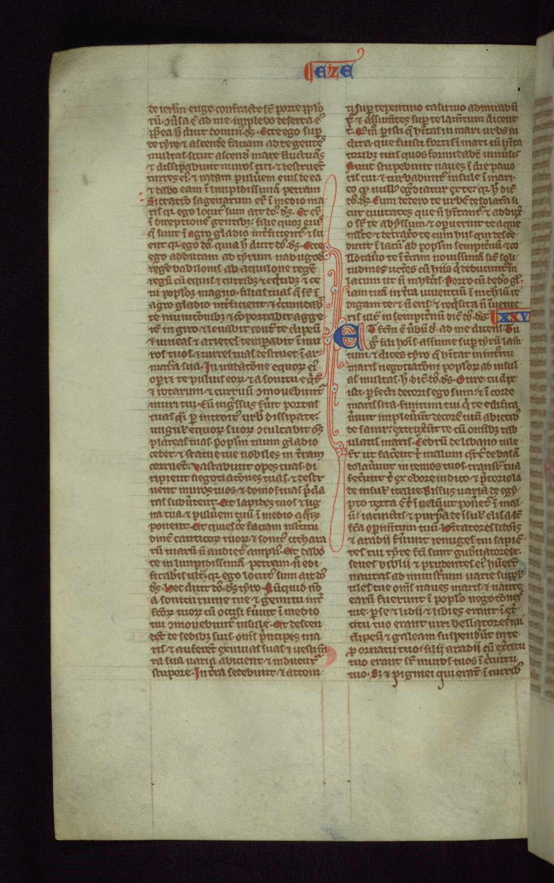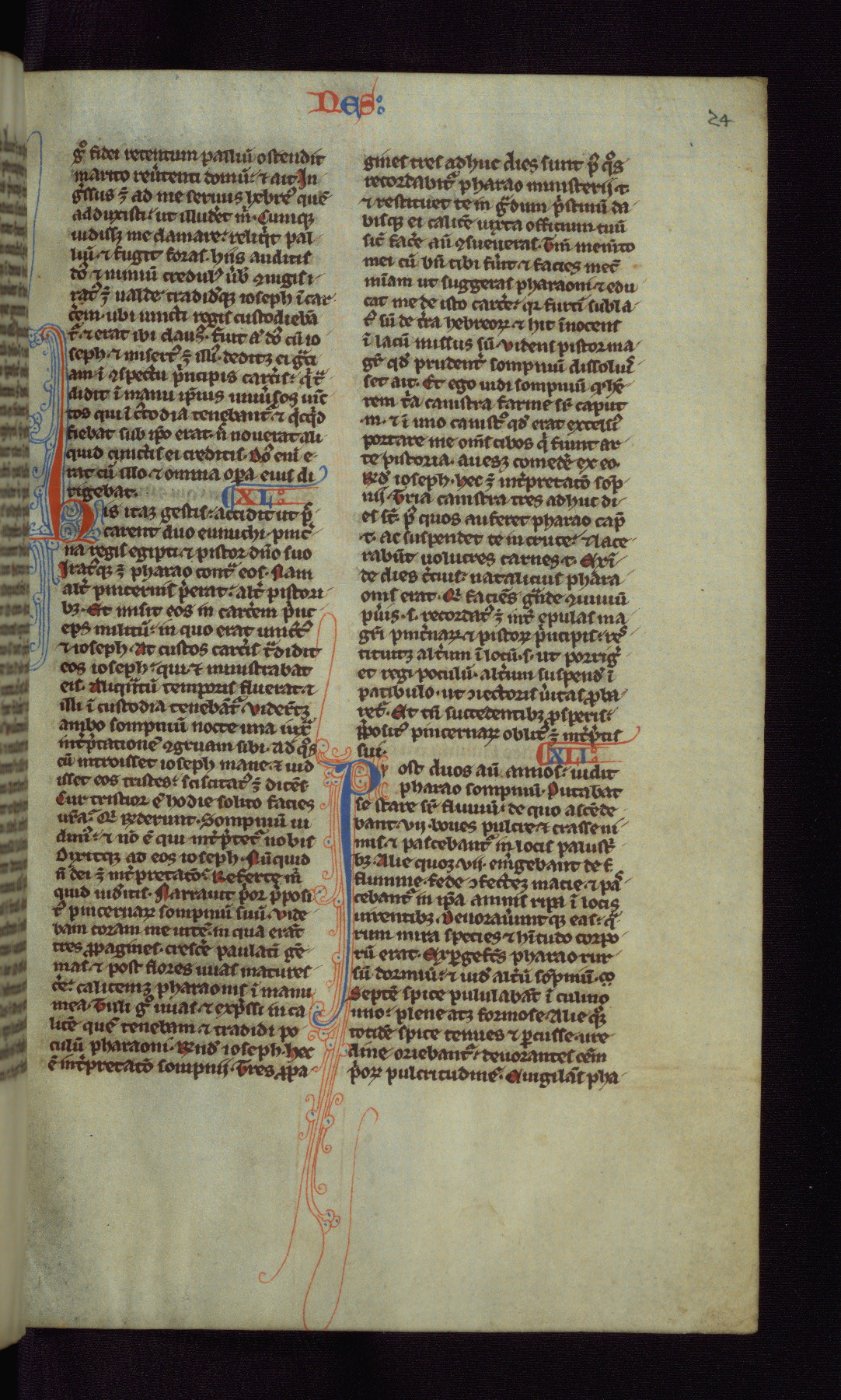 This pocket-size Bible was created around the middle of the thirteenth century in England. It contains the Vulgate text of the Old and New Testaments, arranged in order and divided into chapters. Such Bibles, designed for individual rather than institutional use, began to be created on a large scale during the thirteenth century, especially in Paris. This manuscript is illuminated with a large number of small historiated initials, and also includes a somewhat later image of the Three Living and the Three Dead, a popular scene based on a French poem of the same century.