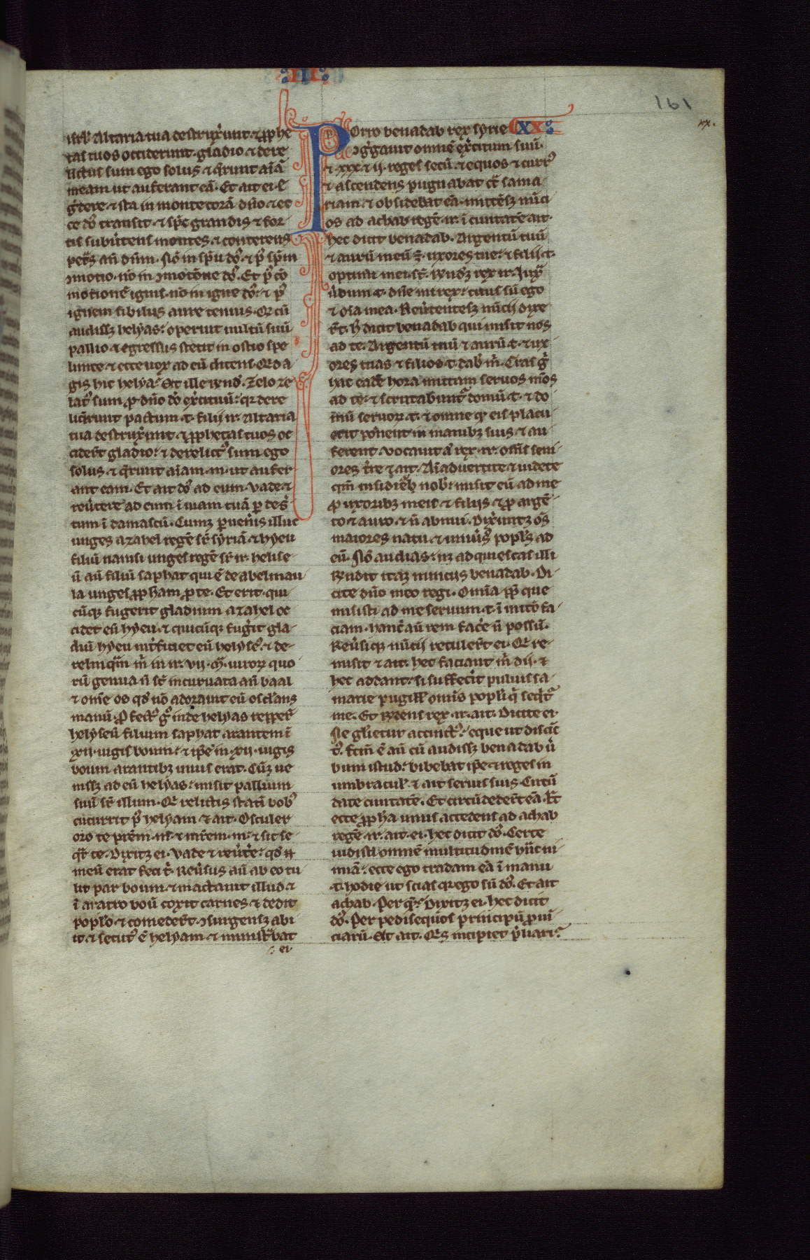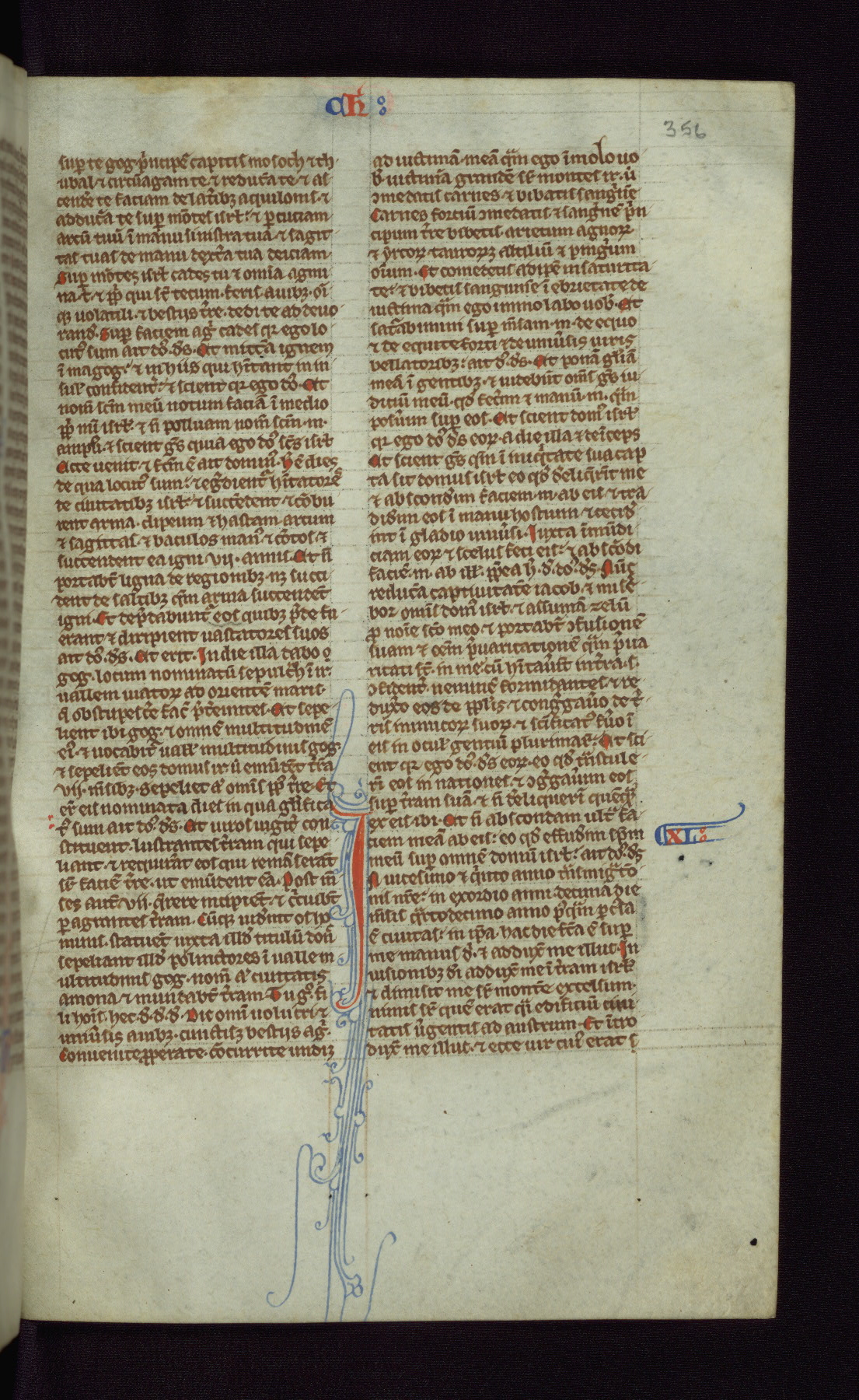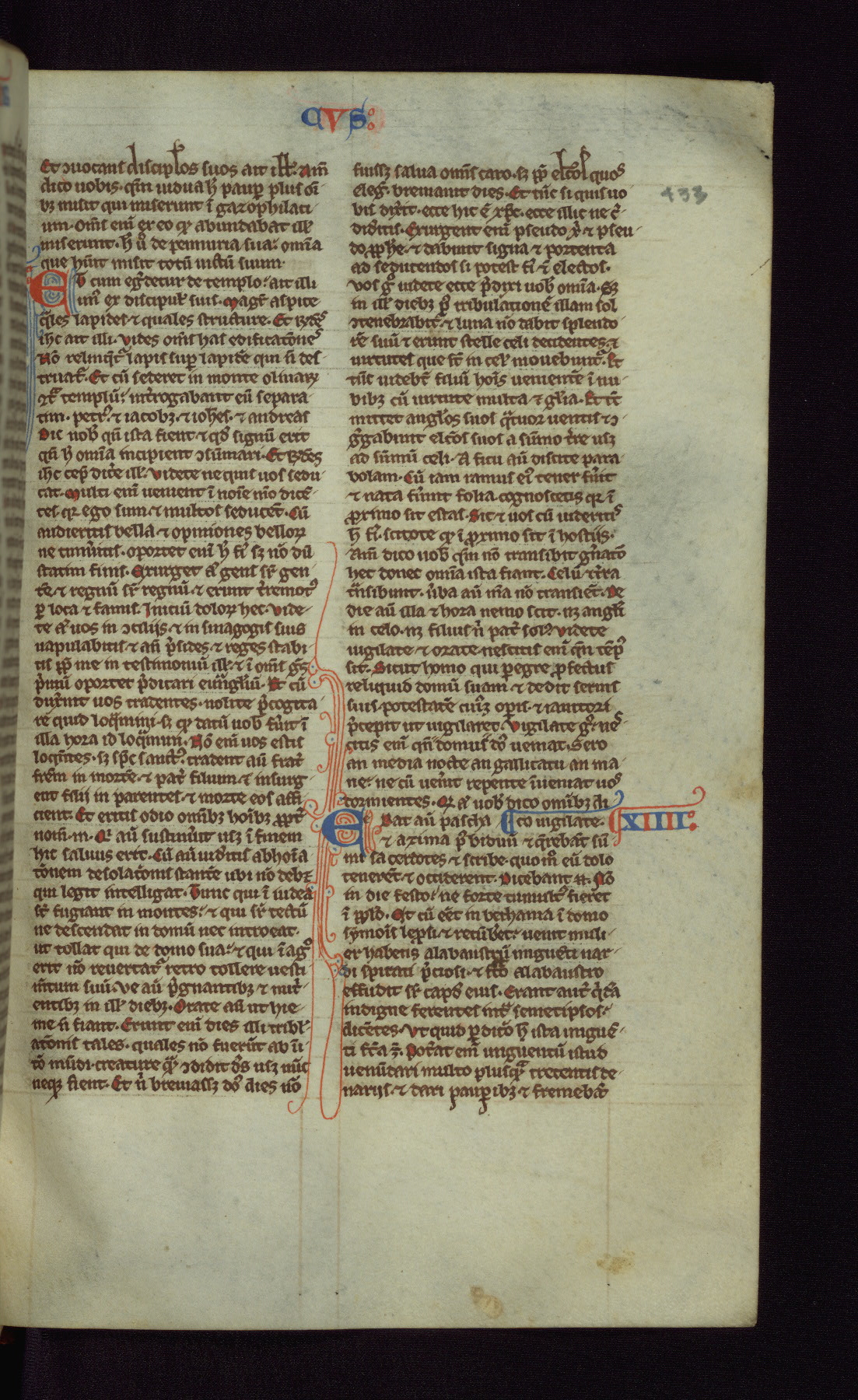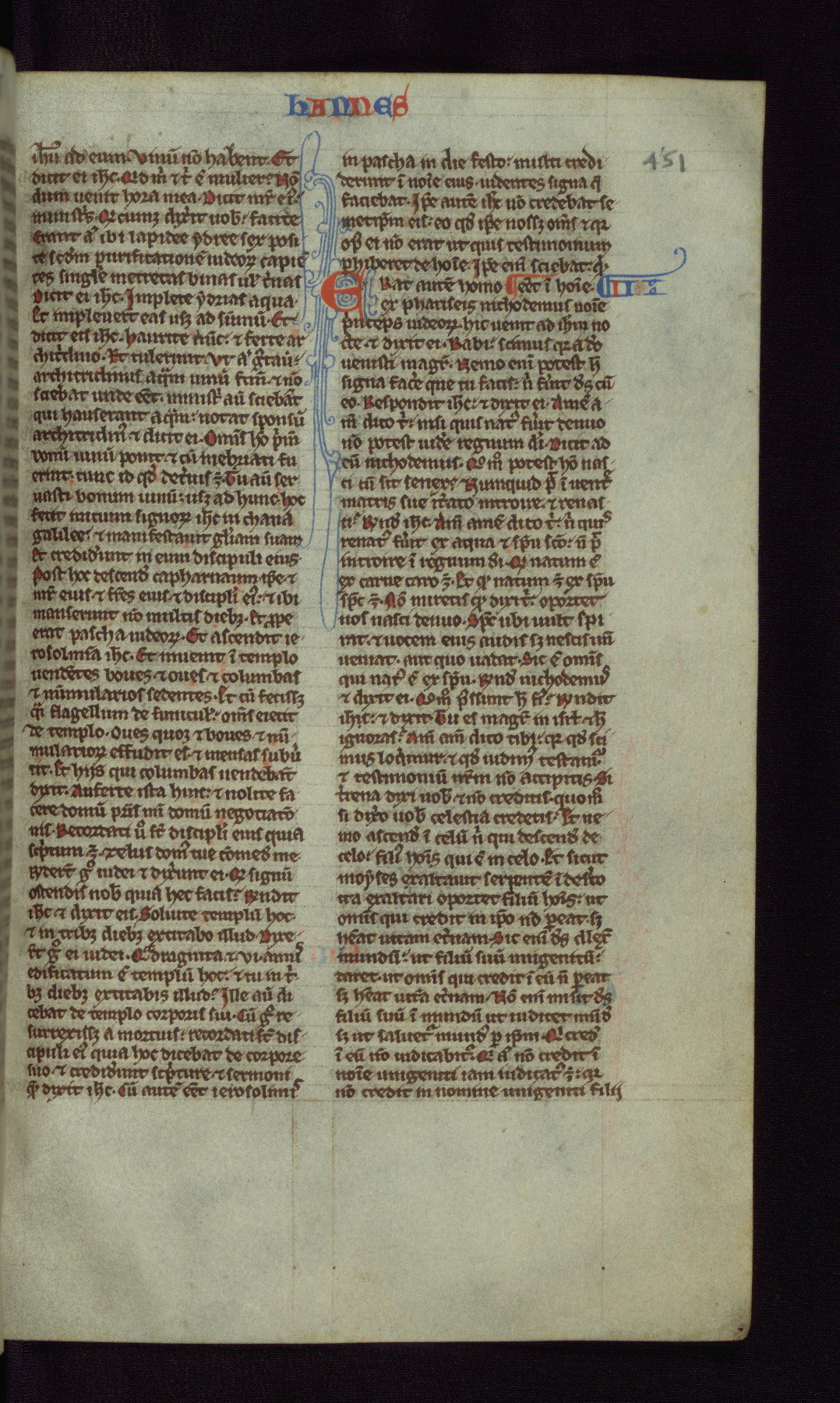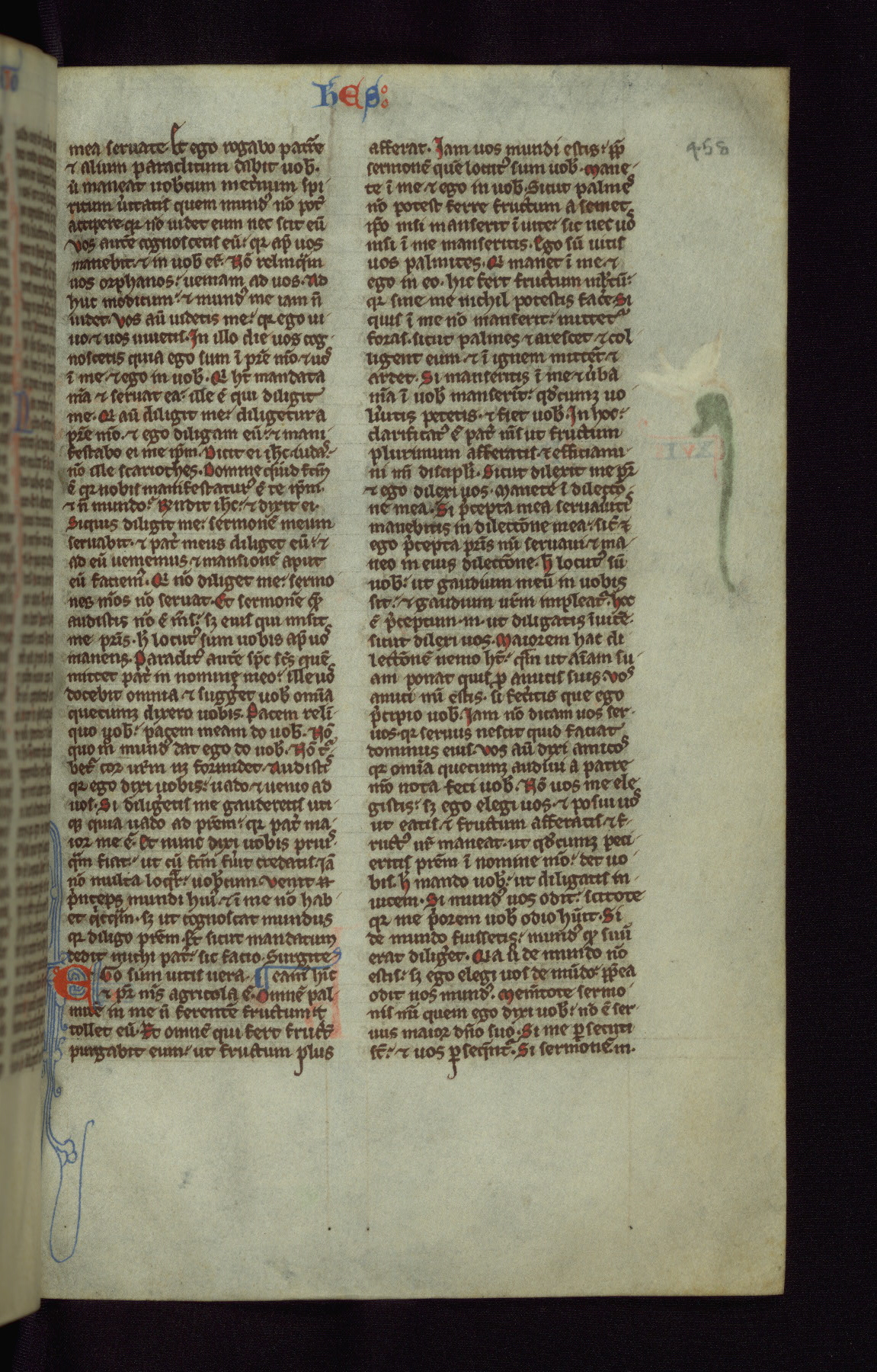 This pocket-size Bible was created around the middle of the thirteenth century in England. It contains the Vulgate text of the Old and New Testaments, arranged in order and divided into chapters. Such Bibles, designed for individual rather than institutional use, began to be created on a large scale during the thirteenth century, especially in Paris. This manuscript is illuminated with a large number of small historiated initials, and also includes a somewhat later image of the Three Living and the Three Dead, a popular scene based on a French poem of the same century.