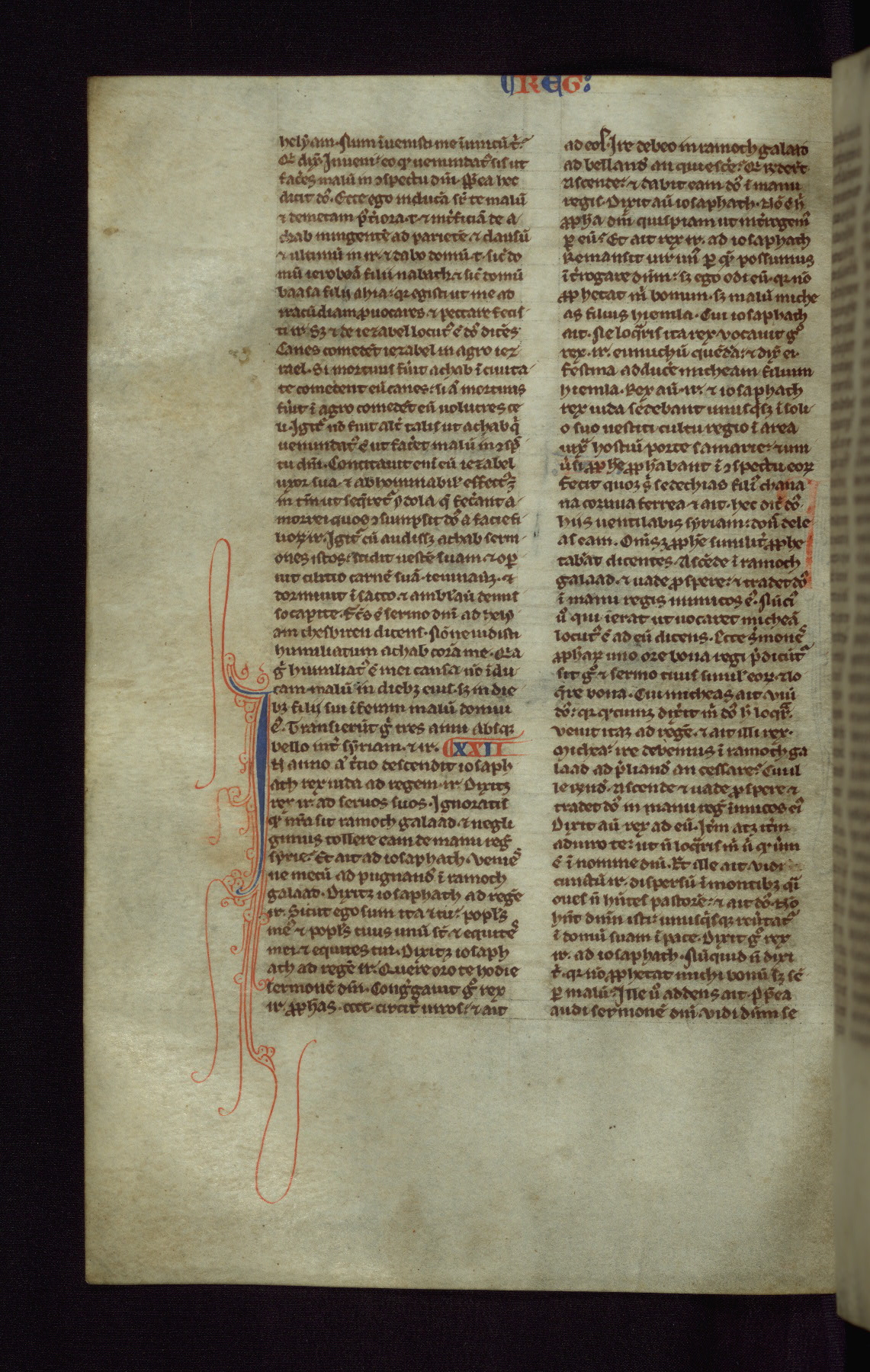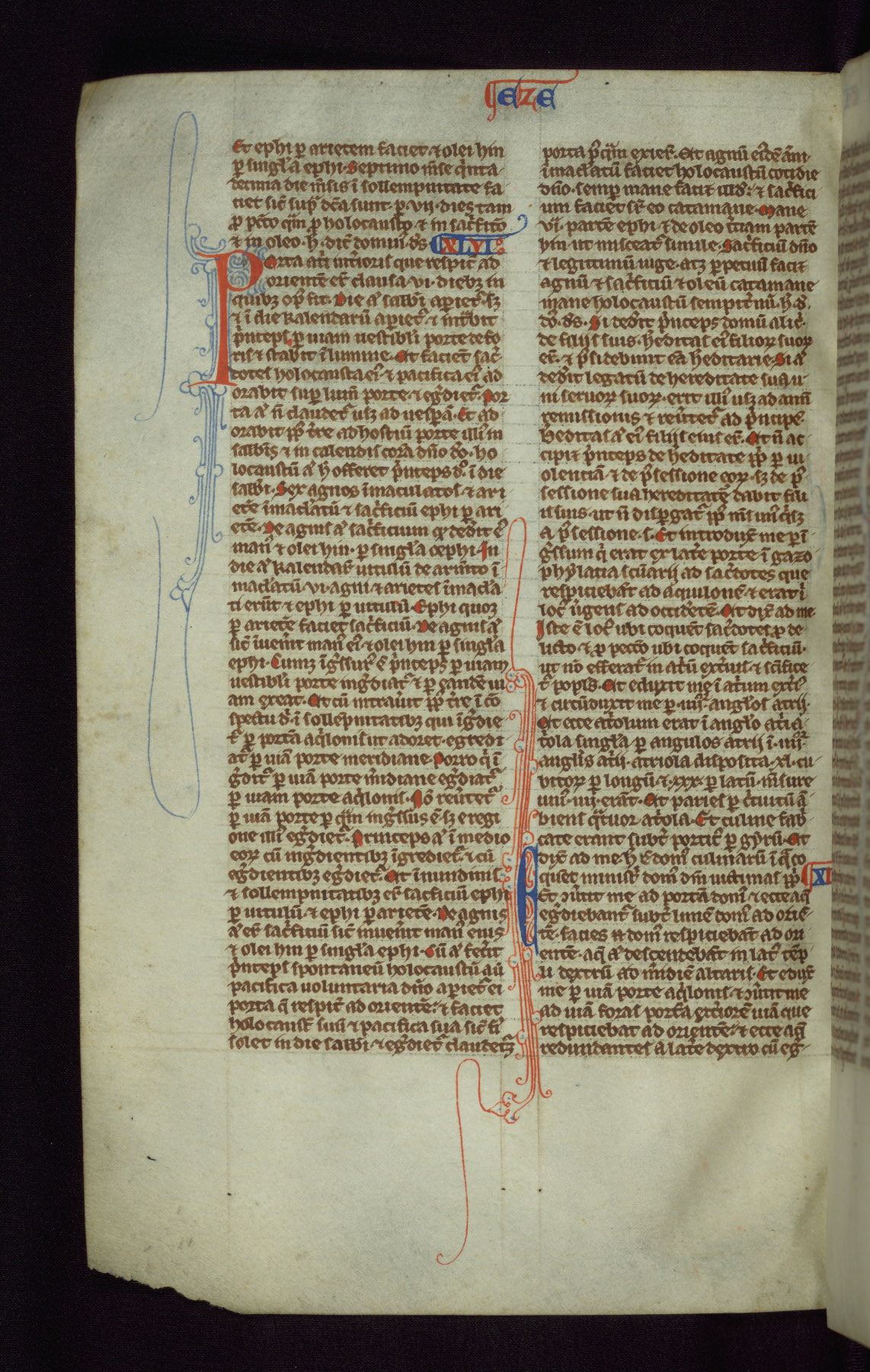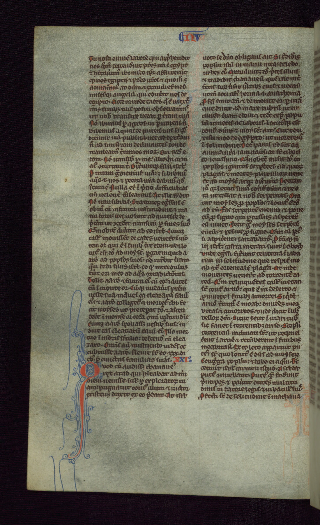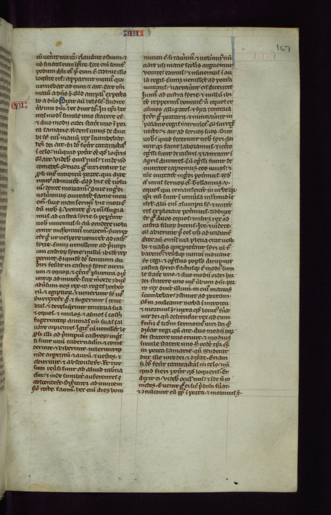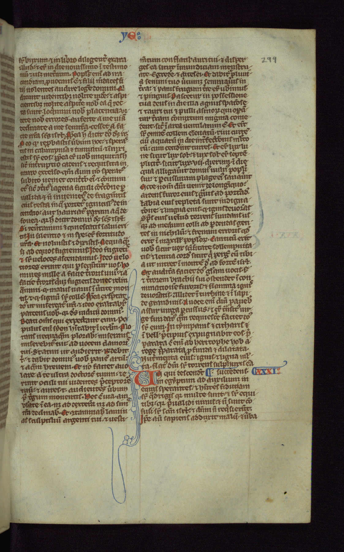 This pocket-size Bible was created around the middle of the thirteenth century in England. It contains the Vulgate text of the Old and New Testaments, arranged in order and divided into chapters. Such Bibles, designed for individual rather than institutional use, began to be created on a large scale during the thirteenth century, especially in Paris. This manuscript is illuminated with a large number of small historiated initials, and also includes a somewhat later image of the Three Living and the Three Dead, a popular scene based on a French poem of the same century.