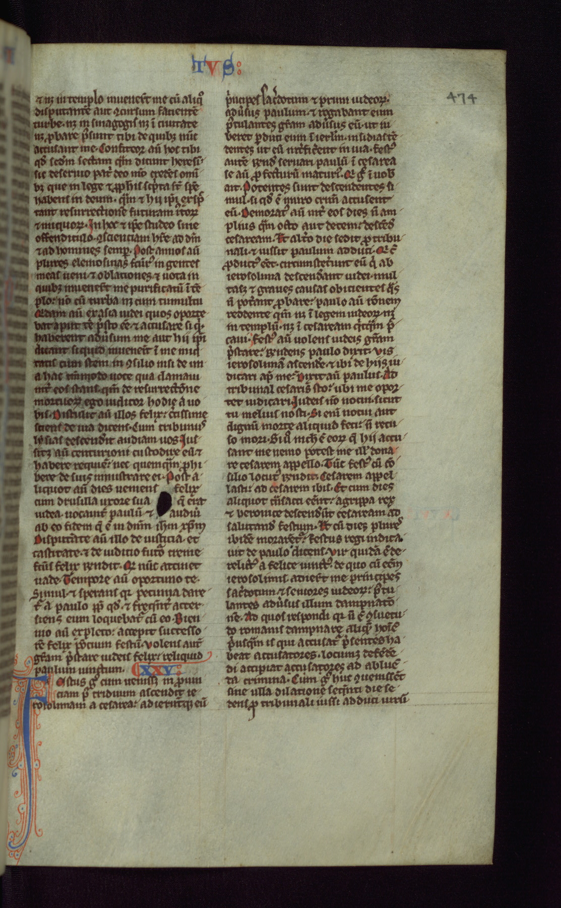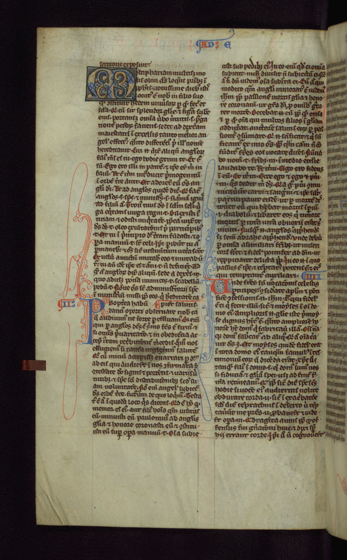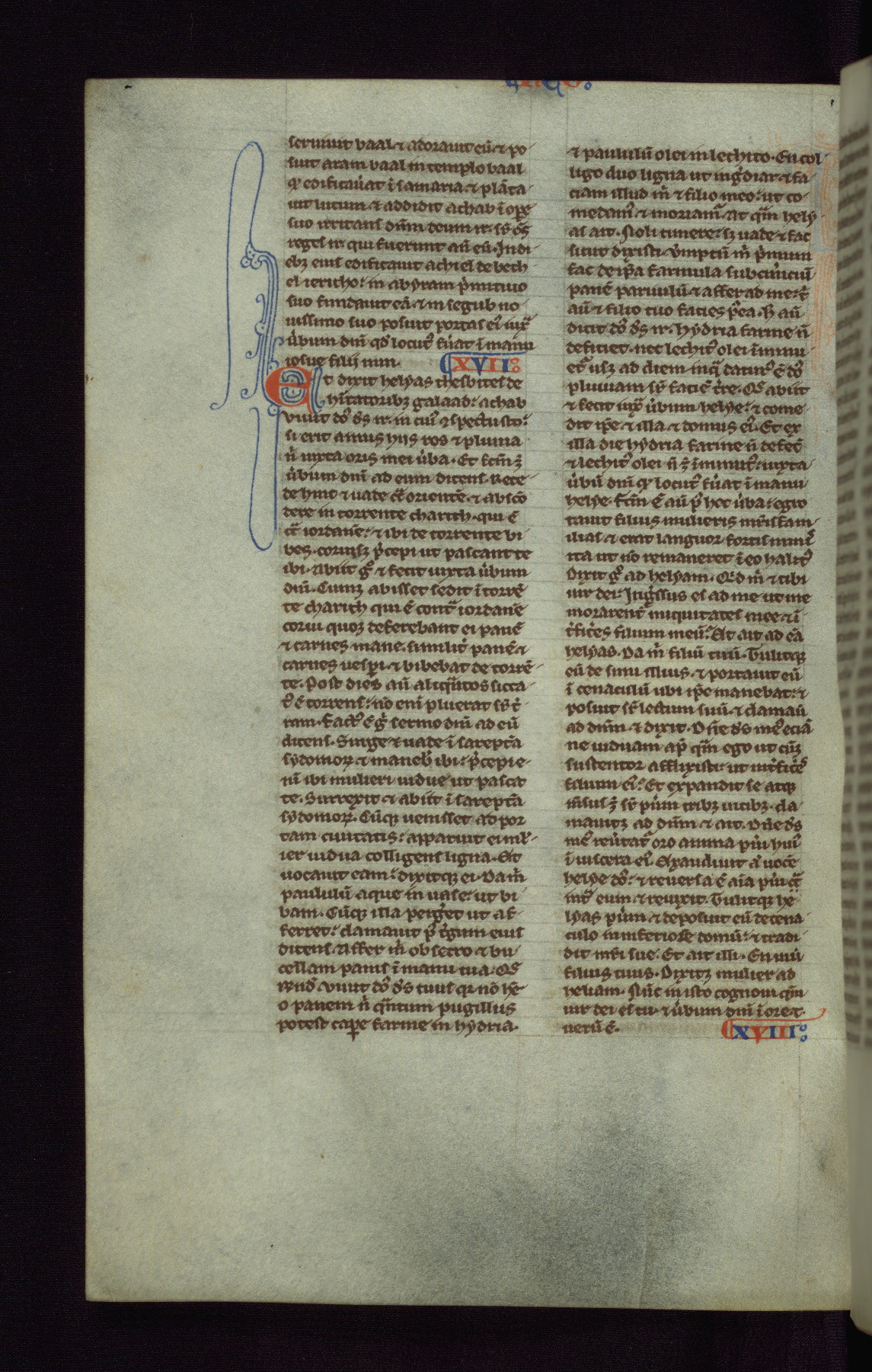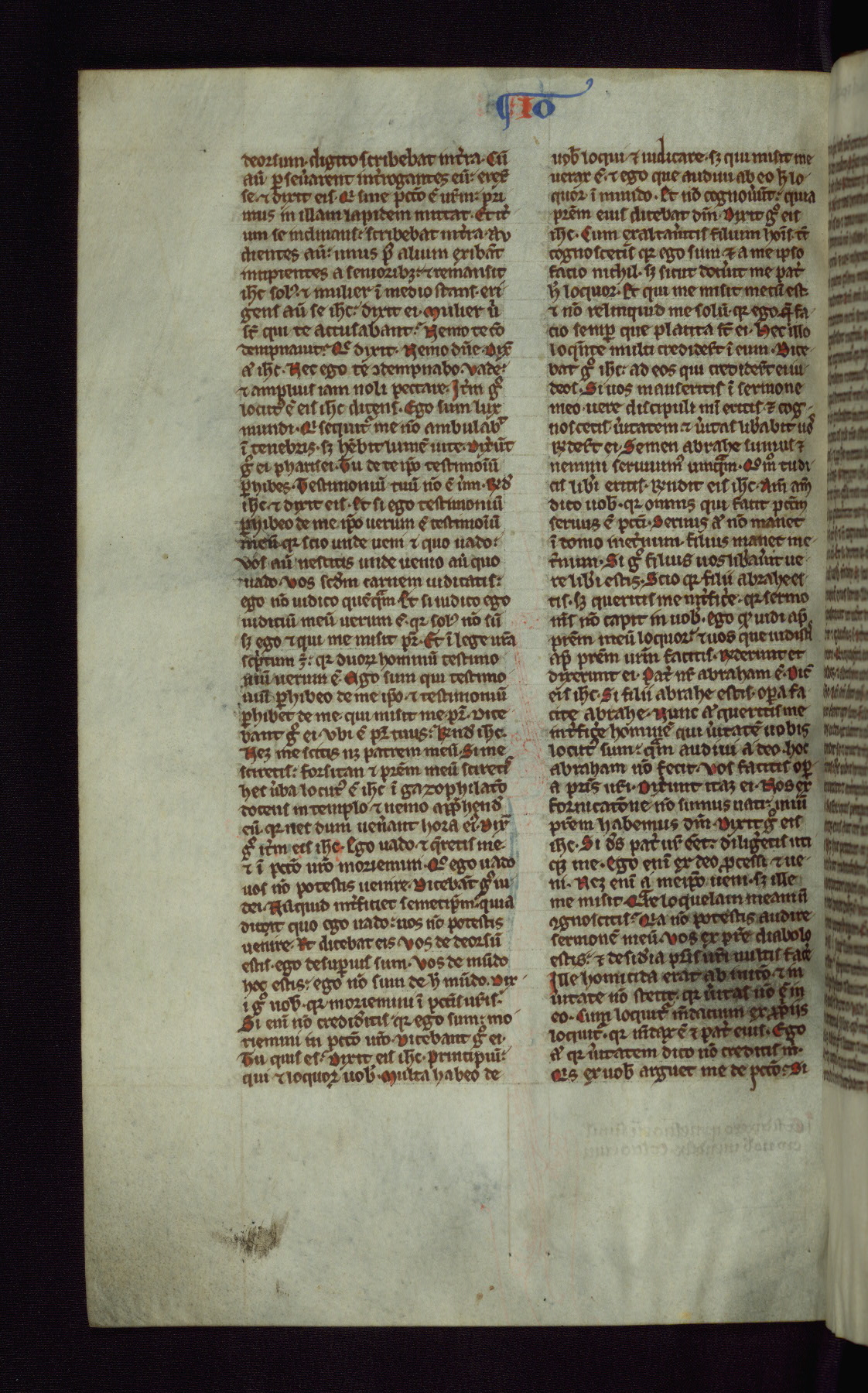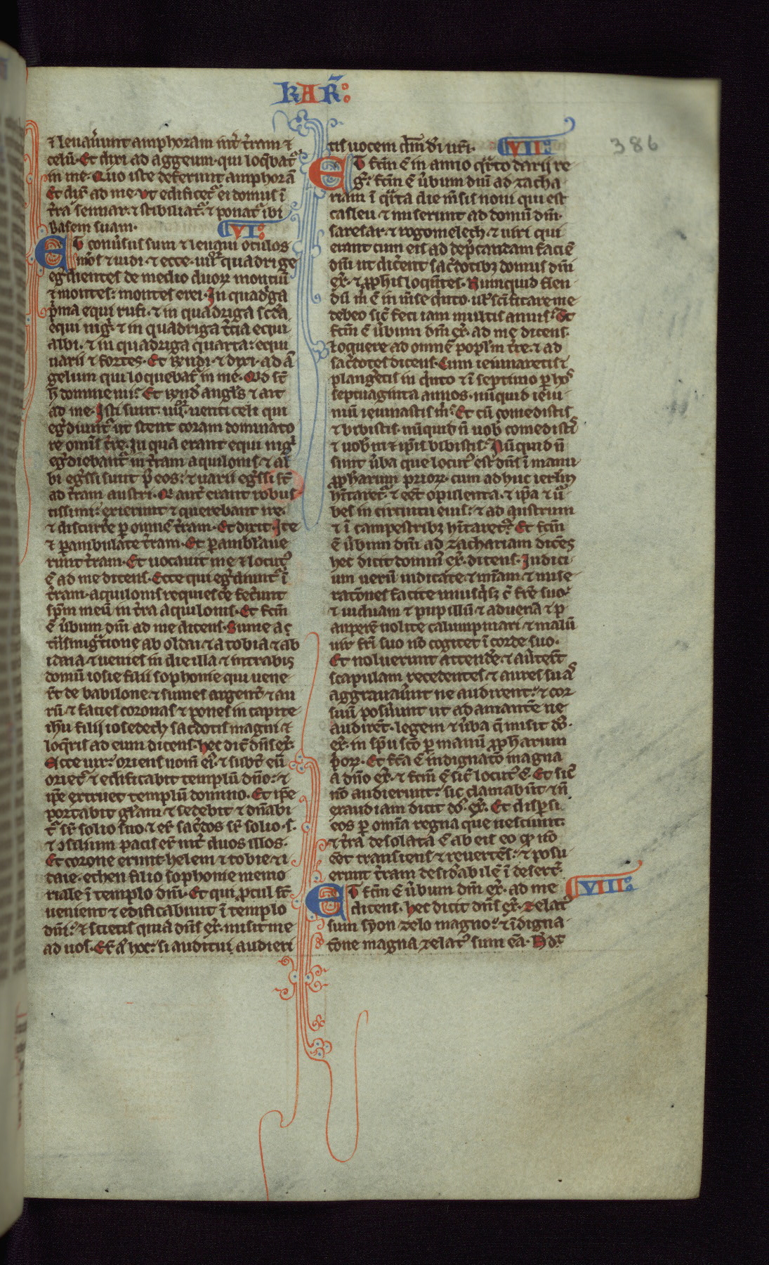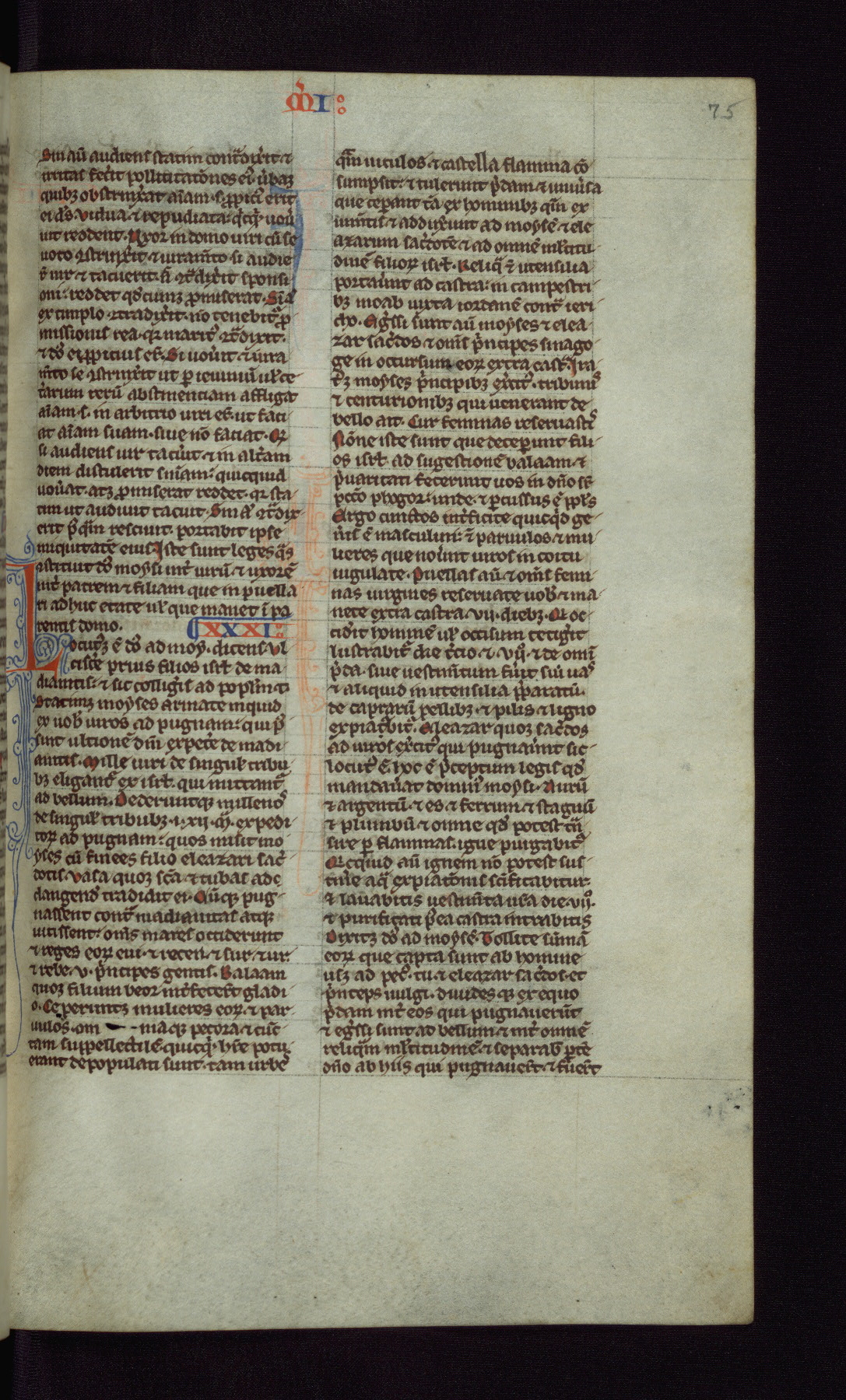 This pocket-size Bible was created around the middle of the thirteenth century in England. It contains the Vulgate text of the Old and New Testaments, arranged in order and divided into chapters. Such Bibles, designed for individual rather than institutional use, began to be created on a large scale during the thirteenth century, especially in Paris. This manuscript is illuminated with a large number of small historiated initials, and also includes a somewhat later image of the Three Living and the Three Dead, a popular scene based on a French poem of the same century.
