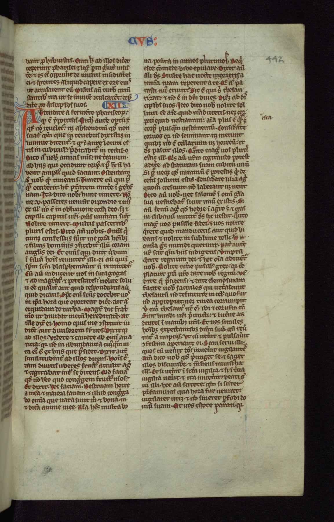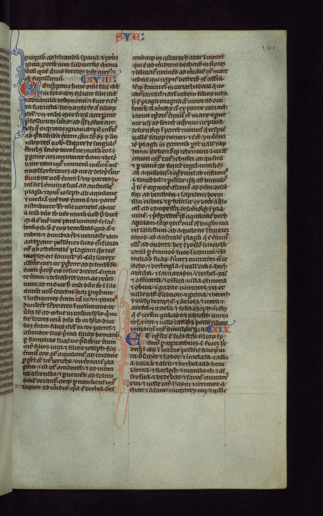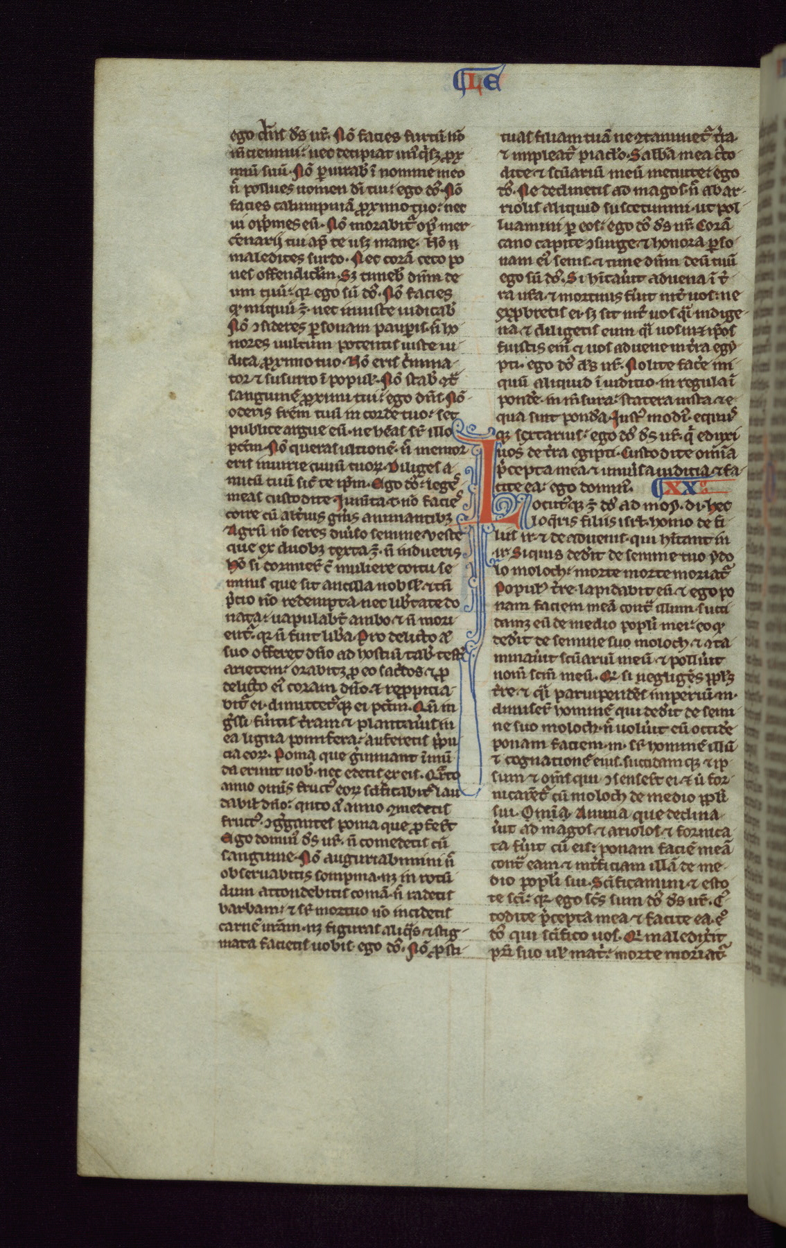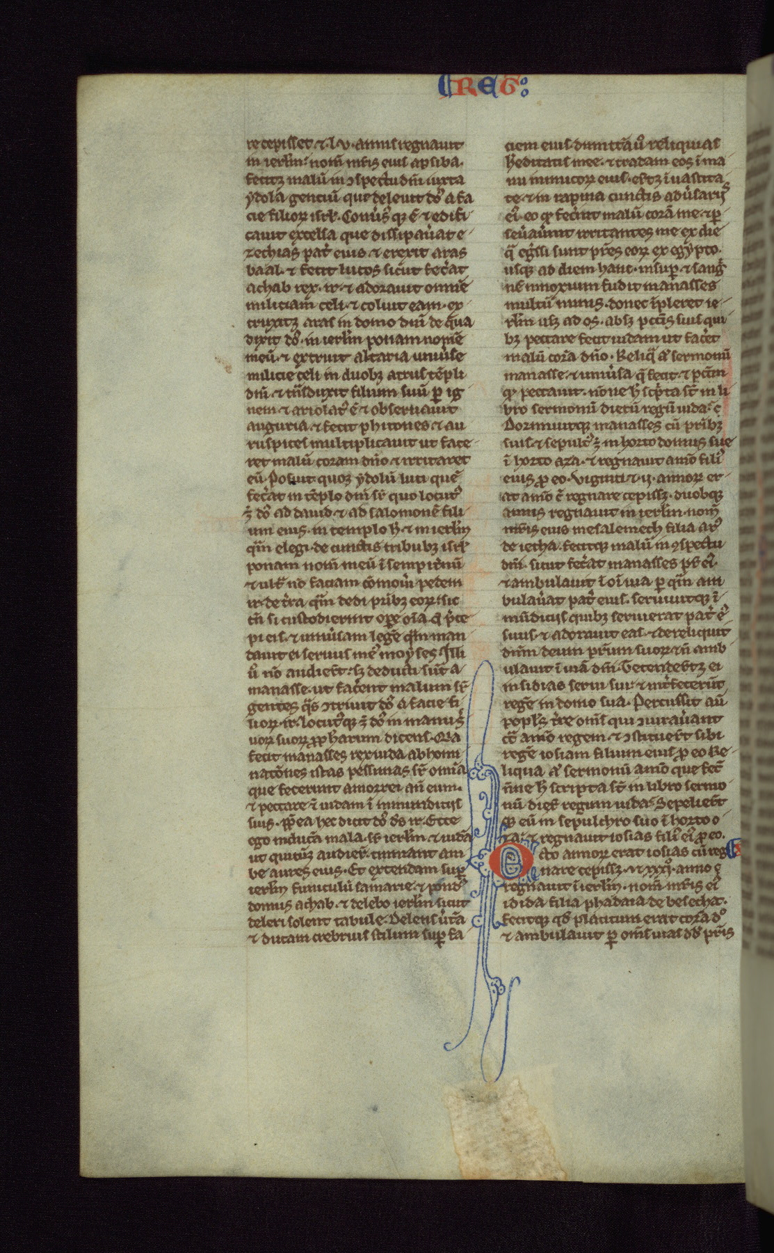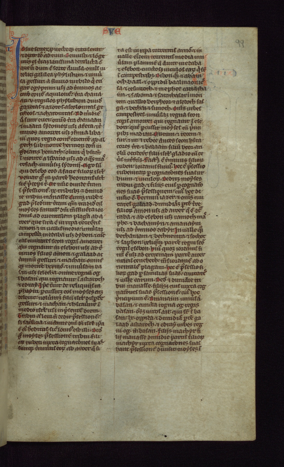 This pocket-size Bible was created around the middle of the thirteenth century in England. It contains the Vulgate text of the Old and New Testaments, arranged in order and divided into chapters. Such Bibles, designed for individual rather than institutional use, began to be created on a large scale during the thirteenth century, especially in Paris. This manuscript is illuminated with a large number of small historiated initials, and also includes a somewhat later image of the Three Living and the Three Dead, a popular scene based on a French poem of the same century.