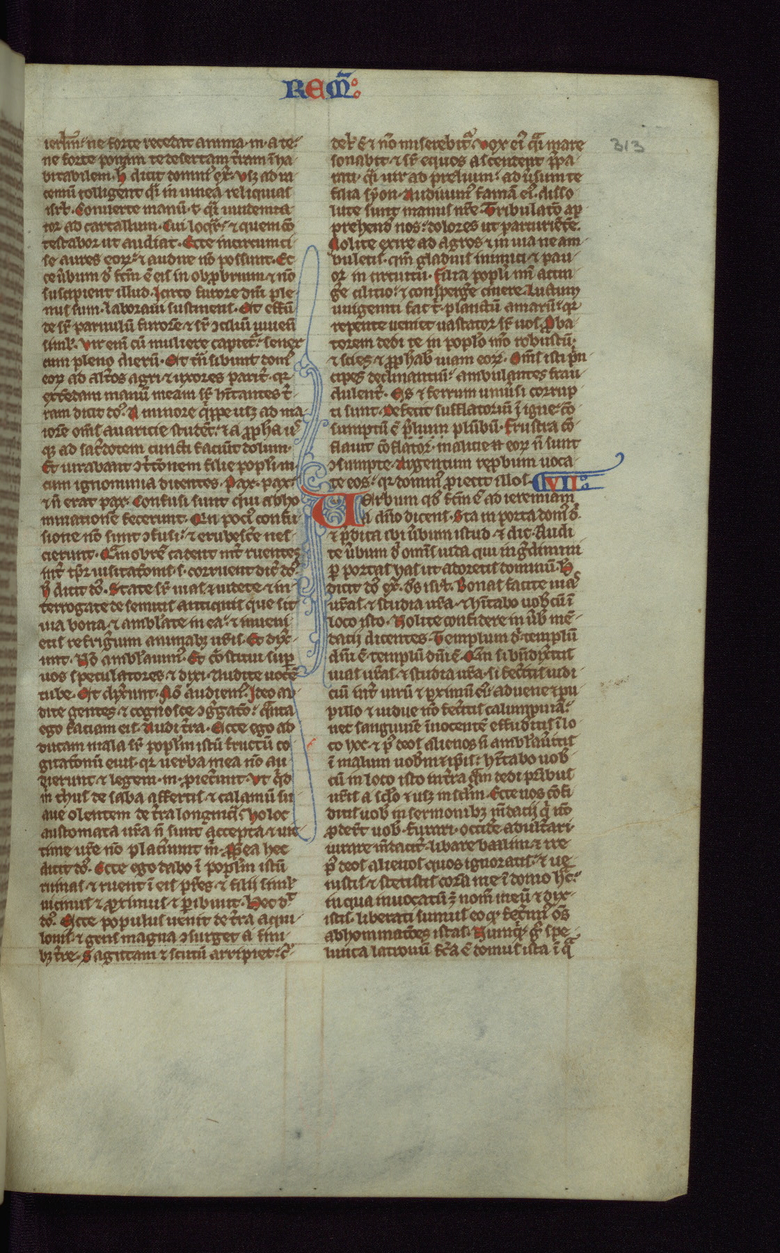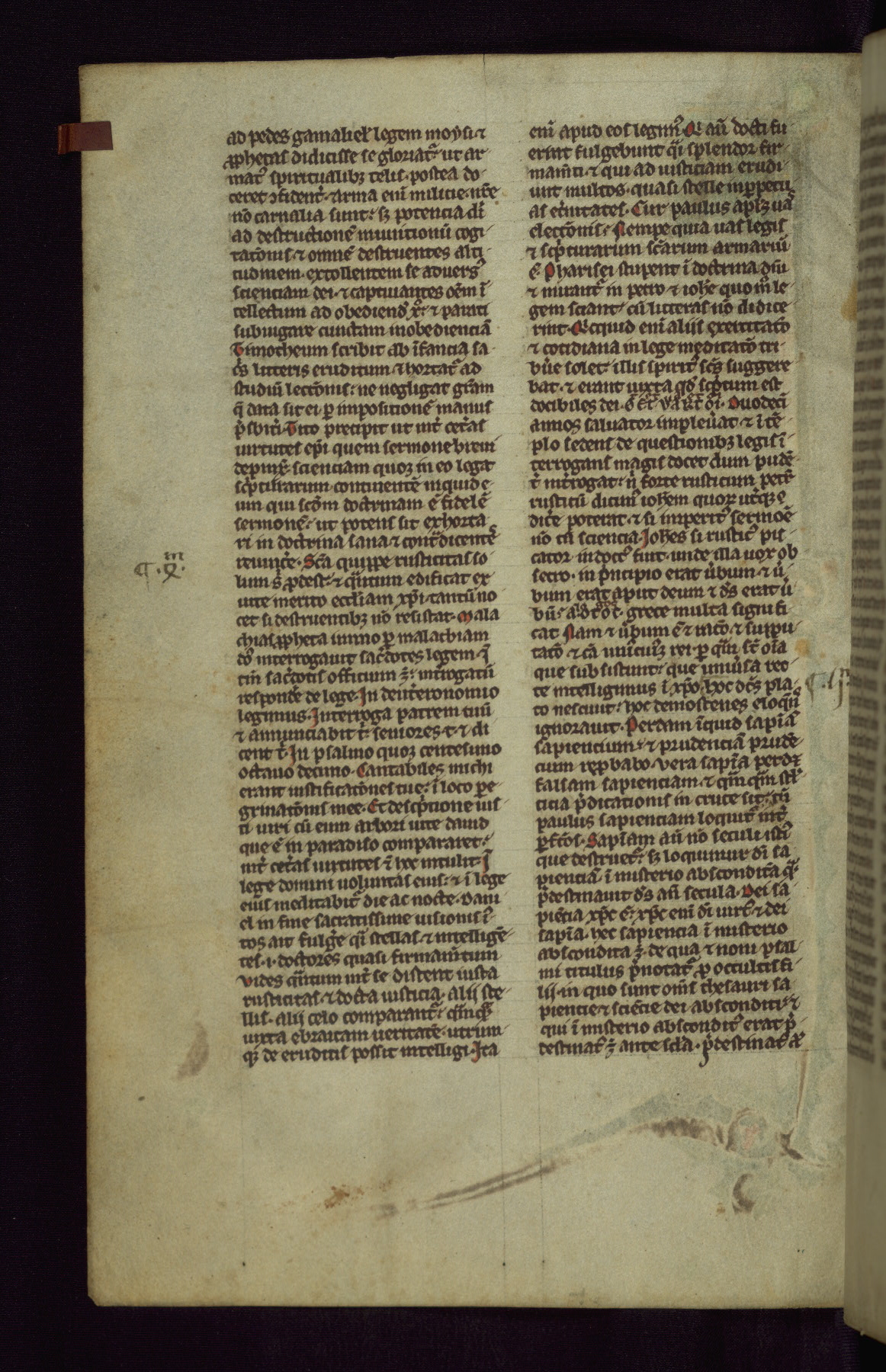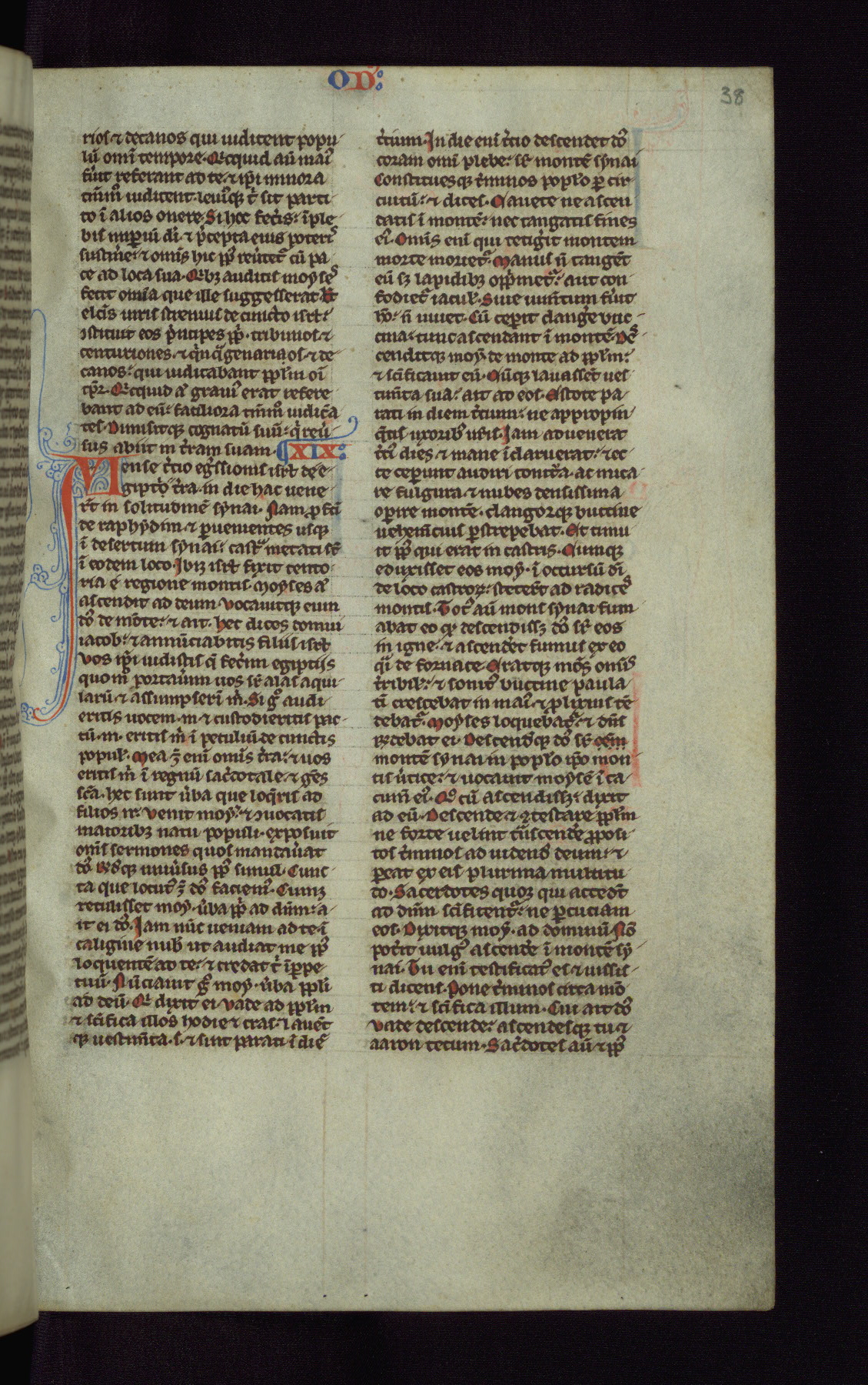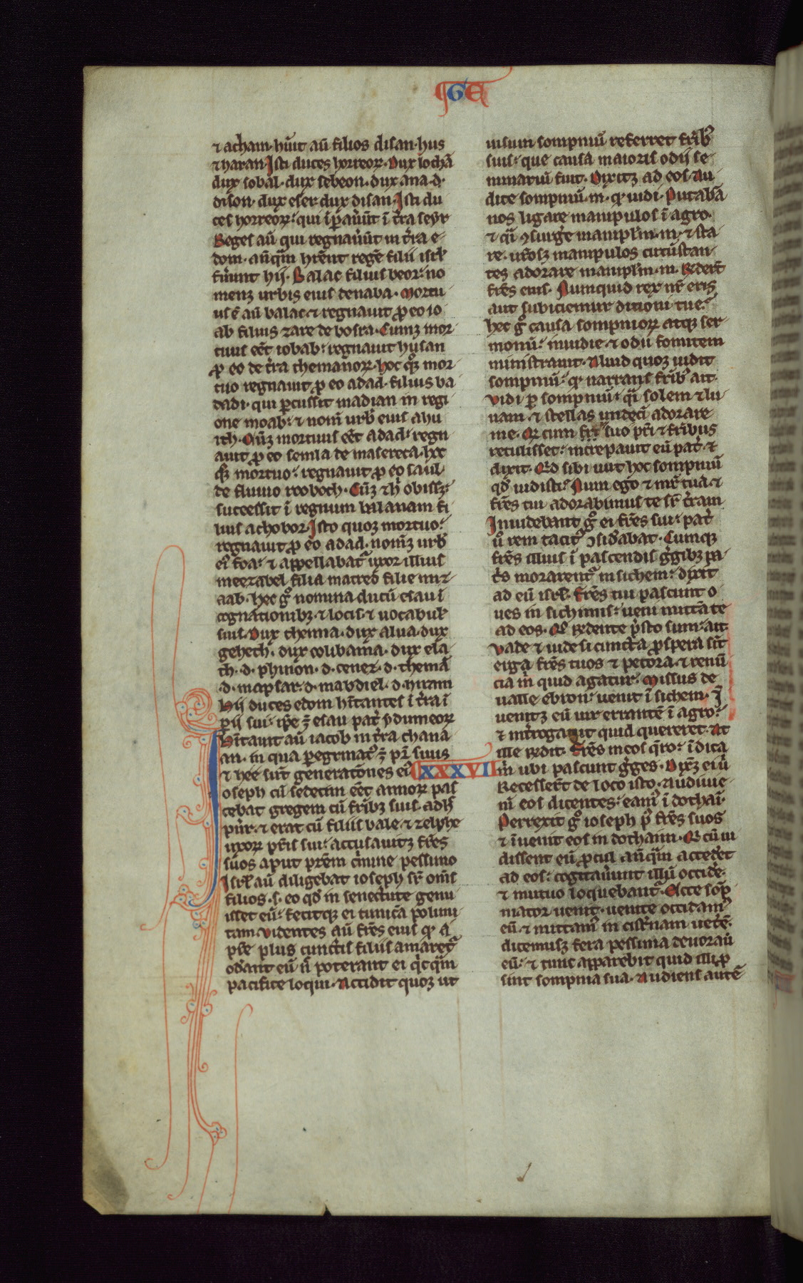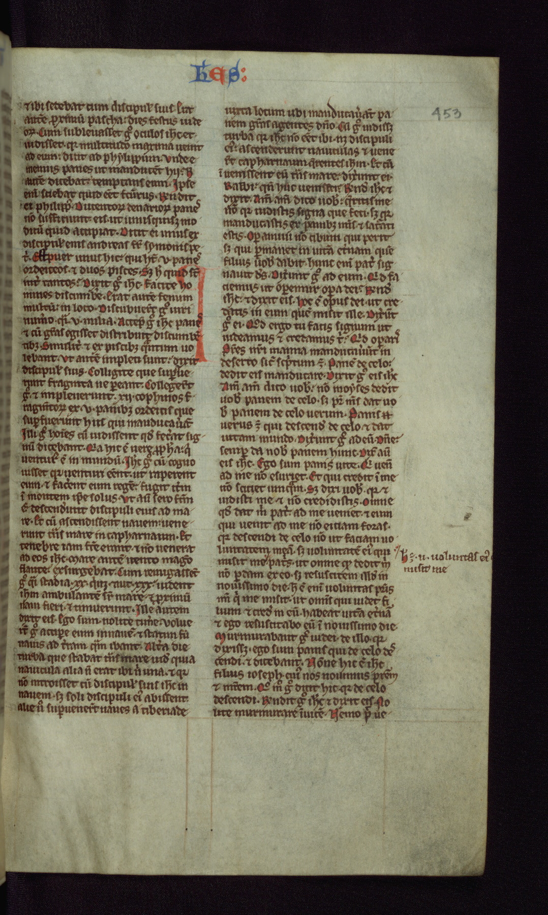 This pocket-size Bible was created around the middle of the thirteenth century in England. It contains the Vulgate text of the Old and New Testaments, arranged in order and divided into chapters. Such Bibles, designed for individual rather than institutional use, began to be created on a large scale during the thirteenth century, especially in Paris. This manuscript is illuminated with a large number of small historiated initials, and also includes a somewhat later image of the Three Living and the Three Dead, a popular scene based on a French poem of the same century.