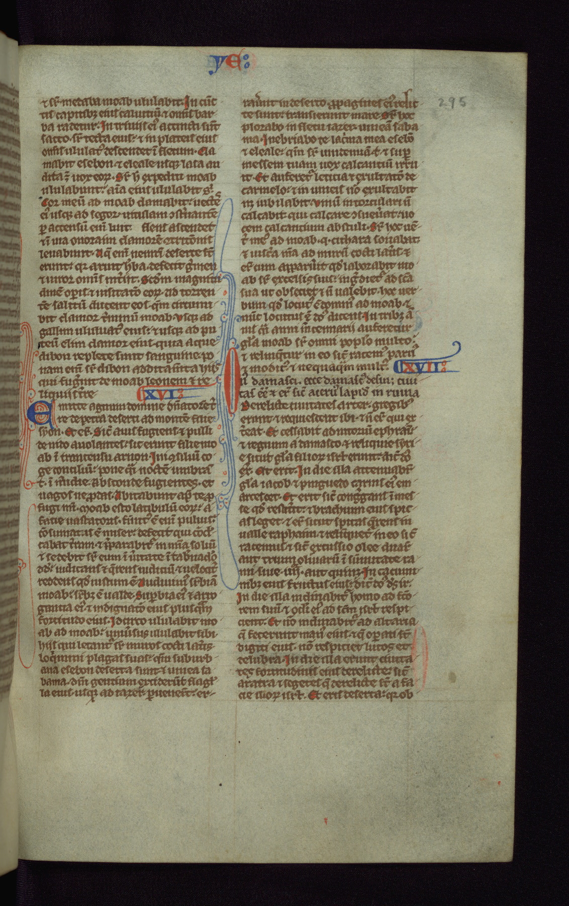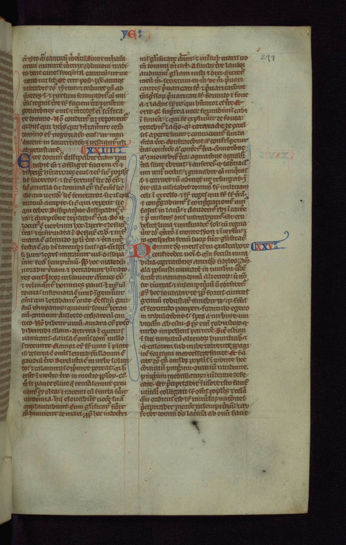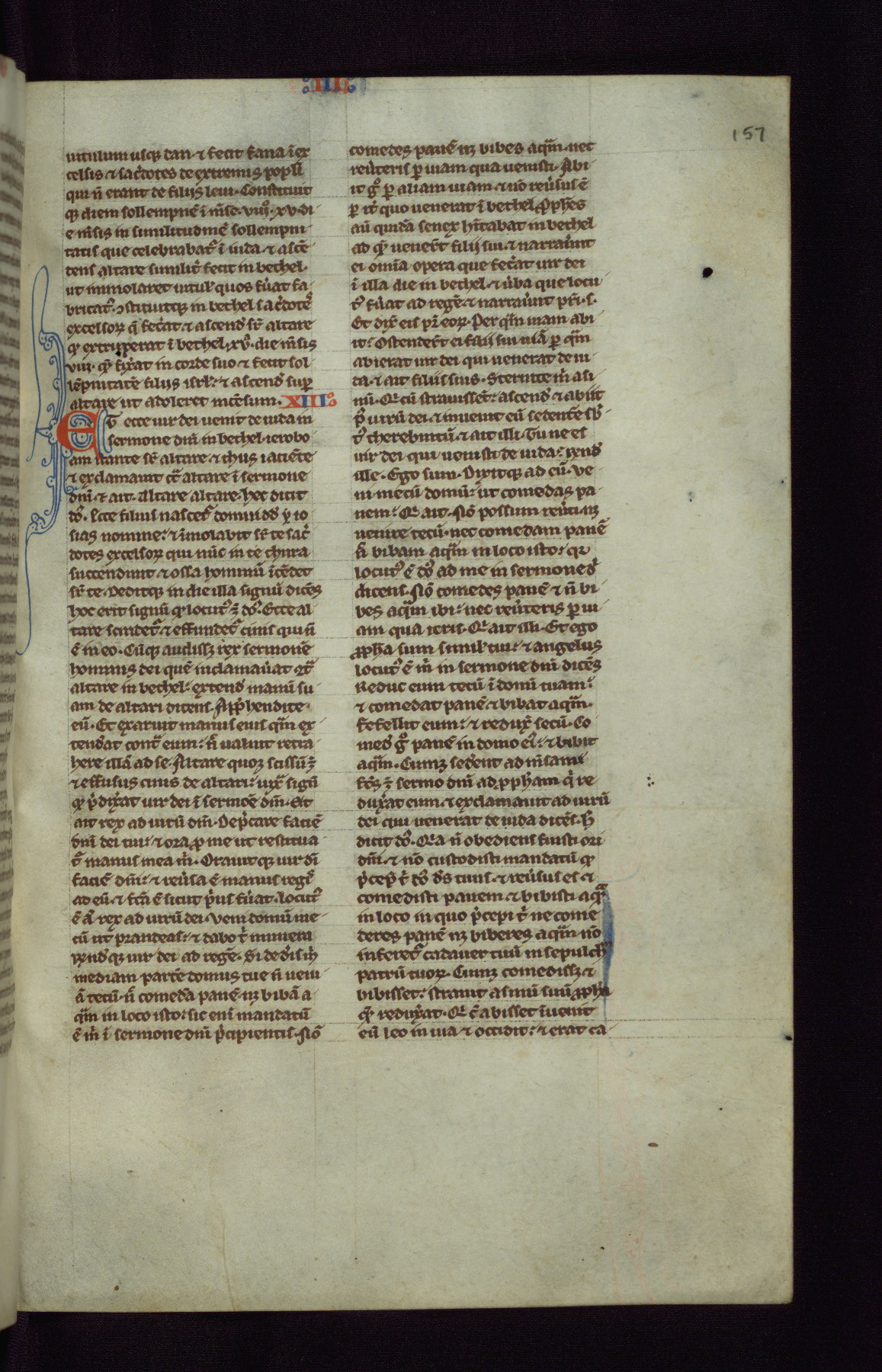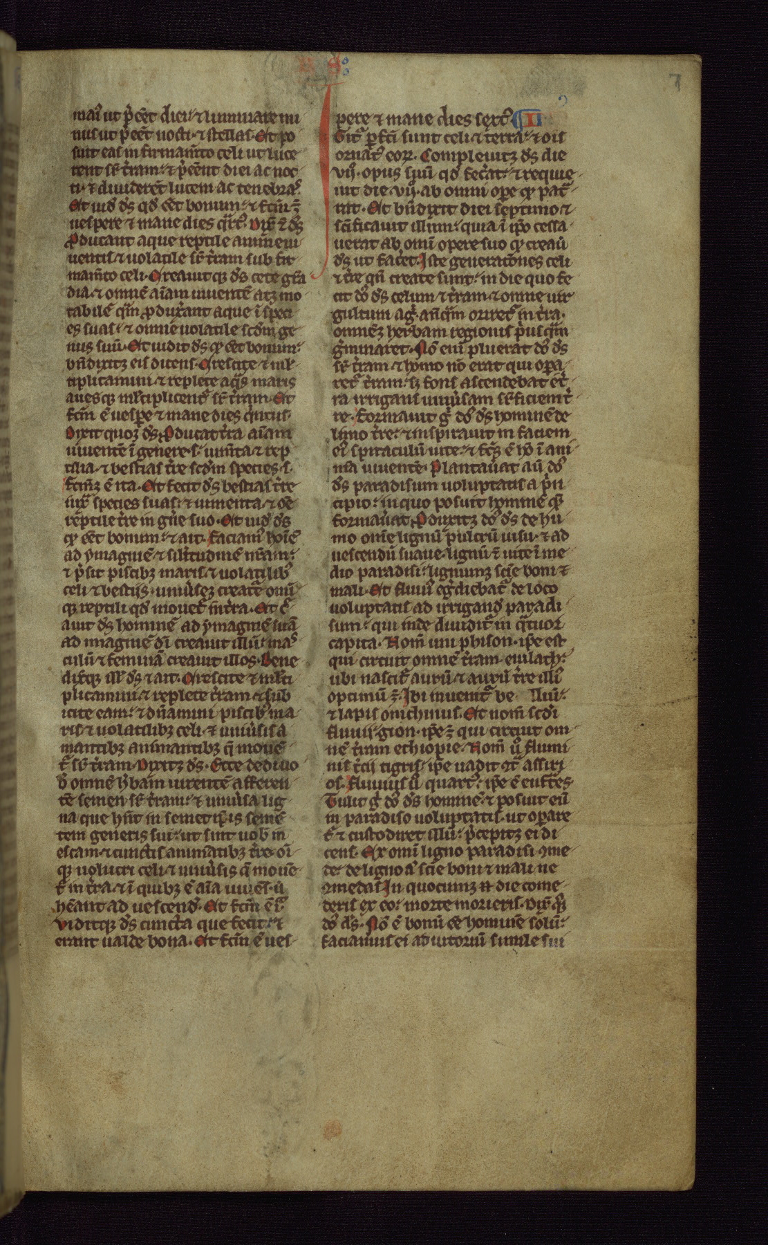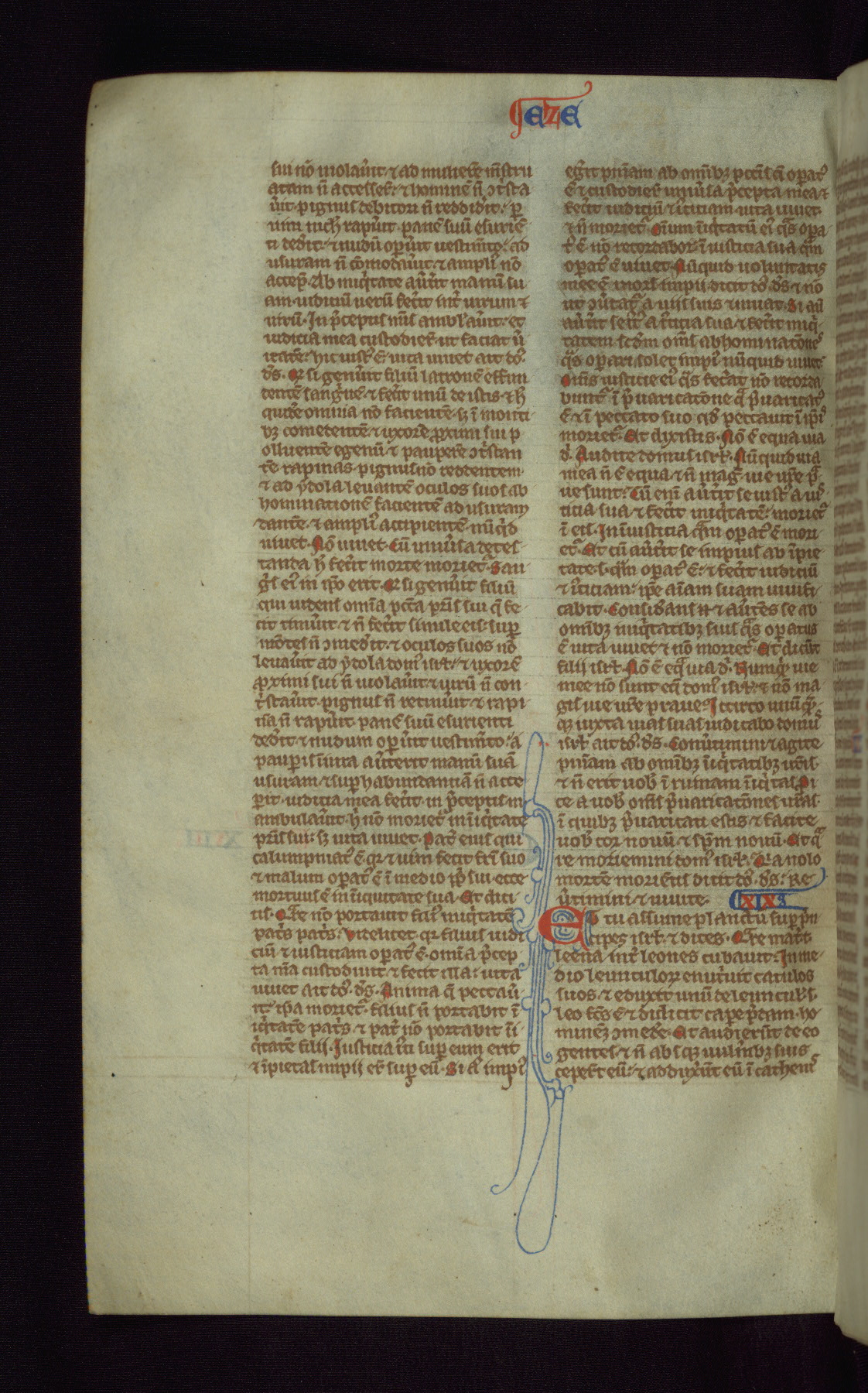 This pocket-size Bible was created around the middle of the thirteenth century in England. It contains the Vulgate text of the Old and New Testaments, arranged in order and divided into chapters. Such Bibles, designed for individual rather than institutional use, began to be created on a large scale during the thirteenth century, especially in Paris. This manuscript is illuminated with a large number of small historiated initials, and also includes a somewhat later image of the Three Living and the Three Dead, a popular scene based on a French poem of the same century.