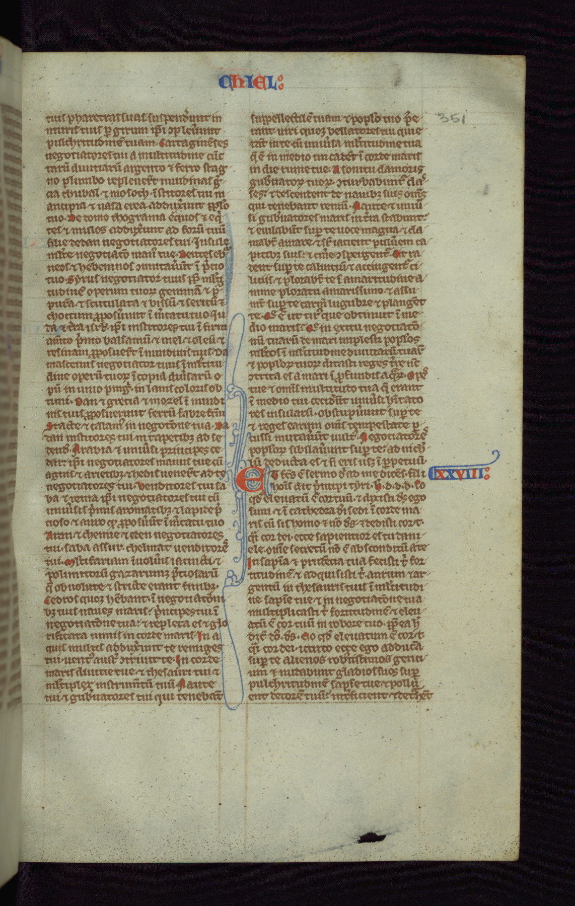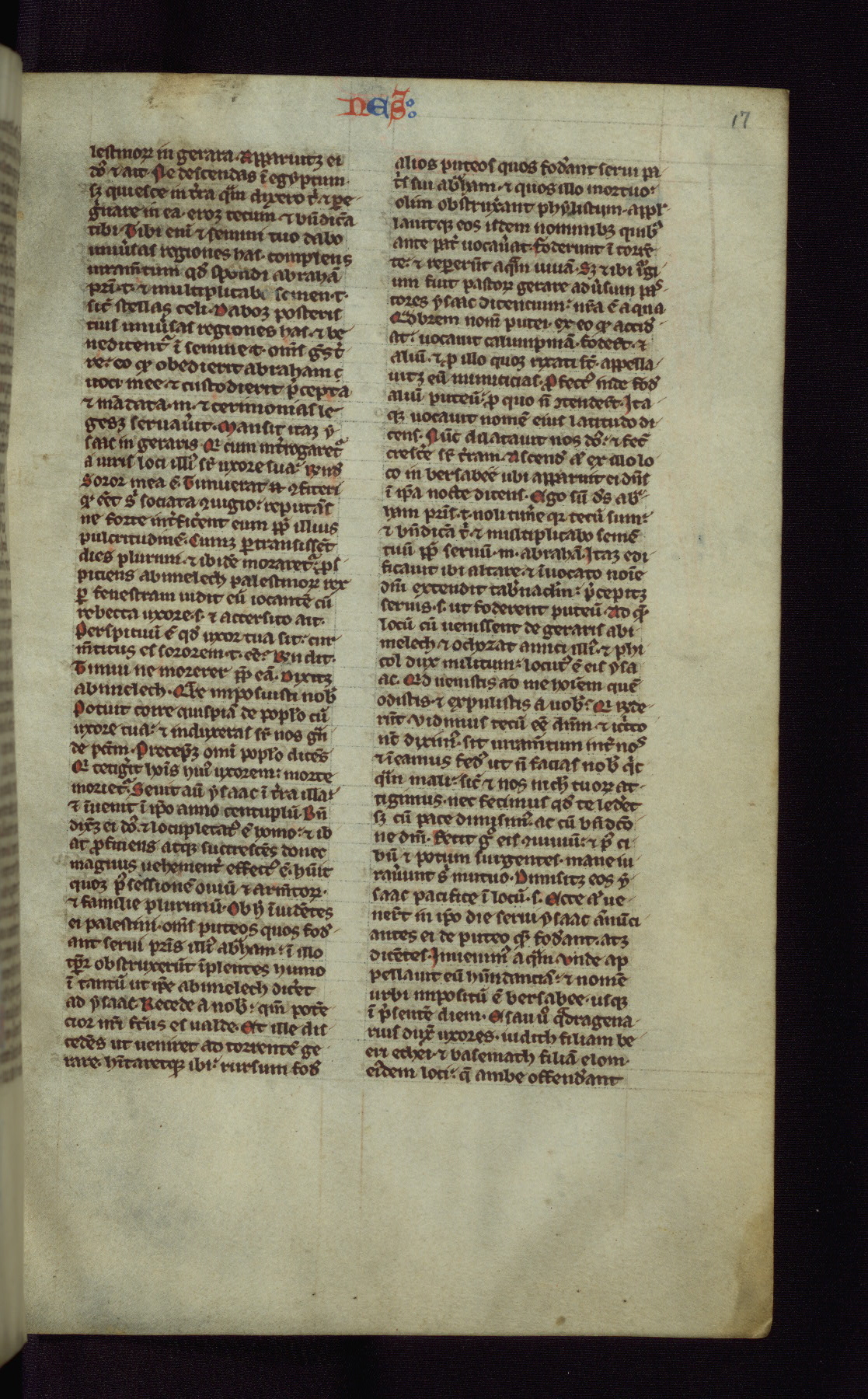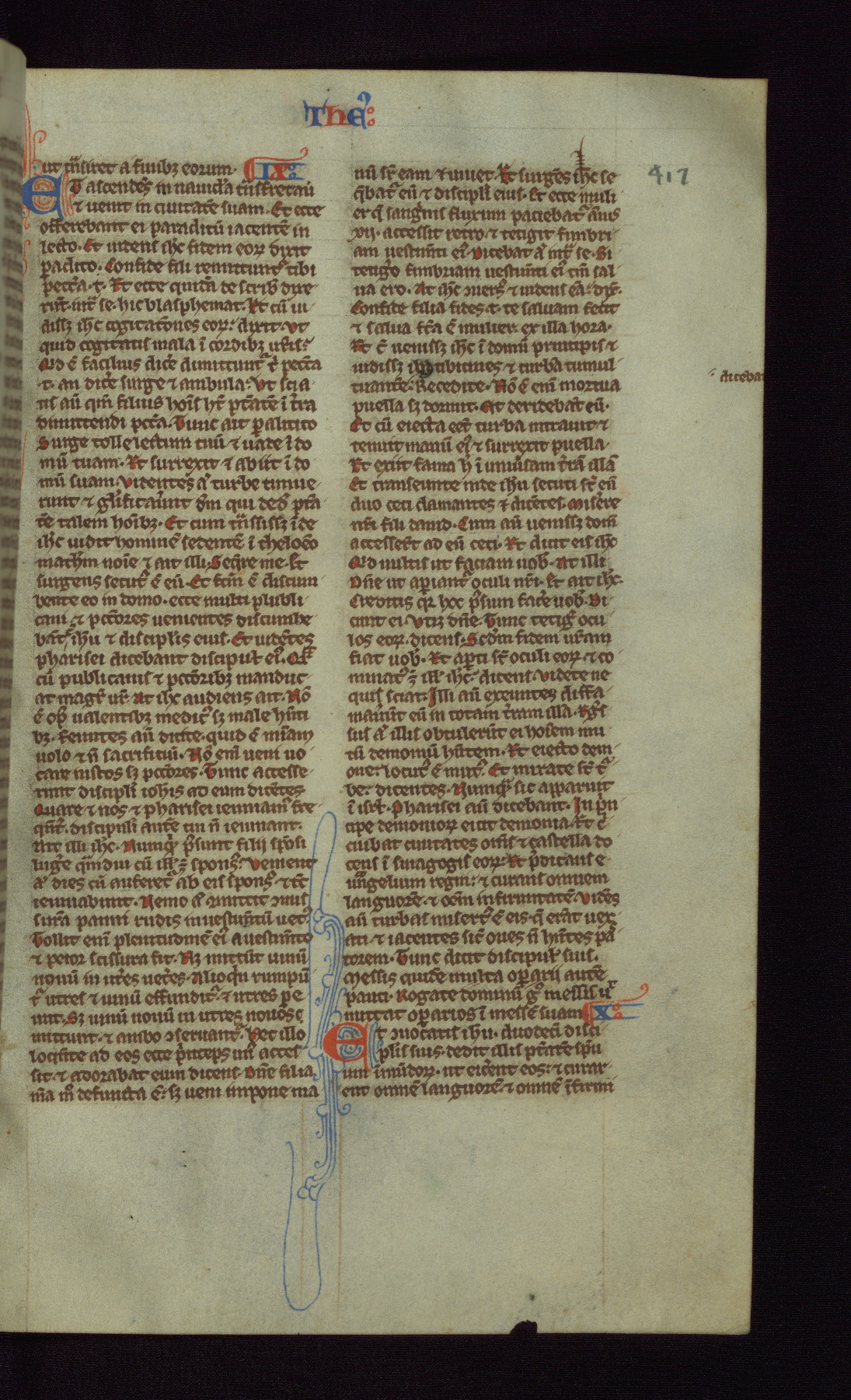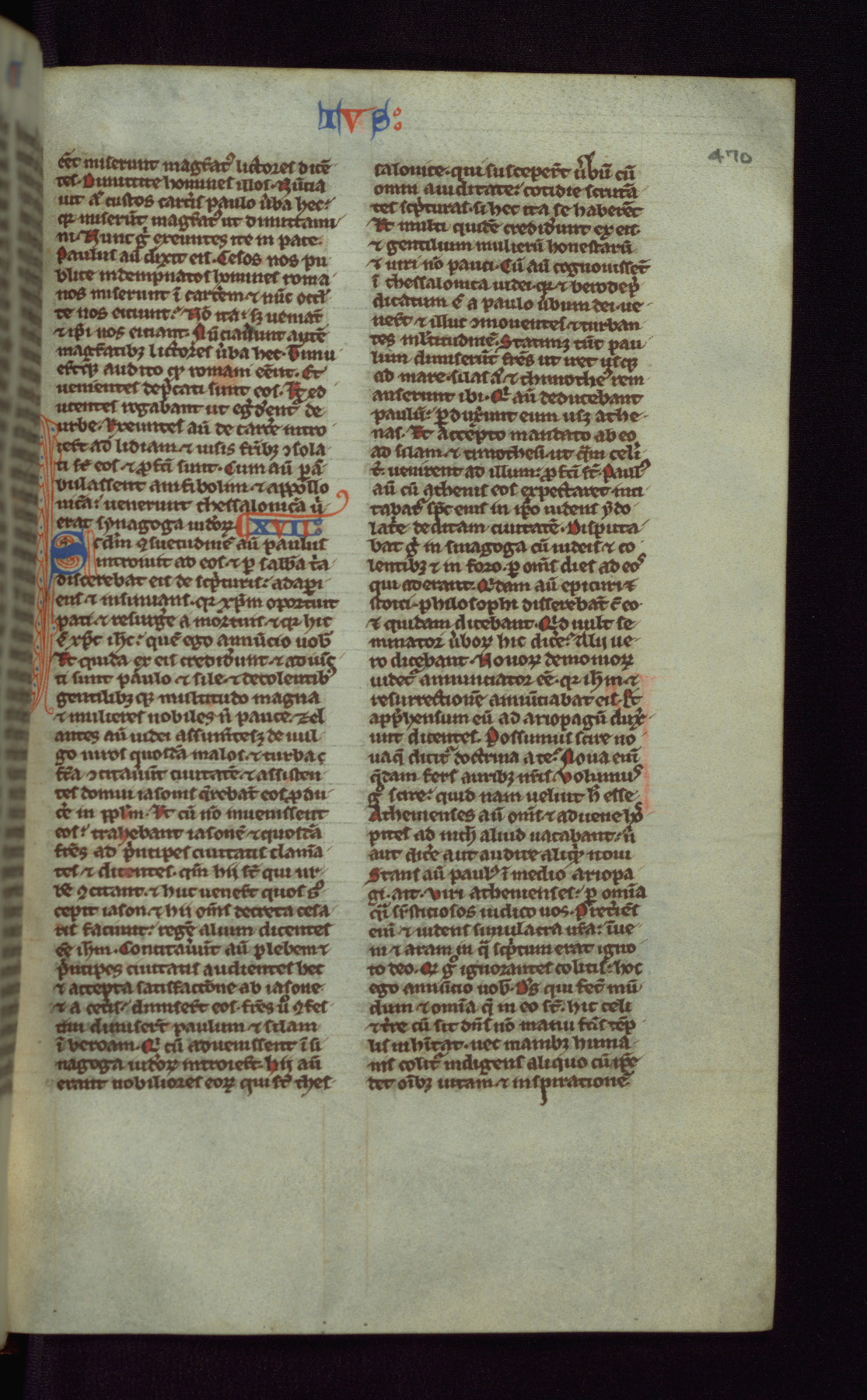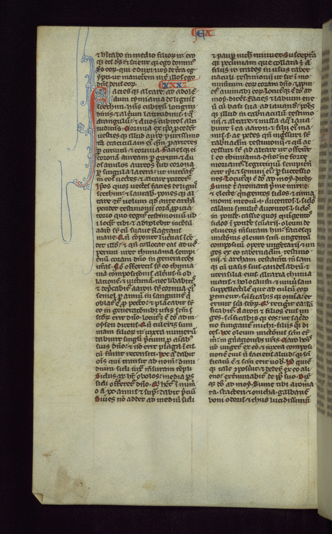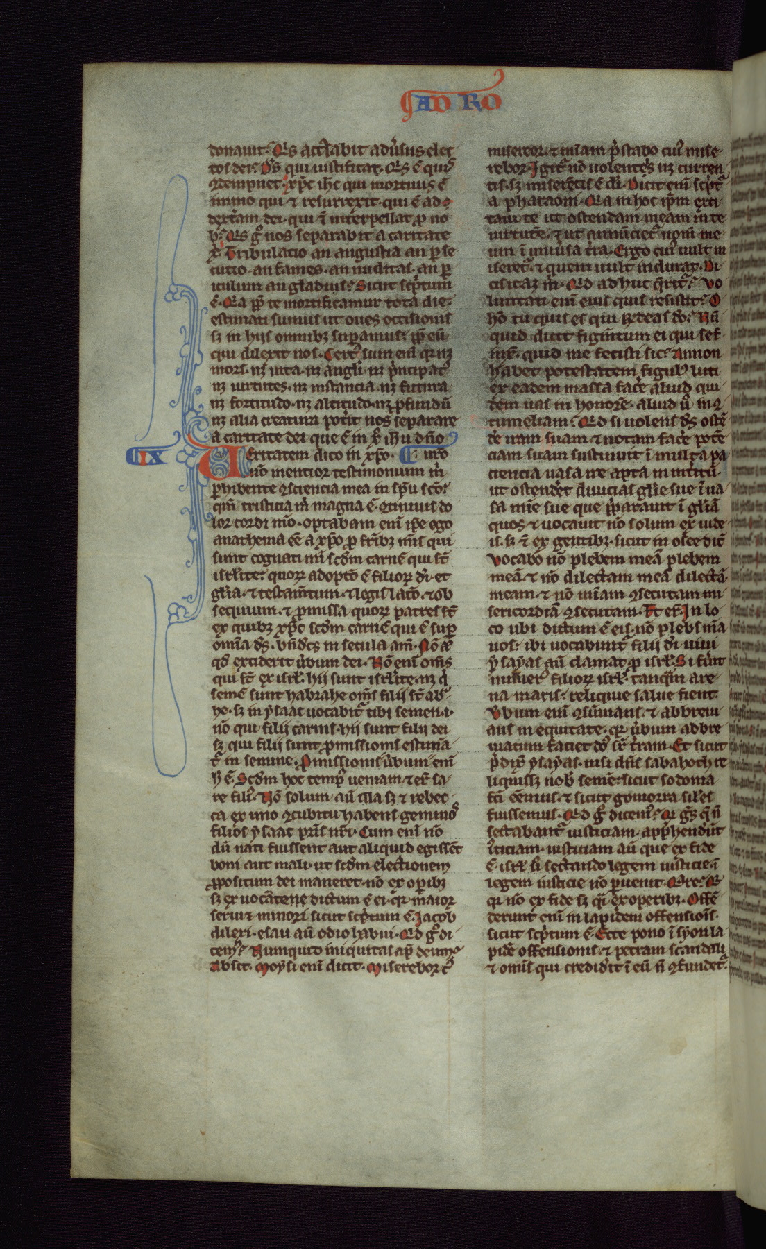 This pocket-size Bible was created around the middle of the thirteenth century in England. It contains the Vulgate text of the Old and New Testaments, arranged in order and divided into chapters. Such Bibles, designed for individual rather than institutional use, began to be created on a large scale during the thirteenth century, especially in Paris. This manuscript is illuminated with a large number of small historiated initials, and also includes a somewhat later image of the Three Living and the Three Dead, a popular scene based on a French poem of the same century.