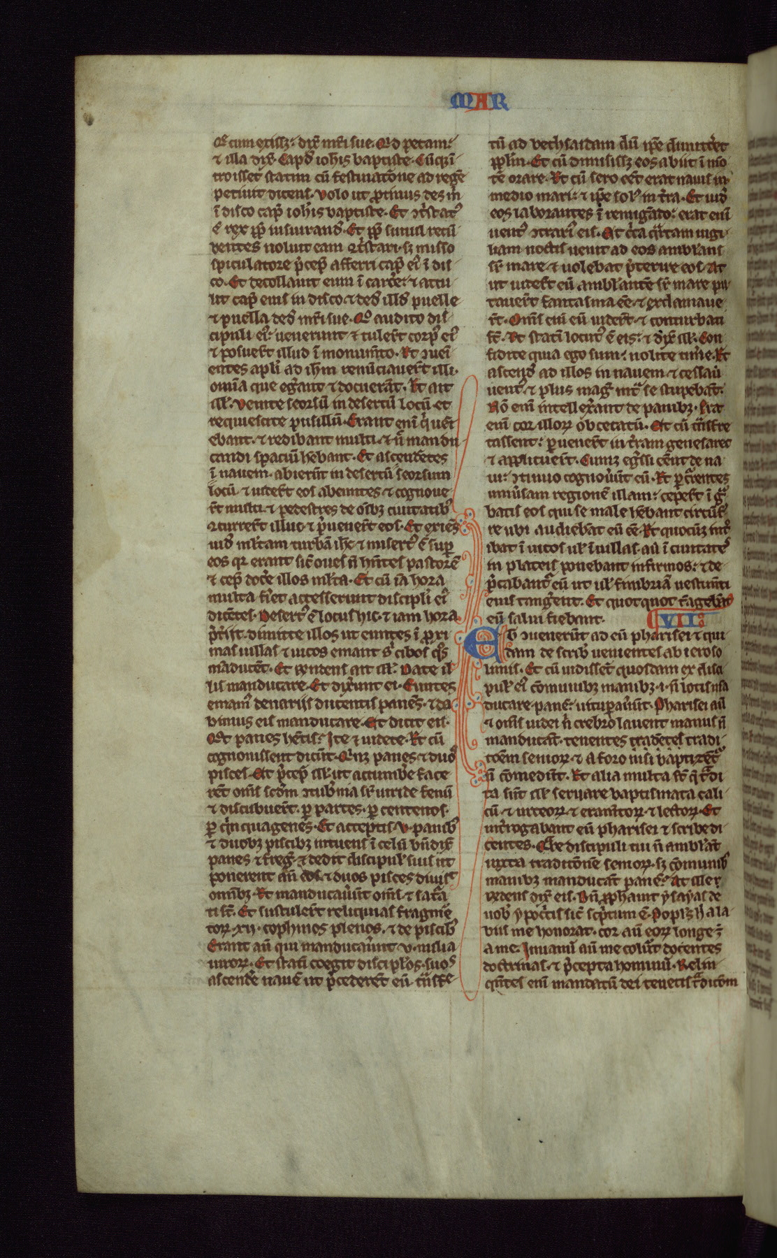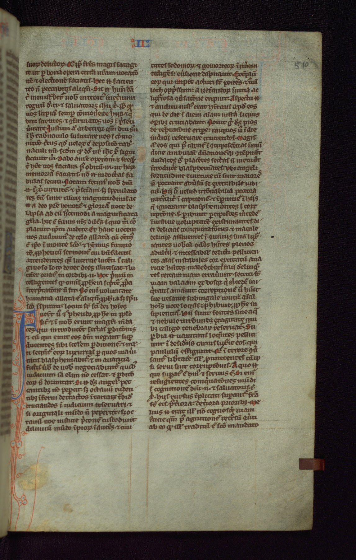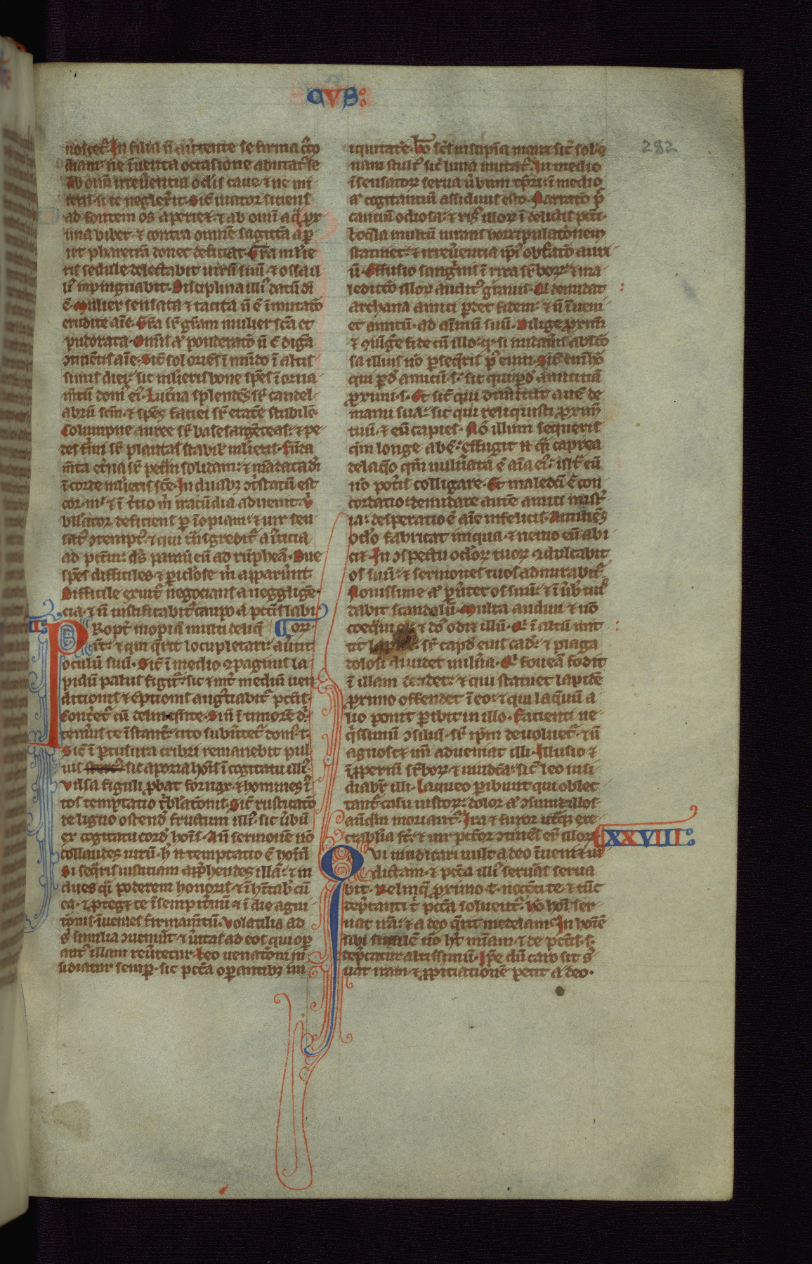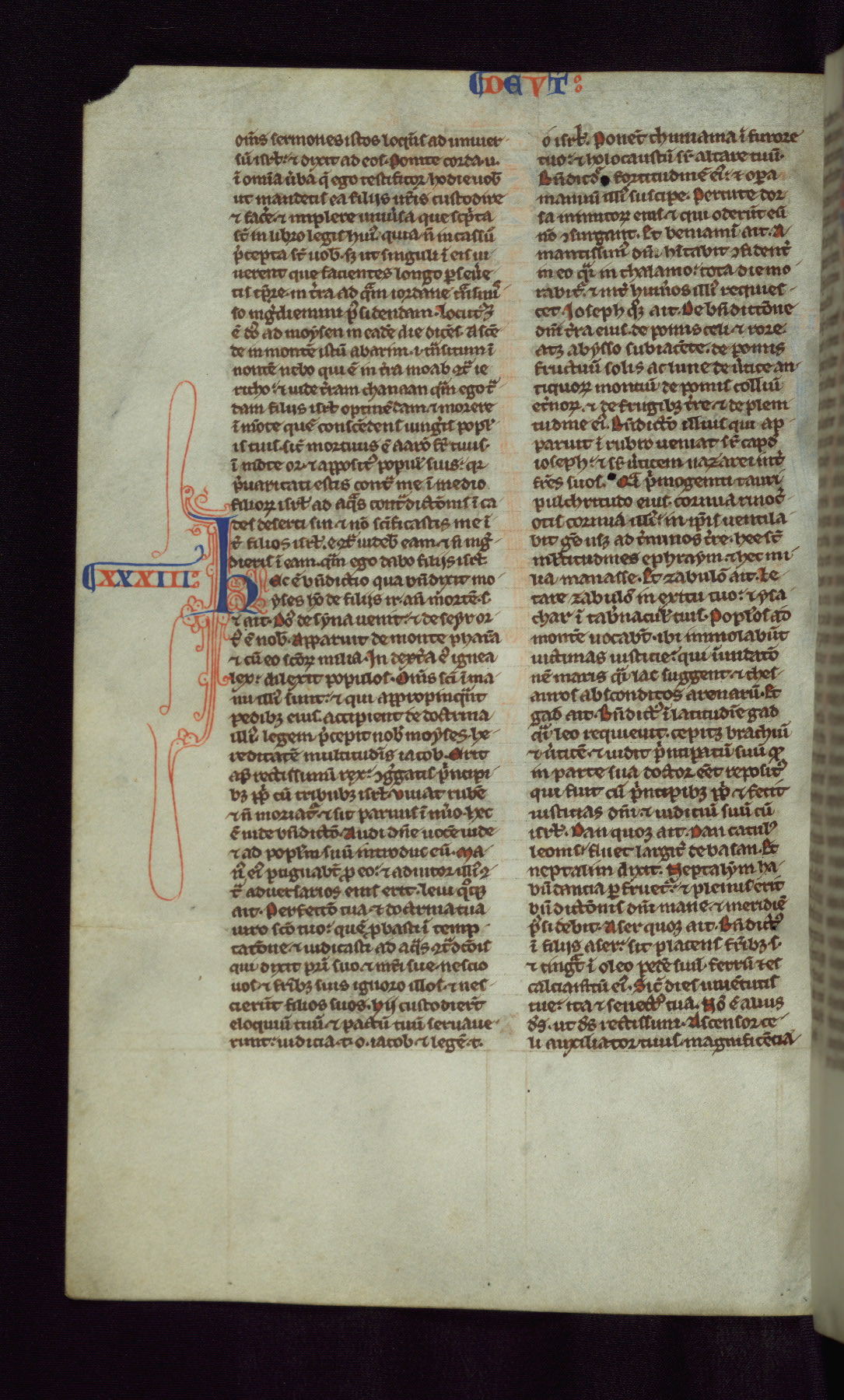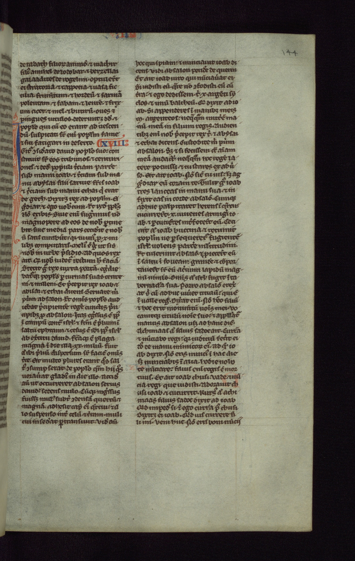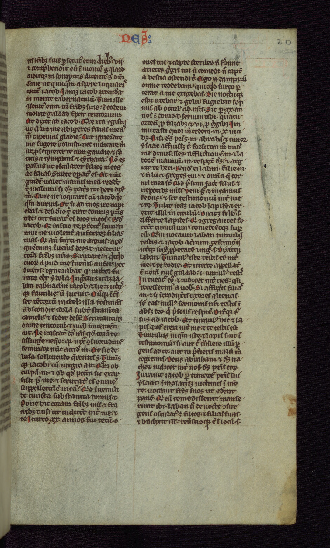 This pocket-size Bible was created around the middle of the thirteenth century in England. It contains the Vulgate text of the Old and New Testaments, arranged in order and divided into chapters. Such Bibles, designed for individual rather than institutional use, began to be created on a large scale during the thirteenth century, especially in Paris. This manuscript is illuminated with a large number of small historiated initials, and also includes a somewhat later image of the Three Living and the Three Dead, a popular scene based on a French poem of the same century.