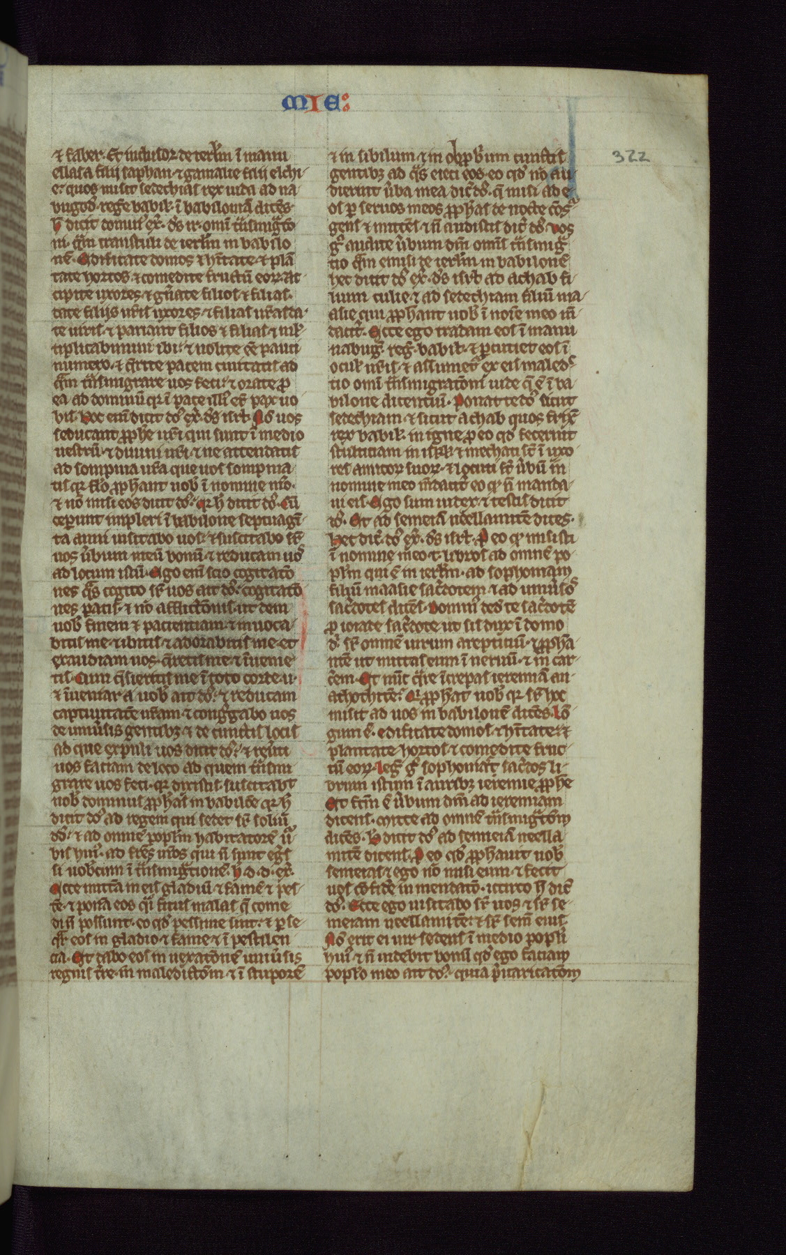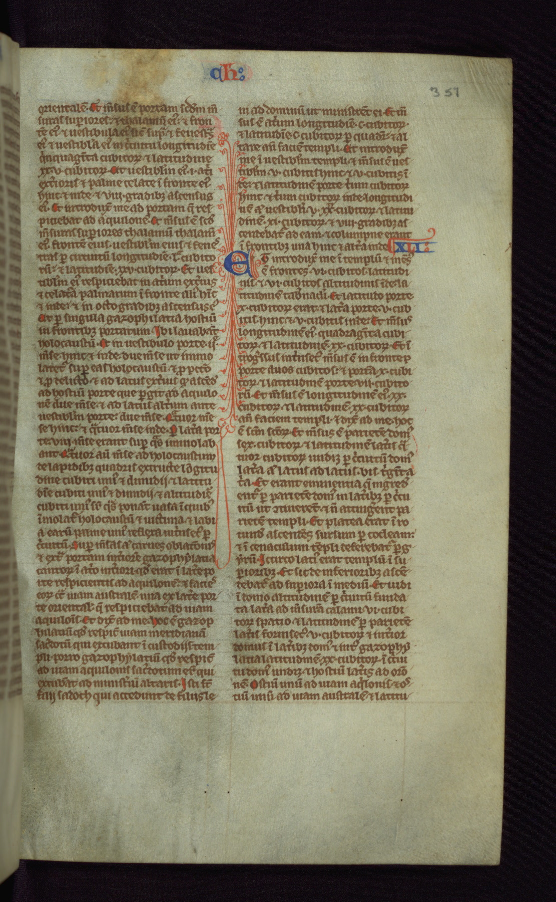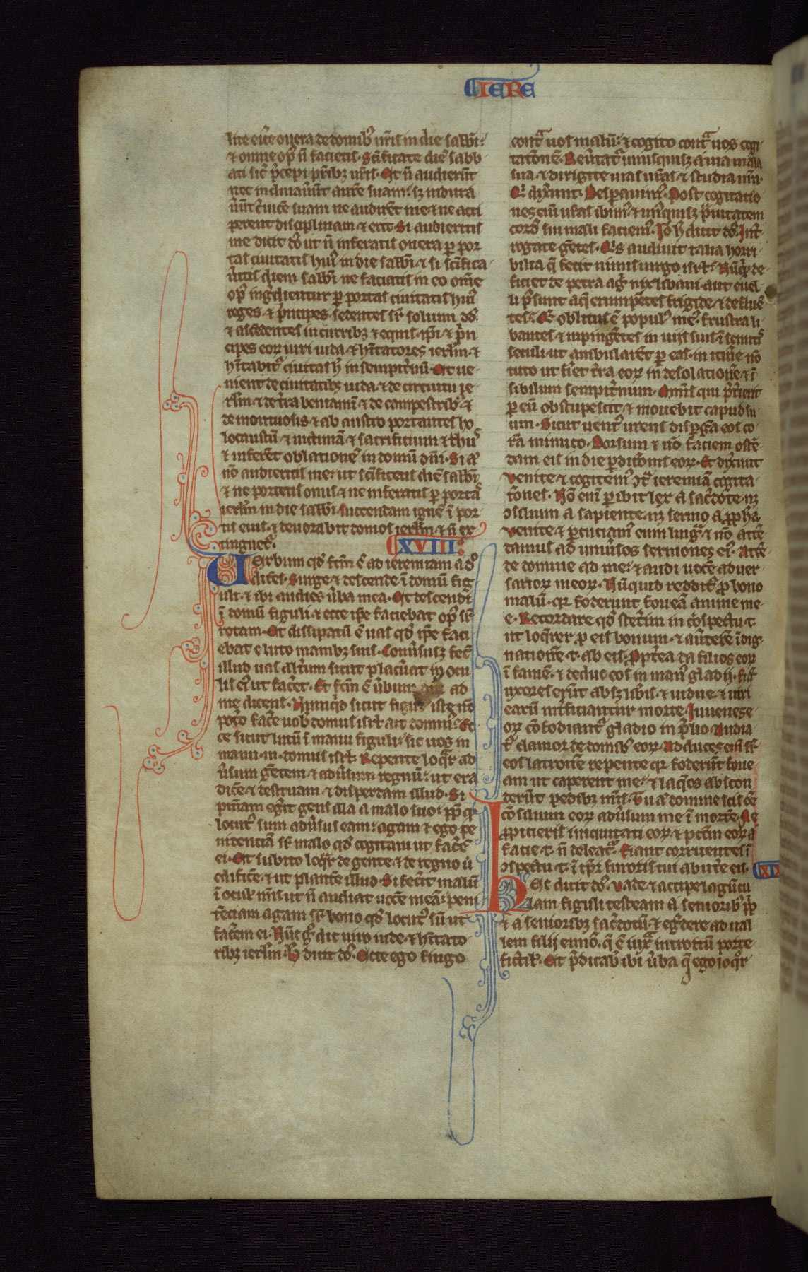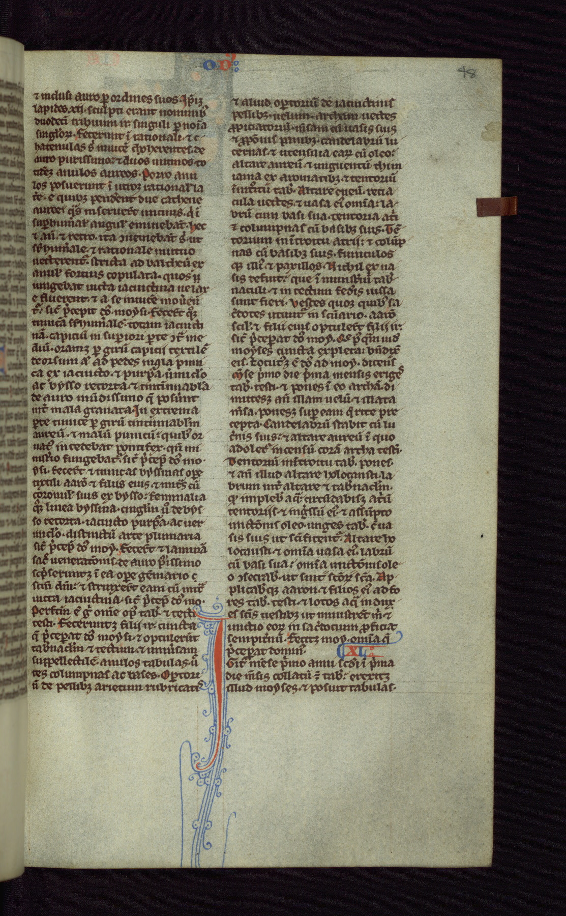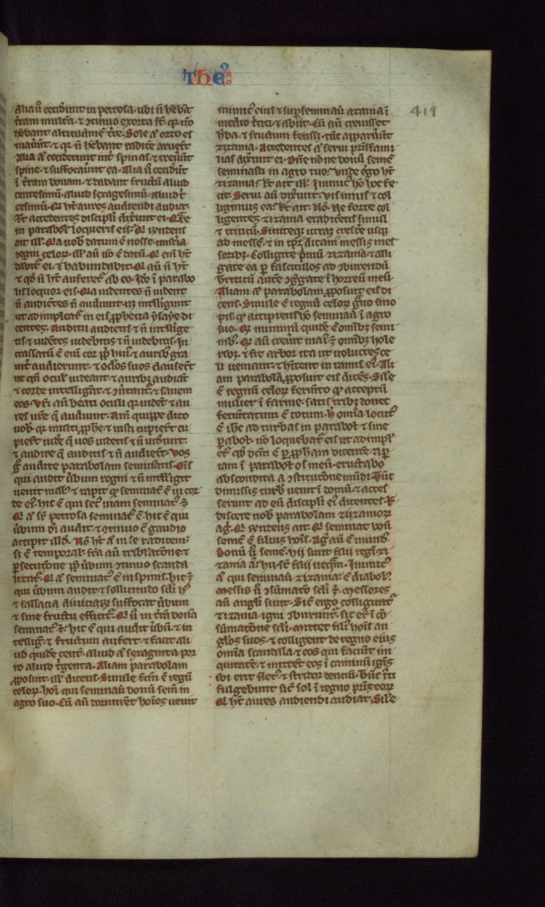 This pocket-size Bible was created around the middle of the thirteenth century in England. It contains the Vulgate text of the Old and New Testaments, arranged in order and divided into chapters. Such Bibles, designed for individual rather than institutional use, began to be created on a large scale during the thirteenth century, especially in Paris. This manuscript is illuminated with a large number of small historiated initials, and also includes a somewhat later image of the Three Living and the Three Dead, a popular scene based on a French poem of the same century.