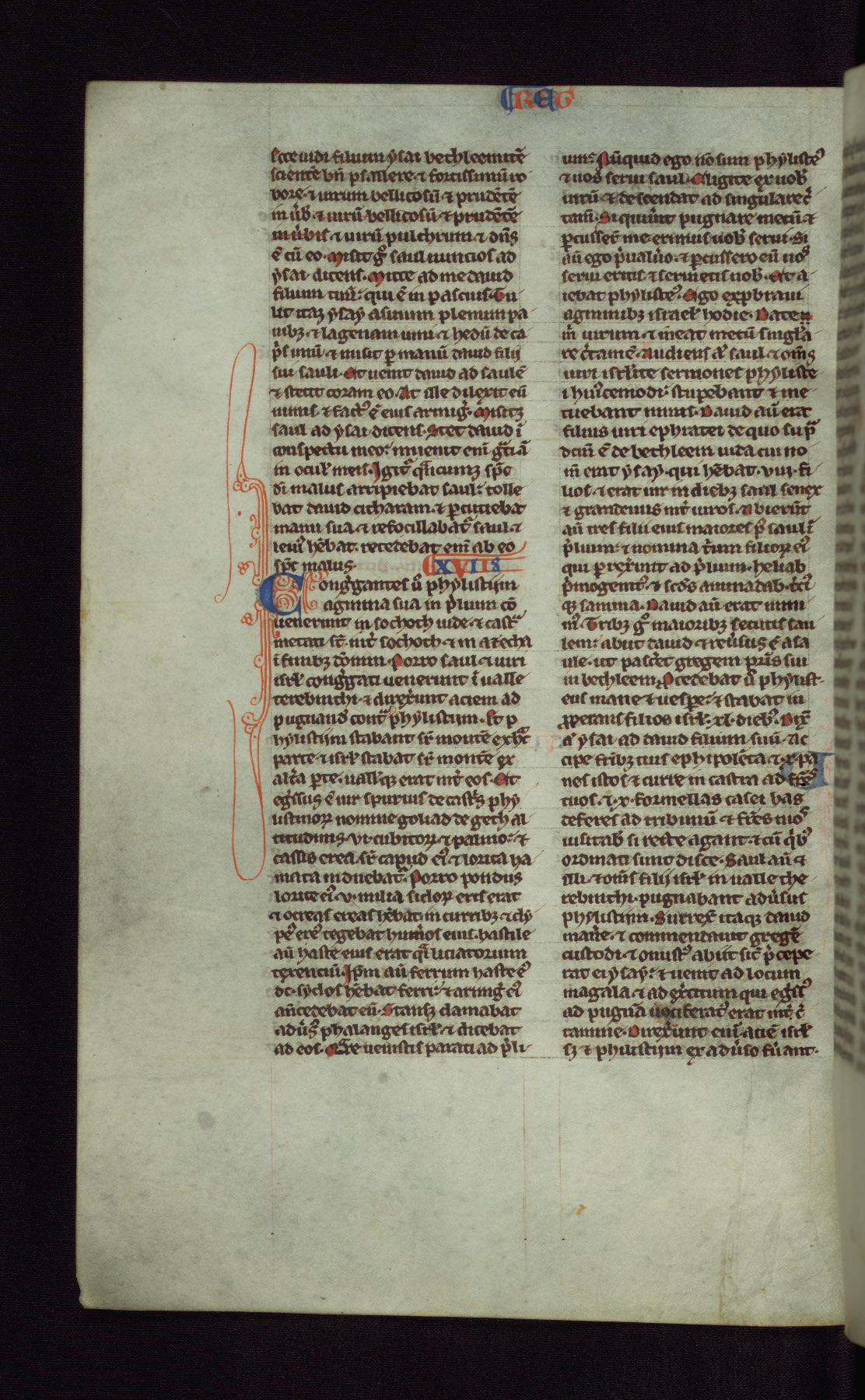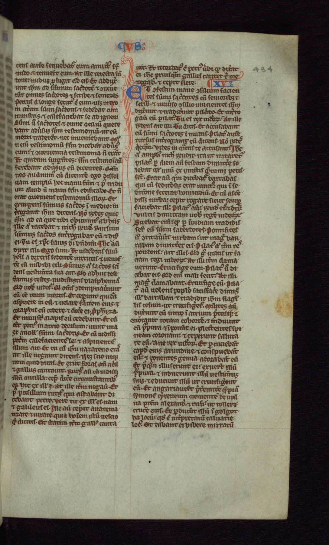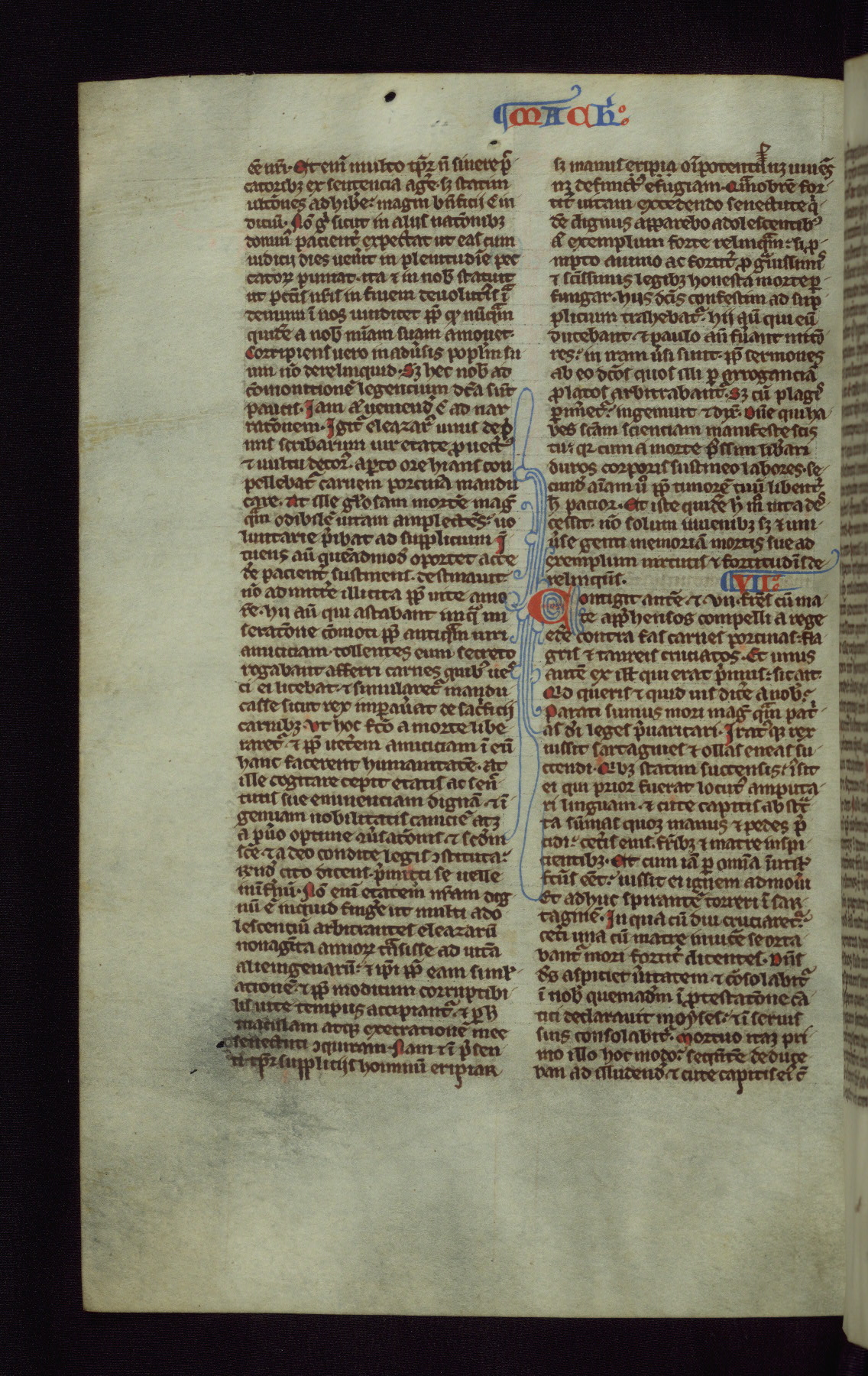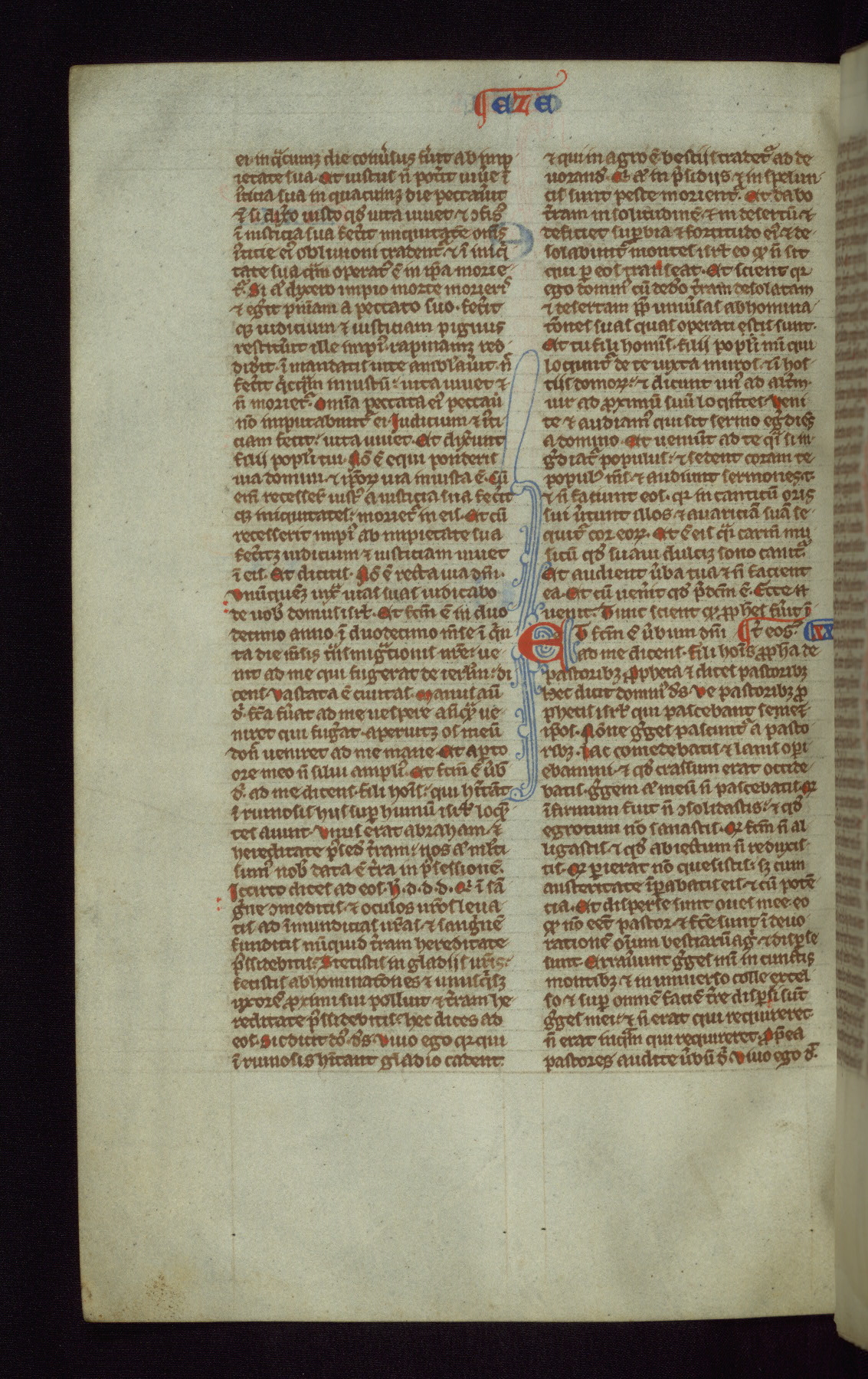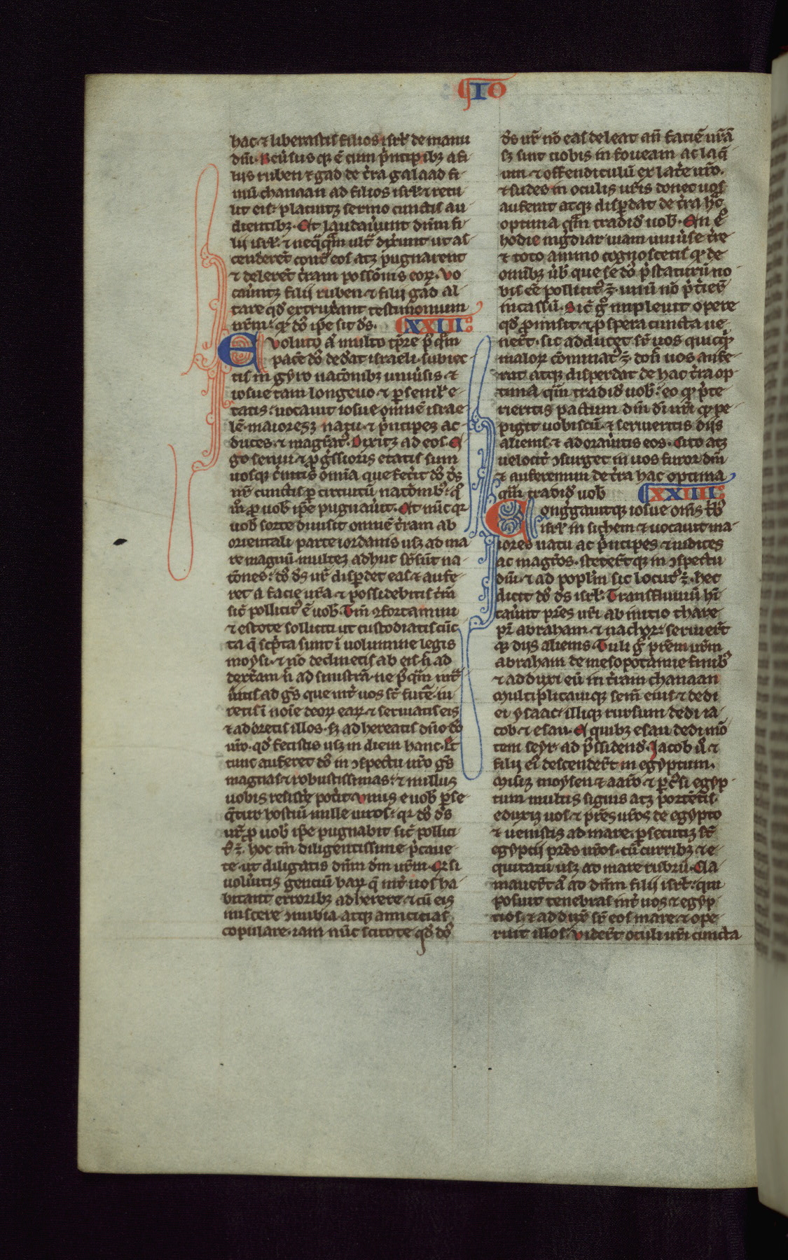This pocket-size Bible was created around the middle of the thirteenth century in England. It contains the Vulgate text of the Old and New Testaments, arranged in order and divided into chapters. Such Bibles, designed for individual rather than institutional use, began to be created on a large scale during the thirteenth century, especially in Paris. This manuscript is illuminated with a large number of small historiated initials, and also includes a somewhat later image of the Three Living and the Three Dead, a popular scene based on a French poem of the same century.