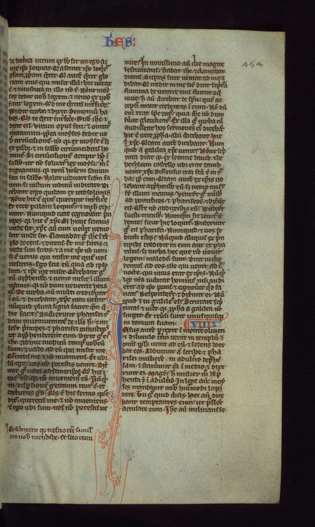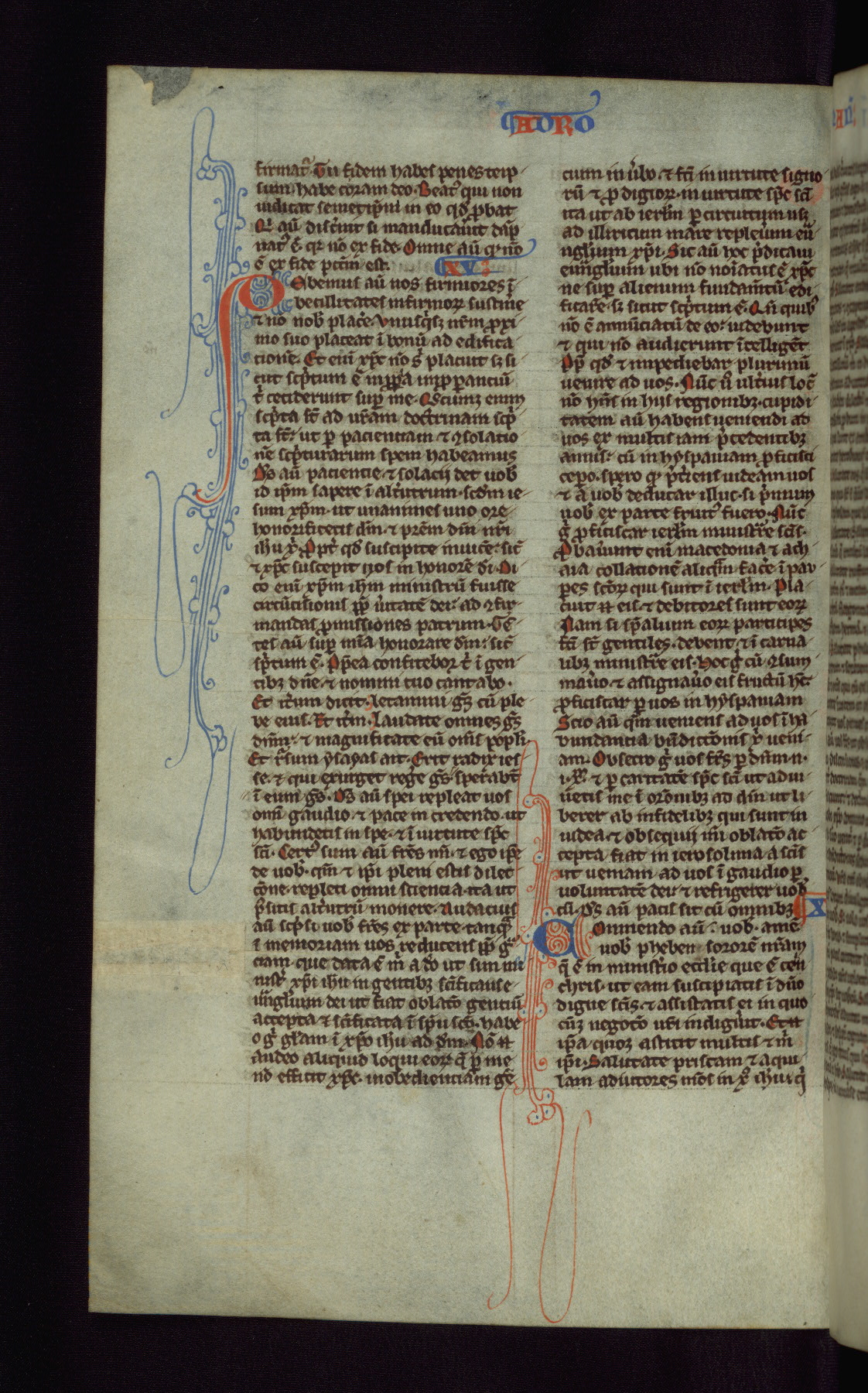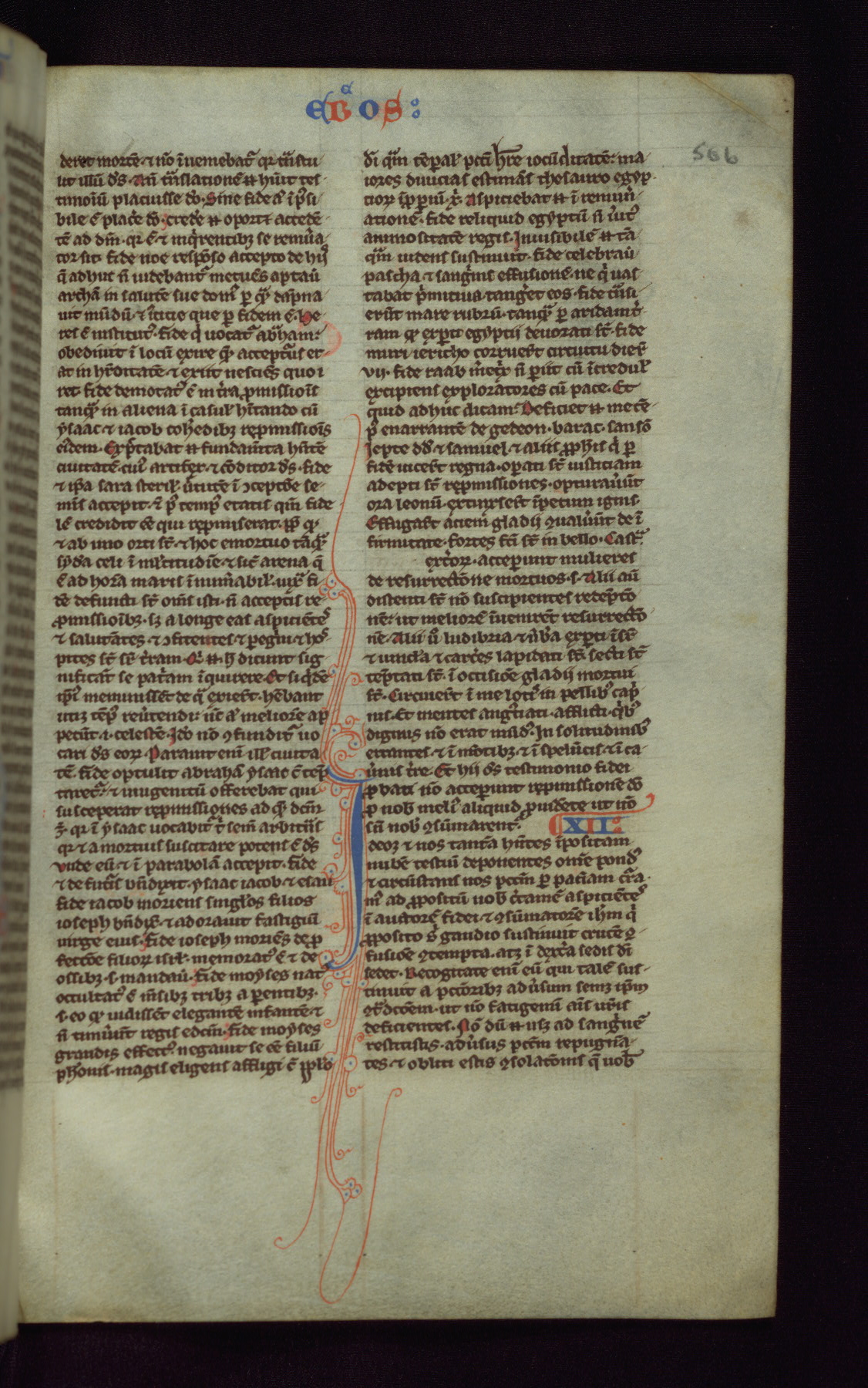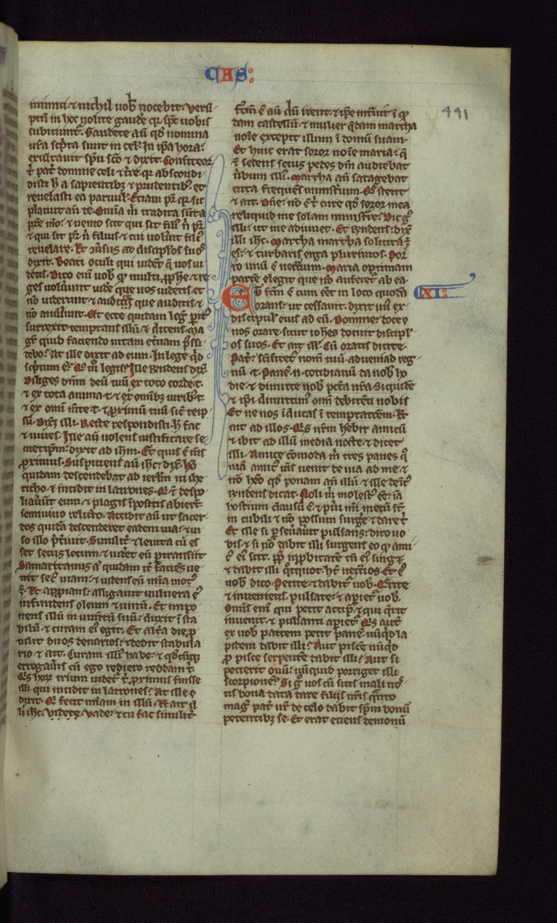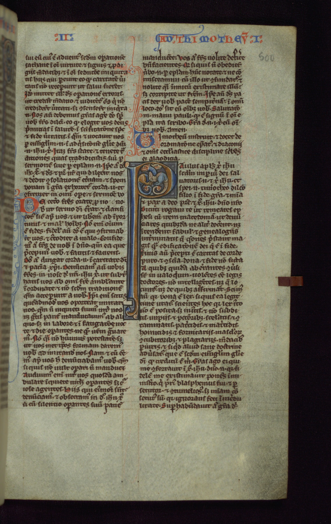 This pocket-size Bible was created around the middle of the thirteenth century in England. It contains the Vulgate text of the Old and New Testaments, arranged in order and divided into chapters. Such Bibles, designed for individual rather than institutional use, began to be created on a large scale during the thirteenth century, especially in Paris. This manuscript is illuminated with a large number of small historiated initials, and also includes a somewhat later image of the Three Living and the Three Dead, a popular scene based on a French poem of the same century.