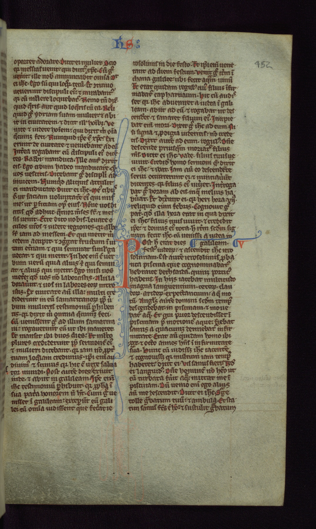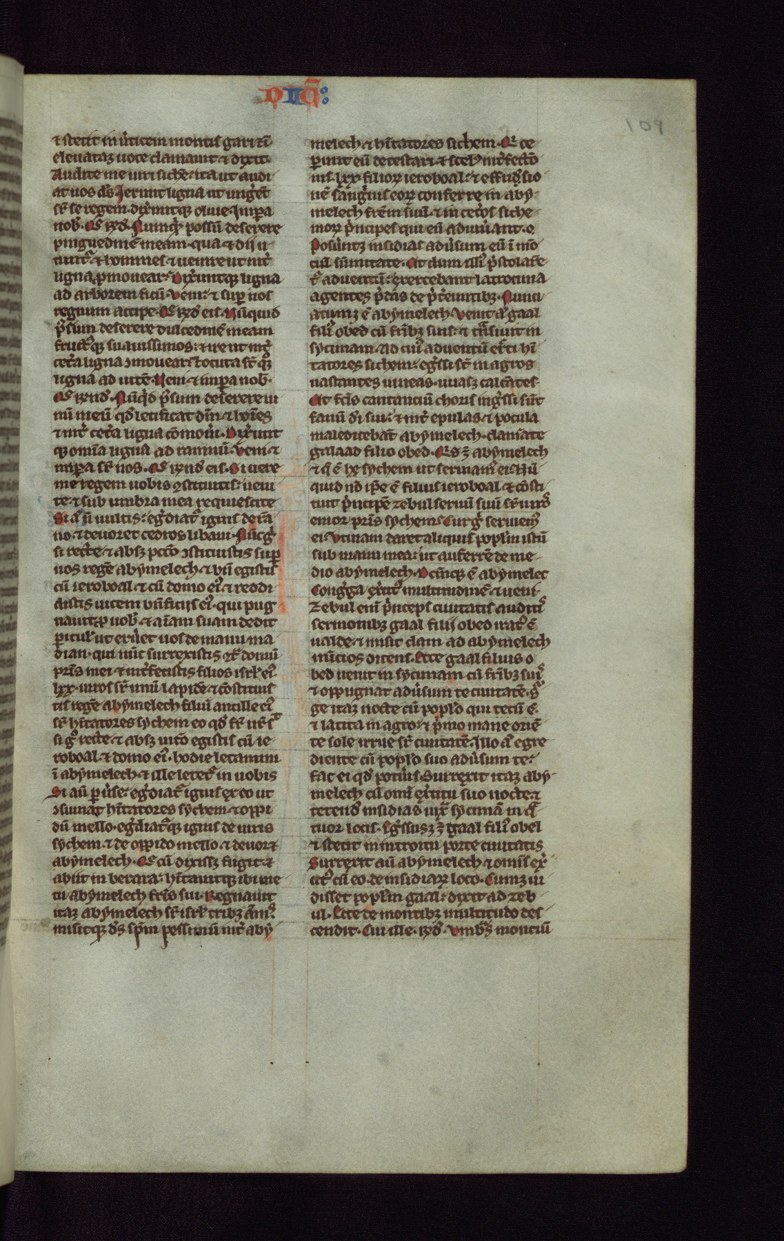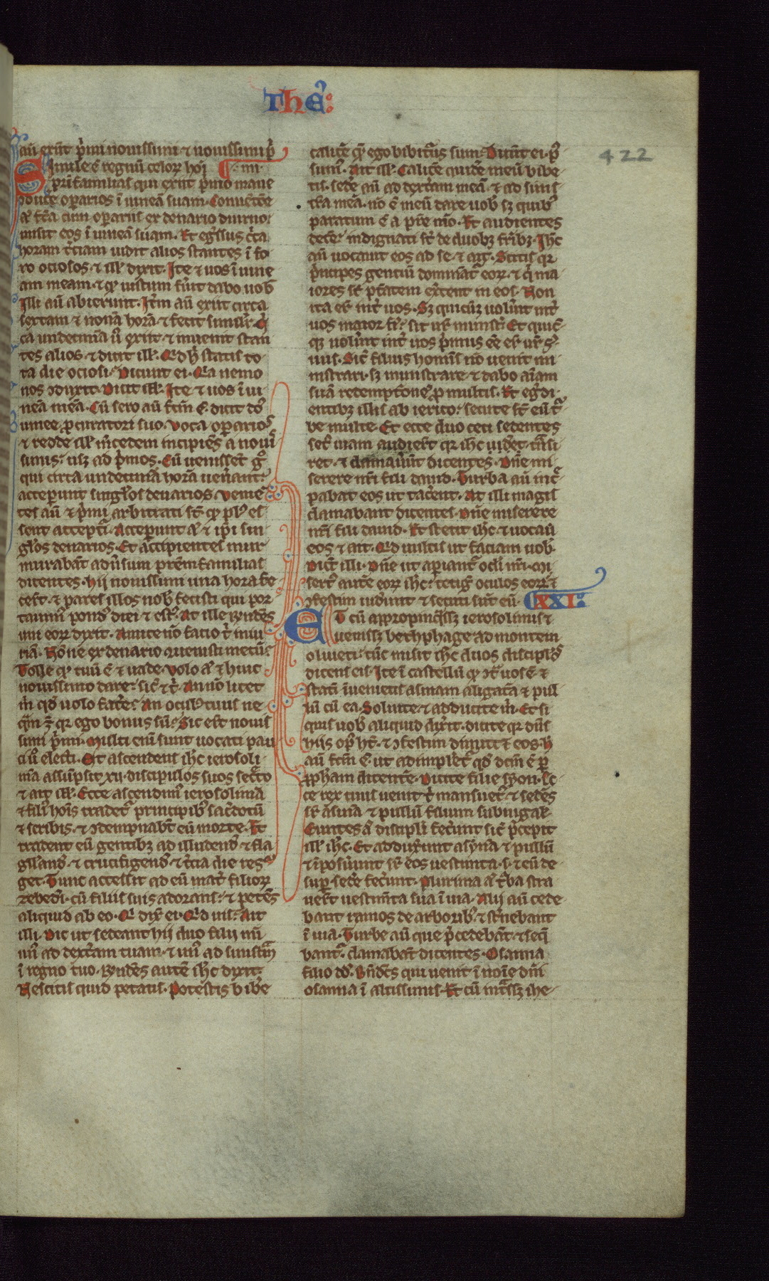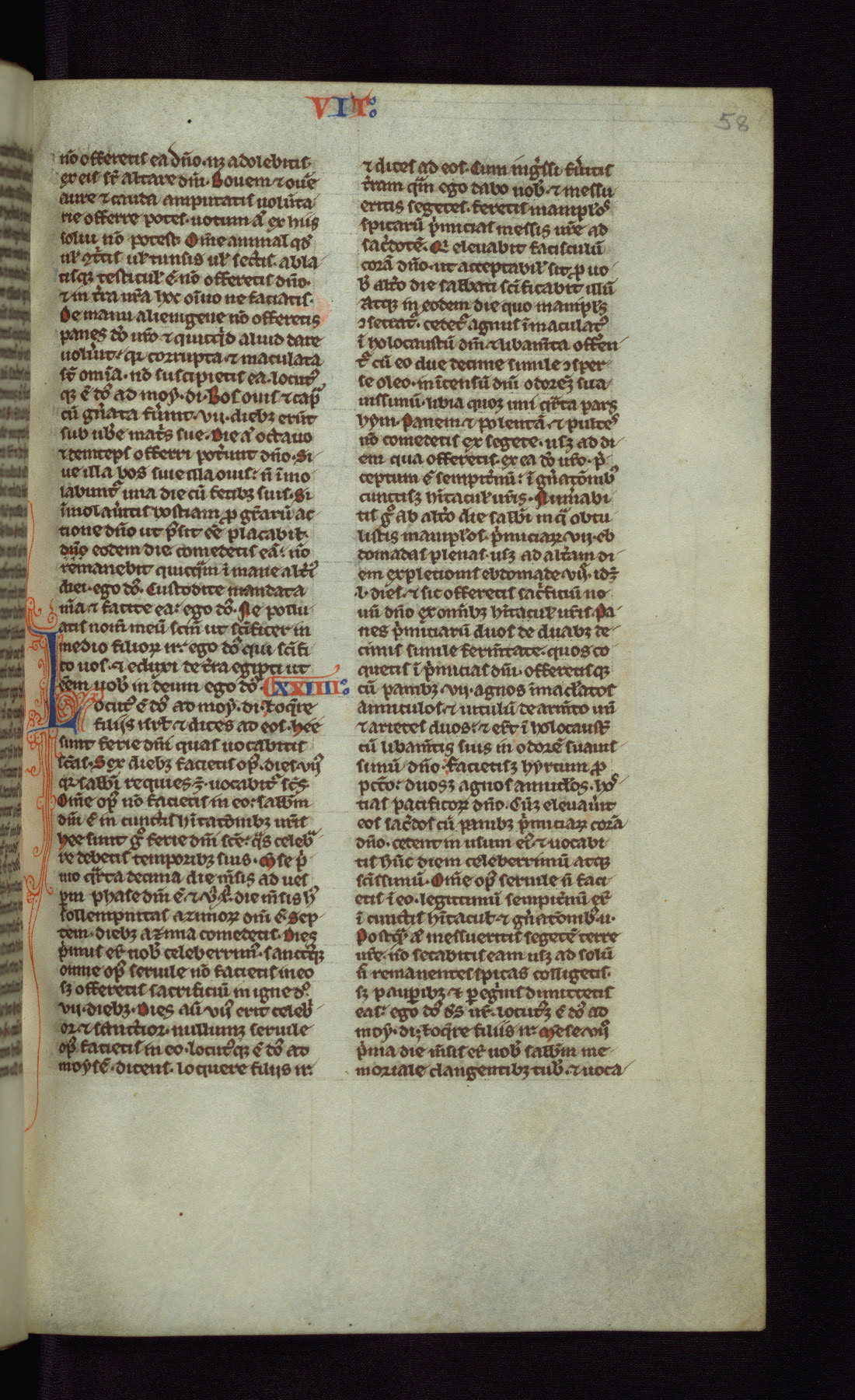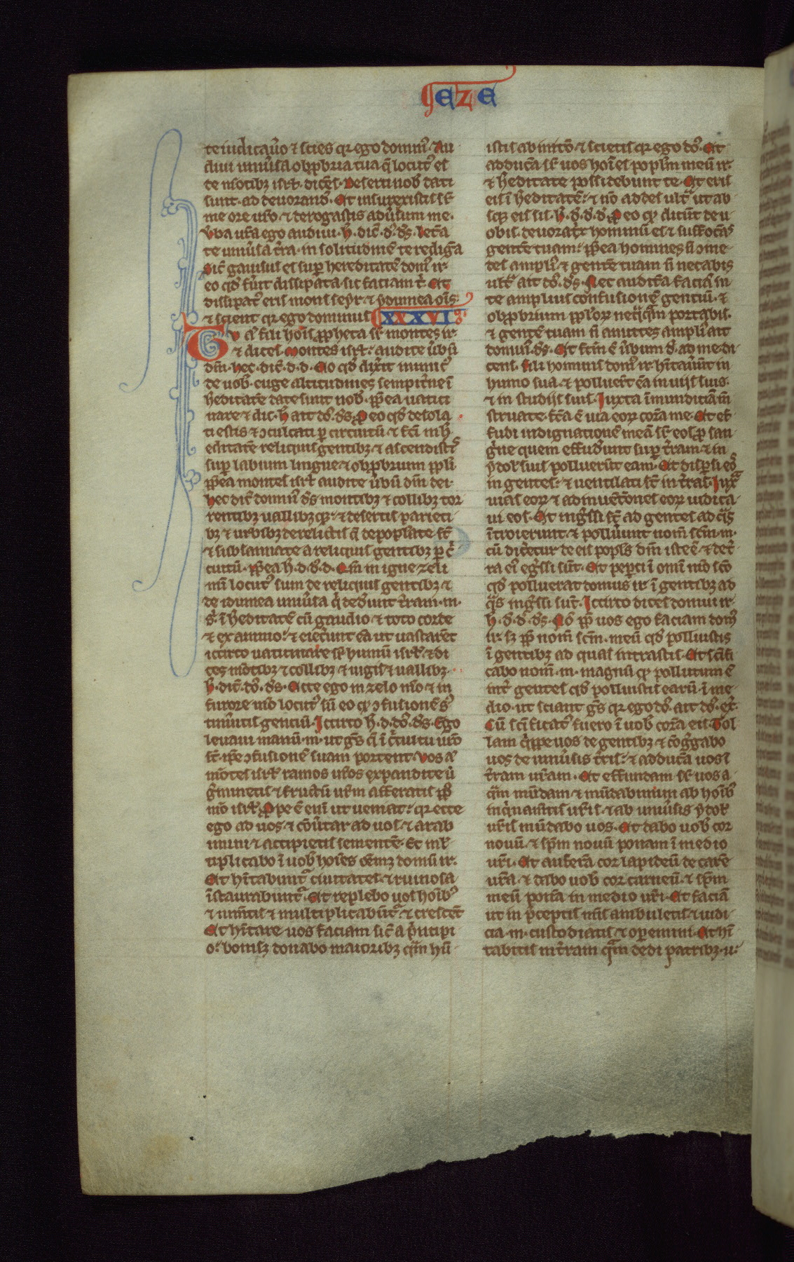 This pocket-size Bible was created around the middle of the thirteenth century in England. It contains the Vulgate text of the Old and New Testaments, arranged in order and divided into chapters. Such Bibles, designed for individual rather than institutional use, began to be created on a large scale during the thirteenth century, especially in Paris. This manuscript is illuminated with a large number of small historiated initials, and also includes a somewhat later image of the Three Living and the Three Dead, a popular scene based on a French poem of the same century.