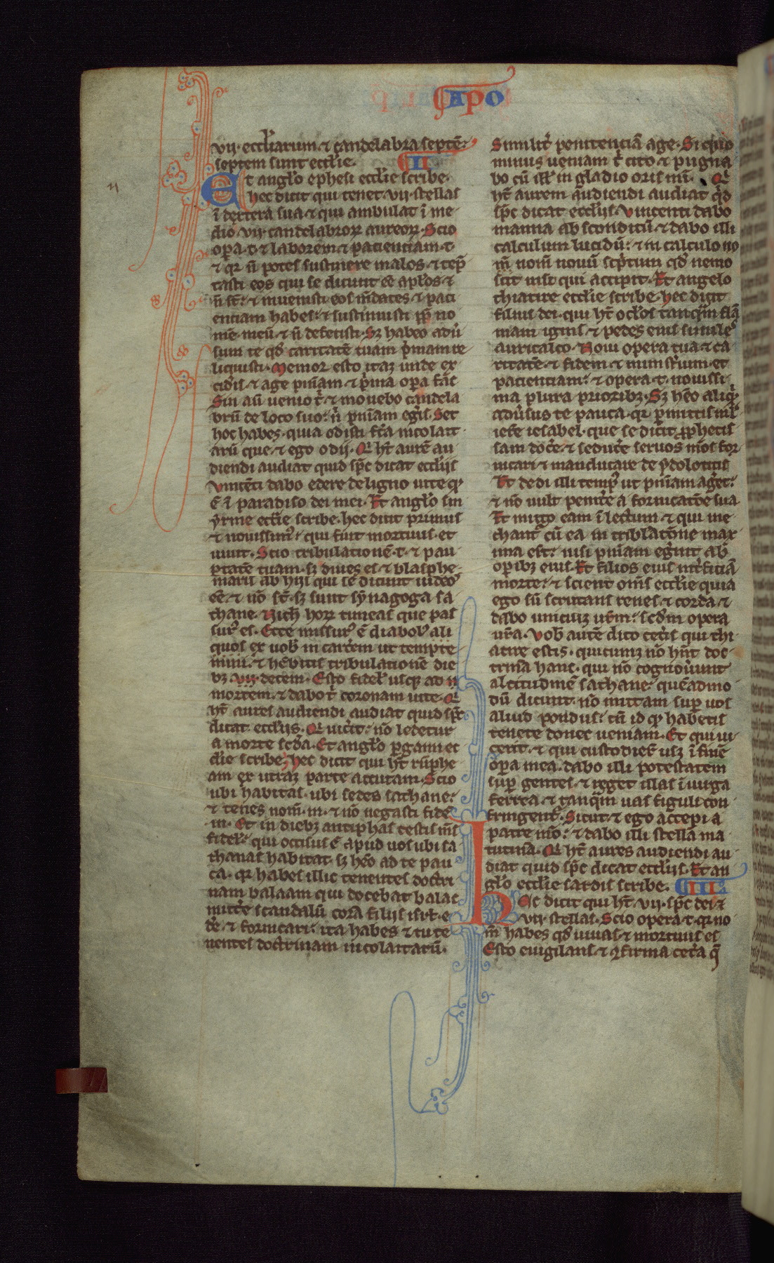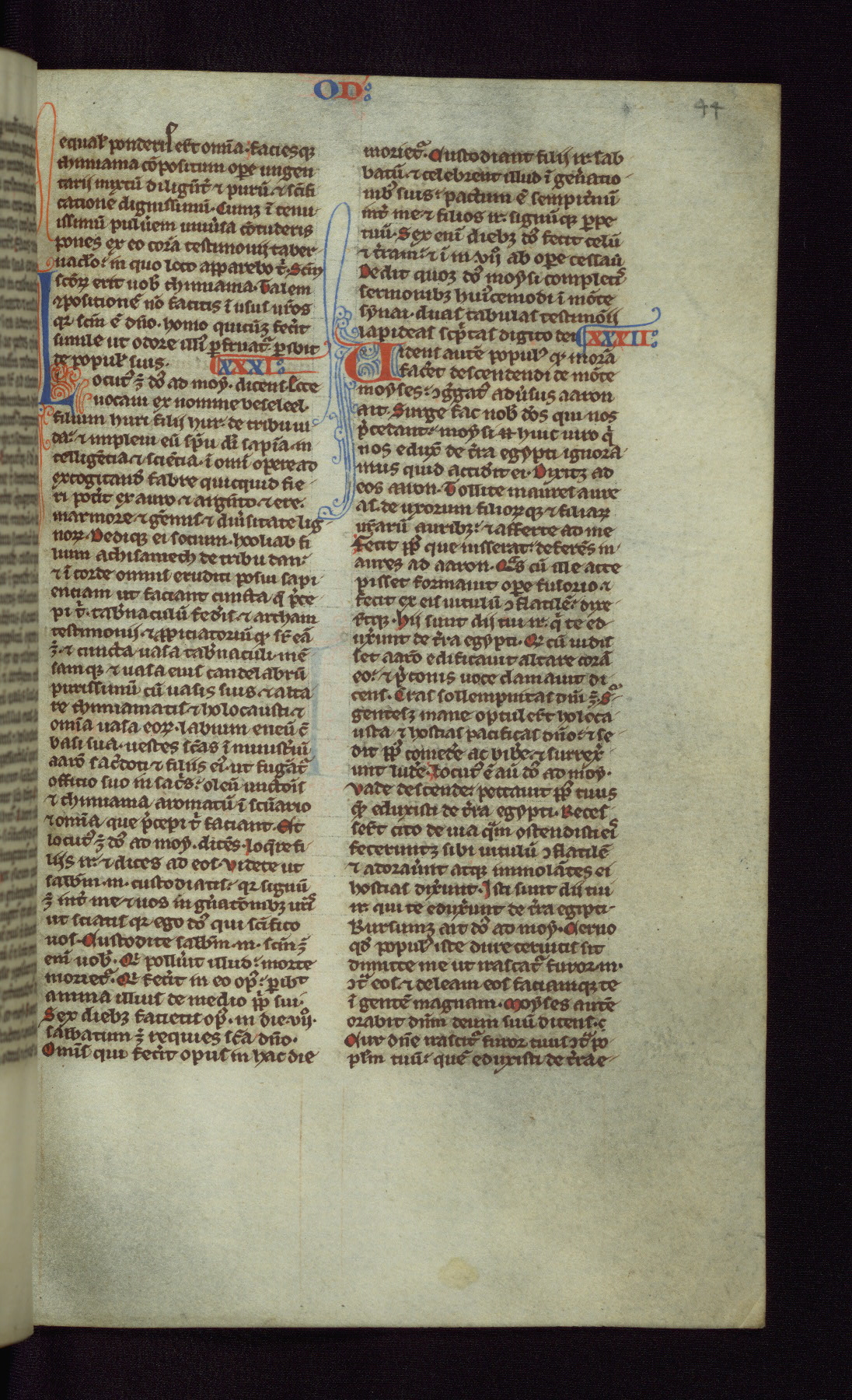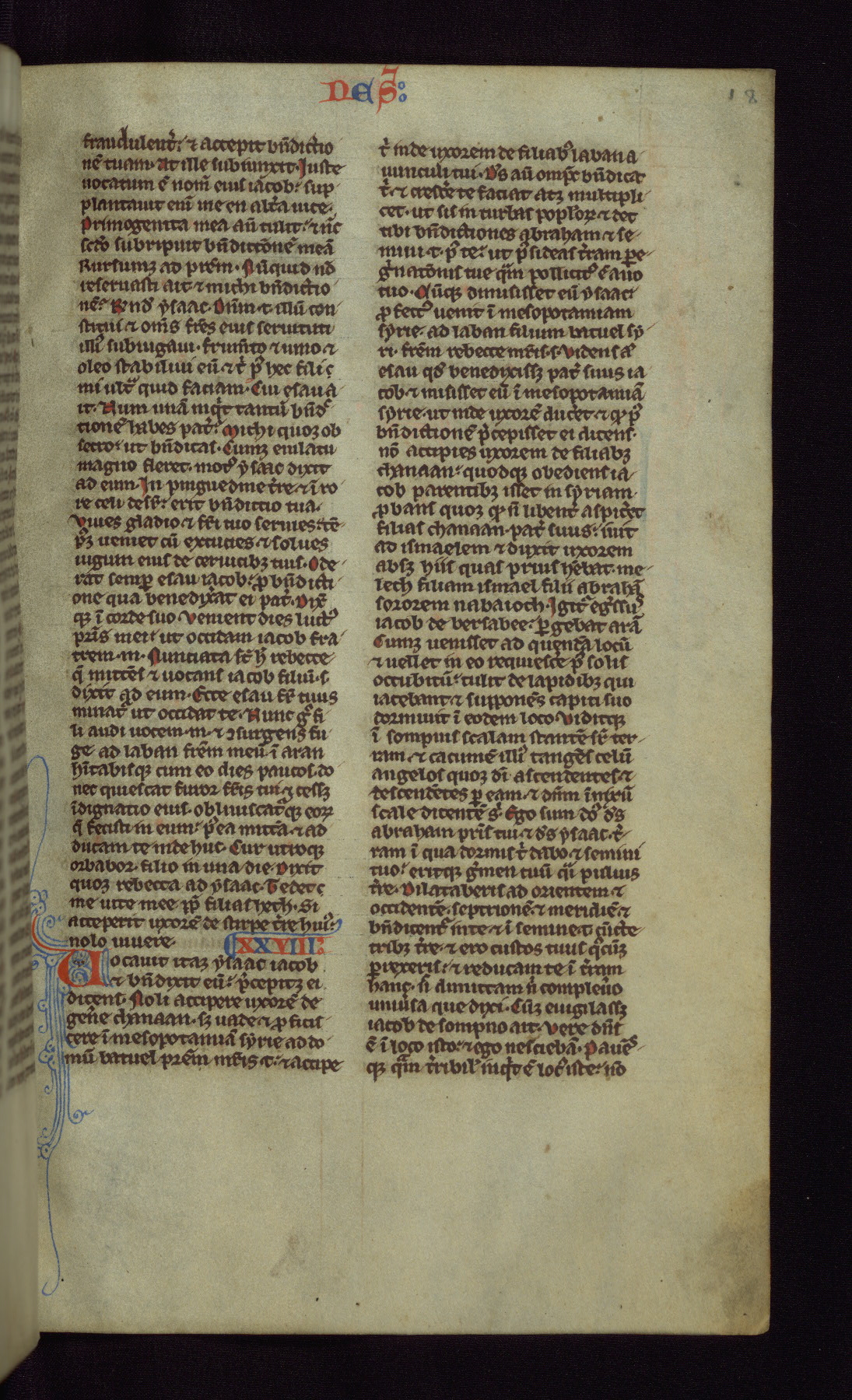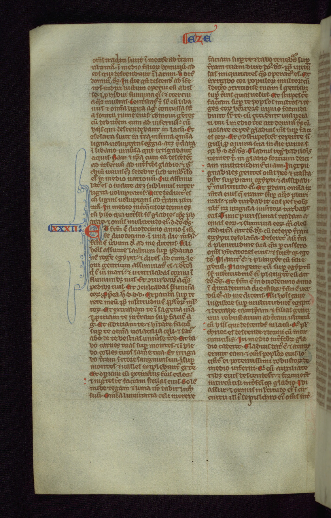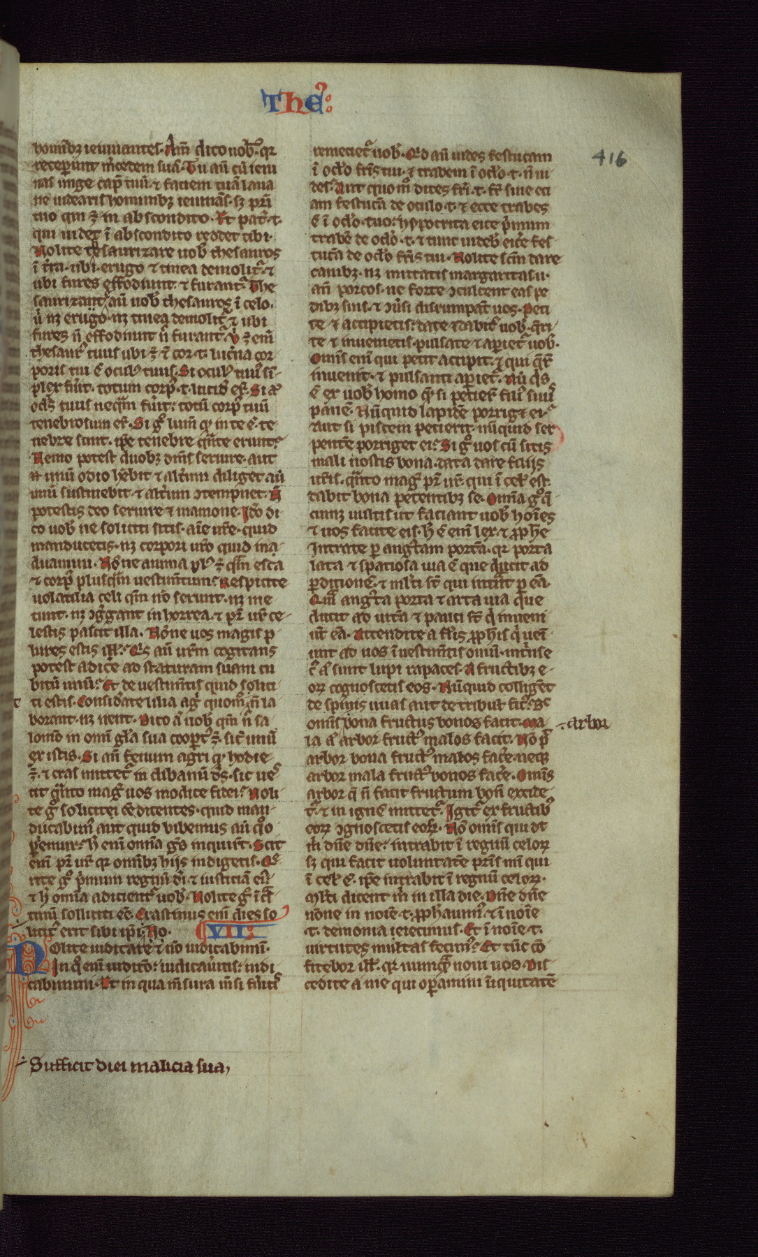 This pocket-size Bible was created around the middle of the thirteenth century in England. It contains the Vulgate text of the Old and New Testaments, arranged in order and divided into chapters. Such Bibles, designed for individual rather than institutional use, began to be created on a large scale during the thirteenth century, especially in Paris. This manuscript is illuminated with a large number of small historiated initials, and also includes a somewhat later image of the Three Living and the Three Dead, a popular scene based on a French poem of the same century.