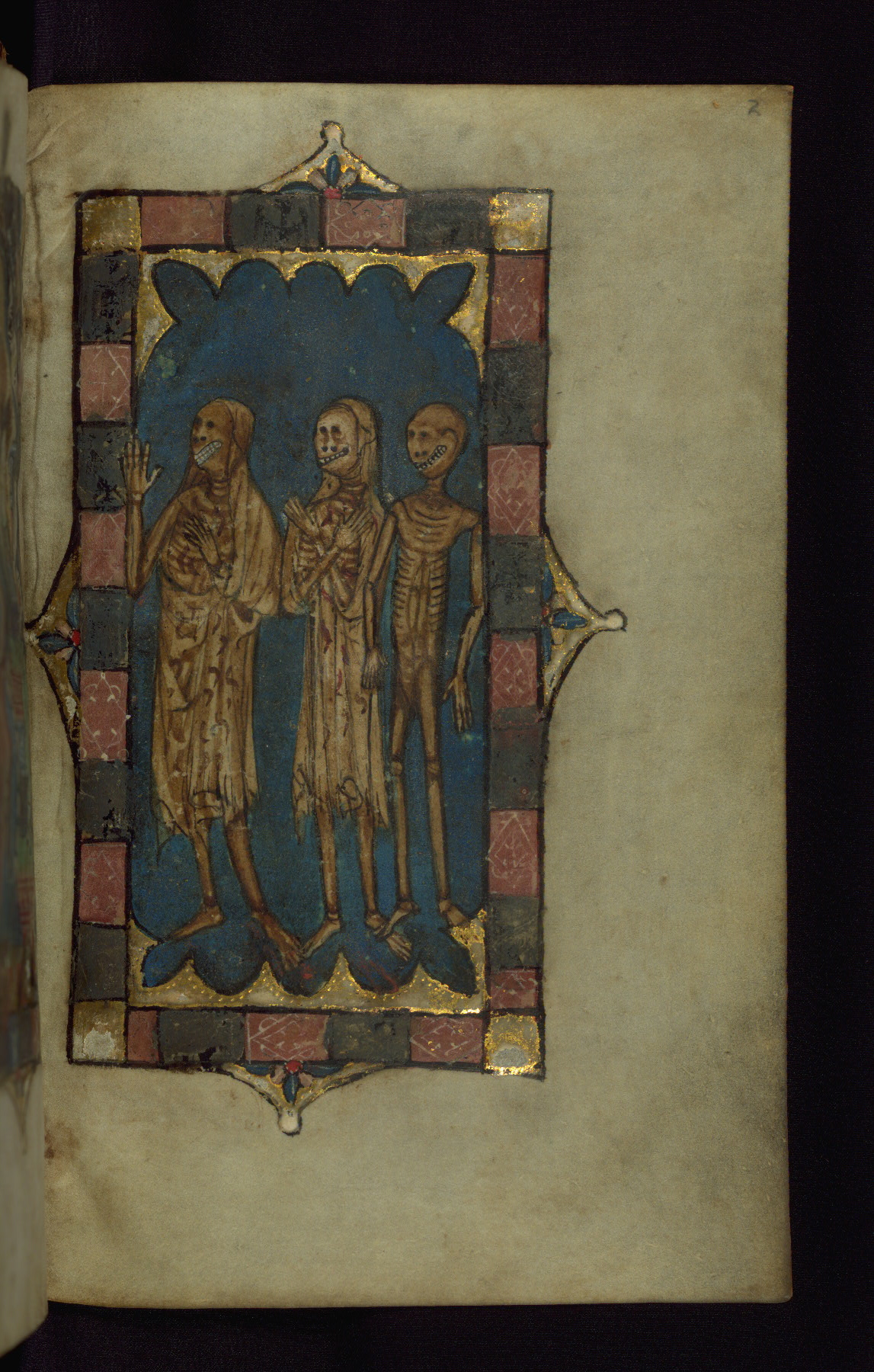 Corresponds with the Three Dead on fol. 2r; both miniatures added after the book was composed, ca. 1290-1300