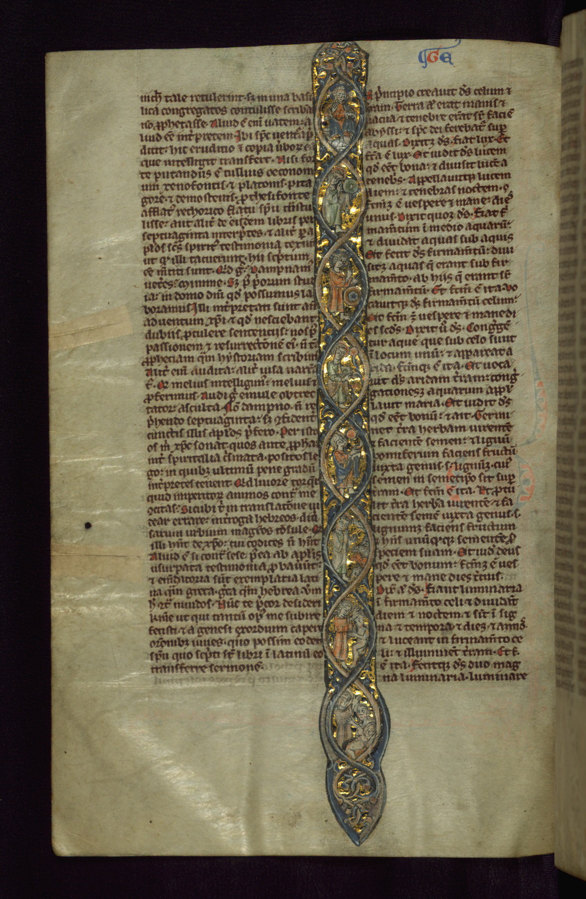 Eight scenes: God enthroned, day and night, earth and sea, plants, sun and moon, animals, Adam, Eve