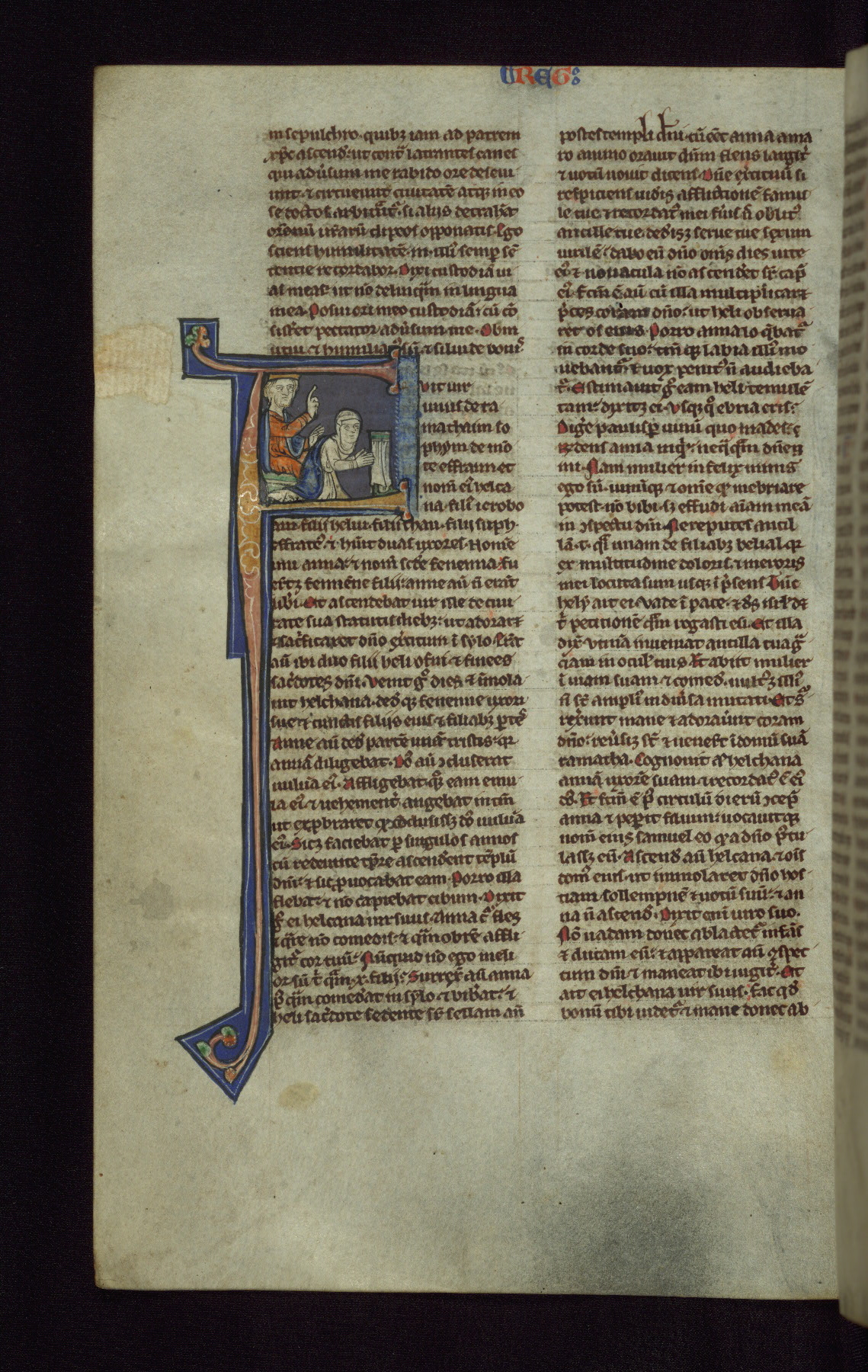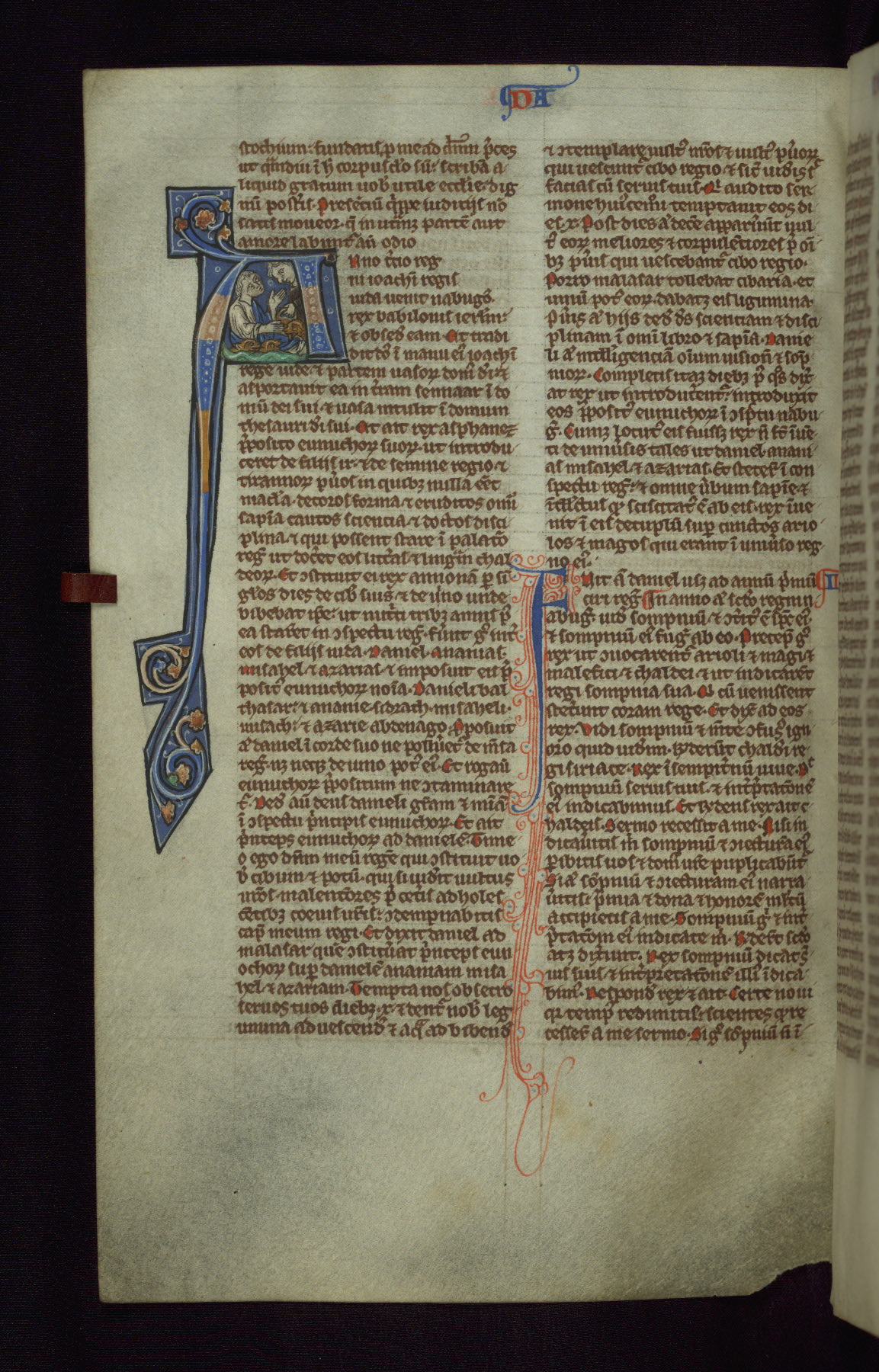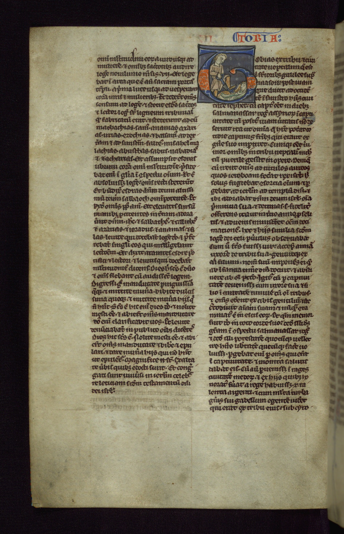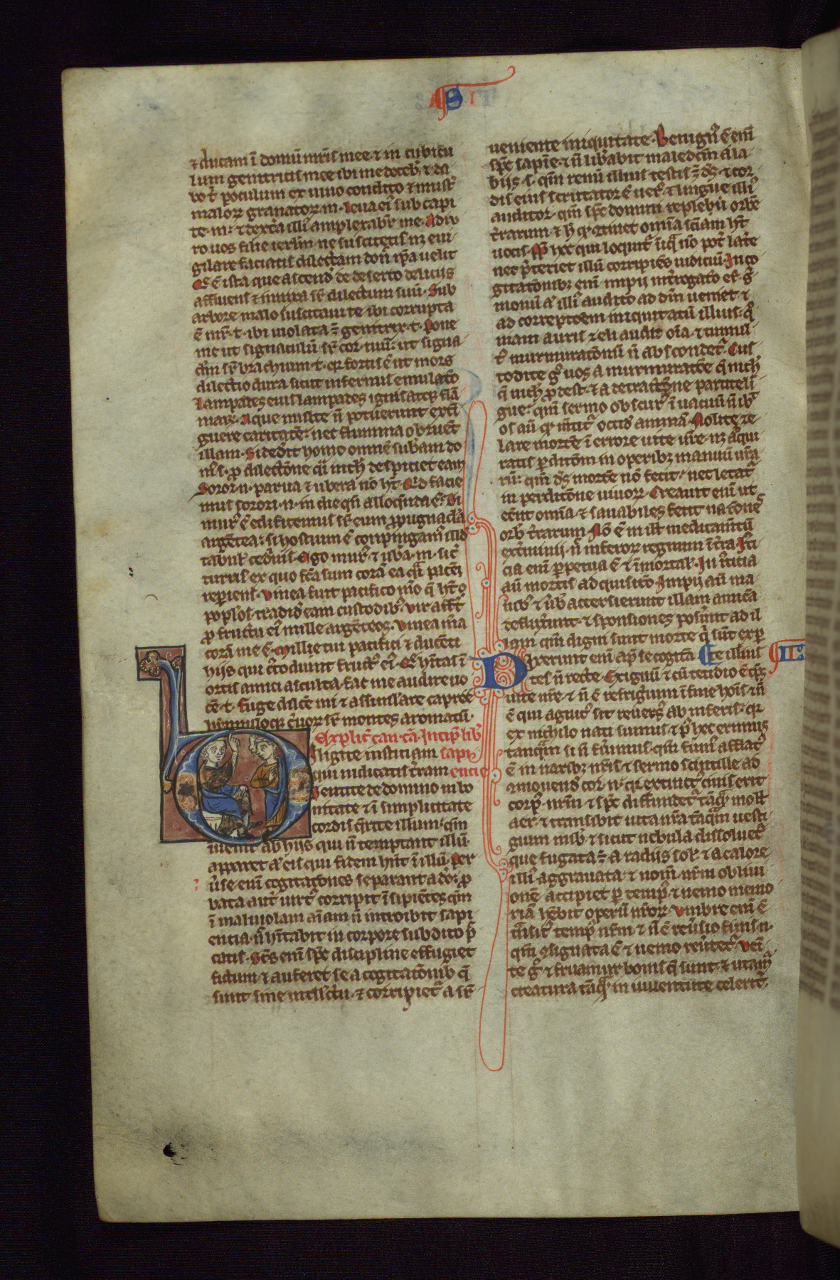 This pocket-size Bible was created around the middle of the thirteenth century in England. It contains the Vulgate text of the Old and New Testaments, arranged in order and divided into chapters. Such Bibles, designed for individual rather than institutional use, began to be created on a large scale during the thirteenth century, especially in Paris. This manuscript is illuminated with a large number of small historiated initials, and also includes a somewhat later image of the Three Living and the Three Dead, a popular scene based on a French poem of the same century.