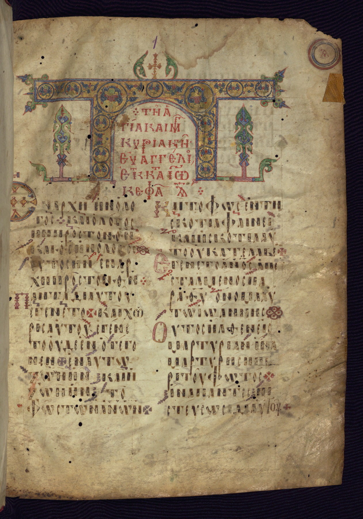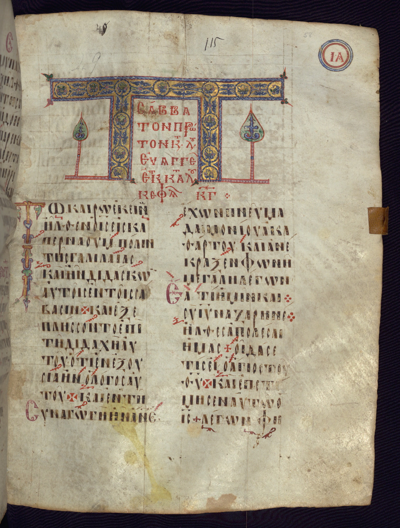 - Contents: Fols. 1r-49v: readings for the weeks of John; fols. 50r-57v: readings for the weekends of Matthew; fols. 58r-81v: readings for the weekends of Luke; fols. 82r-129v: readings for Paschal Week; fols. 121v-128r: readings for the Hours of Good Friday; fols. 130r-173r: readings for the feast days from September 1 to August 31; fols. 178v-179v: list of readings for various occasions