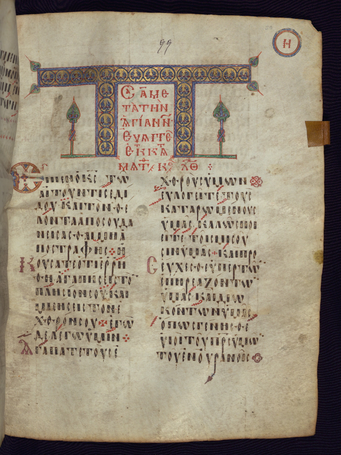 This is an example of a Gospel Lectionary written in the archaic, majuscule form of Greek letters. Liturgical books were inherently conservative and therefore commonly retained such antiquated writing. The scribe, a certain monk Theodore, has recorded his name in a verse at the end of the volume (fol. 179v). A leaf removed from this manuscript ca. 1900 is now in Sofia, National Library of Republic of Bulgaria NBKM Gr. 2.