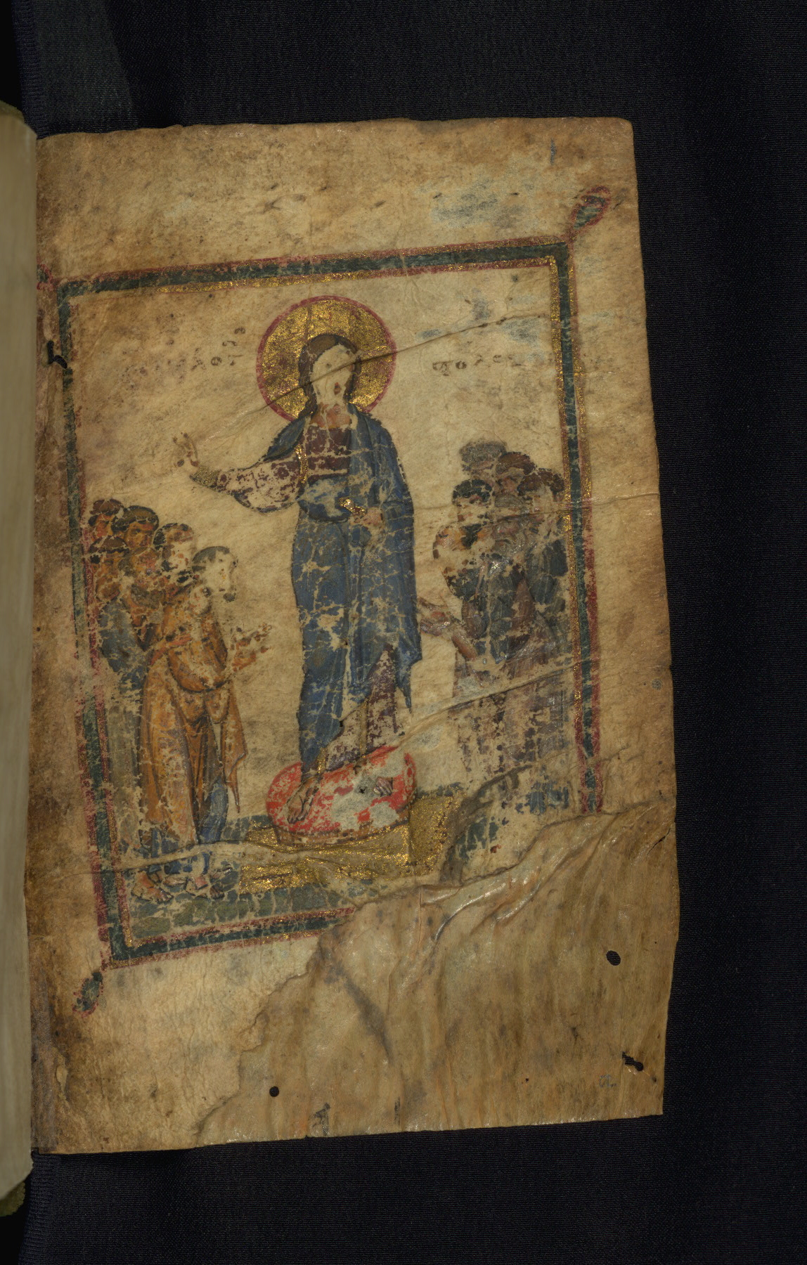The scene known as "Mission of the Apostles" corresponds to John 21:12-19 and is seldom found in Byzantine Gospel illustration. It is not certain that this leaf now occupies its original position: it might have once faced the first page of Acts in a now lost companion volume to W.522.
