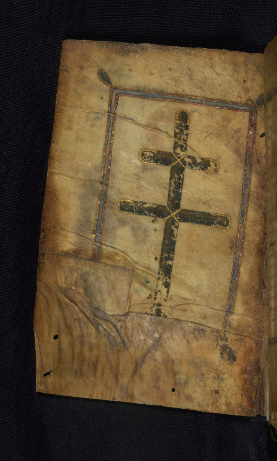 A cross placed at the beginning of a book was believed to protect its contents and it owner. This particular form, with two horizontal arms, is known as a patriarchal cross.