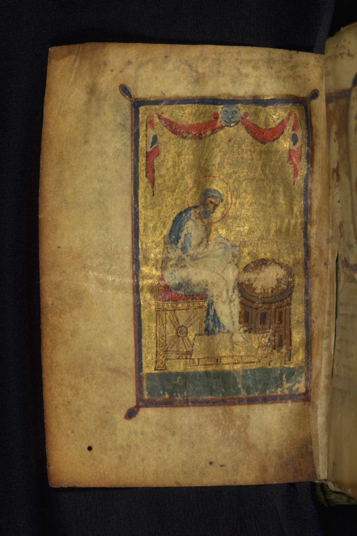 An image of the Nativity (as seen here) sometimes serves as a headpiece for the Gospel of Matthew because the first important liturgical reading in the Gospel of Matthew is the one for Christmas. The image is very worn: most of the paint has flaked, laying bare the preliminary ink drawing. However, the three angels in the upper left corner are still visible, raising their hands in veneration toward the star of Bethlehem (Luke 2:13). In the upper right corner, an angel talks to the shepherds (Luke 2:8-12). On the lower left, Joseph sits deep in thought at the mystery of the Incarnation. Next to him, the newborn Jesus is being washed by his two midwives (the tub resembles a baptismal font). In the center, the Virgin lies on a red bedsheet next to her infant son. The vertical stroke of the initial letter "B" in Matthew 1:1 ("Book of the generation...") is formed by a figure of the Evangelist, pen in hand. He is actually writing the text that we read on the page. This is the very beginning of the Gospel, where Christ's genealogy is recounted. Correspondingly, the three standing figures in the side margin form a sort of abbreviated family tree of the Savior: Abraham above, David in the middle, and Christ at the bottom.