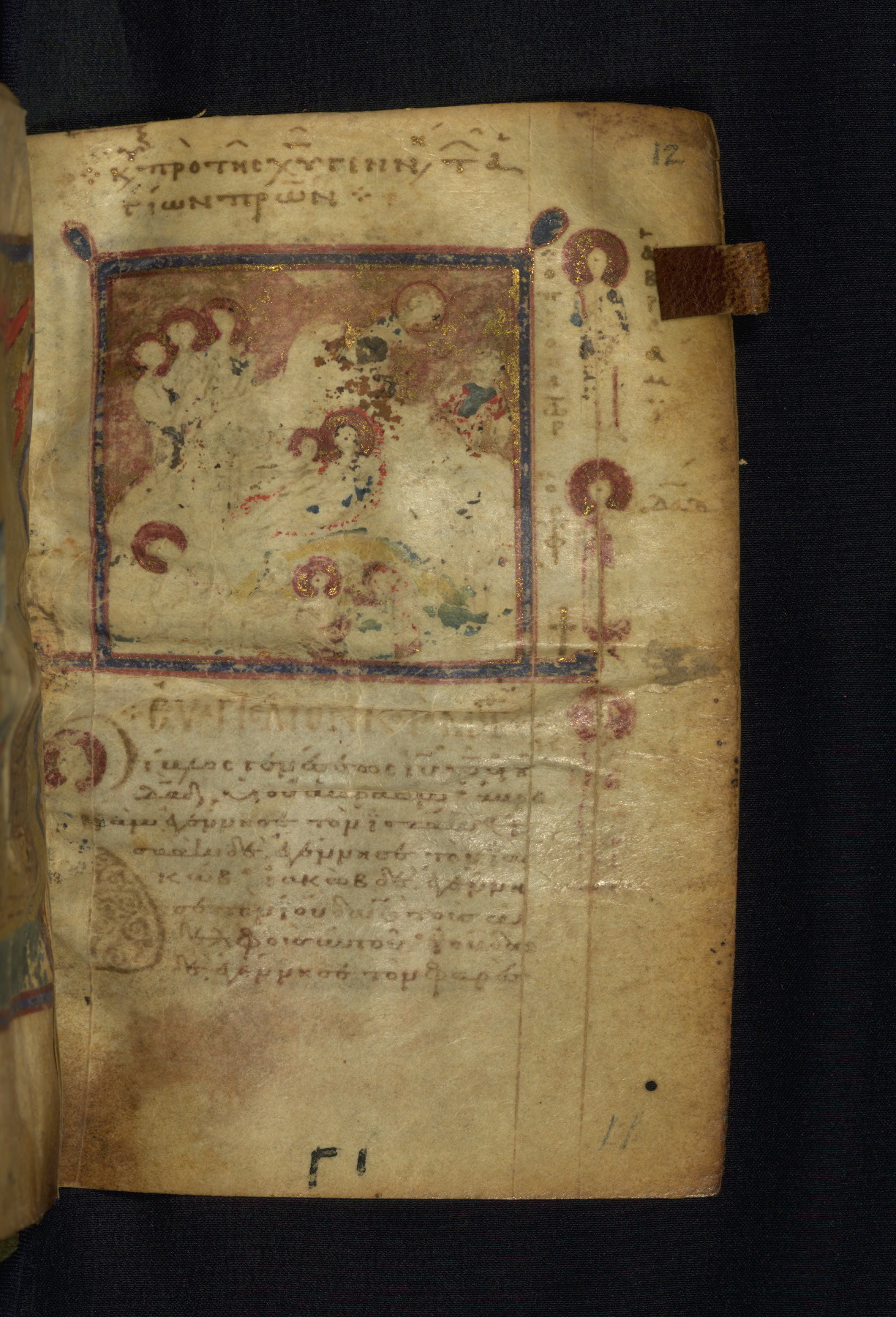 The inscription in the upper margin reads "Κυ(ριακὴ) πρὸ τῆς Χ(ριστο)ῦ Γεννή(σεως) τ(ῶν) ῾Αγίων Π(ατέ)ρων" (Sunday of the Holy Fathers, [the Sunday] before Christ's Nativity). (This is the feast day on which the text found on this page is read in church). Next to the figures in the right-hand margin: "῾Ο προπάτωρ ᾿Αβραάμ, ῾Ο πρ(ο)φ(ήτης) Δα(υί)δ, ᾿Ι(ησοὺ)ς Χ(ριστό)ς" (The forefather Abraham, The prophet David, Jesus Christ).