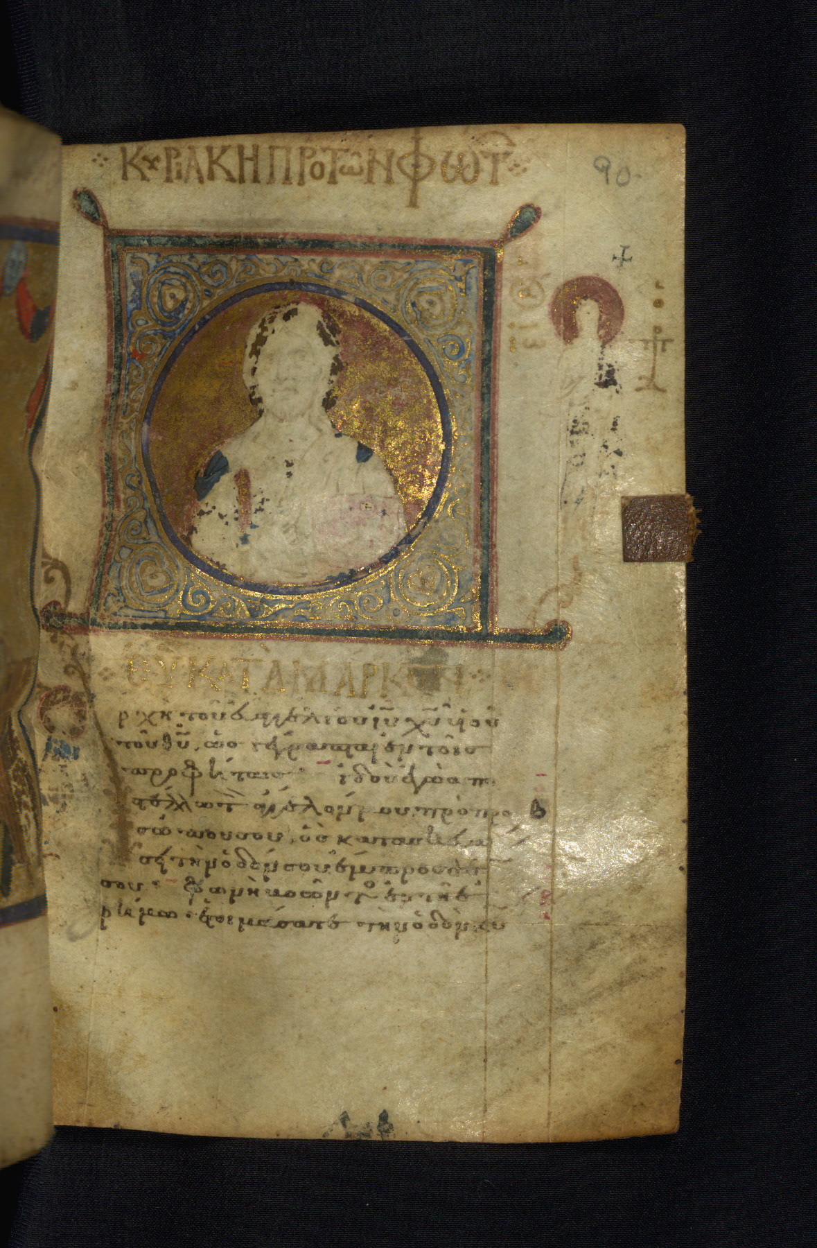 The inscription in the upper margin reads "Κυριακὴ πρὸ τῶν Φώτων" (Sunday before Epiphany [the feast of Christ's Baptism), the day on which the text on this page is read in church. In the side margin: "῾Ο ἅ(γιος) ᾿Ιω(άννης) ὁ Πρ(ό)δ(ρομος)" (Saint John the Forerunner [of Christ]). Next to the initial "A:" "῾Ο ἅ(γιος) Μάρκος" (Saint Mark).