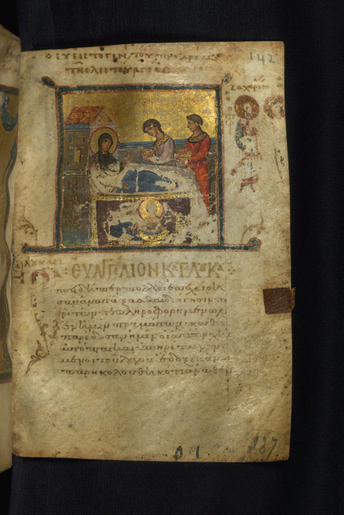 The inscription in the upper margin reads "Εὐ(αγγέλιον) εἰς τὸ γενέ(σιον) τοῦ Προδρόμου τῆς λειτουργίας" (Gospel [reading] for the liturgy on the [feast day of] the birth of the Forerunner [John]). In the side margin, "Ζαχαρί(ας) ὁ Πρ(ο)φ(ήτης), ῾Ο [...]" (Zechariah the Prophet, The [angel of the Lord]). Next to the initial "E," "῾Ο ἅ(γιος) Λουκᾶς" (Saint Luke).