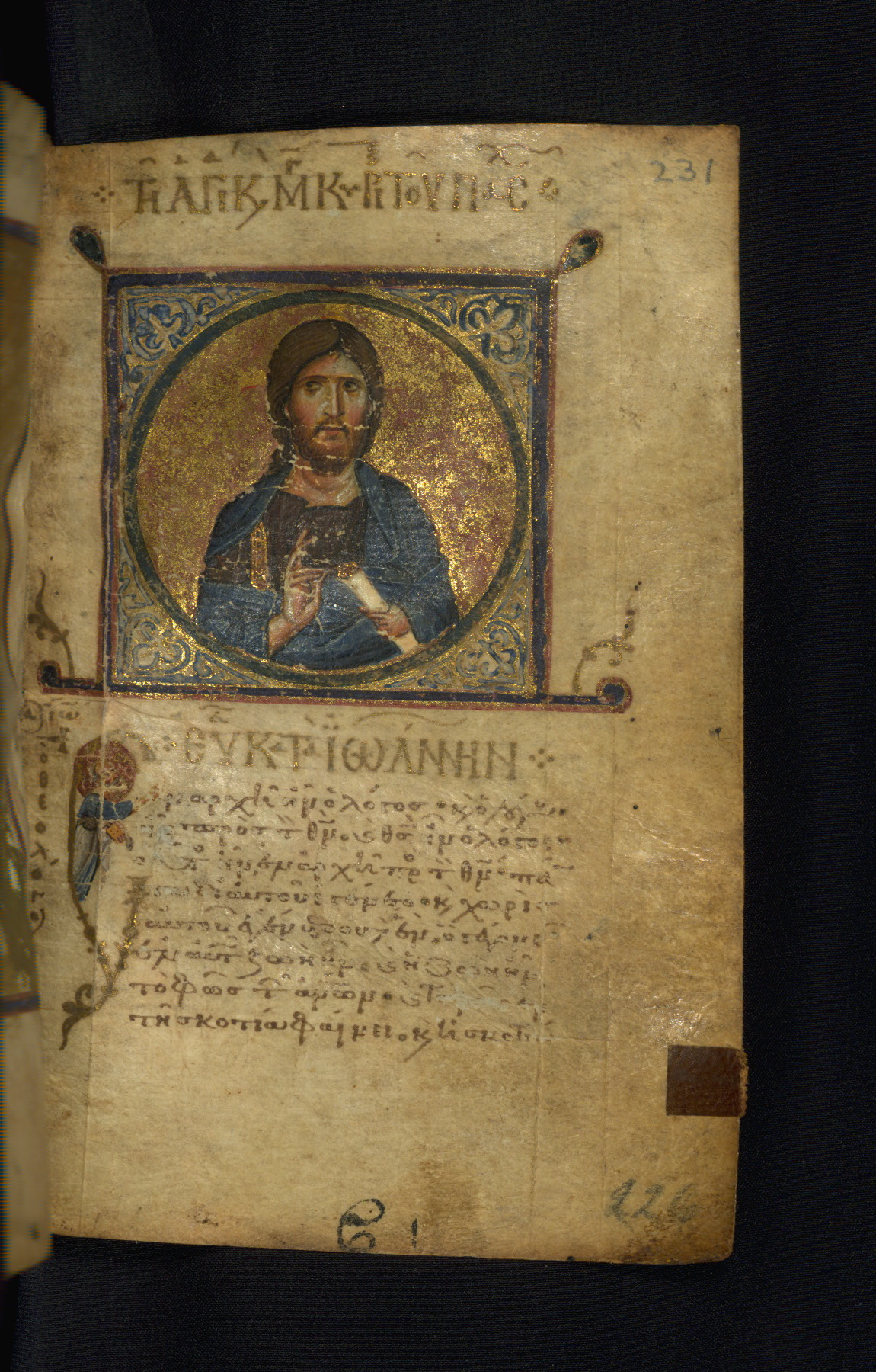 The Gospel here is preceded by an image of Jesus Christ, the incarnate Word of God, thus illustrating John 1:1.