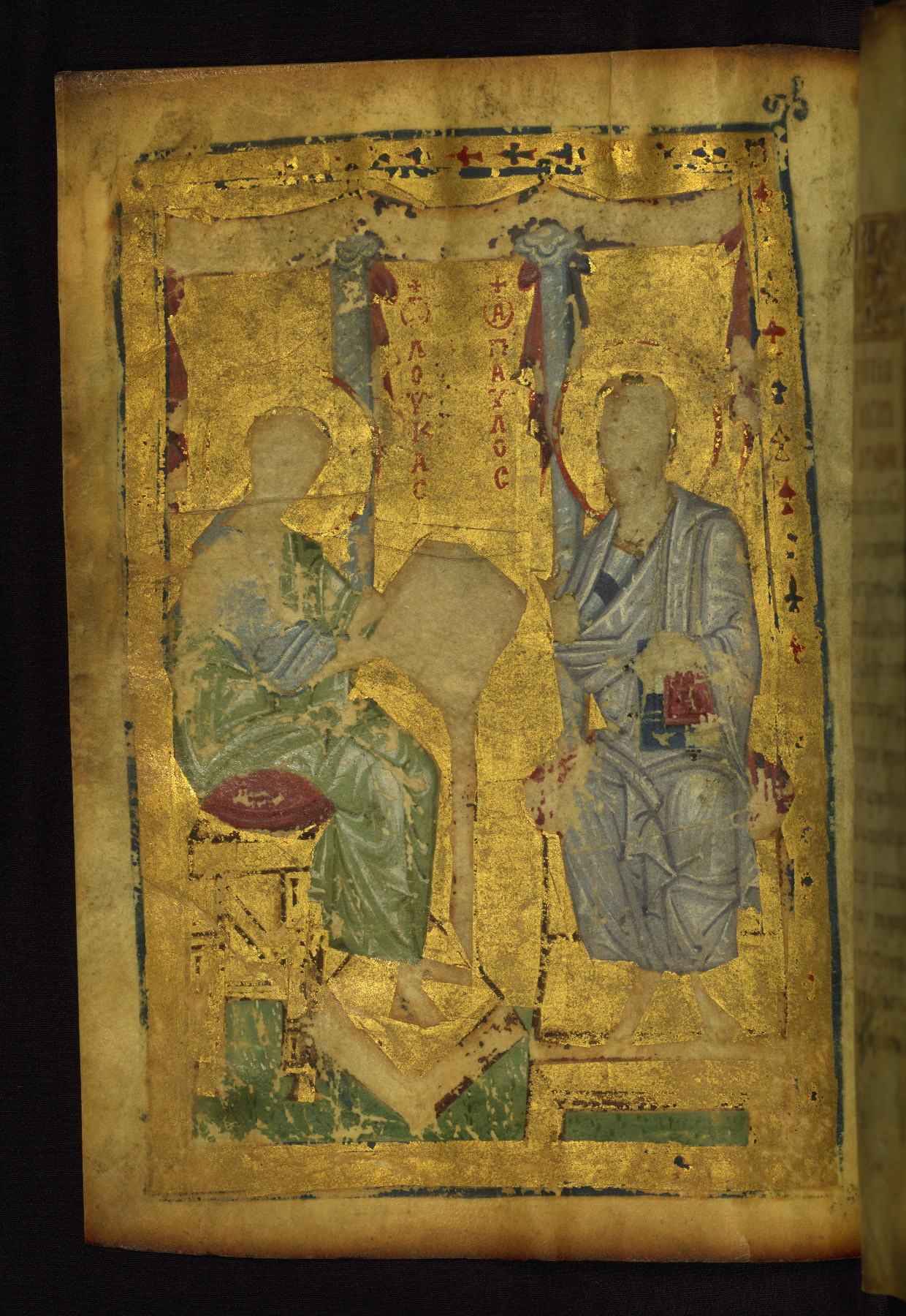 The labelling inscriptions read: "ho ha(gios) Loukas," "ho ha(gios) Paulos." Trans.: "St. Luke," "St. Paul."