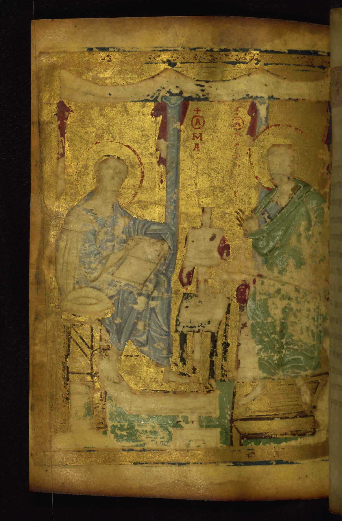 The Evangelist is shown writing his Gospel, while Paul, who according to tradition instructed him, raises his hand in a gesture signifying speech.