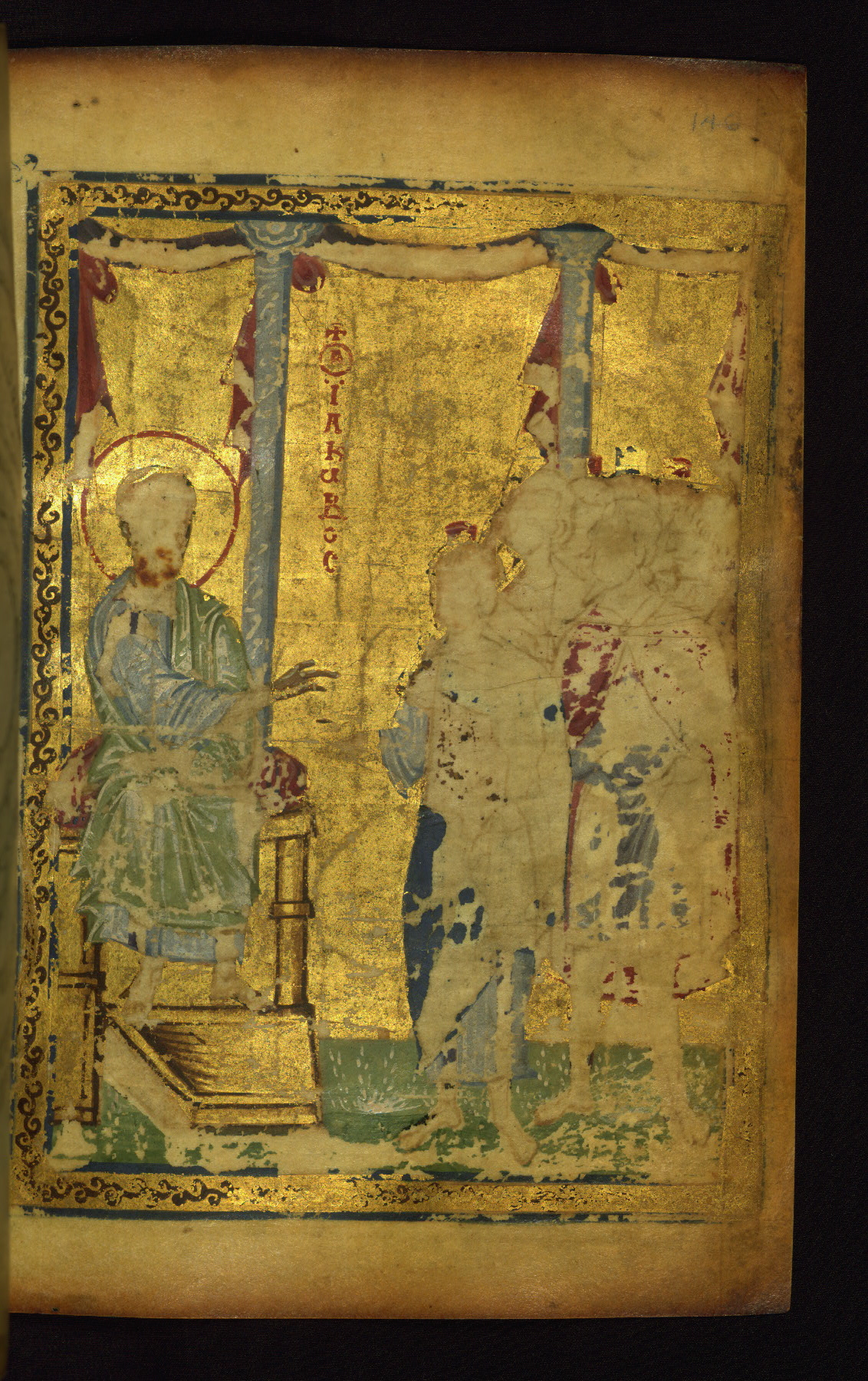 - Decoration note: Originally, each of the four Gospels was preceded by an image of the respective Evangelist paired with a depiction of an appropriately selected New Testament scene. The author portraits are now partly in disorder: the New Testament scenes have been separated from the book and are now preserved in a private collection in Switzerland; Matthew is lost; Luke has taken his place; the place of Luke is occupied by an image of the Apostle James preaching, which must have originally preceded the Epistle of James in a lost second volume containing the Acts and Epistles.