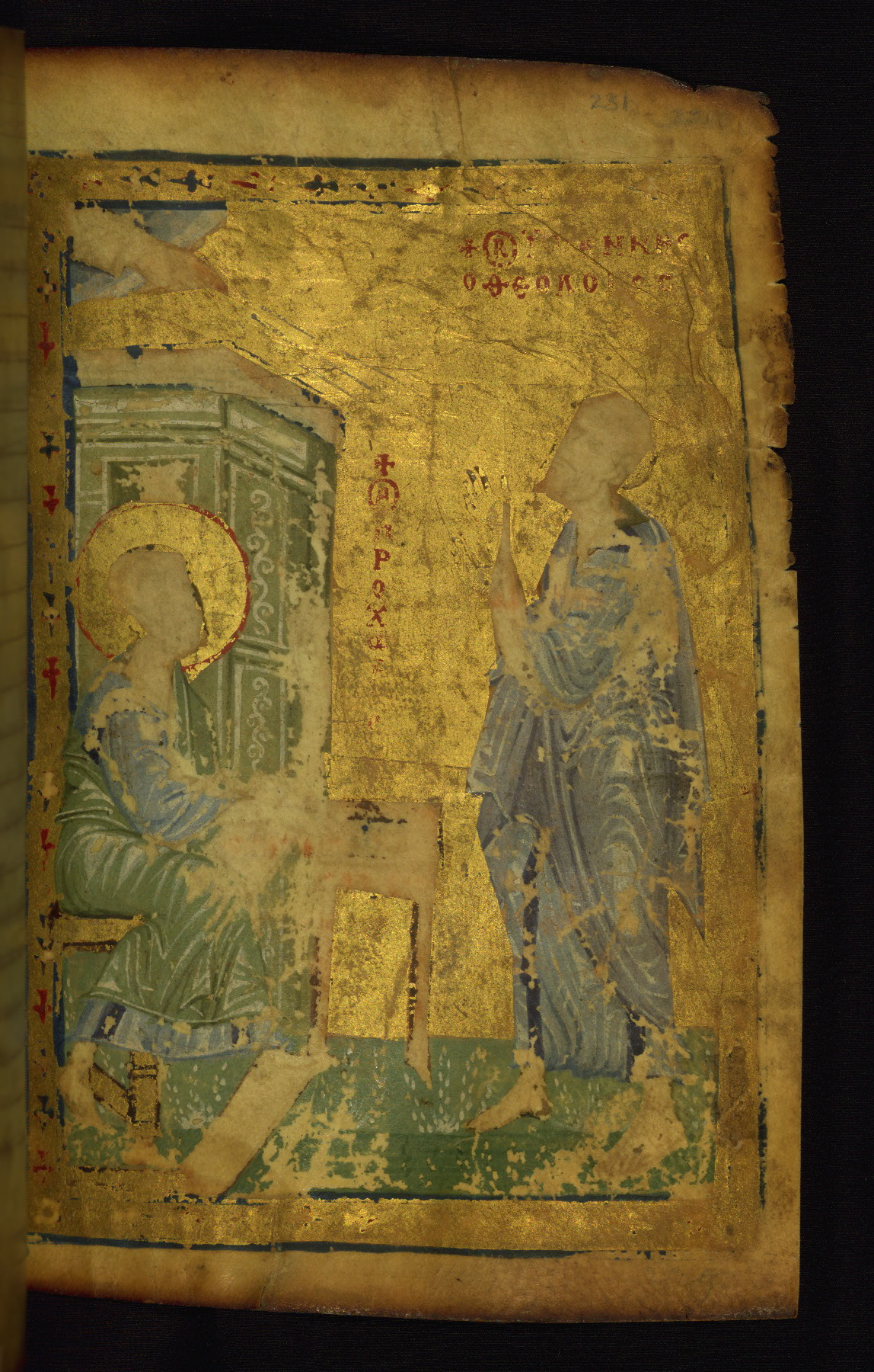 - Text note: Incomplete and out of sequence: fols. 4r-5v: chapters list for Gospel of Matthew; fol. 5v: verses in praise of Evangelist Matthew; fols. 15r-16v: Cosmas Indicopleustes’ preface to Gospel of Matthew; fols. 7r-14v, 17r-87r: Gospel of Matthew; fols. 87v-88v: chapters list for the Gospel of Mark; fol. 88v: verses in praise of the Evangelist Mark; fols. 90r-142v: Gospel of Mark; fols. 143r-144v: chapters list for the Gospel of Luke; fol. 145r: verses in praise of the Evangelist Luke; fols. 147r-148r: Cosmas Indicopleustes’ preface to Gospel of Luke; fols. 149r-204, 228, 205-10, 227, 211-226, 246, 252, 249, 238-39, 250, 240, 251r: Gospel of Luke; fols. 247r-248v: Cosmas Indicopleustes’ preface to the Gospel of John; fol. 248v: verses in praise of the Evangelist John; fols. 232r-233, 241-244, 234, 237, 235, 229, 253, 254, 230, 239, 245v: Gospel of John. [For further details, see bibliography, Parpulov, 2004.]