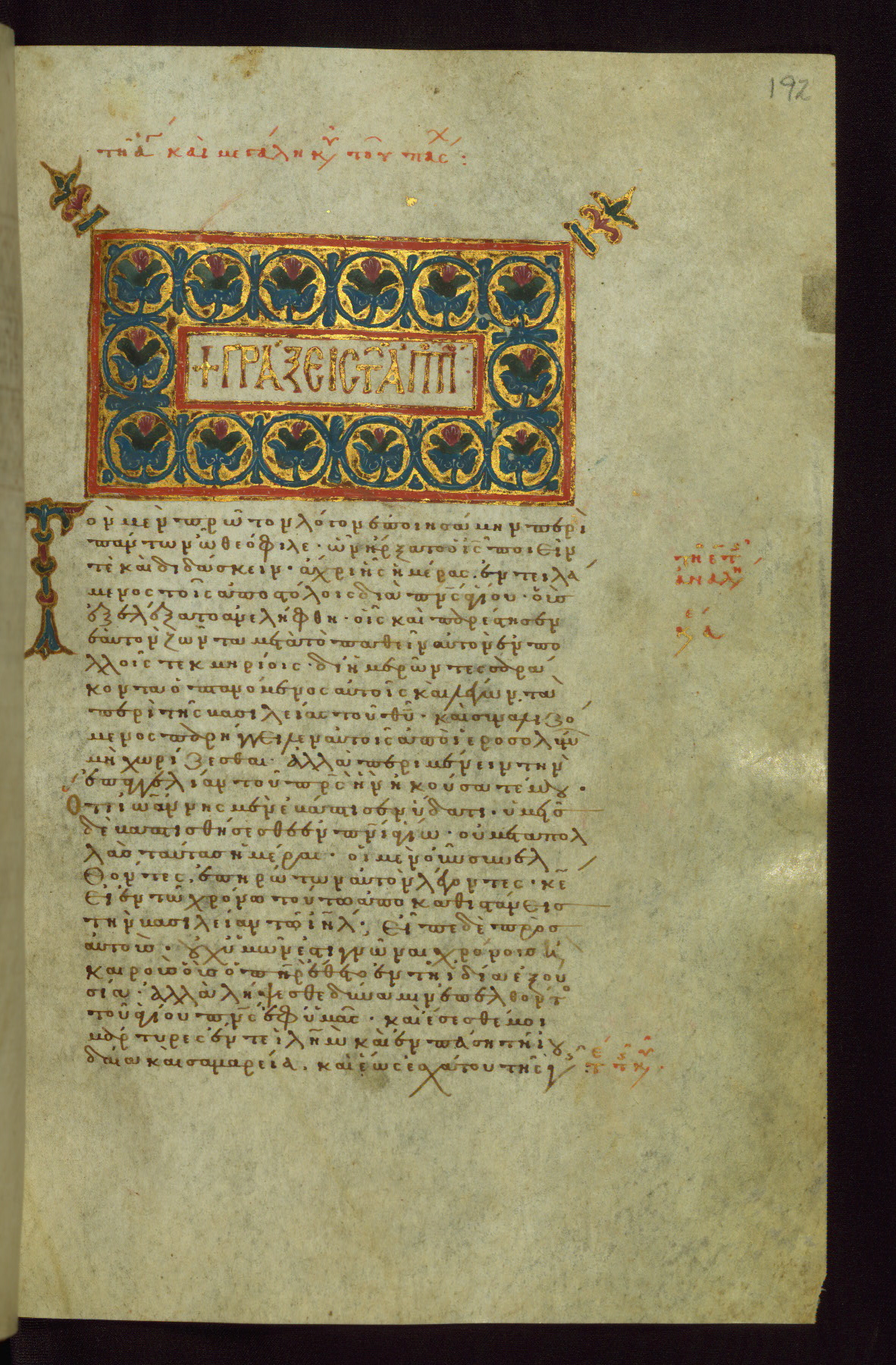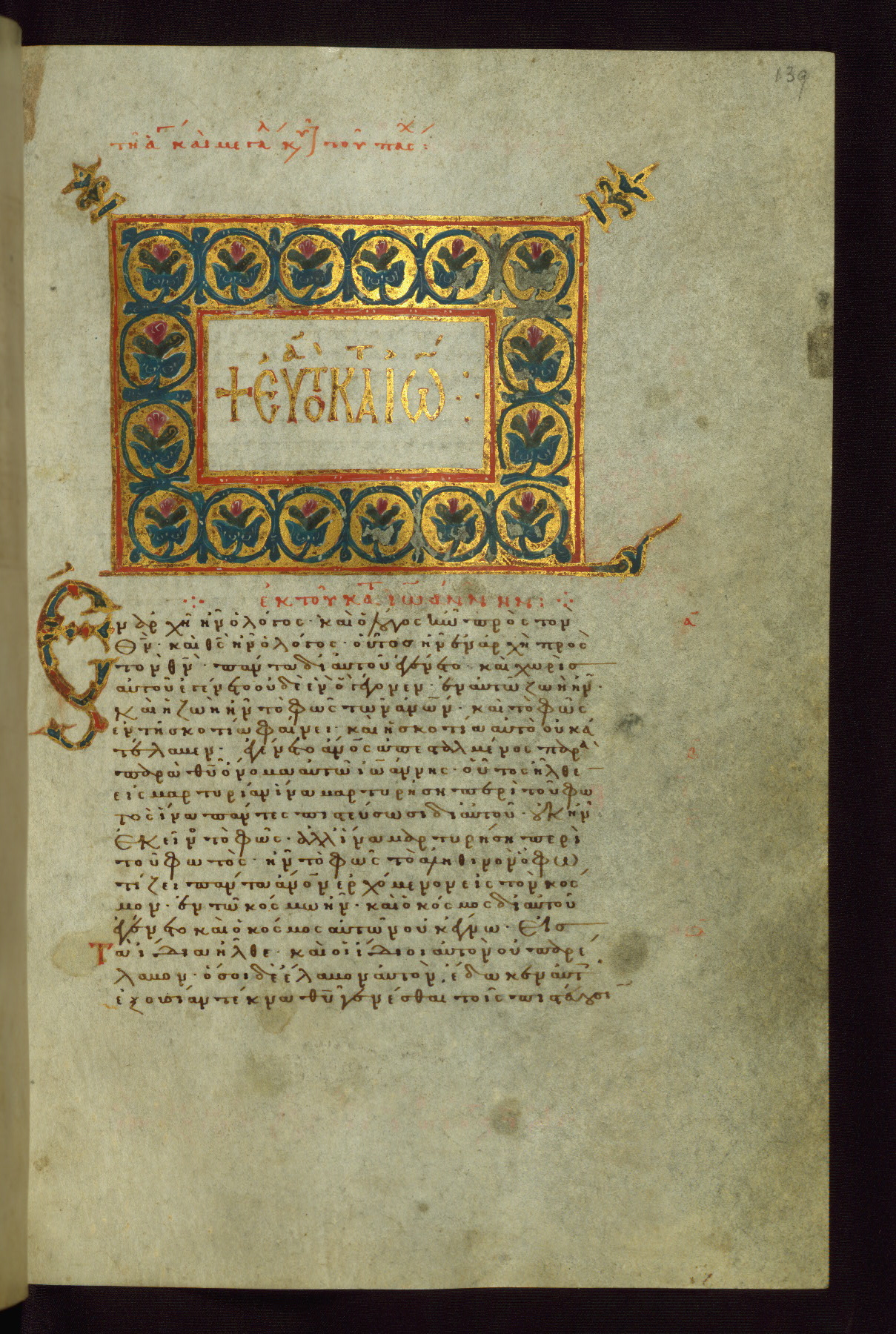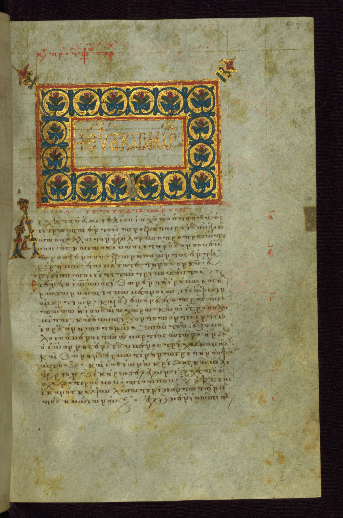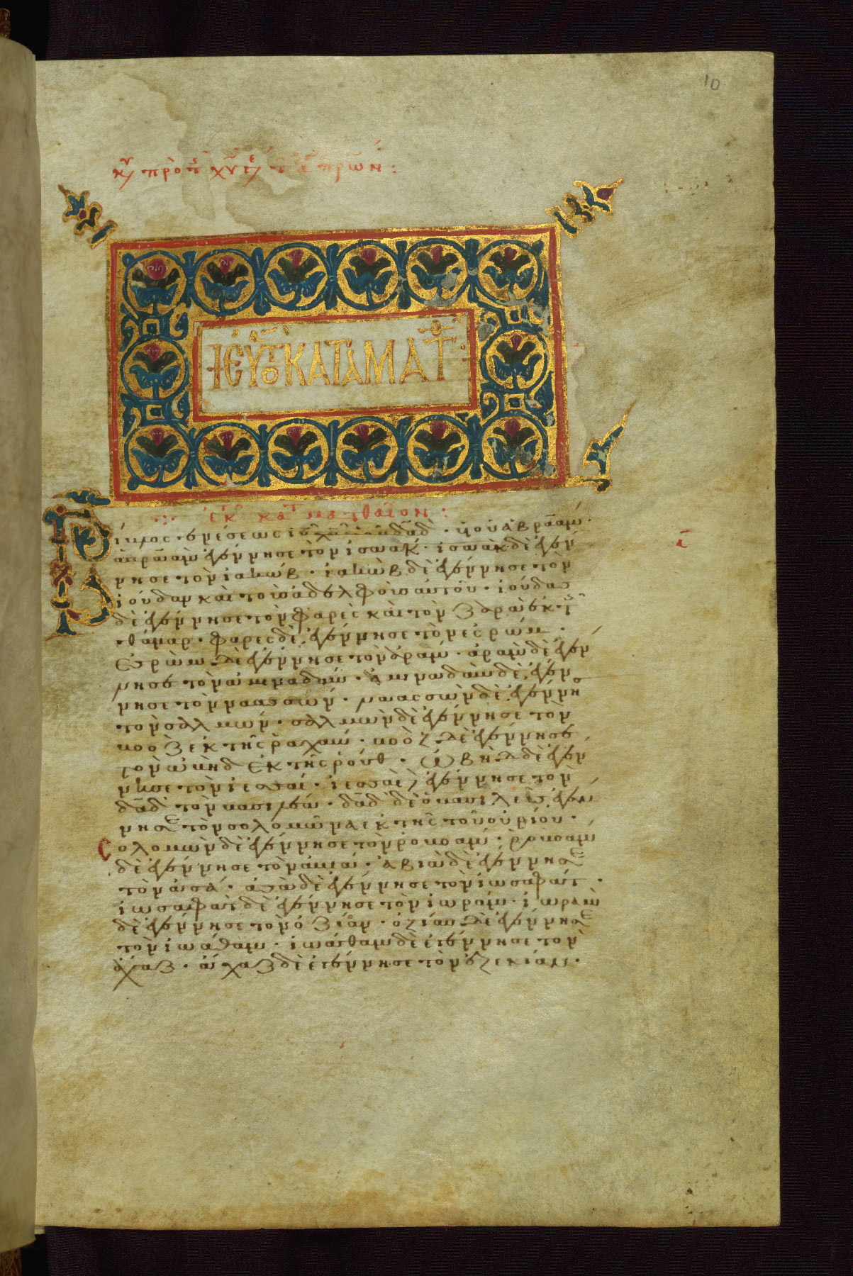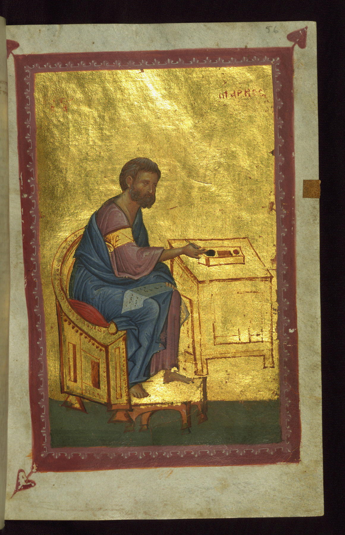 - Contents: Fols. 1v–2r: Letter of Eusebius to Carpianus; fols. 3r–7v: Canon tables; fols. 8r–v: Chapters list for the Gospel of Matthew; fols. 10r–54v: Gospel of Matthew; fols. 55r–v: Chapters list for the Gospel of Mark; fols. 57r–85r: Gospel of Mark; fols. 85v–86v: Chapters list for the Gospel of Luke; fols. 88r–137r: Gospel of Luke; fol. 137r: Chapters list for the Gospel of John; fols. 139r–171v: Gospel of John; fols. 172r–181r: List of Gospel readings for the movable feasts; fols. 181v–191r: List of Gospel readings for the immovable feasts; fols. 192r–236v: Acts of the Apostles; fols. 236v-253r: Catholic Epistles; fols. 236v–240r: James; fols. 240r–244r: I Peter; fols. 244r–246v: II Peter; fols. 246v–251r: I John; fols. 251r–v: II John; fols. 251v–252r: III John; fols. 252r–253r: Jude; fols. 253r-340r: Pauline Epistles; fols. 253r–268v: Romans; fols. 268v–283v: I Corinthians; fols. 284r–294r: II Corinthians; fols. 294v–299v: Galatians; fols. 299v–305r: Ephesians; fols. 305r–308v: Philippians; fols. 309r–312v: Colossians; fols. 312v–316r: I Thessalonians; fols. 316r–317v: II Thessalonians; fols. 318r–322r: I Timothy; fols. 322r–325r: II Timothy; fols. 325r–326v: Titus; fols. 327r–v: Philemon; fols. 327v–340r: Hebrews; fols. 342r–346r: List of Acts and Epistles readings for the movable feasts; fols. 346r–352v: List of Acts and Epistles readings for the immovable feasts