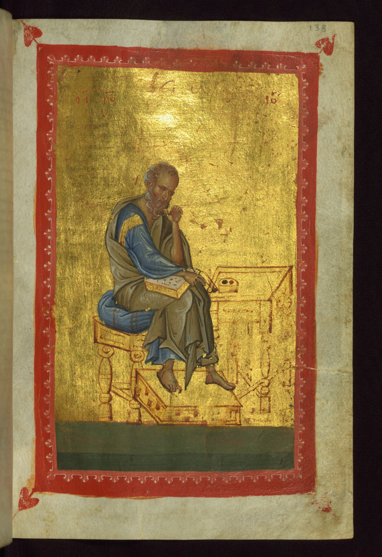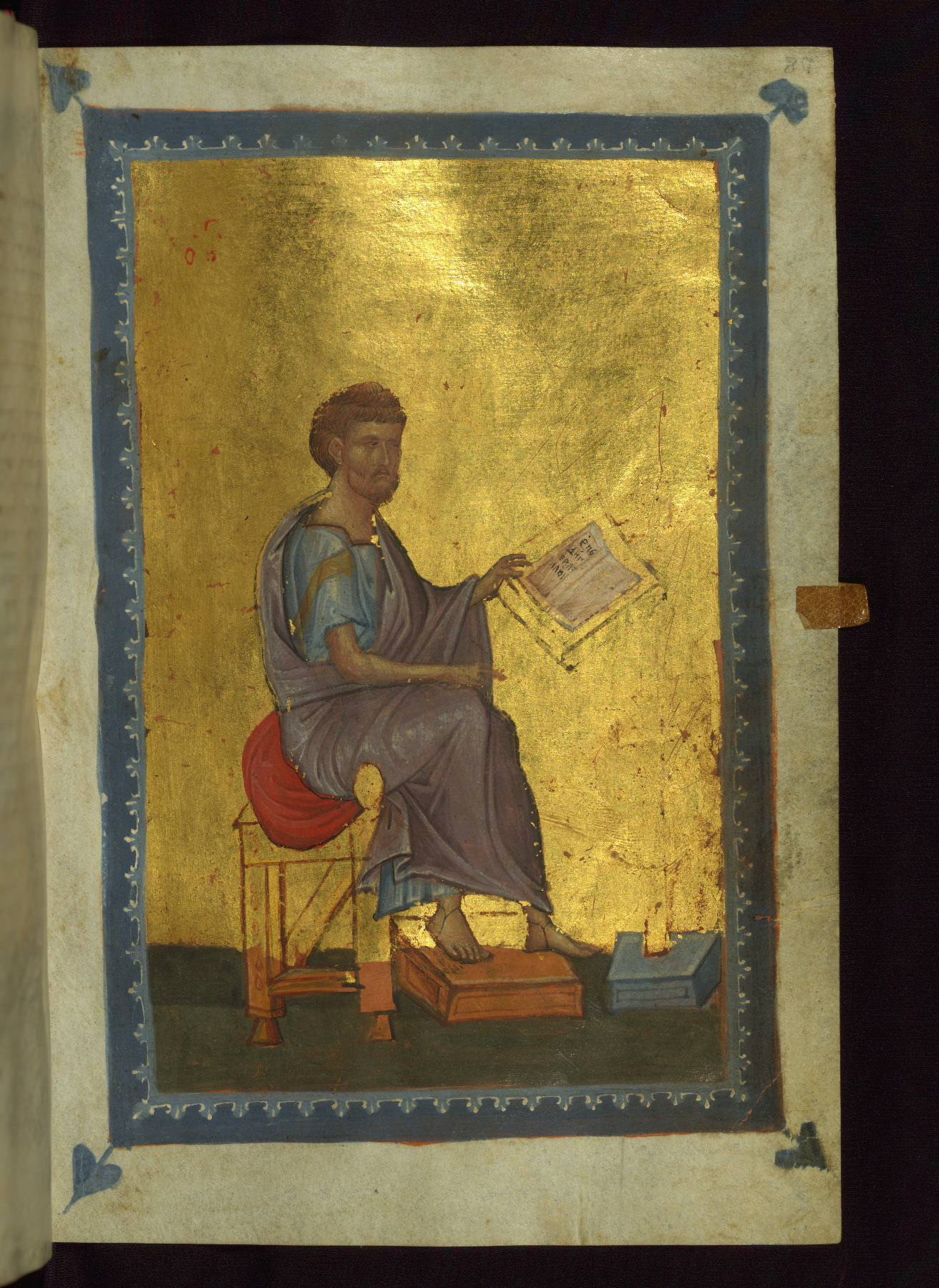 The front of the Evangelist's face and the lower part of his tunic were overpainted in the early twentieth century (they must have been damaged).