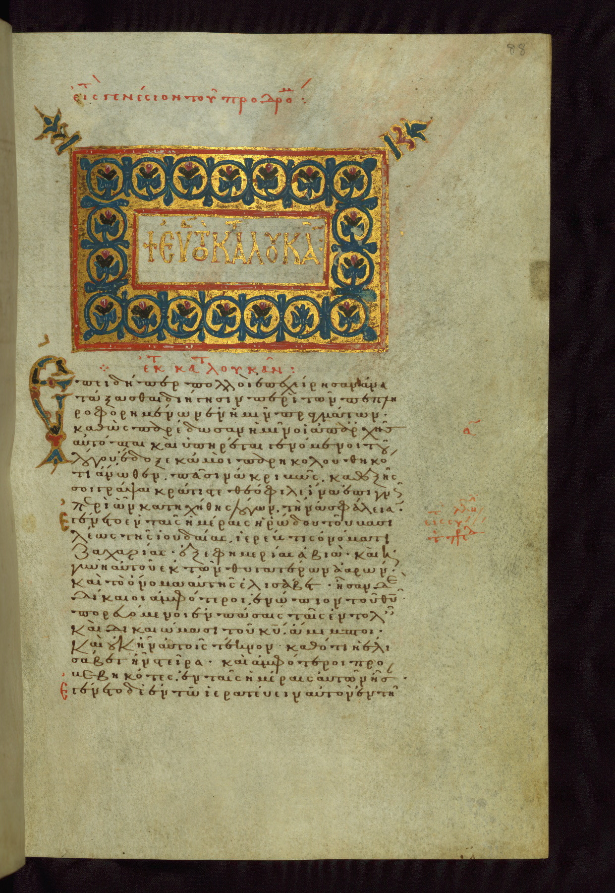 - Text: Luke 1:1 (on the book in front of the Evangelist)