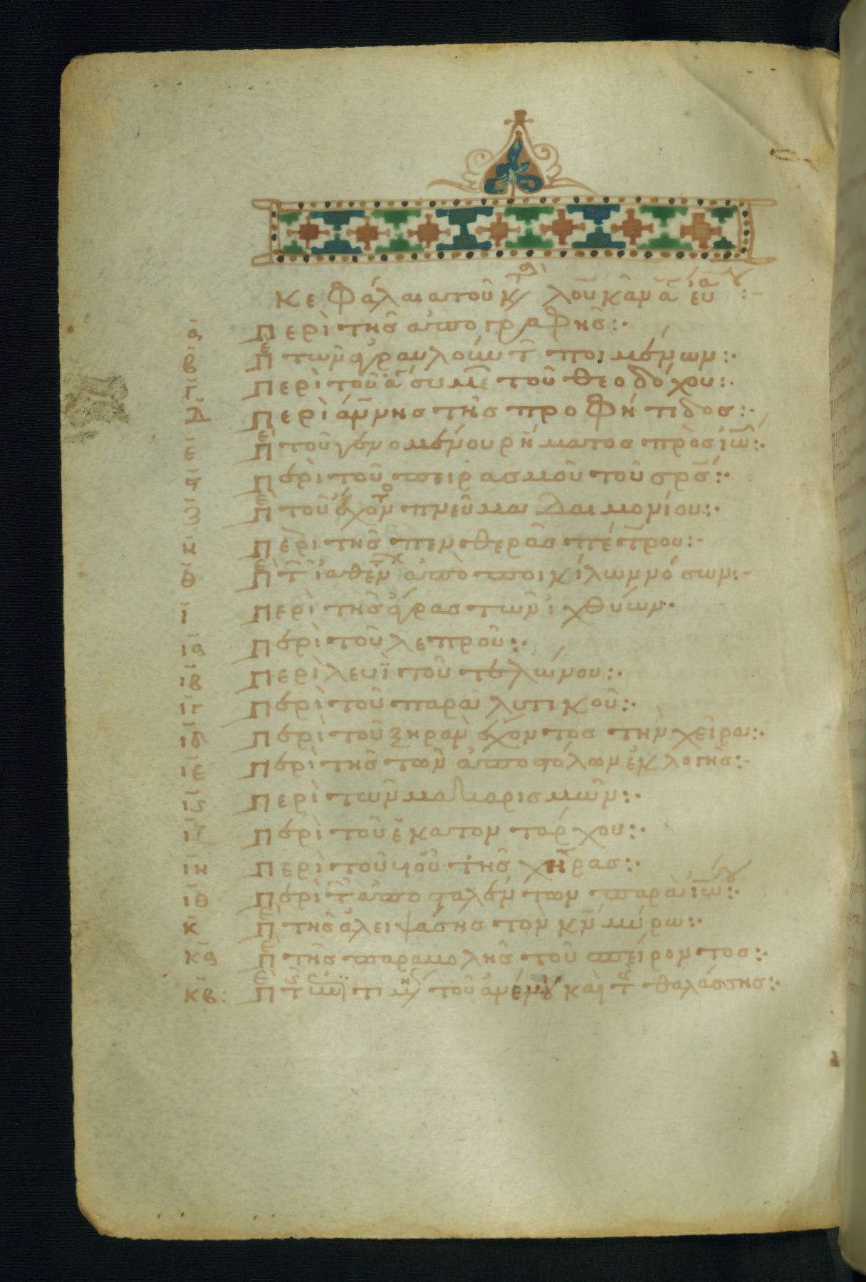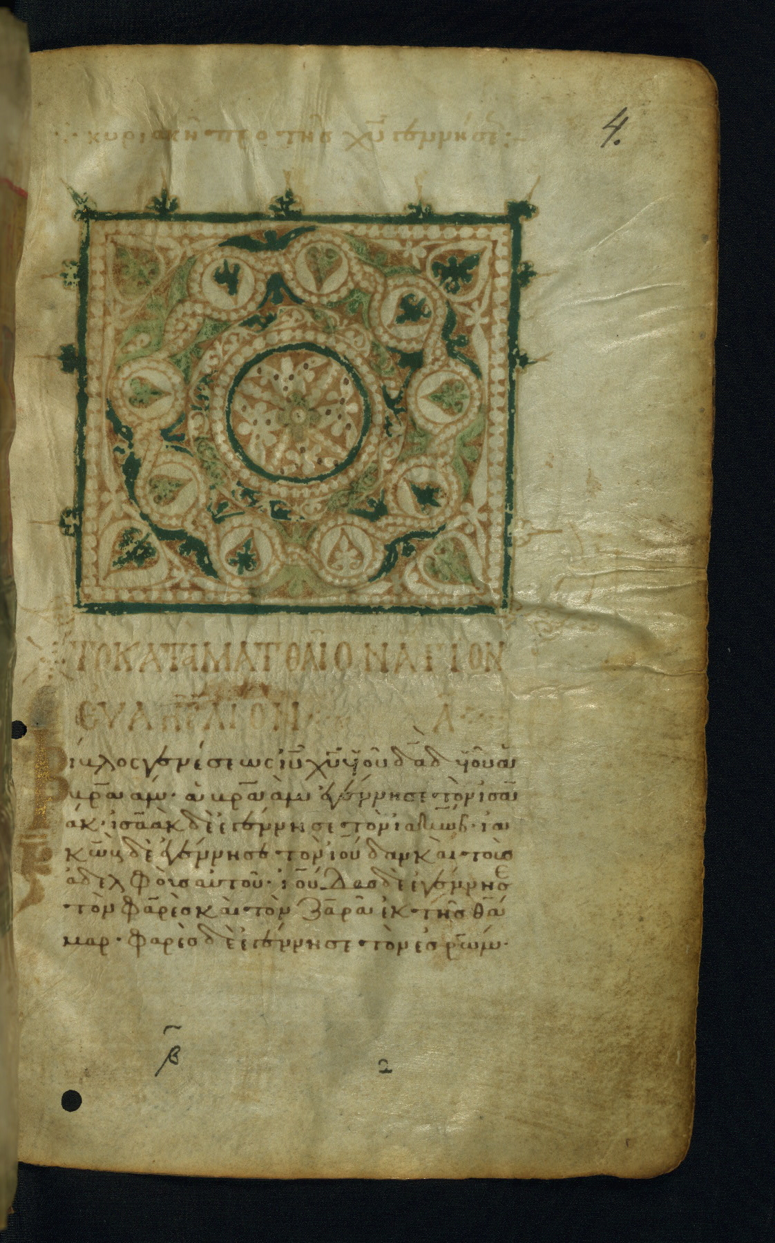 - Decoration note: Five full-page miniatures; incipits of Gospels adorned with geometric and foliate headpieces; chapter lists marked with ornamental headbands; rubrics in light brown; text in dark brown ink