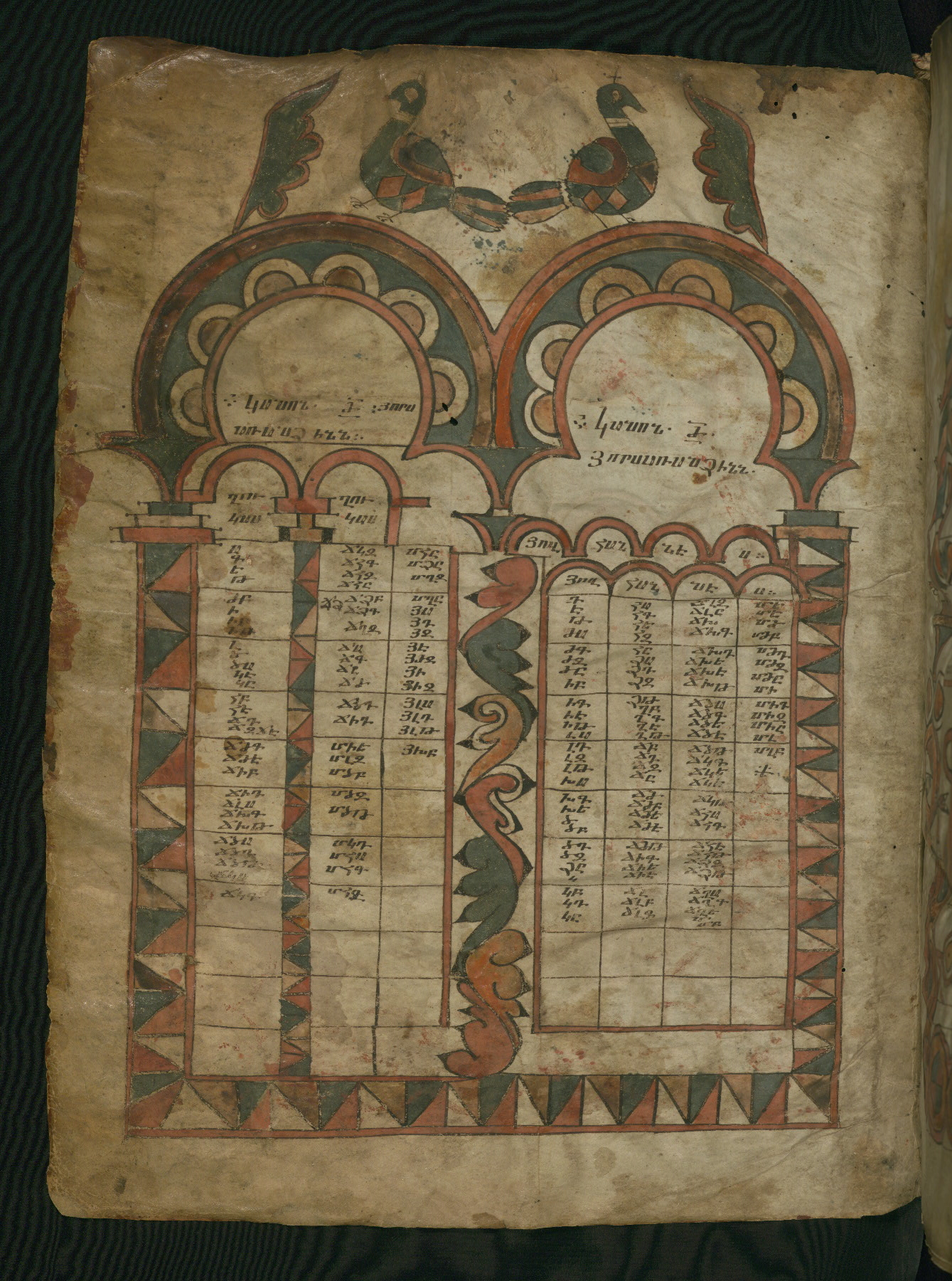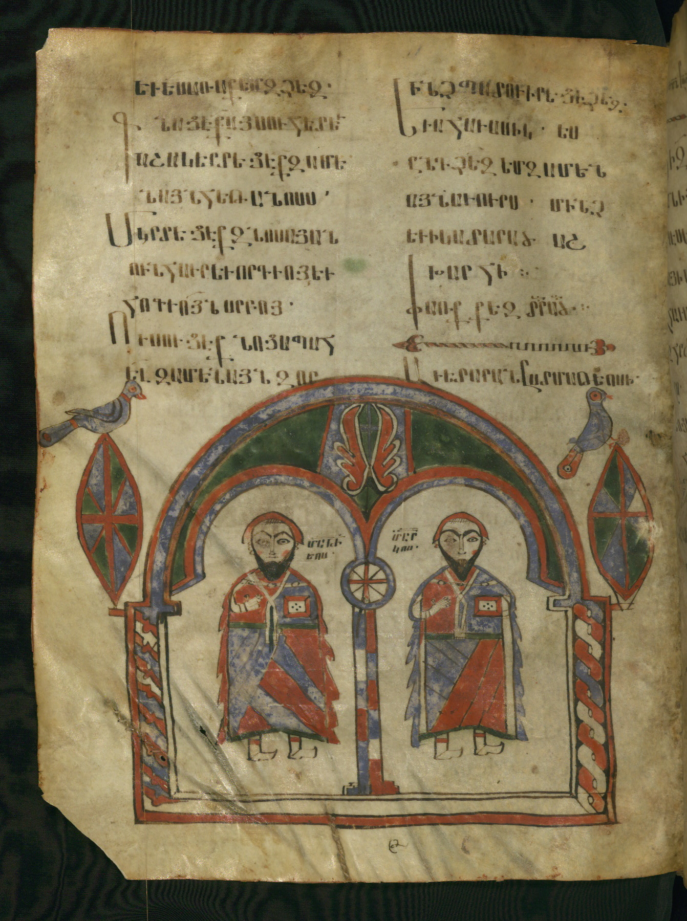 Dated to the tenth century, this manuscript is the oldest Armenian codex in North America and the fifth oldest among documented Armenian Gospel Books. The principal colophon on fol. 2v records that Sargis the Priest completed the text in 415 [966 CE]. Within the framed area, the commission of the codex is described: a priest, whose name was replaced by the later owner T’oros, commissioned the work "as decoration and for the splendor of [the] holy church and for the pleasure of the congregation of Rznēr." As the codex was written and commissioned by priests, the manuscript is referred to as the “Gospels of the Priest.” It was formerly known as the “Gospels of the Translators,” as, following the date 415, someone erased the formula “of the Armenian era” and replaced it with “of our Lord,” suggesting an earlier date and implying that the text was based on the original translation of the Gospels into Armenian during the fifth century. The text is copied in large angular erkat‘agir script. The full-page paintings and marginal ornaments bear stylistic characteristics of Armenian illumination of the tenth and eleventh centuries associated with non-royal patronage. The illustrations comprise the Canon Tables, with only the last two remaining; the Virgin and Child on a wheeled chariot; the framed colophon; ornamental cross with donor’s portrait; portraits of Mathew and Mark together (fol. 72v, at the end of Matthew) and Mark with Luke (fol. 114v, at the end of Mark); two final images depict unknown saints (fol. 192r, at the end of Luke). Marginalia are found throughout the text. It has been suggested that the scribe was also responsible for the illumination.