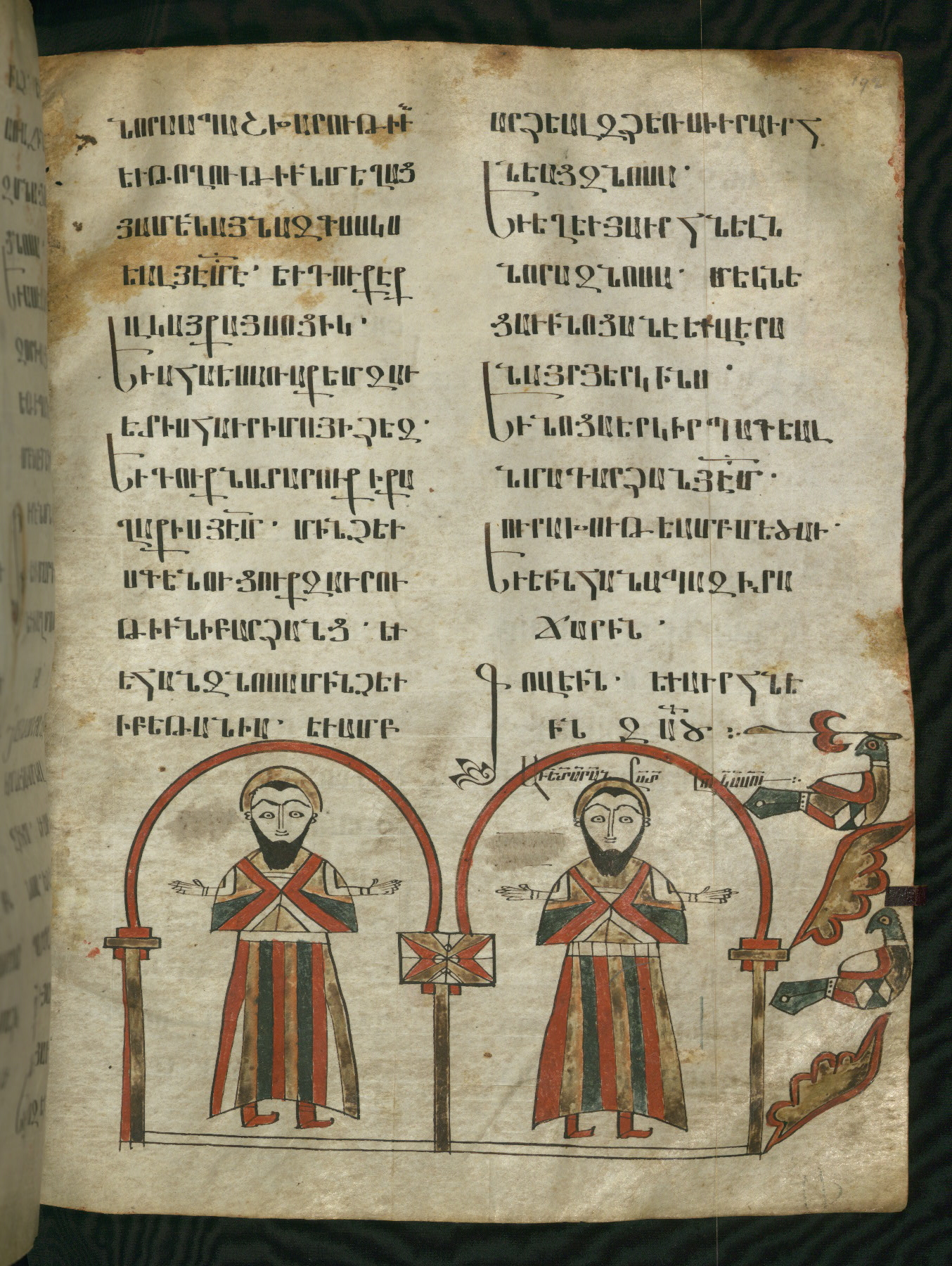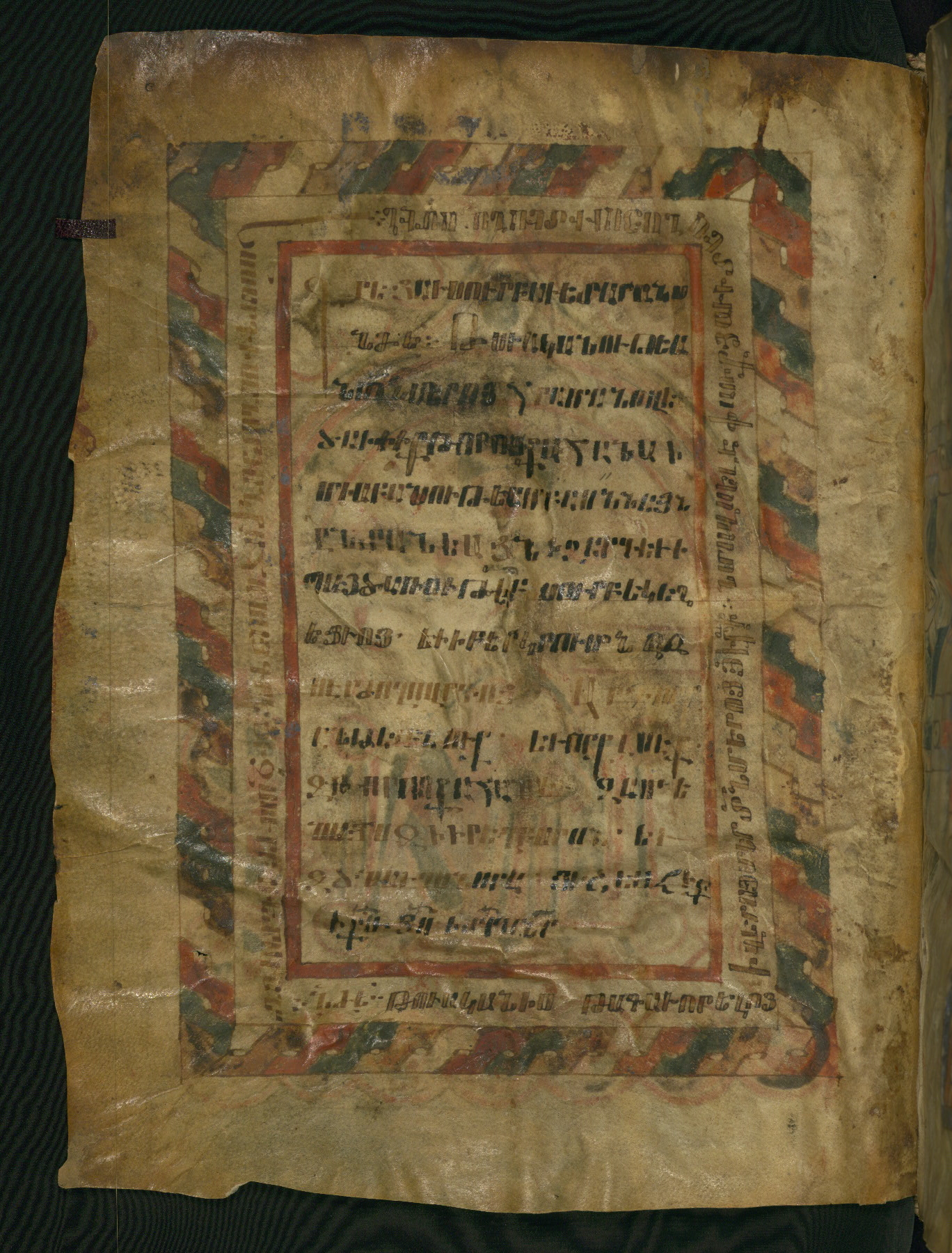 - Translation: Fol. 2v in angular erkat'agir: This Holy Gospels was written (in the year) 415 (= 966 CE) of the era of our Lord by the order and at the expense of T‘oros the priest through the cooperation of all the families as decoration and for the splendor of (the) holy church and for the pleasure of the congregation of Rznēr. Now you who read (it) and who hear (it) remember the priest T‘oros and all his brothers and his parents in Jesus Christ our Lord. Fol. 2v in angular erkat'agir, around the frame: I, Sargis, unworthy priest wrote this Holy Gospels in the year 415 (= 966 CE) of the kingship over us of our Lord Jesus Christ. To him glory is fitting forever and ever, amen.