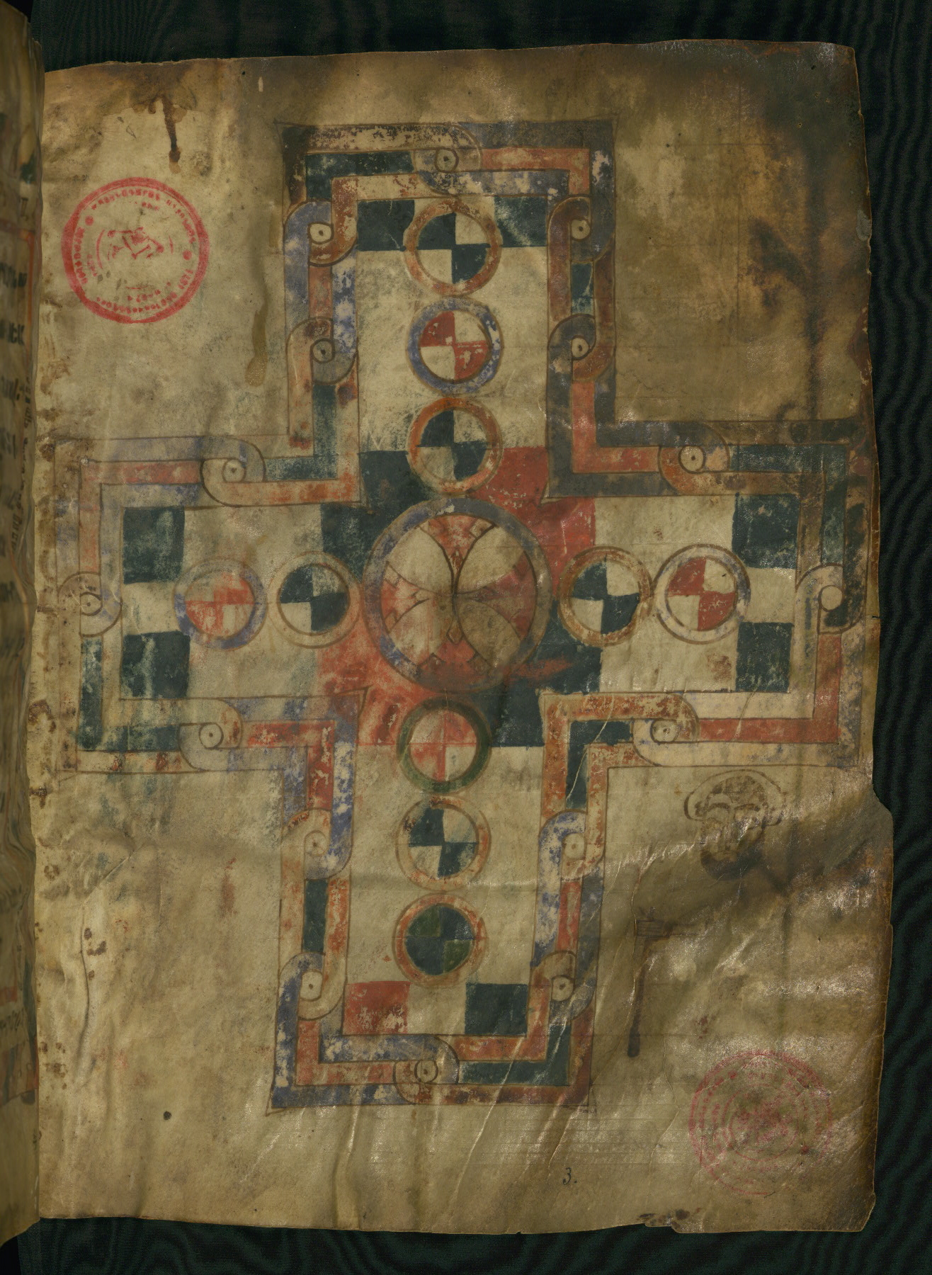 - Decoration note: Full-page ornamental cross at the beginning of the Gospel Book, fol. 3r; standing figures at the bottom of the page at the end of each Gospel; Matthew and Mark on fol. 72v; Mark and Luke on fol. 114v; unknown saints or apostles on fol. 192r; birds, floral and geometrical designs, and one fish in the outer or lower margins, mark the pericope divisions throughout the manuscript; rubrics in gold over red and red; text in brown ink
