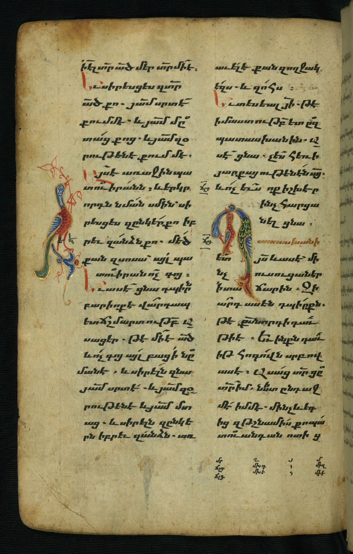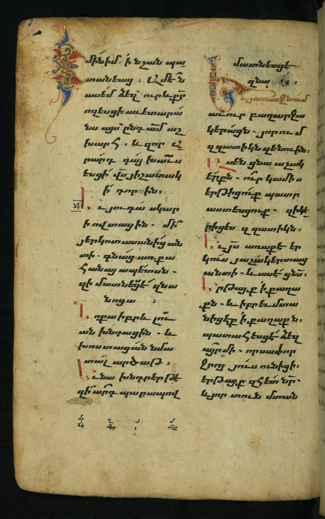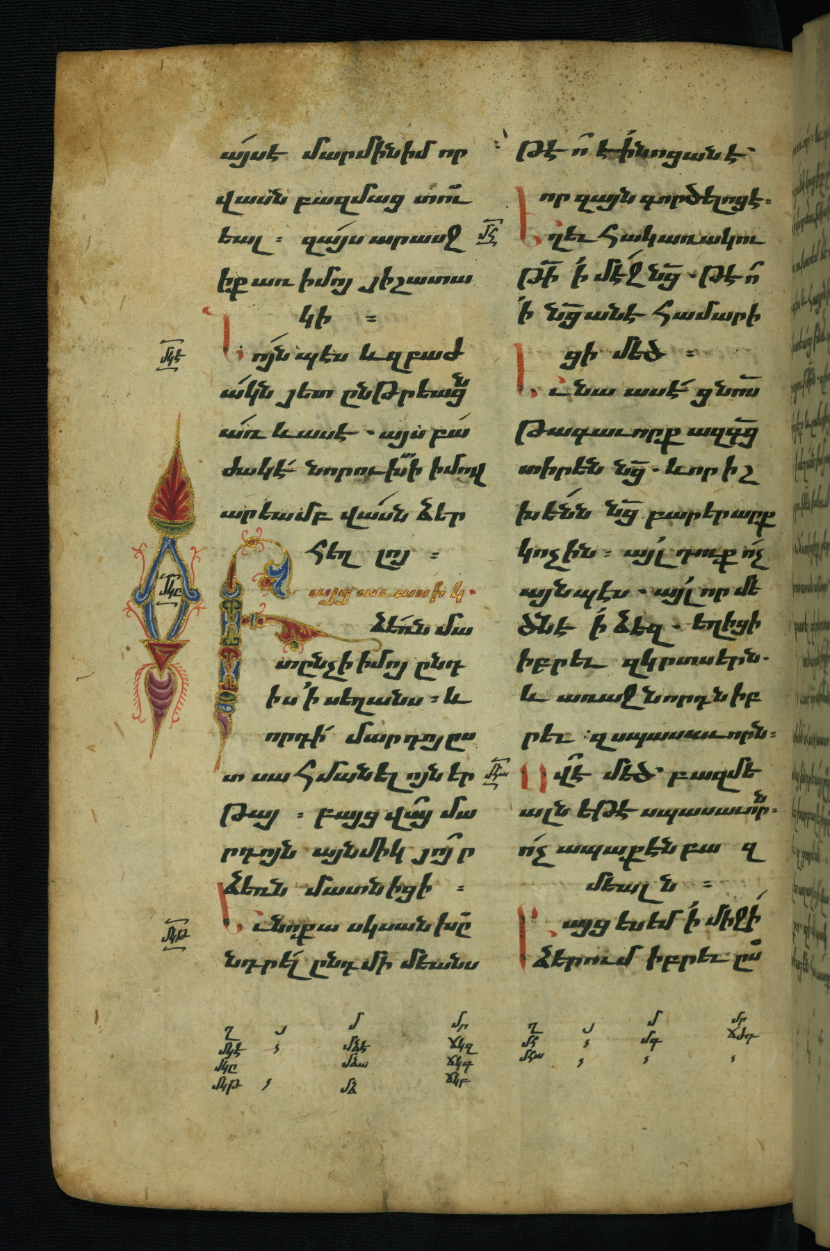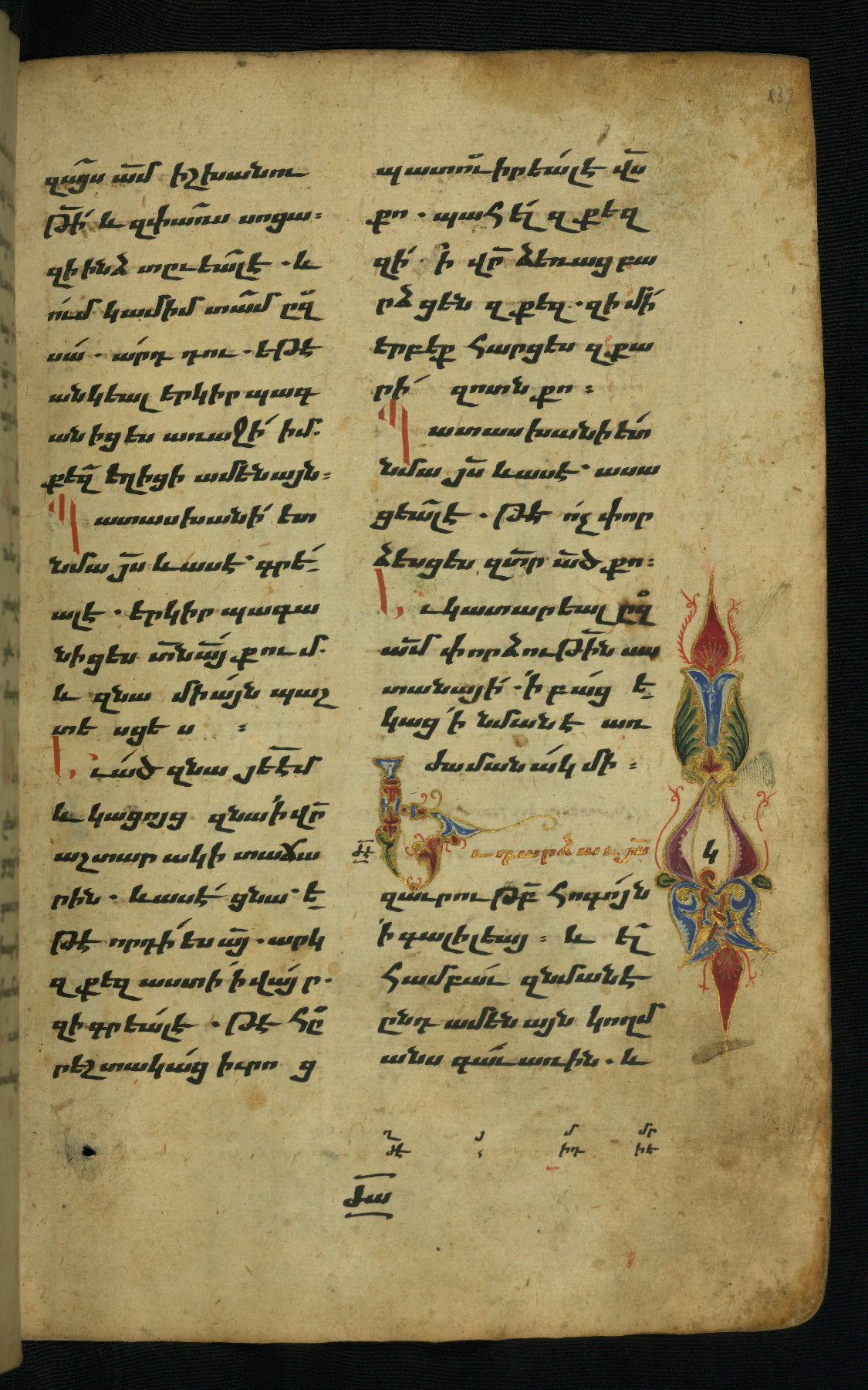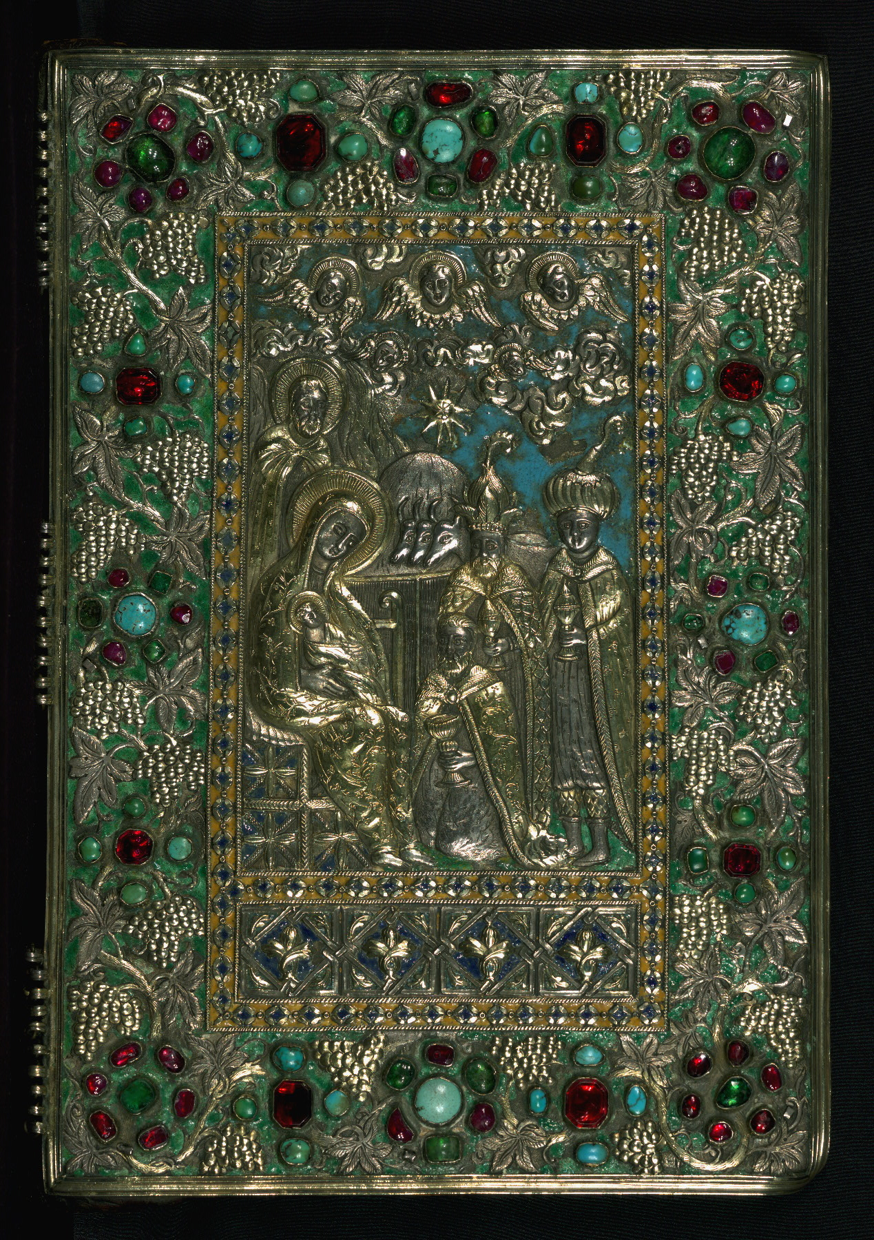 This manuscript was executed in 1475 CE by a scribe identified as Aristakes for a priest named Hakob. It contains a series of sixteen images on the life of Christ preceding the text of the Gospels, as well as the traditional Evangelist portraits, and there are marginal illustrations throughout. The style of the miniatures, which employ brilliant colors and emphasize decorative patterns, is characteristic of manuscript production in the region around Lake Van during the fifteenth century. The style of Lake Van has often been described in relation to schools of Islamic arts of the book. Numerous inscriptions (on fols. 258-260) spanning a few centuries attest to the manuscript's long history of use and revered preservation. The codex's later history included a rebinding with silver covers from Kayseri that date to approximately 1700. This jeweled and enameled silver binding bears a composition of the Adoration of the Magi on the front and the Ascension on the back.