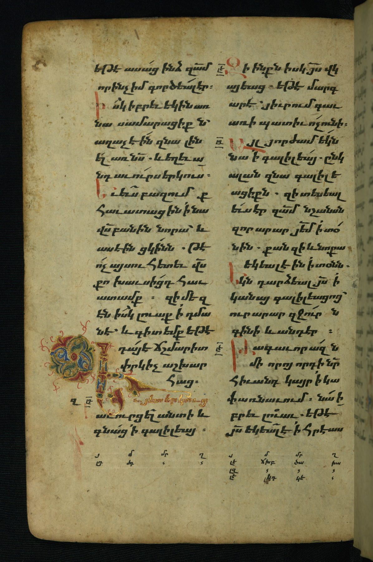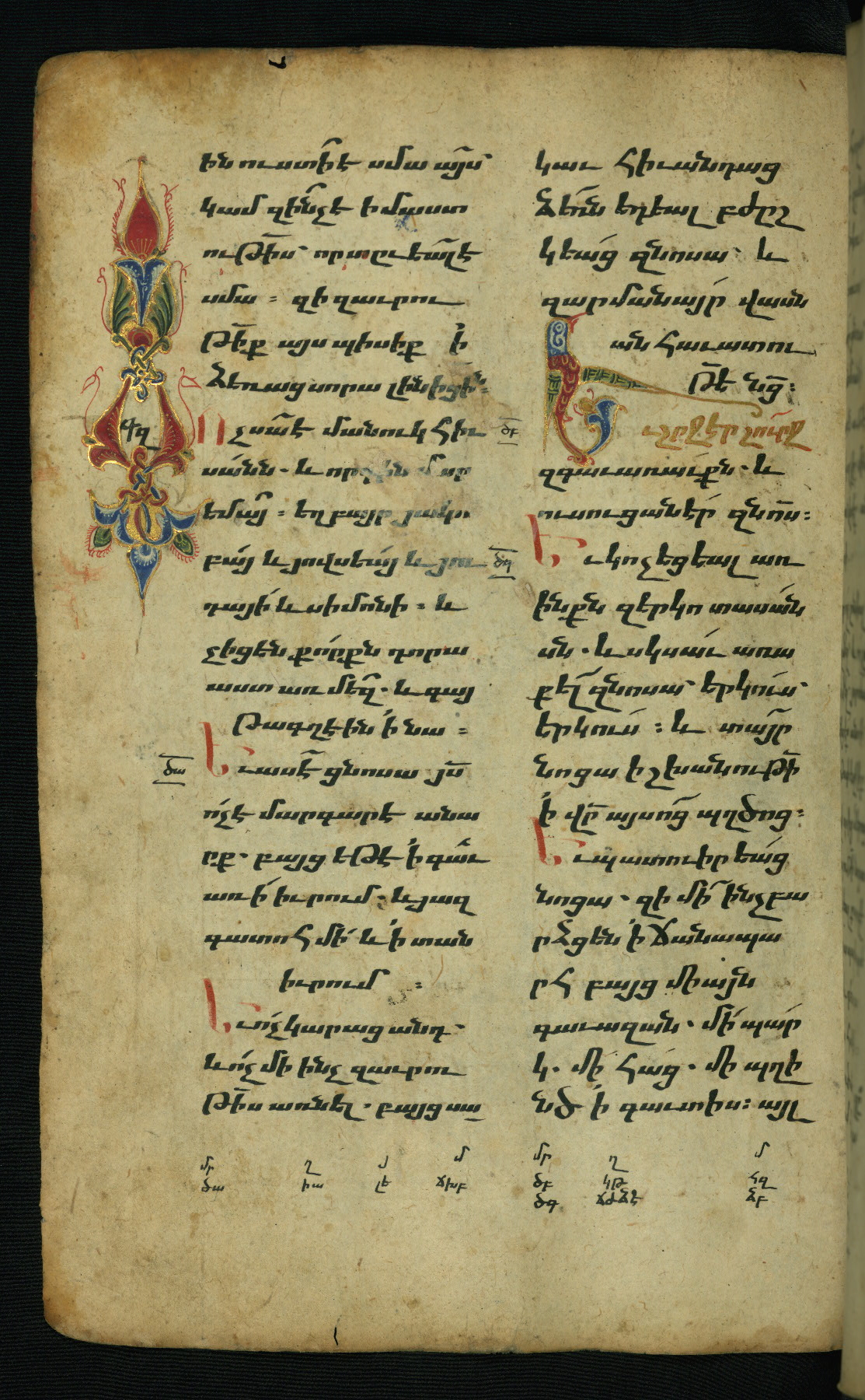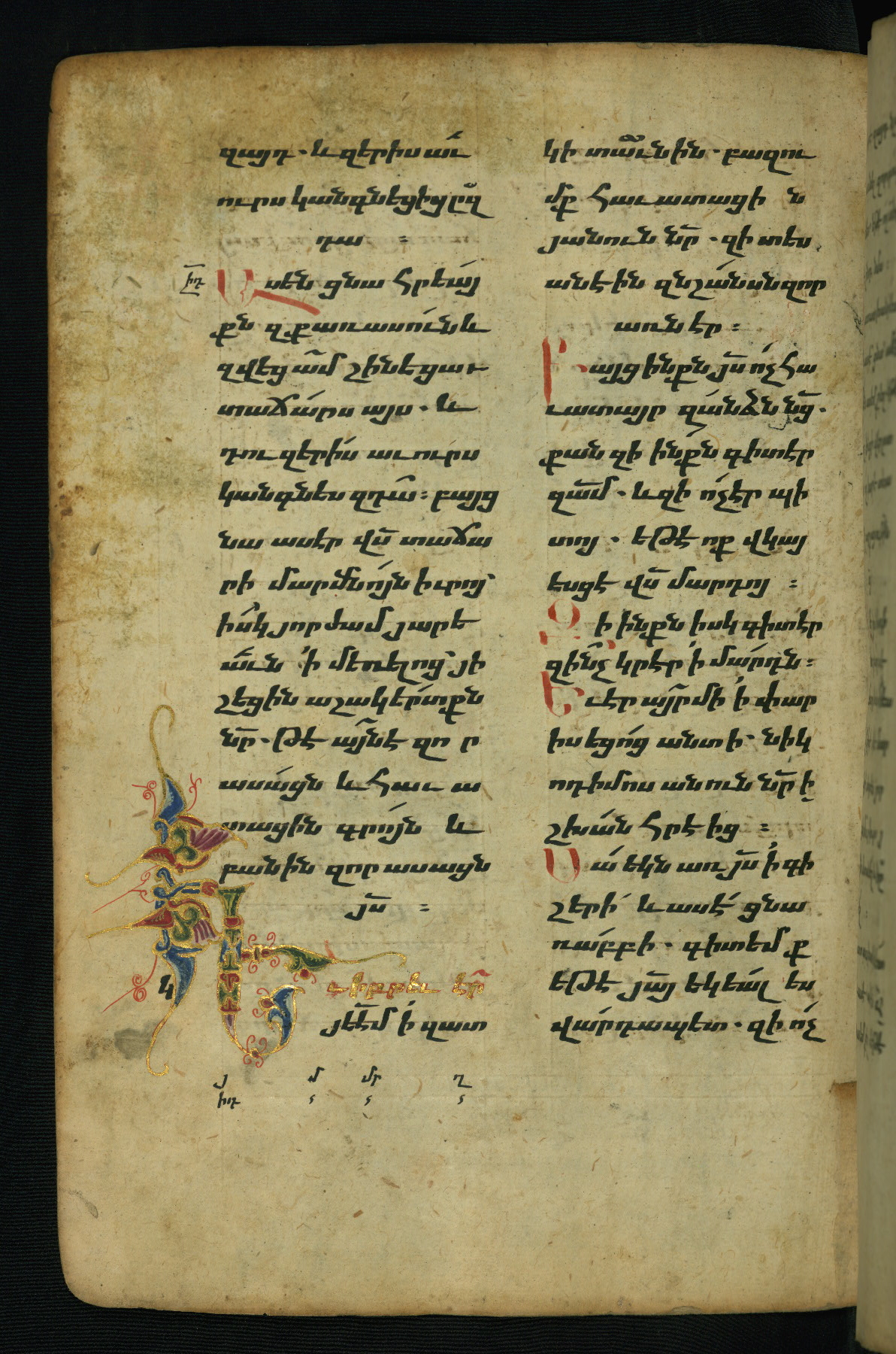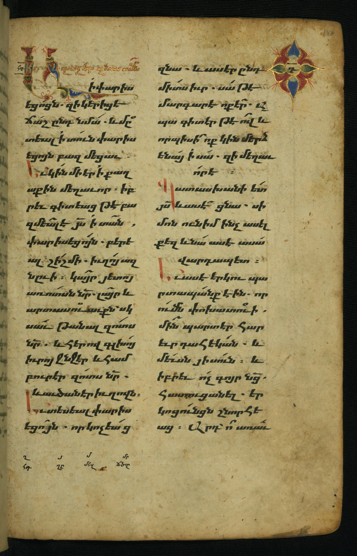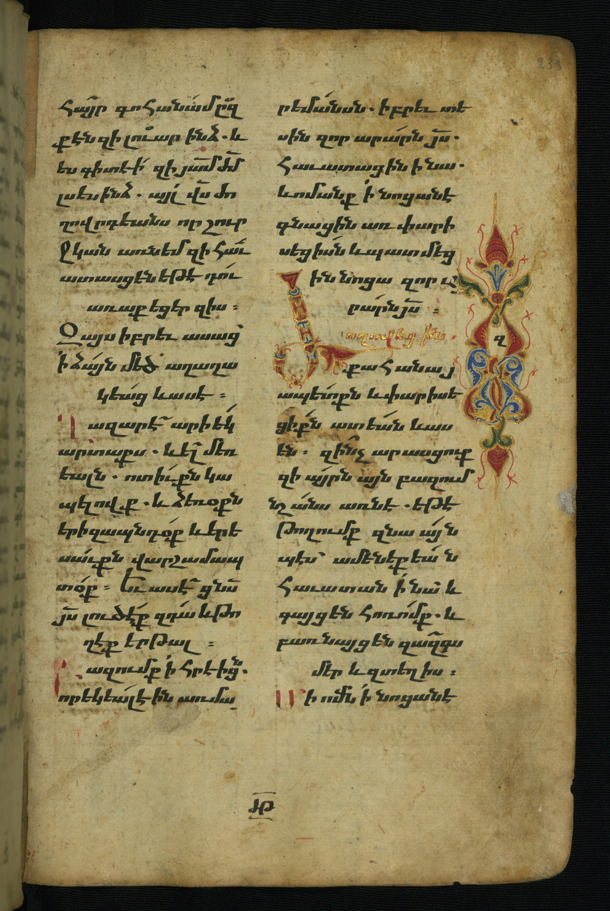 This manuscript was executed in 1475 CE by a scribe identified as Aristakes for a priest named Hakob. It contains a series of sixteen images on the life of Christ preceding the text of the Gospels, as well as the traditional Evangelist portraits, and there are marginal illustrations throughout. The style of the miniatures, which employ brilliant colors and emphasize decorative patterns, is characteristic of manuscript production in the region around Lake Van during the fifteenth century. The style of Lake Van has often been described in relation to schools of Islamic arts of the book. Numerous inscriptions (on fols. 258-260) spanning a few centuries attest to the manuscript's long history of use and revered preservation. The codex's later history included a rebinding with silver covers from Kayseri that date to approximately 1700. This jeweled and enameled silver binding bears a composition of the Adoration of the Magi on the front and the Ascension on the back.