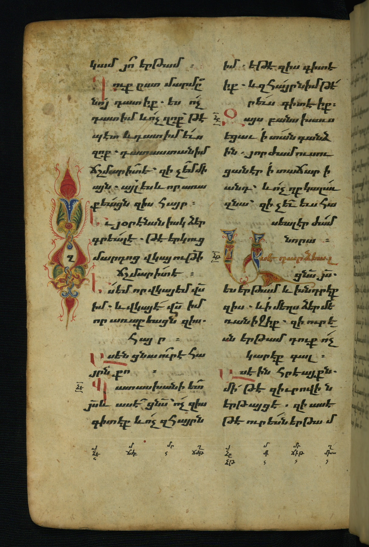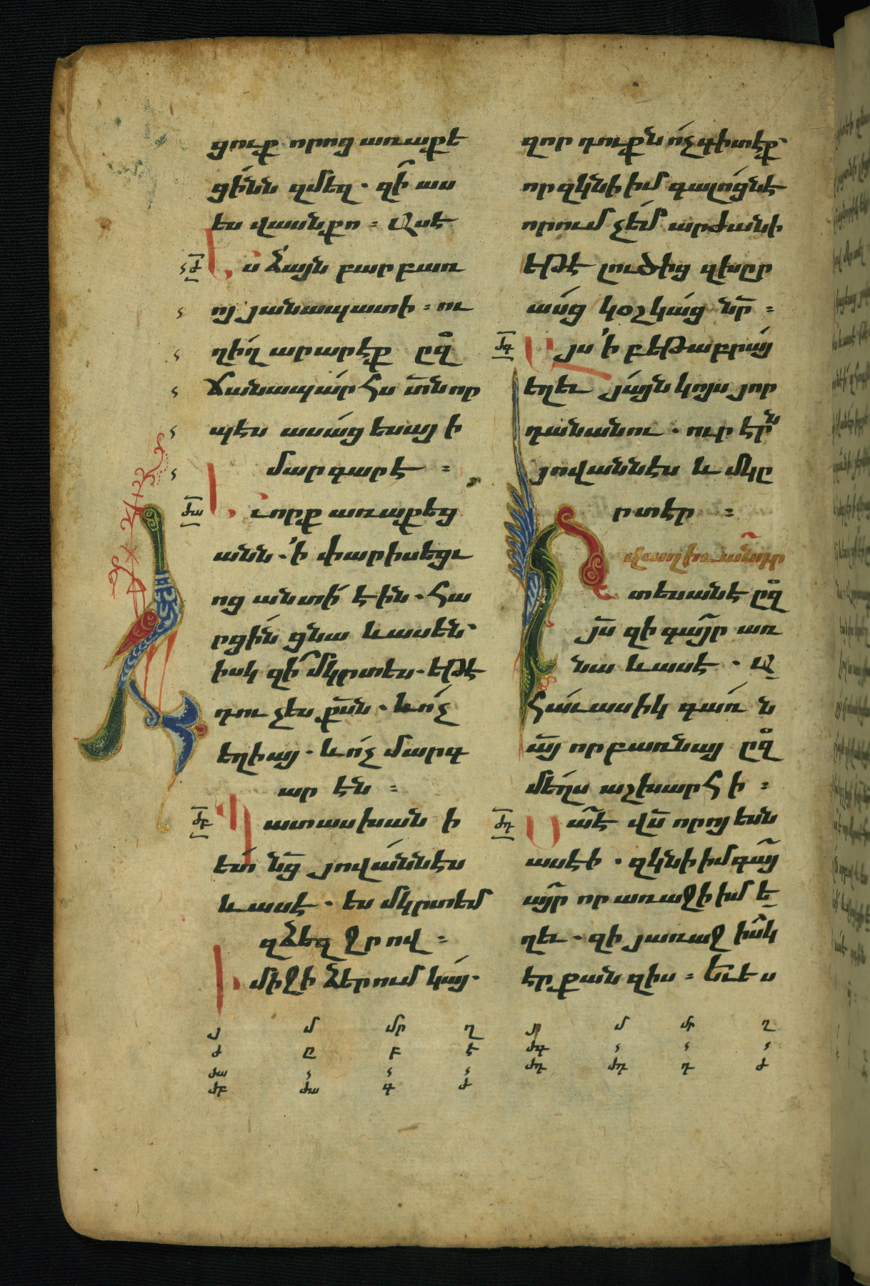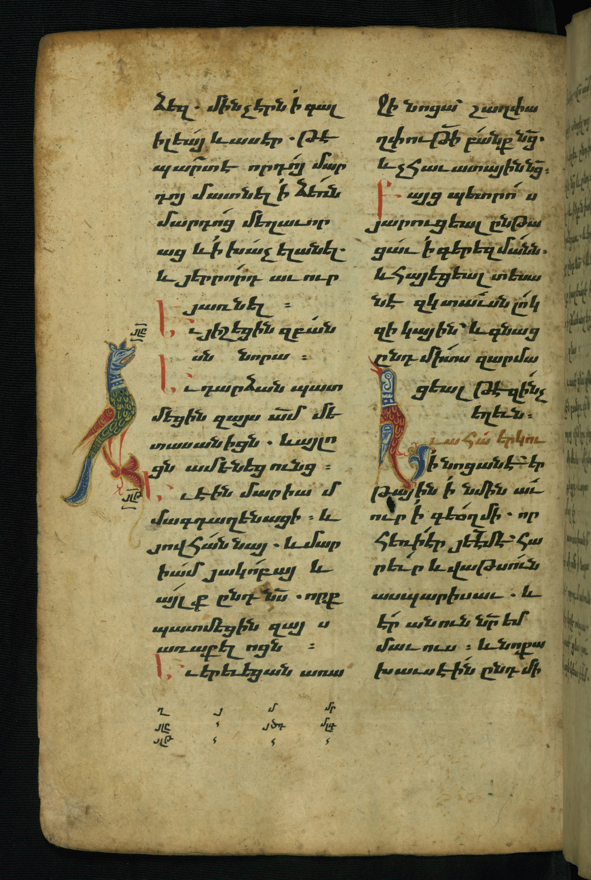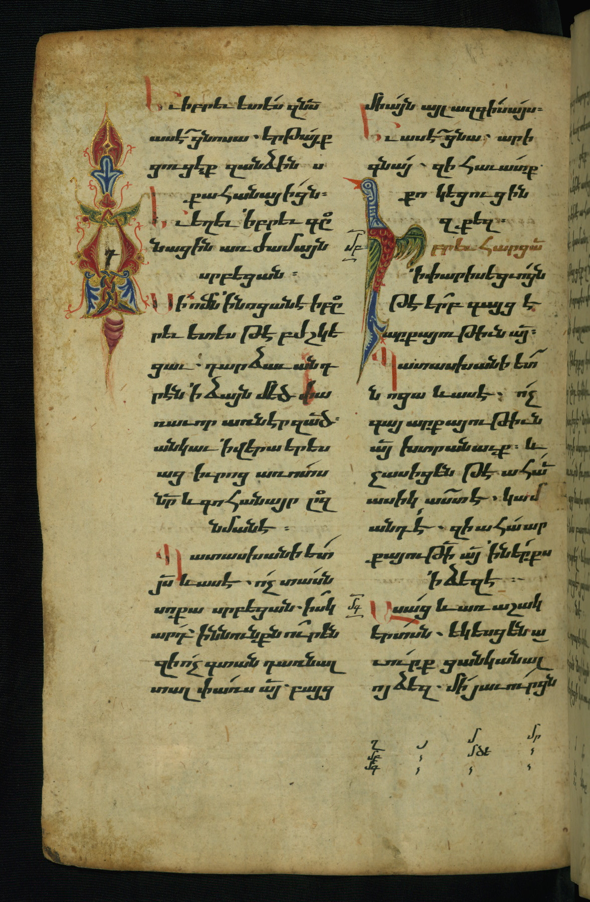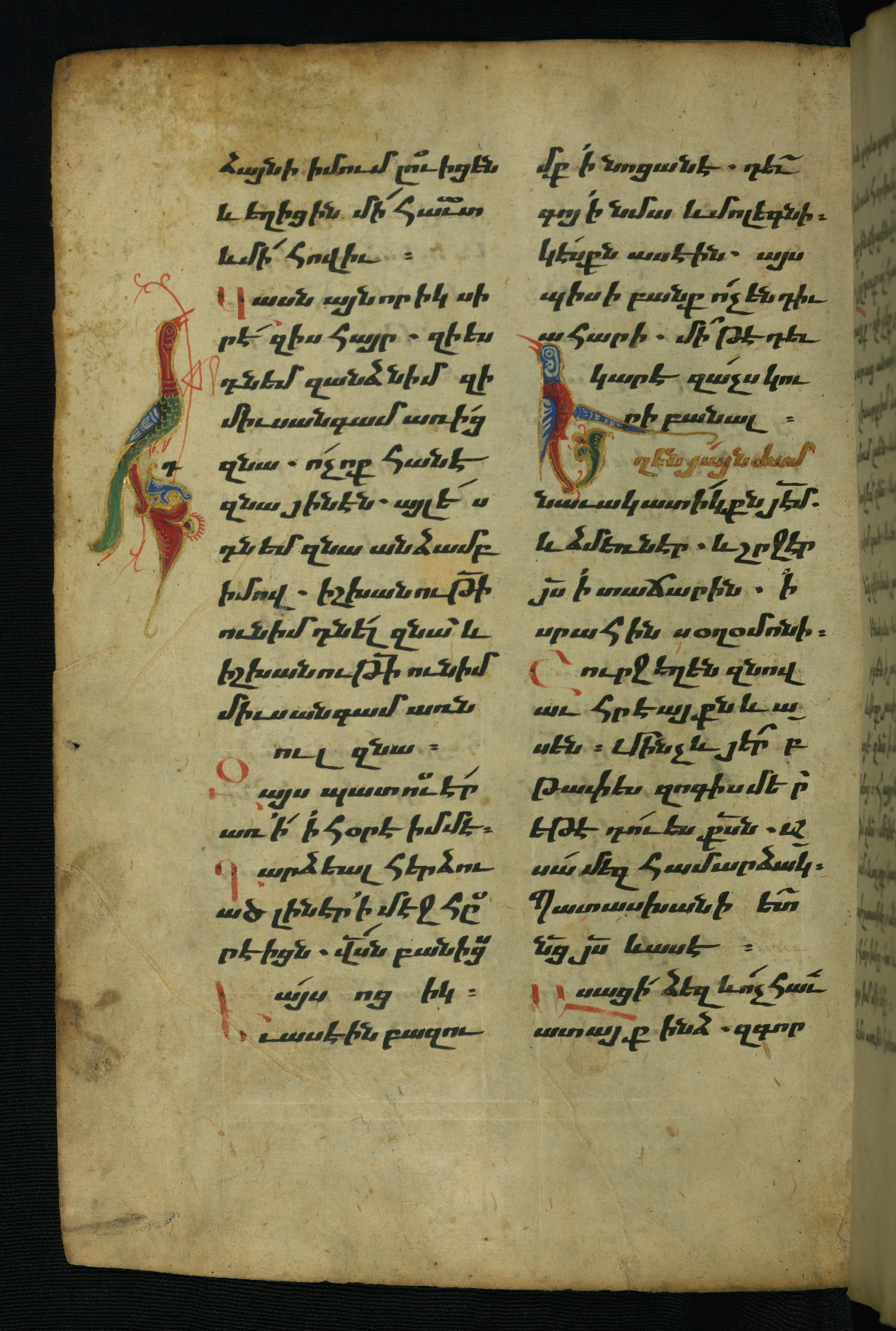 This manuscript was executed in 1475 CE by a scribe identified as Aristakes for a priest named Hakob. It contains a series of sixteen images on the life of Christ preceding the text of the Gospels, as well as the traditional Evangelist portraits, and there are marginal illustrations throughout. The style of the miniatures, which employ brilliant colors and emphasize decorative patterns, is characteristic of manuscript production in the region around Lake Van during the fifteenth century. The style of Lake Van has often been described in relation to schools of Islamic arts of the book. Numerous inscriptions (on fols. 258-260) spanning a few centuries attest to the manuscript's long history of use and revered preservation. The codex's later history included a rebinding with silver covers from Kayseri that date to approximately 1700. This jeweled and enameled silver binding bears a composition of the Adoration of the Magi on the front and the Ascension on the back.