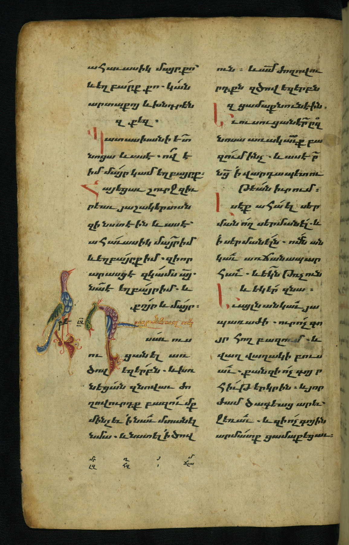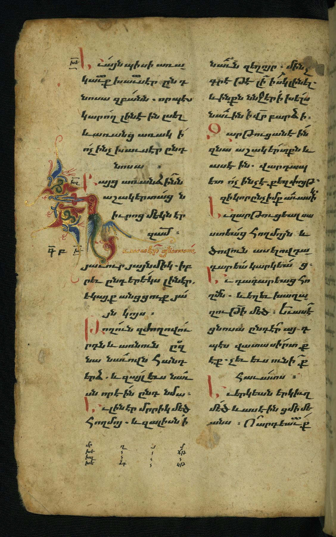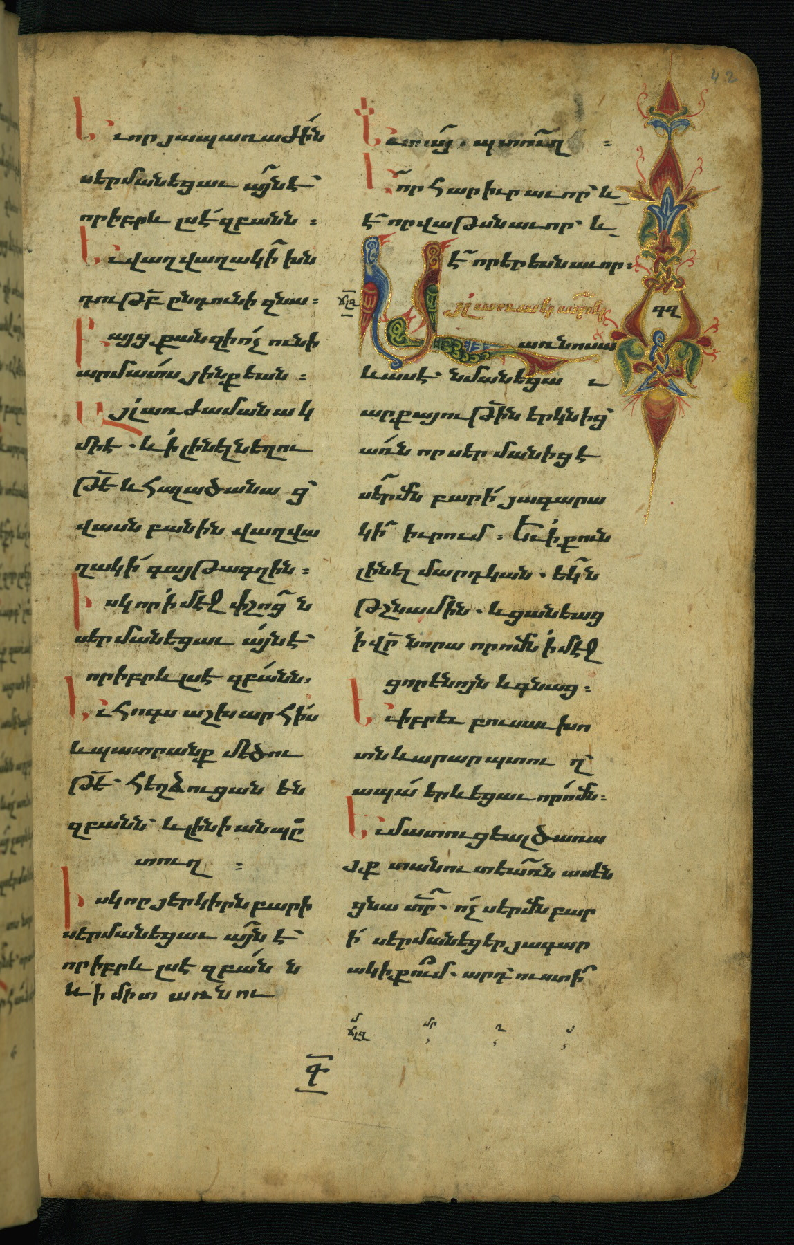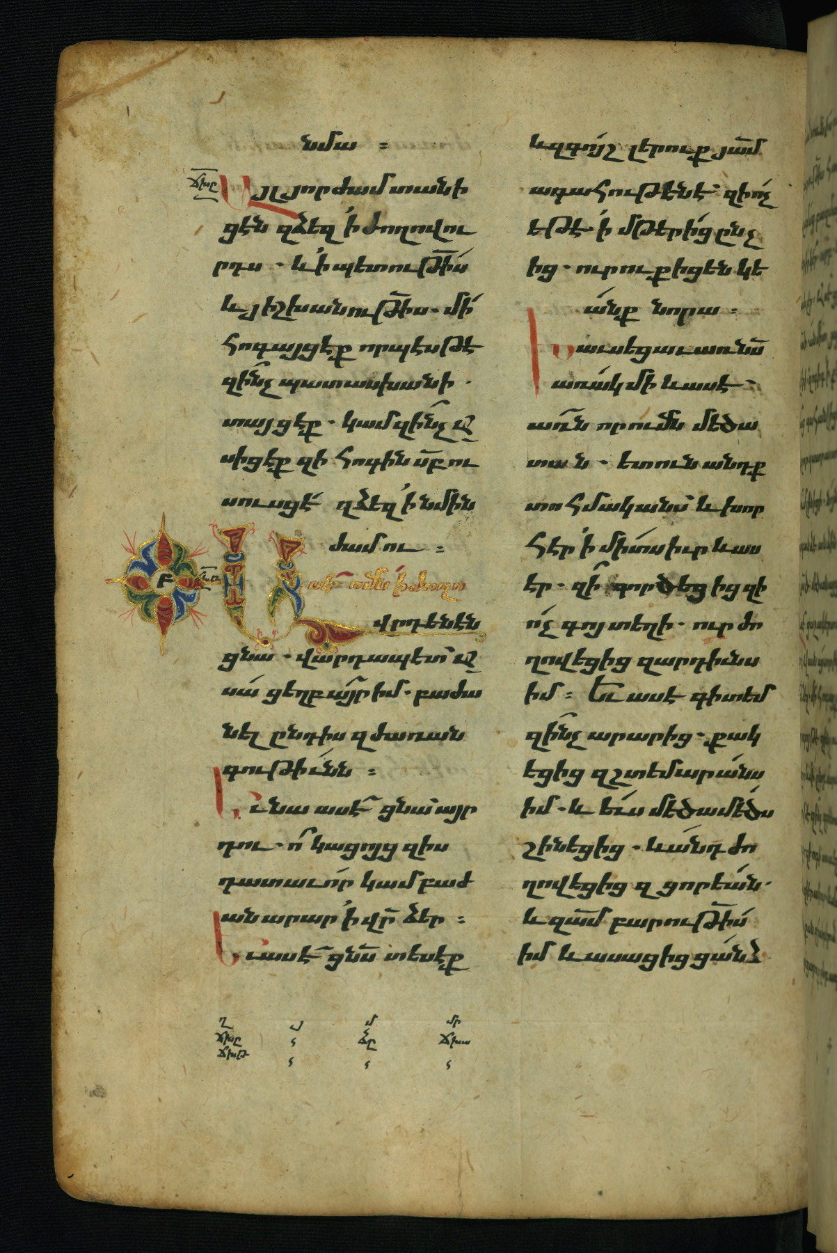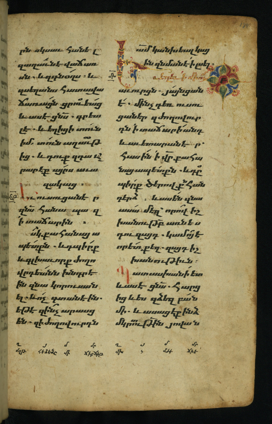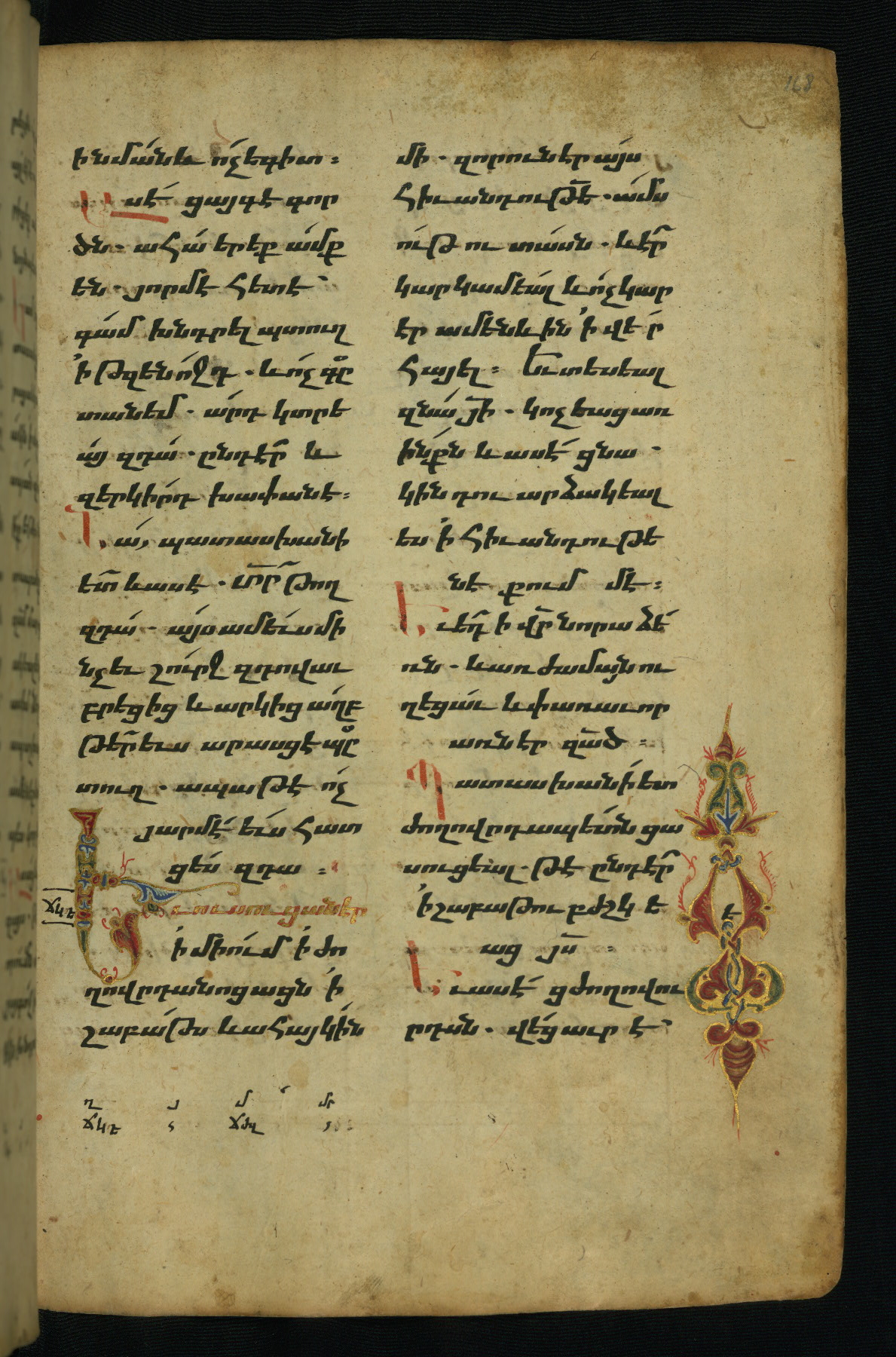 This manuscript was executed in 1475 CE by a scribe identified as Aristakes for a priest named Hakob. It contains a series of sixteen images on the life of Christ preceding the text of the Gospels, as well as the traditional Evangelist portraits, and there are marginal illustrations throughout. The style of the miniatures, which employ brilliant colors and emphasize decorative patterns, is characteristic of manuscript production in the region around Lake Van during the fifteenth century. The style of Lake Van has often been described in relation to schools of Islamic arts of the book. Numerous inscriptions (on fols. 258-260) spanning a few centuries attest to the manuscript's long history of use and revered preservation. The codex's later history included a rebinding with silver covers from Kayseri that date to approximately 1700. This jeweled and enameled silver binding bears a composition of the Adoration of the Magi on the front and the Ascension on the back.