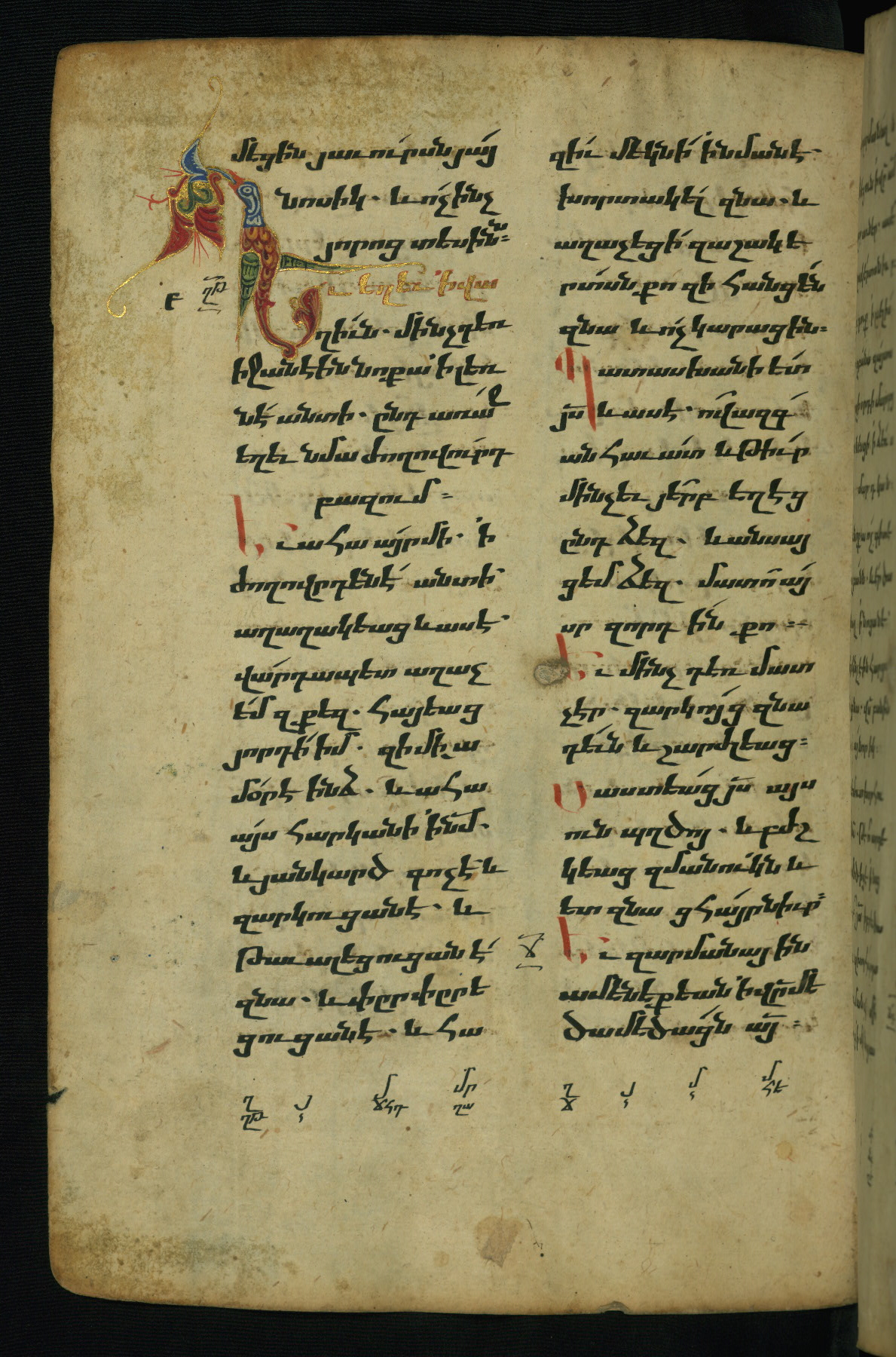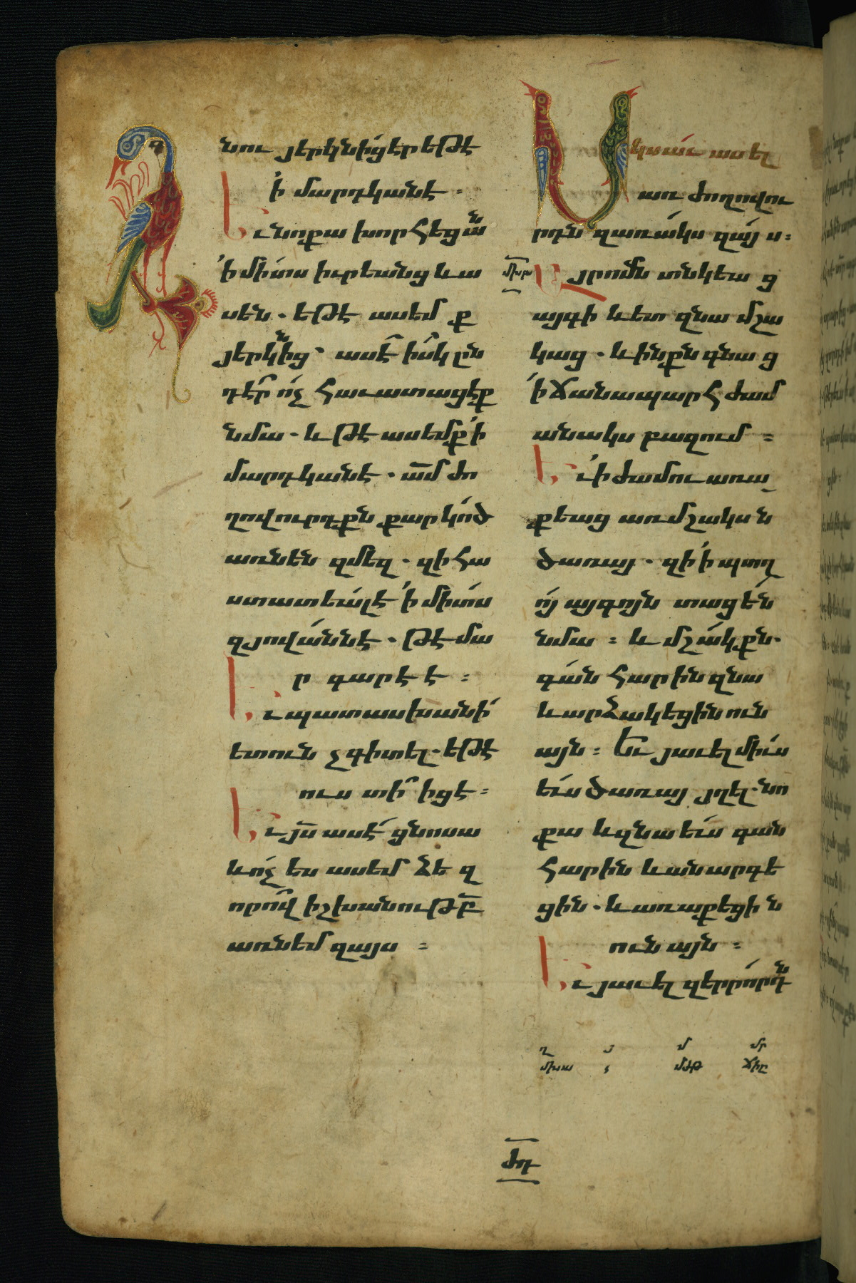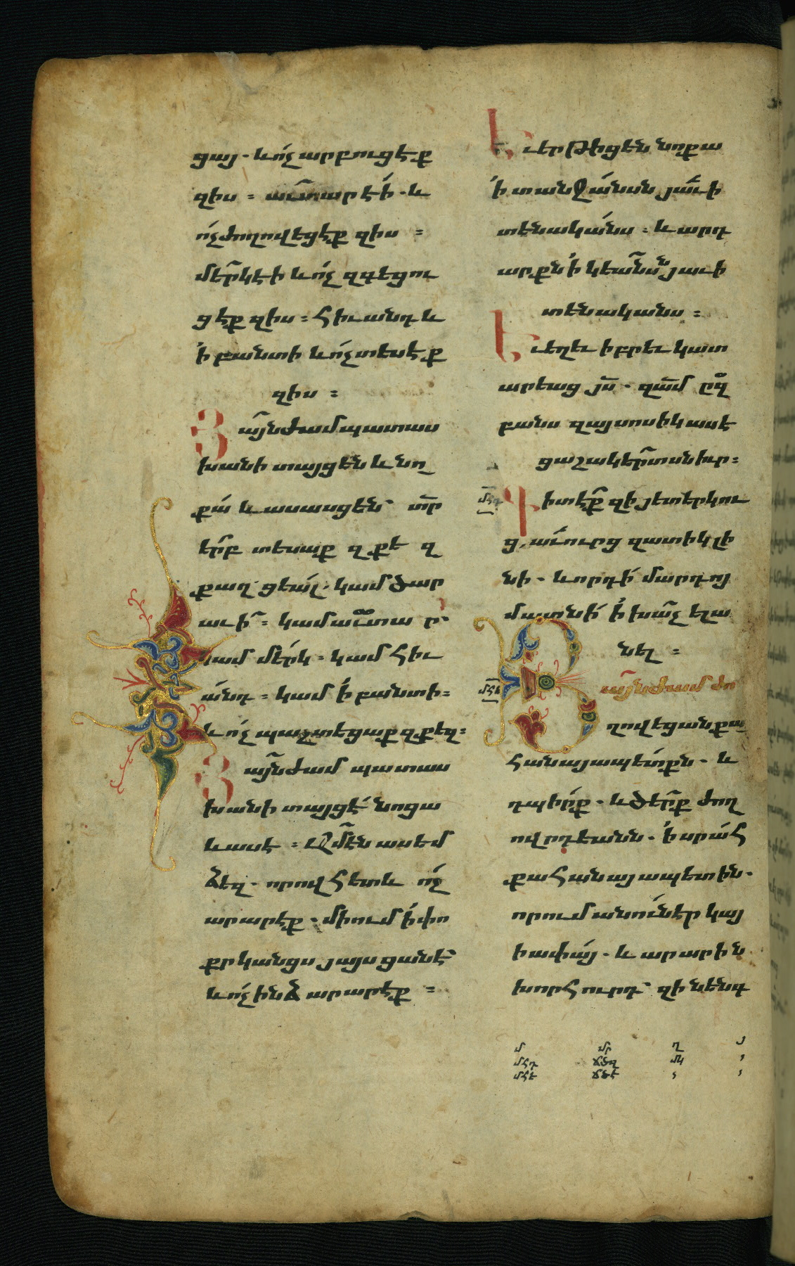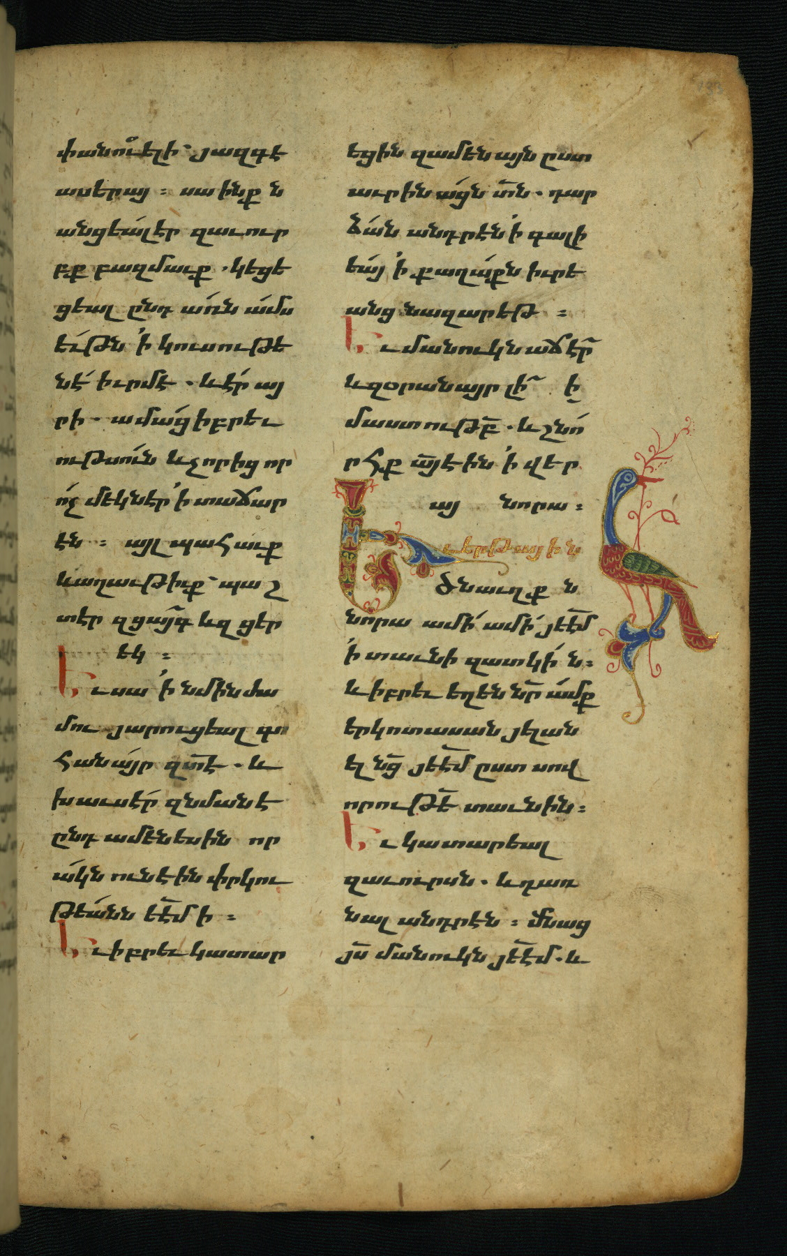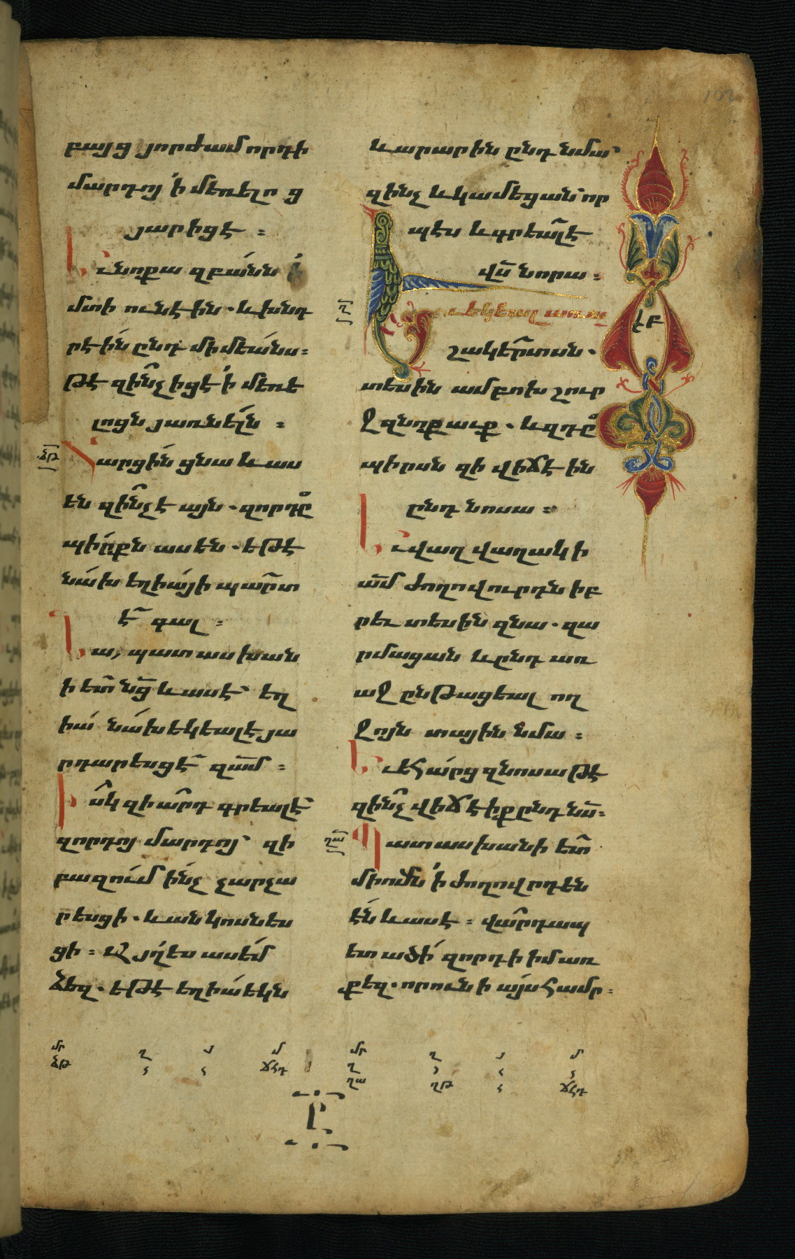 This manuscript was executed in 1475 CE by a scribe identified as Aristakes for a priest named Hakob. It contains a series of sixteen images on the life of Christ preceding the text of the Gospels, as well as the traditional Evangelist portraits, and there are marginal illustrations throughout. The style of the miniatures, which employ brilliant colors and emphasize decorative patterns, is characteristic of manuscript production in the region around Lake Van during the fifteenth century. The style of Lake Van has often been described in relation to schools of Islamic arts of the book. Numerous inscriptions (on fols. 258-260) spanning a few centuries attest to the manuscript's long history of use and revered preservation. The codex's later history included a rebinding with silver covers from Kayseri that date to approximately 1700. This jeweled and enameled silver binding bears a composition of the Adoration of the Magi on the front and the Ascension on the back.