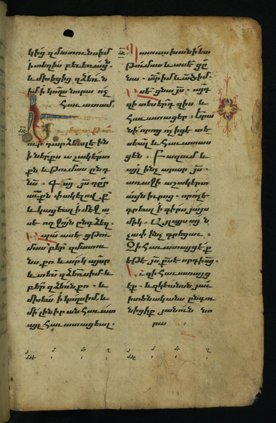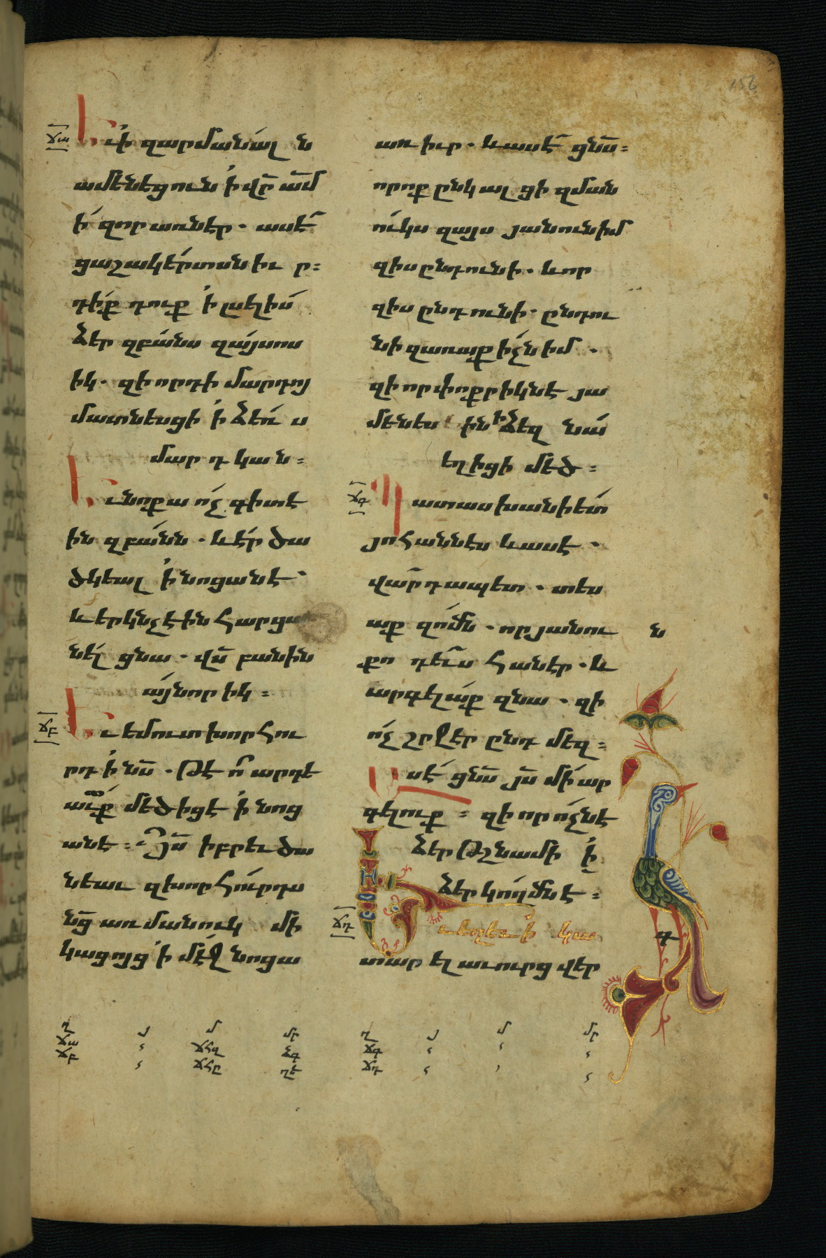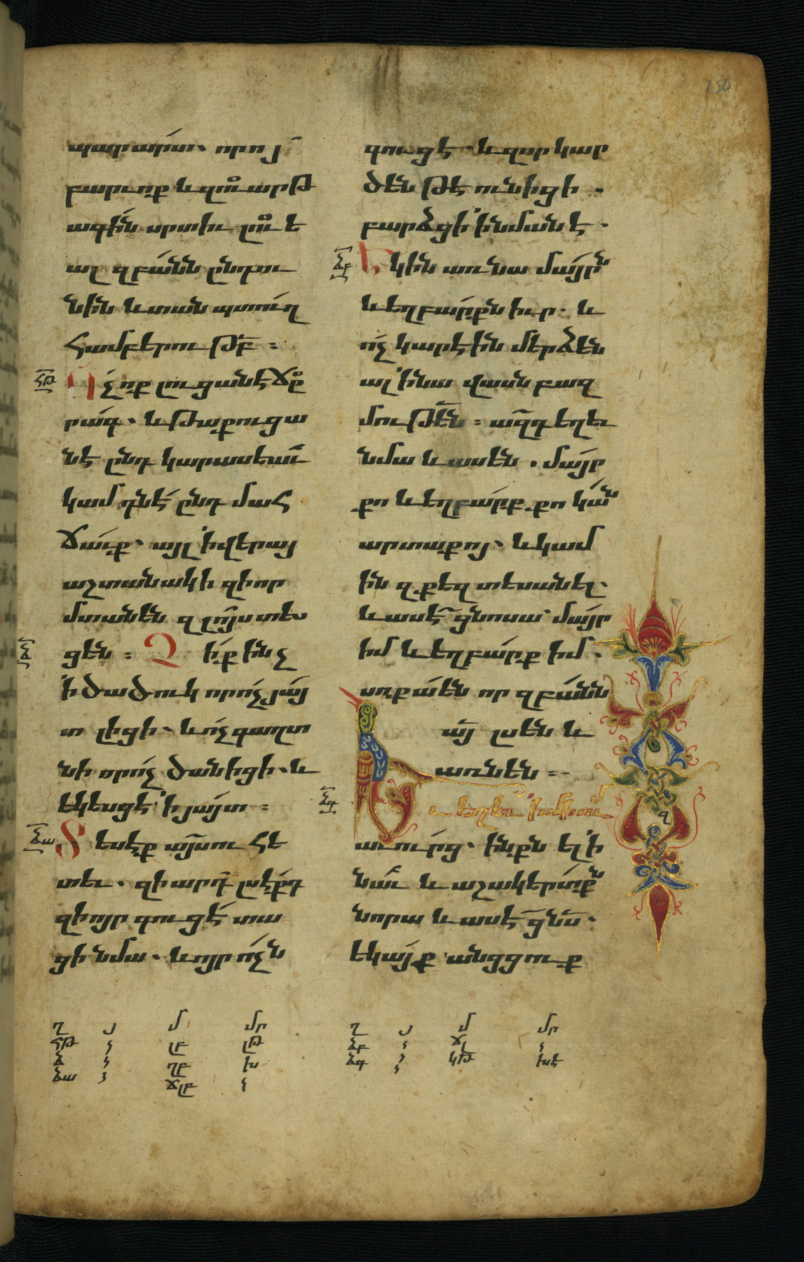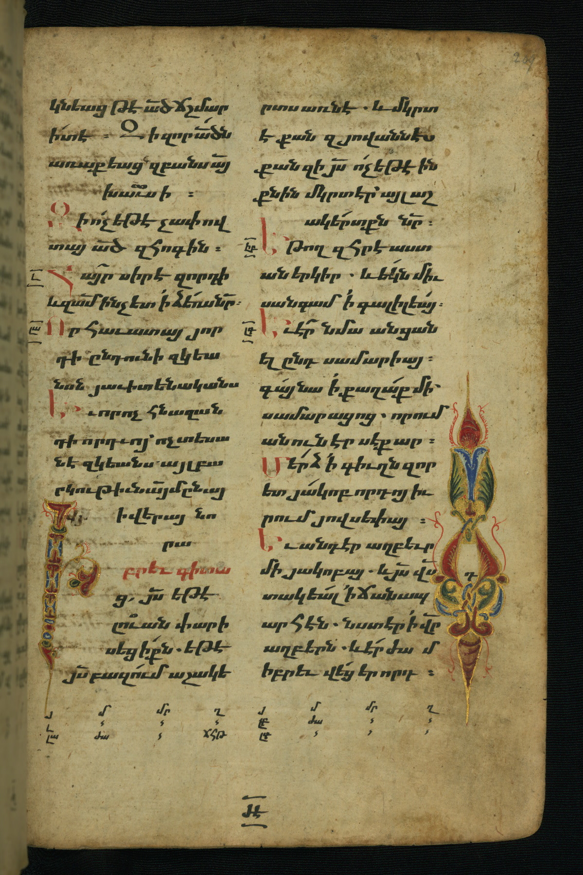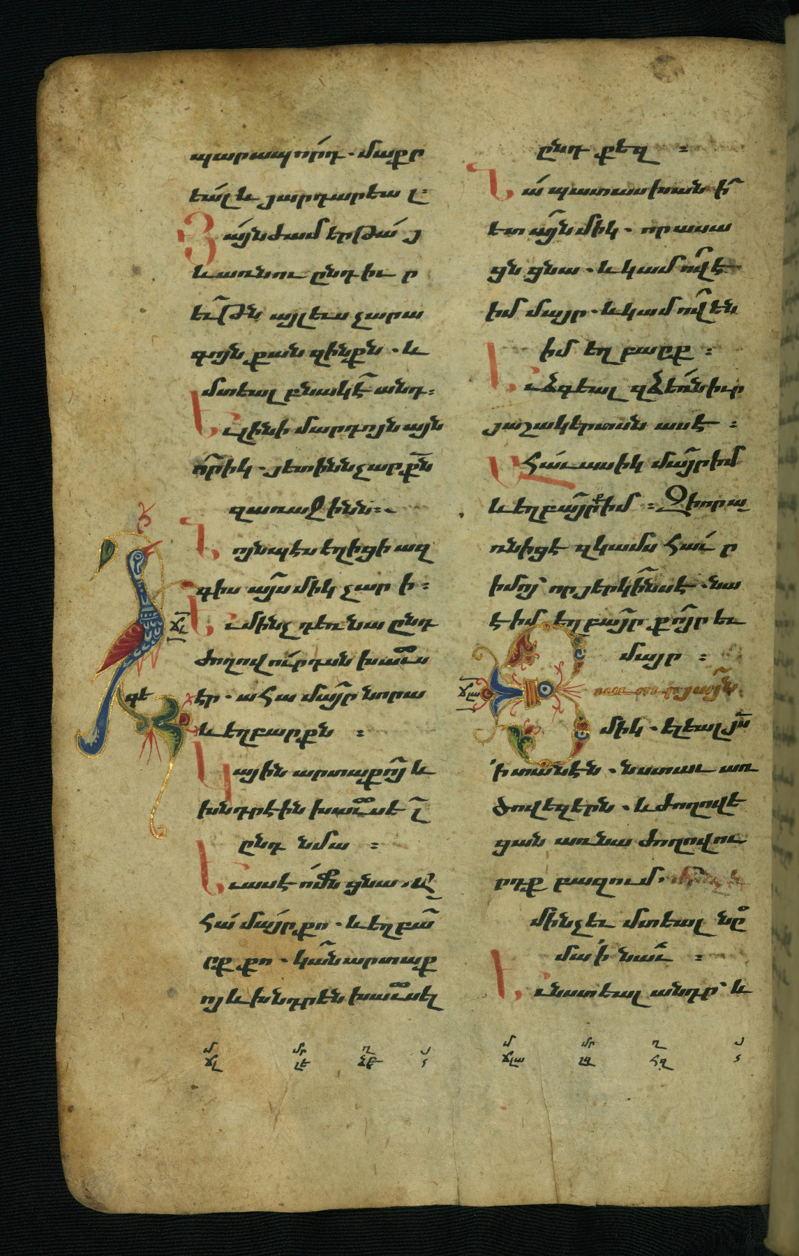 This manuscript was executed in 1475 CE by a scribe identified as Aristakes for a priest named Hakob. It contains a series of sixteen images on the life of Christ preceding the text of the Gospels, as well as the traditional Evangelist portraits, and there are marginal illustrations throughout. The style of the miniatures, which employ brilliant colors and emphasize decorative patterns, is characteristic of manuscript production in the region around Lake Van during the fifteenth century. The style of Lake Van has often been described in relation to schools of Islamic arts of the book. Numerous inscriptions (on fols. 258-260) spanning a few centuries attest to the manuscript's long history of use and revered preservation. The codex's later history included a rebinding with silver covers from Kayseri that date to approximately 1700. This jeweled and enameled silver binding bears a composition of the Adoration of the Magi on the front and the Ascension on the back.
